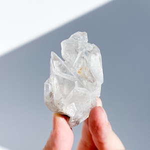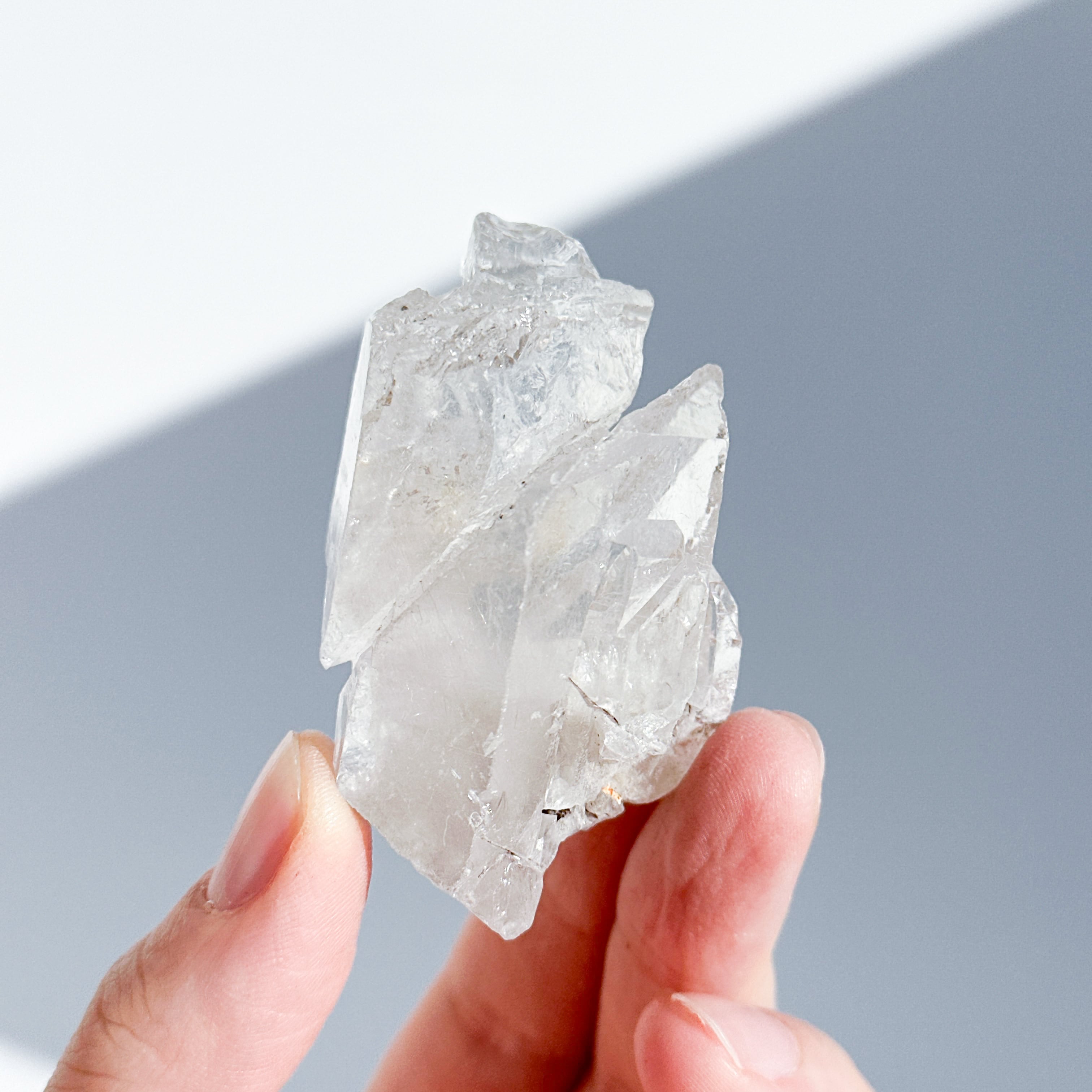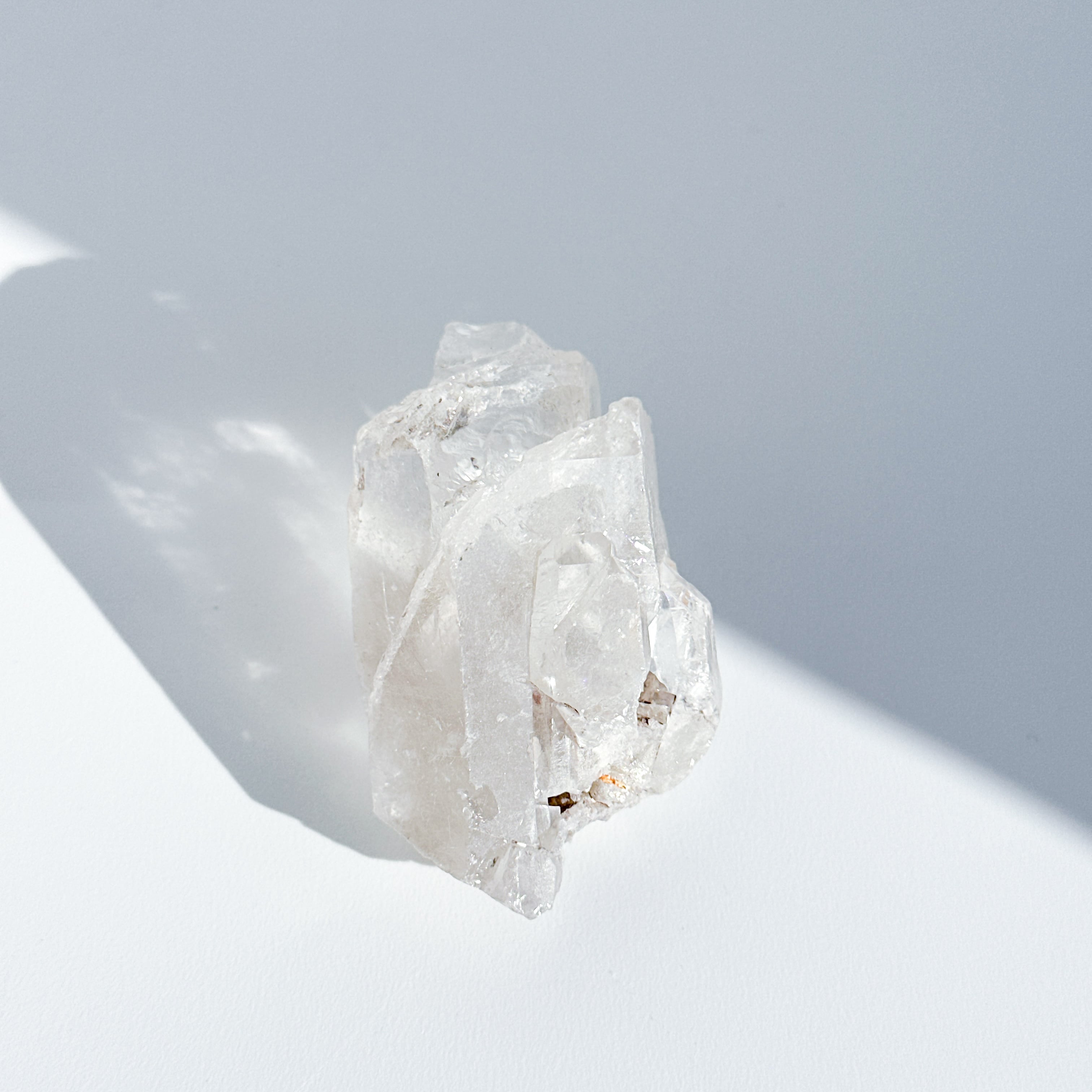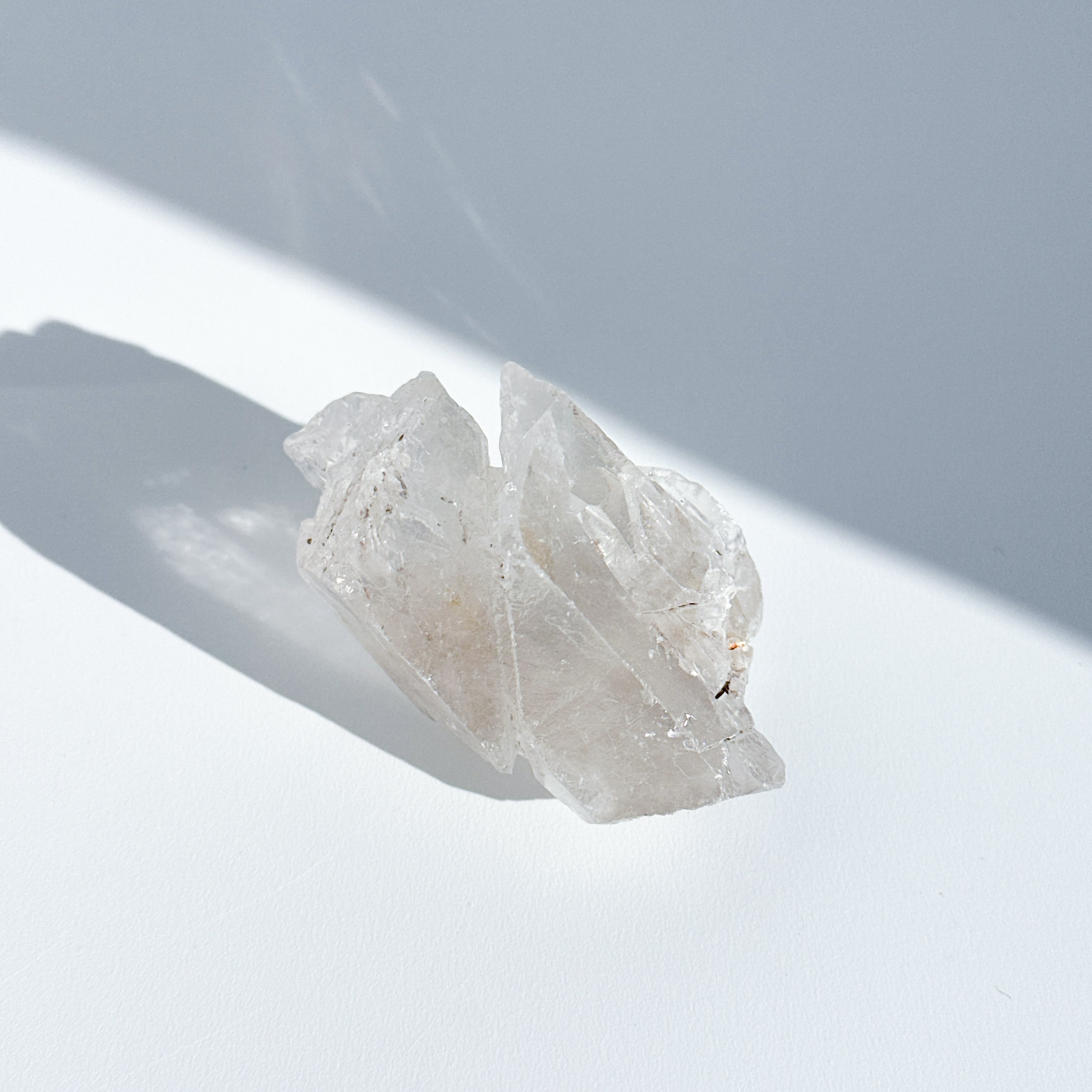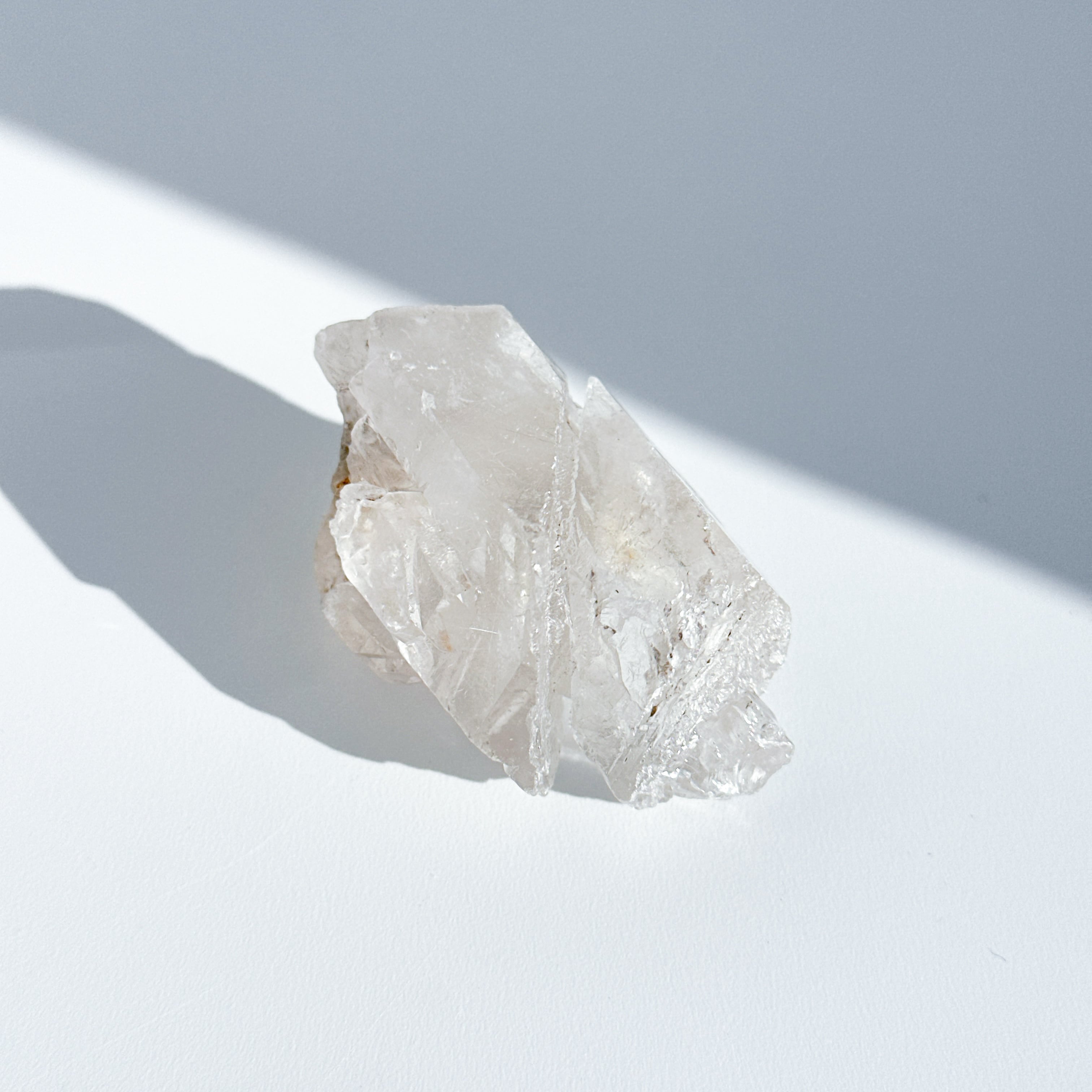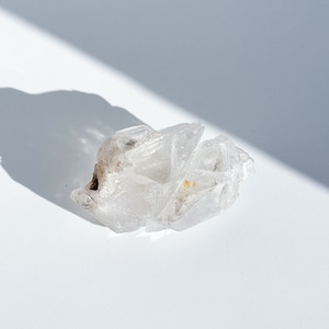 この独特な姿は、クリアクォーツが成長過程で他の鉱物からの干渉を受けながら形成された証。