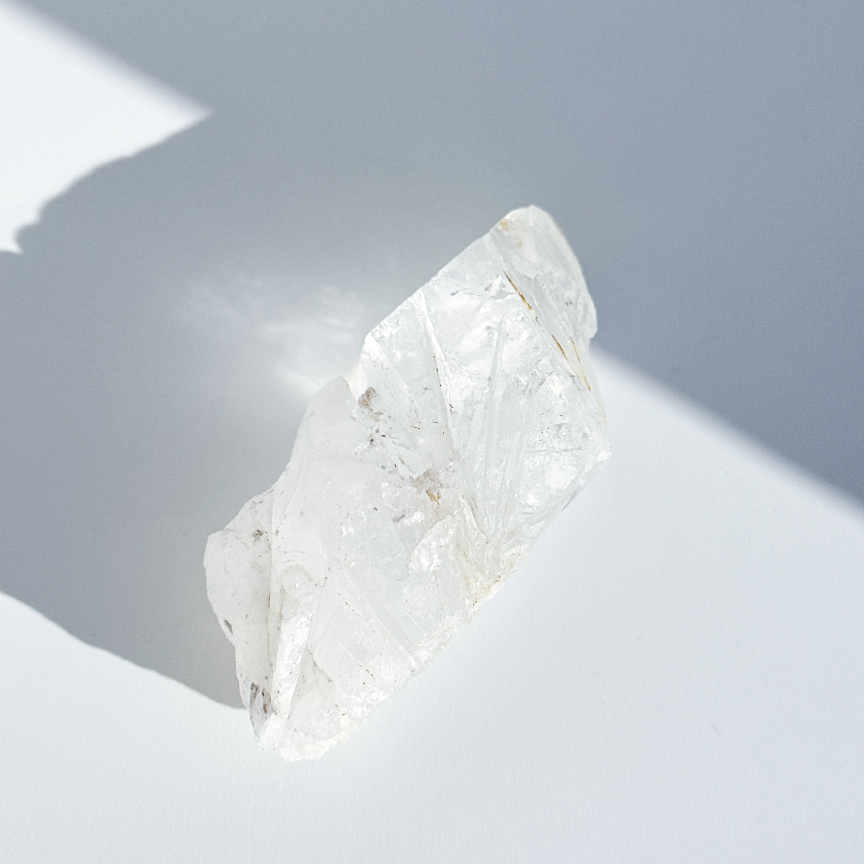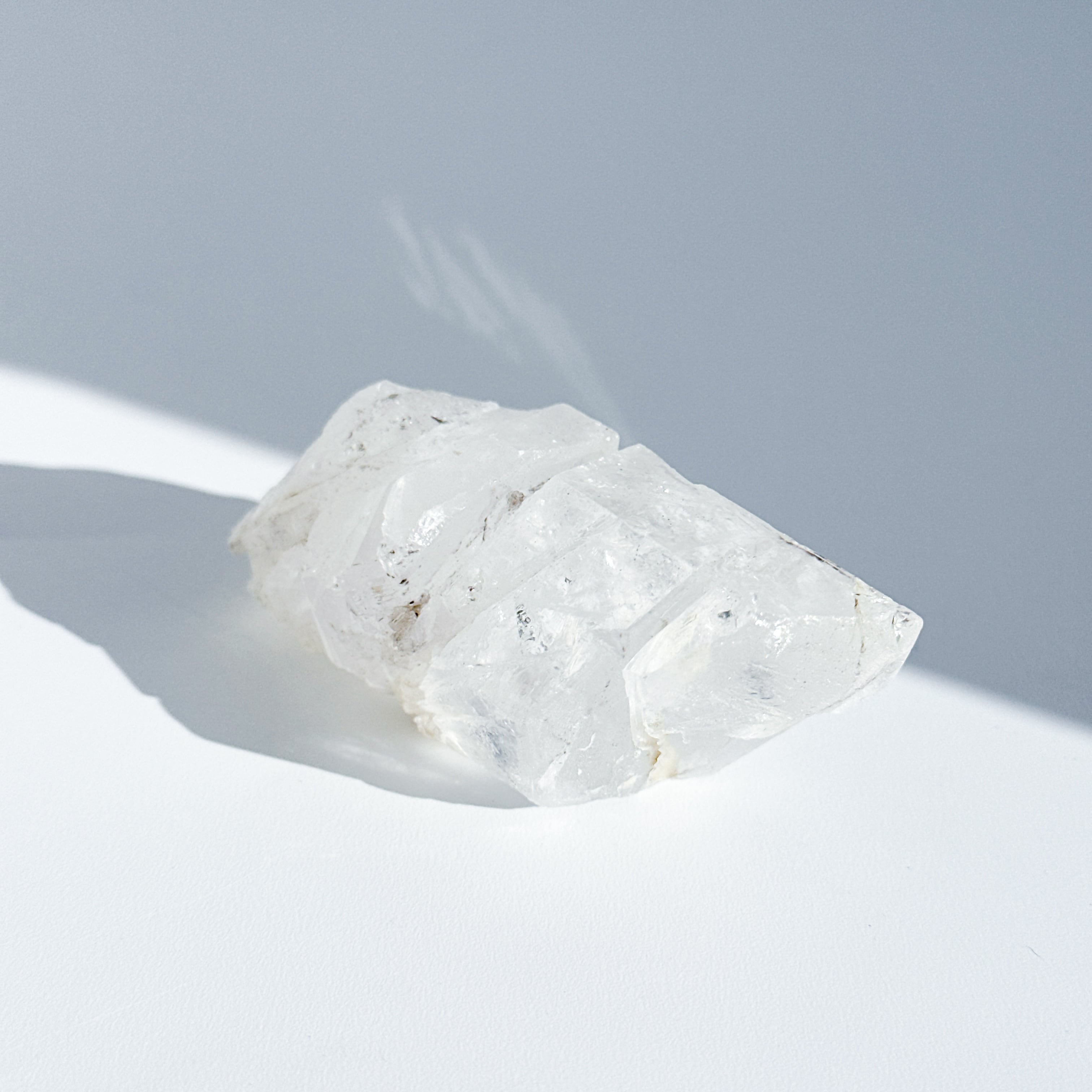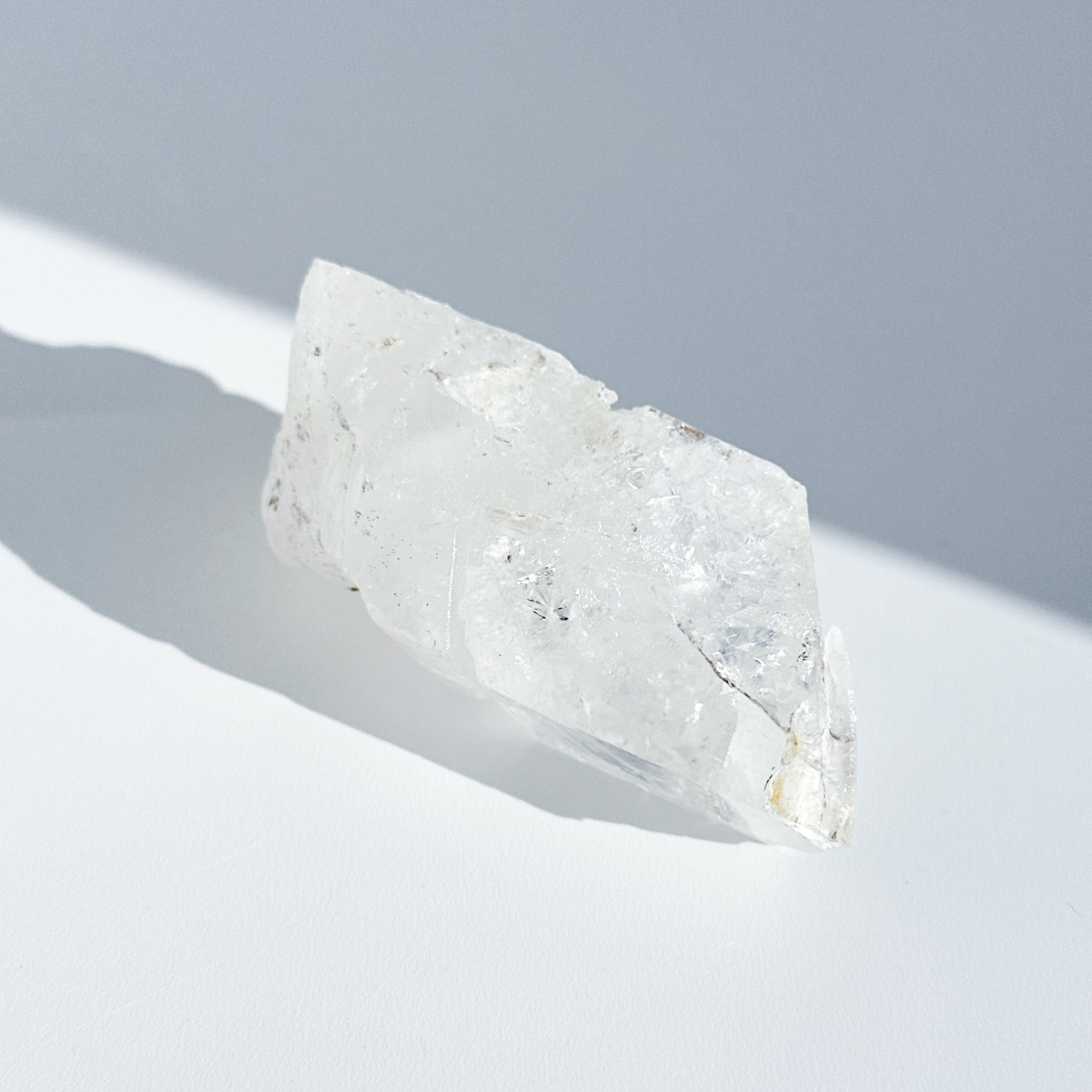 この独特な姿は、クリアクォーツが成長過程で他の鉱物からの干渉を受けながら形成された証。