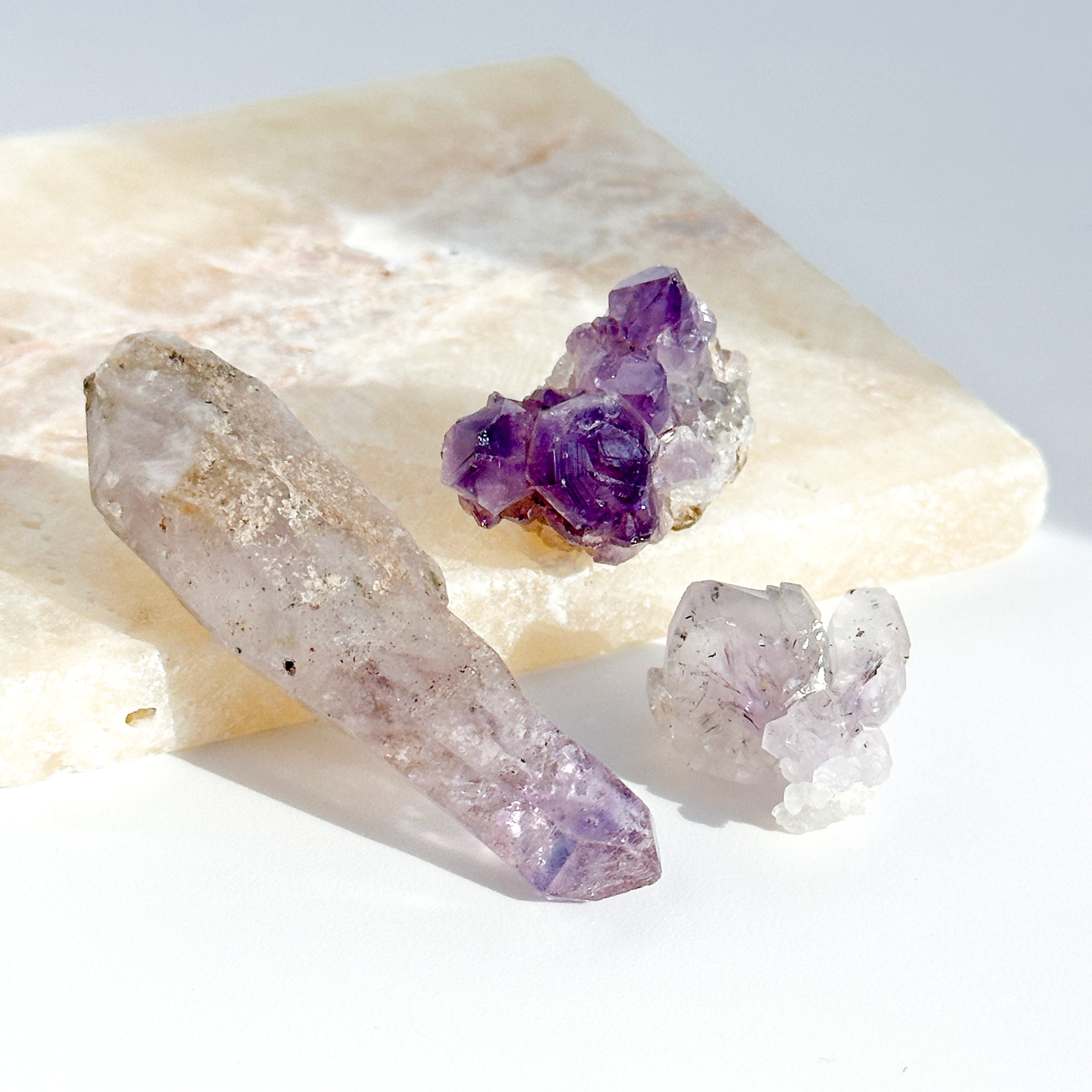産地の違いなどで様々なバリエーションを楽しめる、アメジストの原石たちを