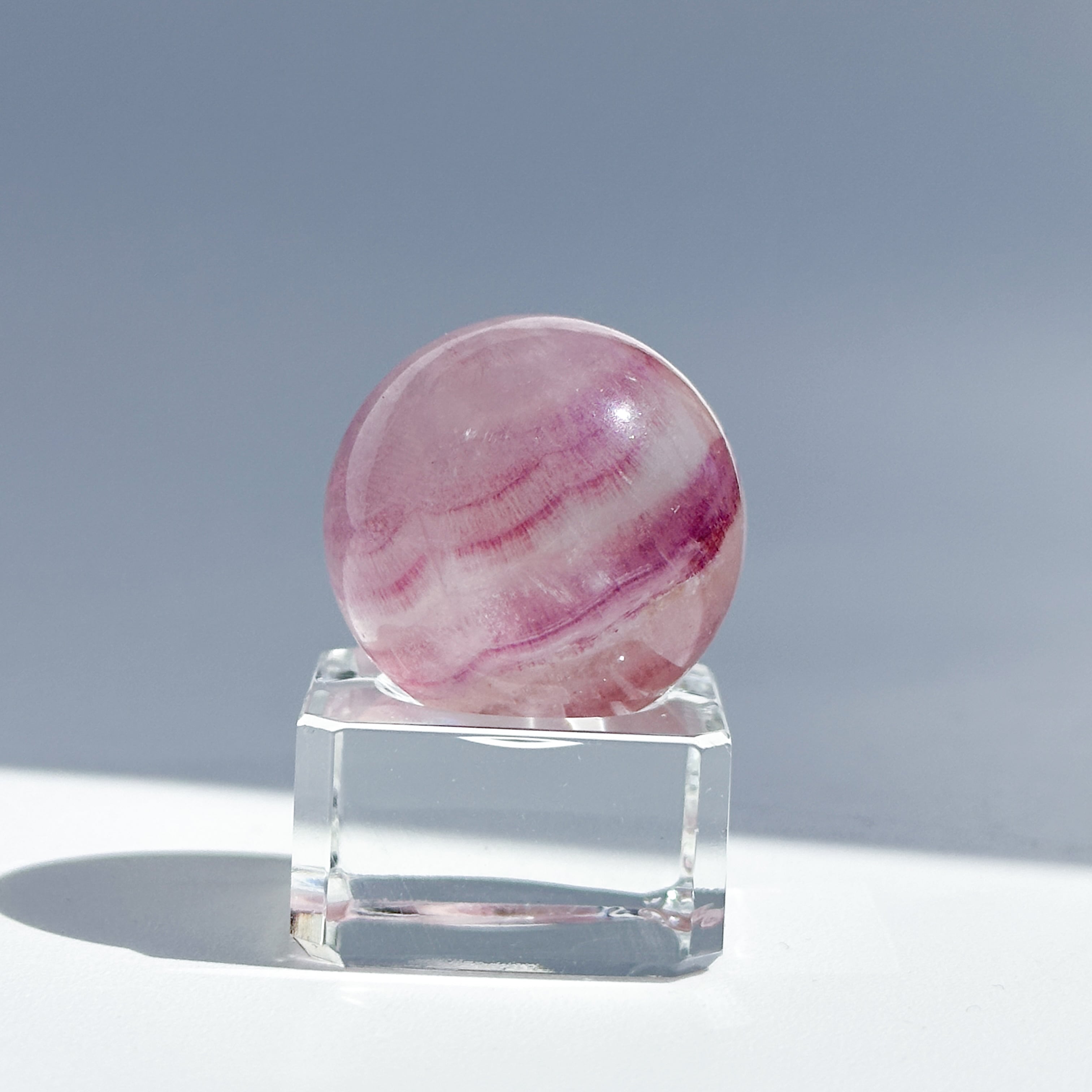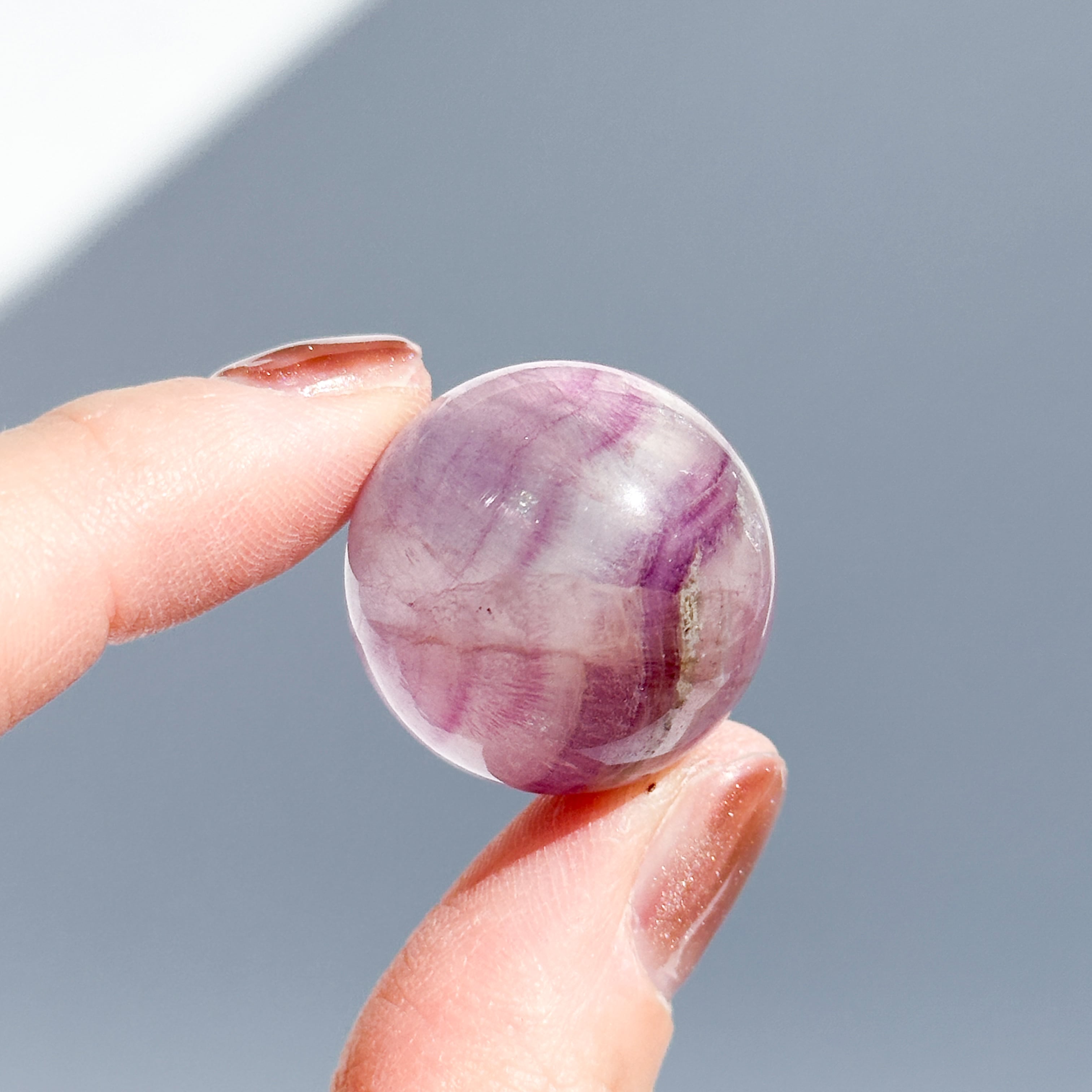 レインボーフローライトは複数のカラー(透明・パープル・ブルー・ピンク・グリーン)が共生し、水面のような曲線の模様を生み出しています。