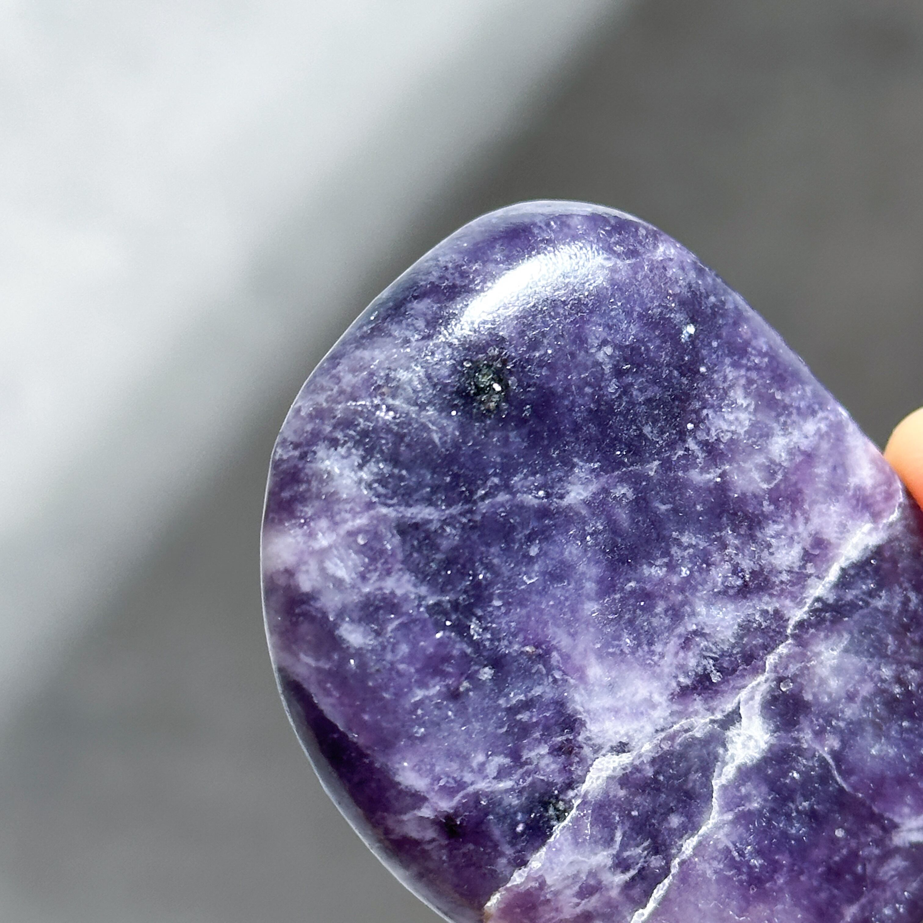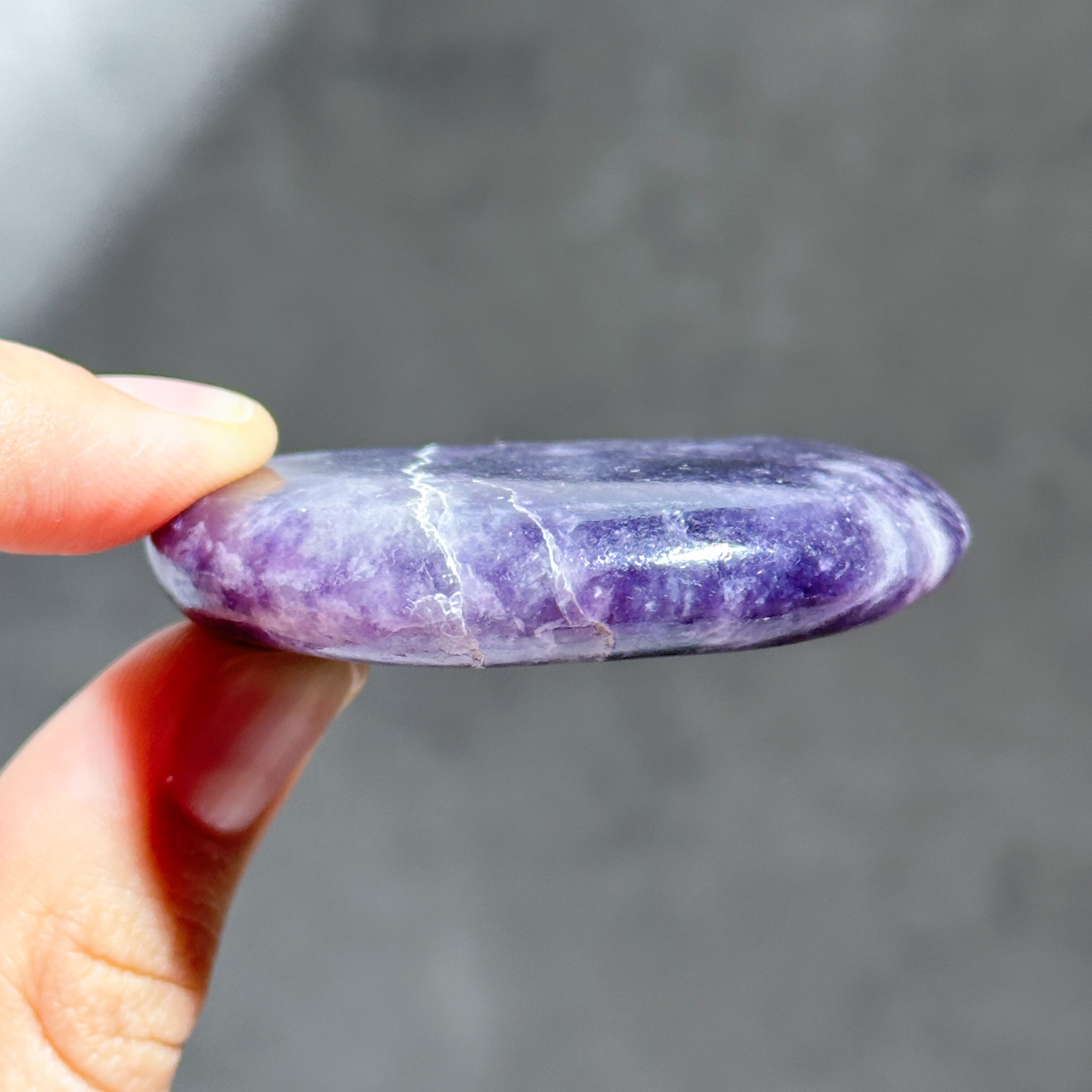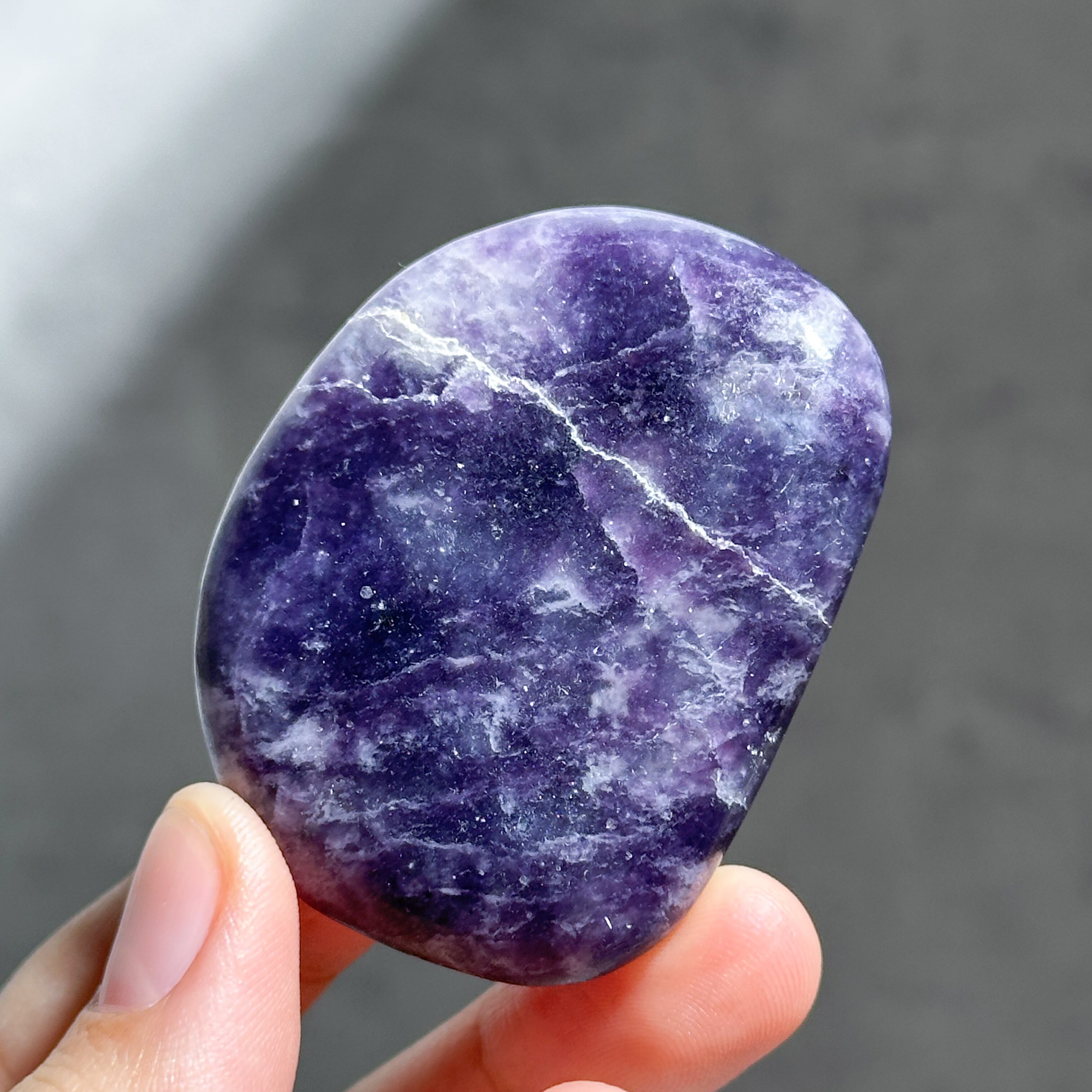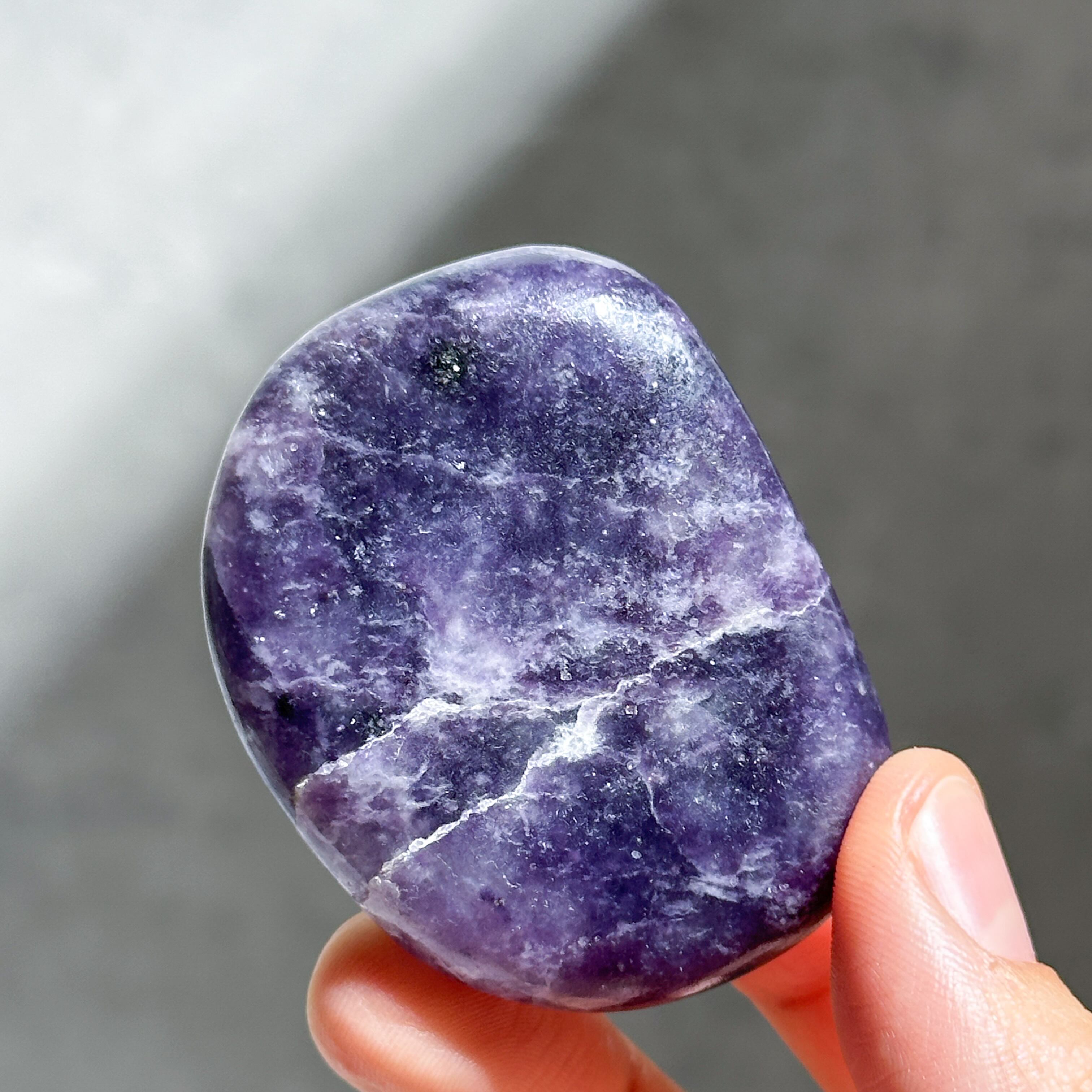 パープル色の鉱石、レピドライトの原石をパーム型に研磨しました。