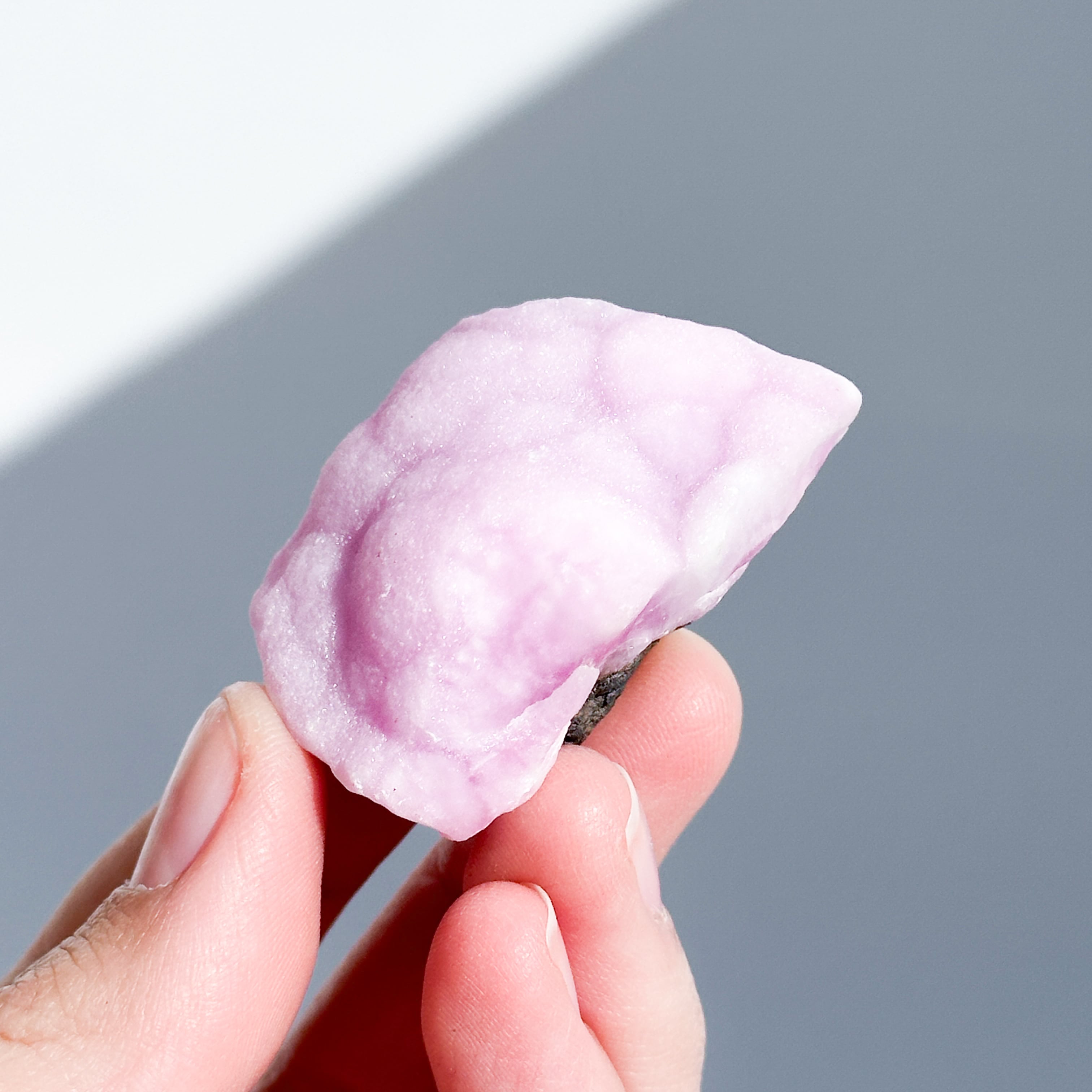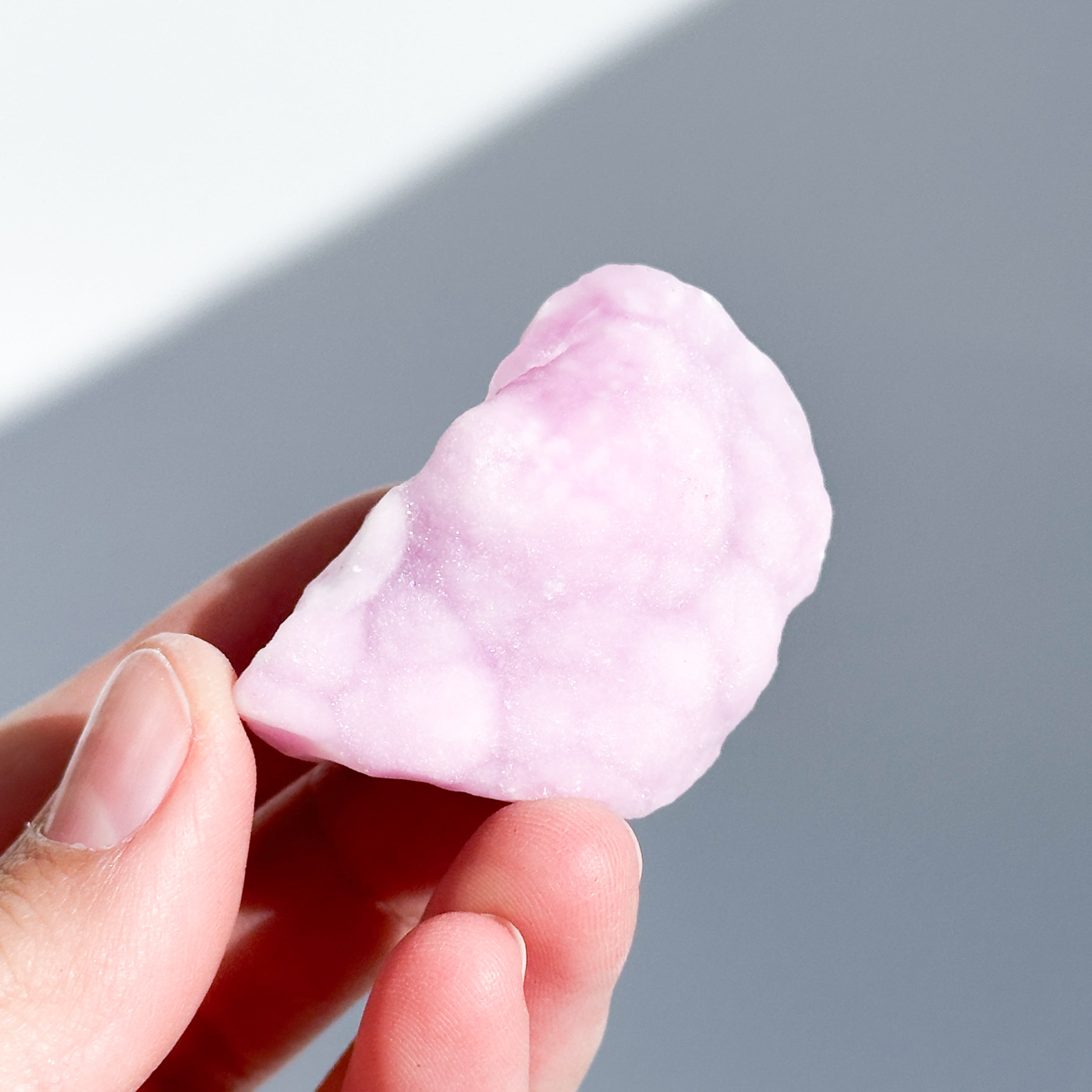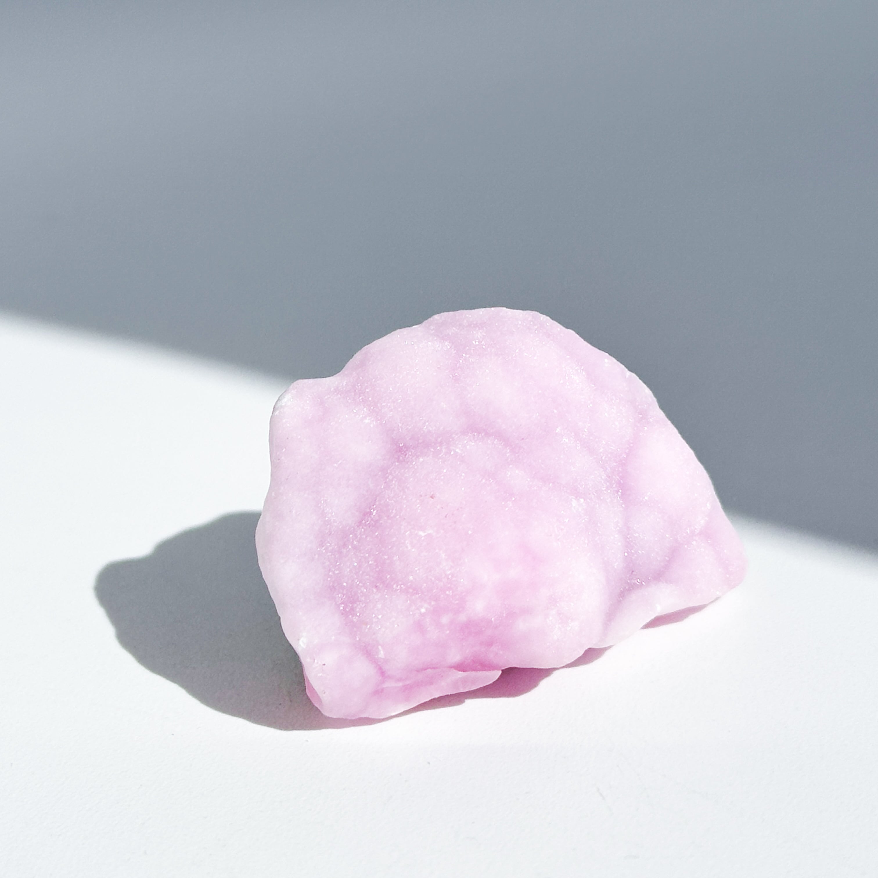 白色の部分も同じアラゴナイトです。アラゴナイト自体は世界中で産出する石ですが、このように、白とピンクが混じったものは、最近パキスタンで採掘されるようになったようで、他に類を見ない非常に珍しいものです✧