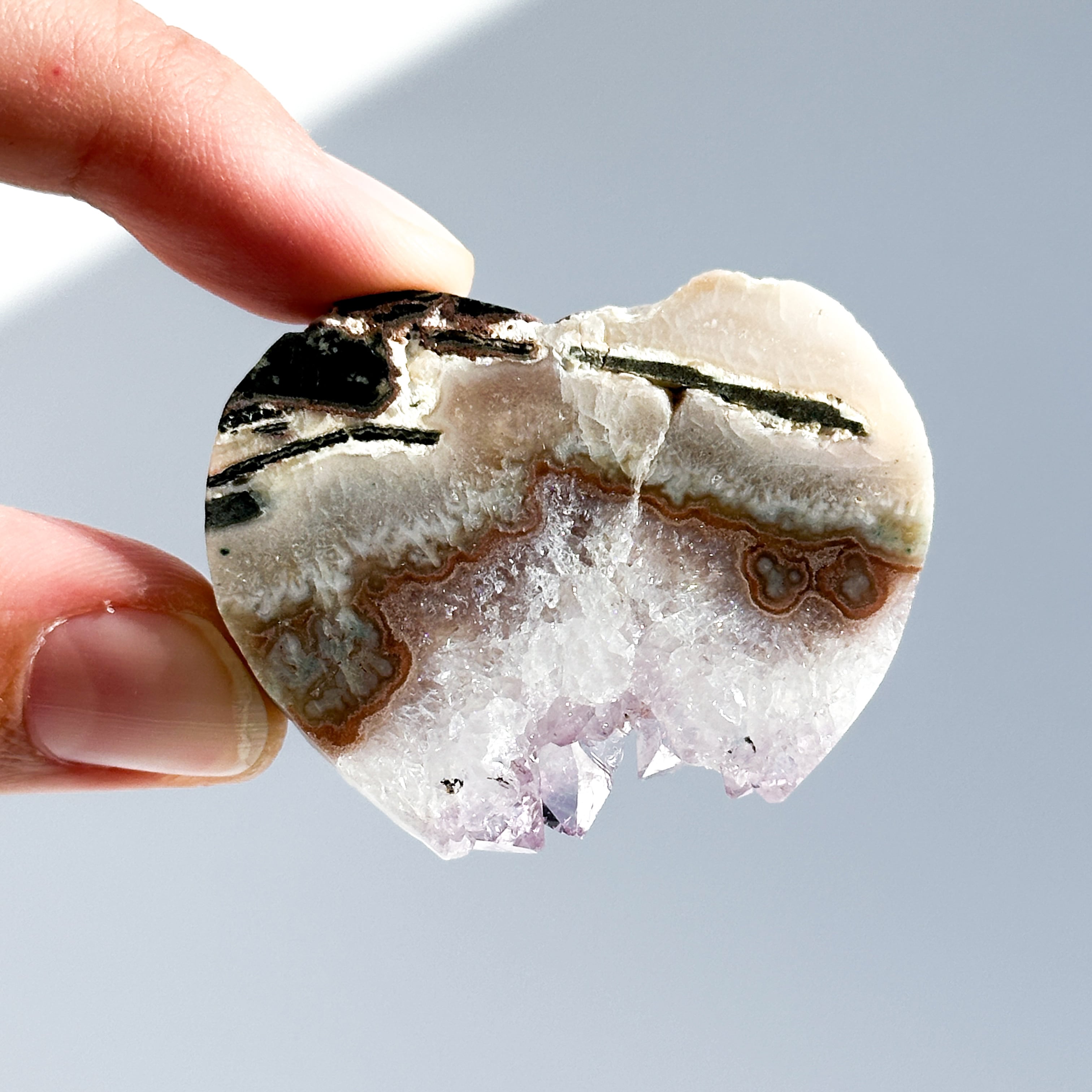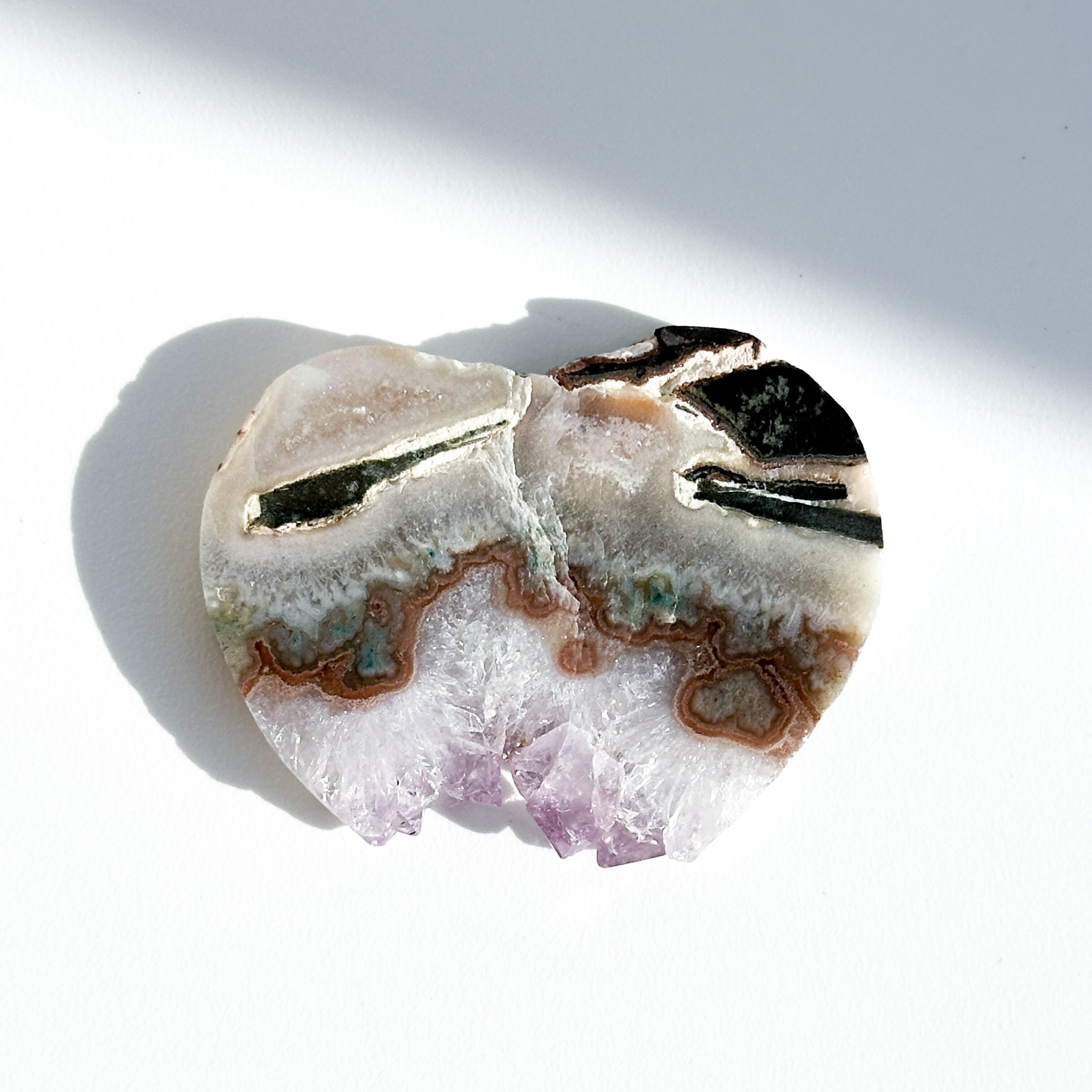アゲート(瑪瑙)上にアメジストが結晶化した原石をスライスし、
