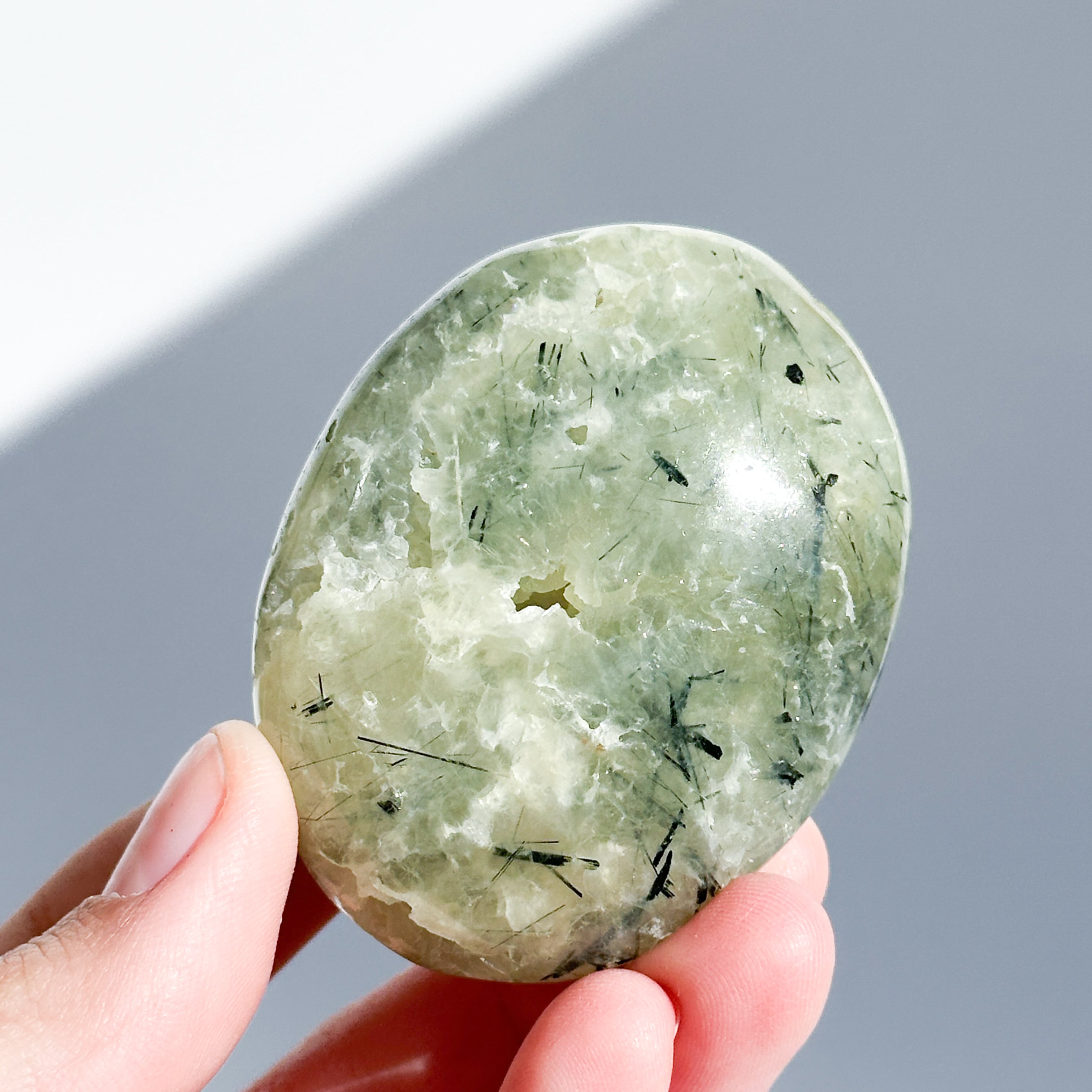 握りやすいパーム状に研磨され、プレナイト特有の艶やかな光沢が見られます。