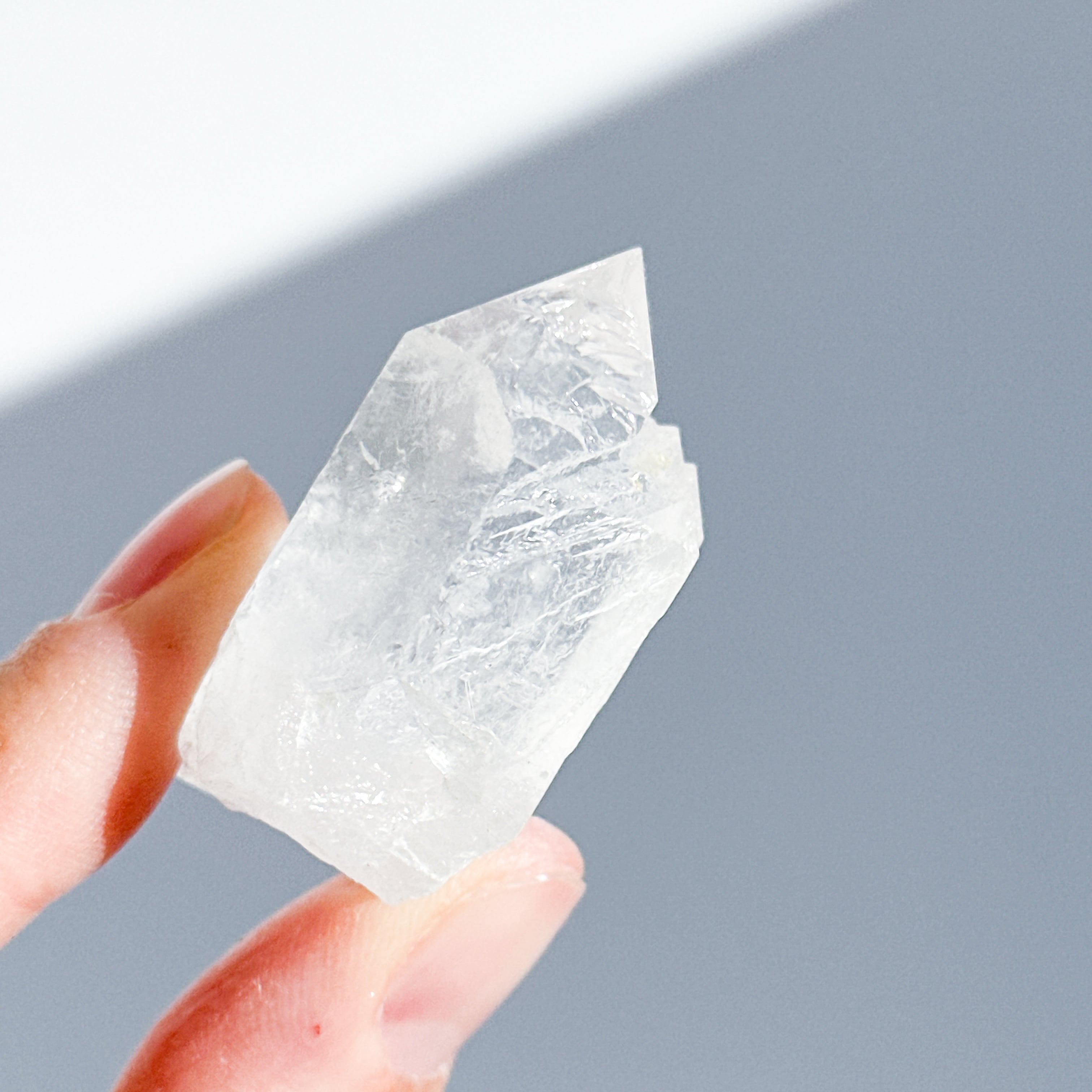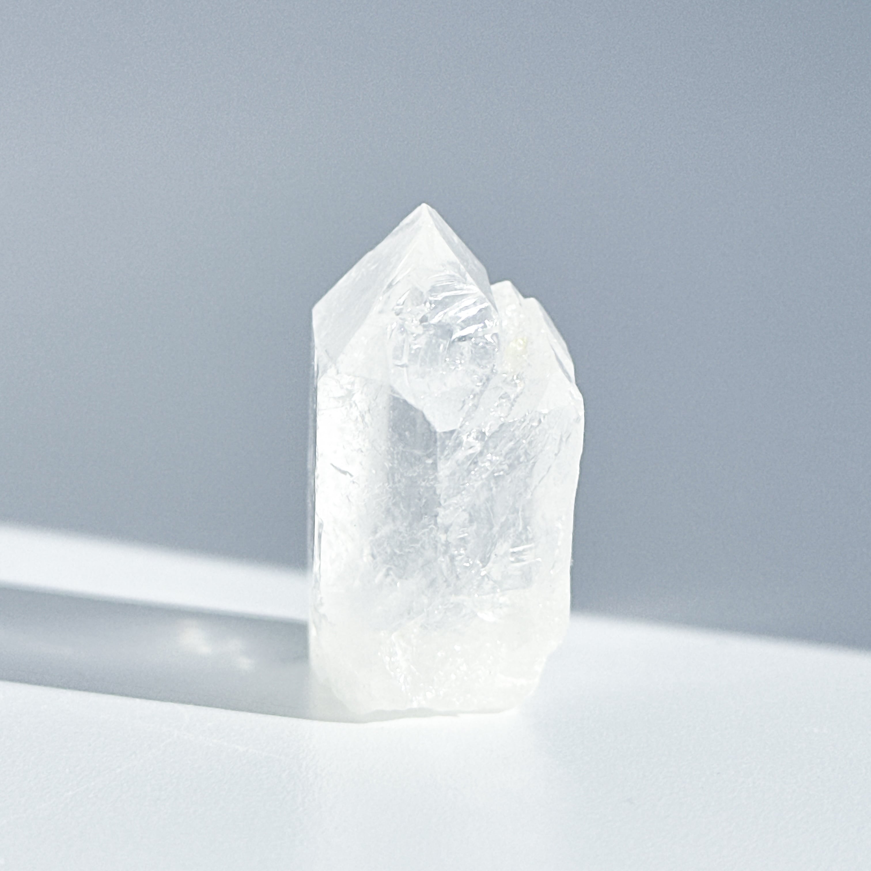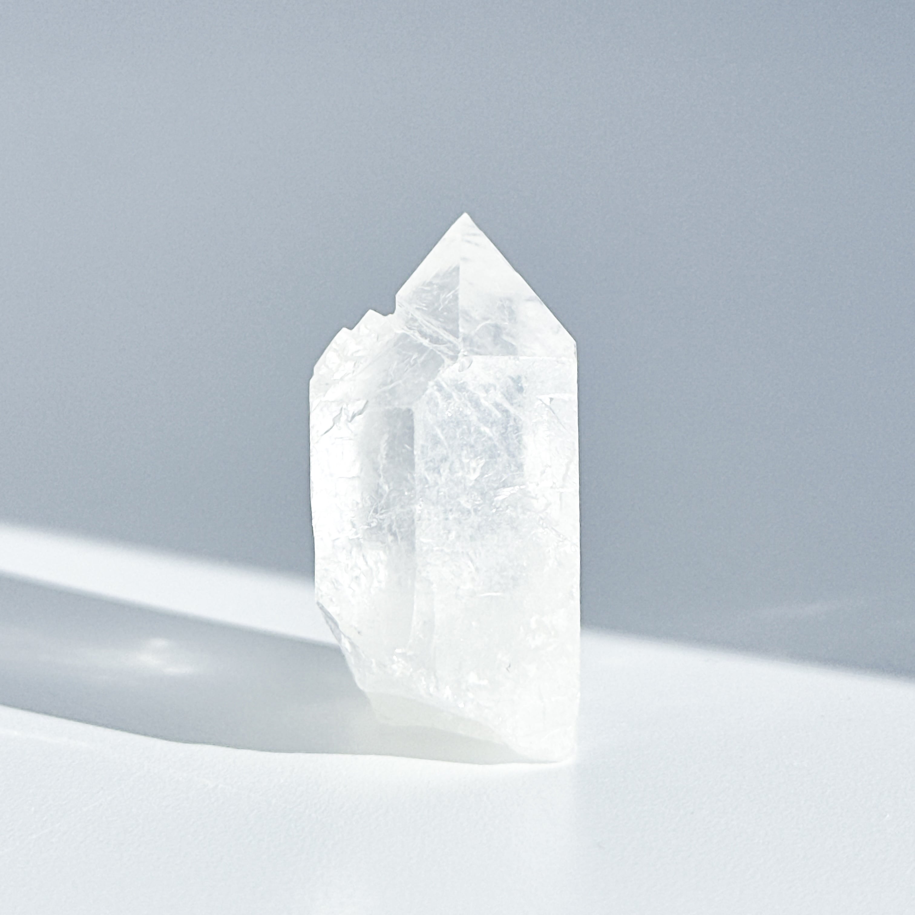 この独特な姿は、クリアクォーツが成長過程で他の鉱物からの干渉を受けながら形成された証。