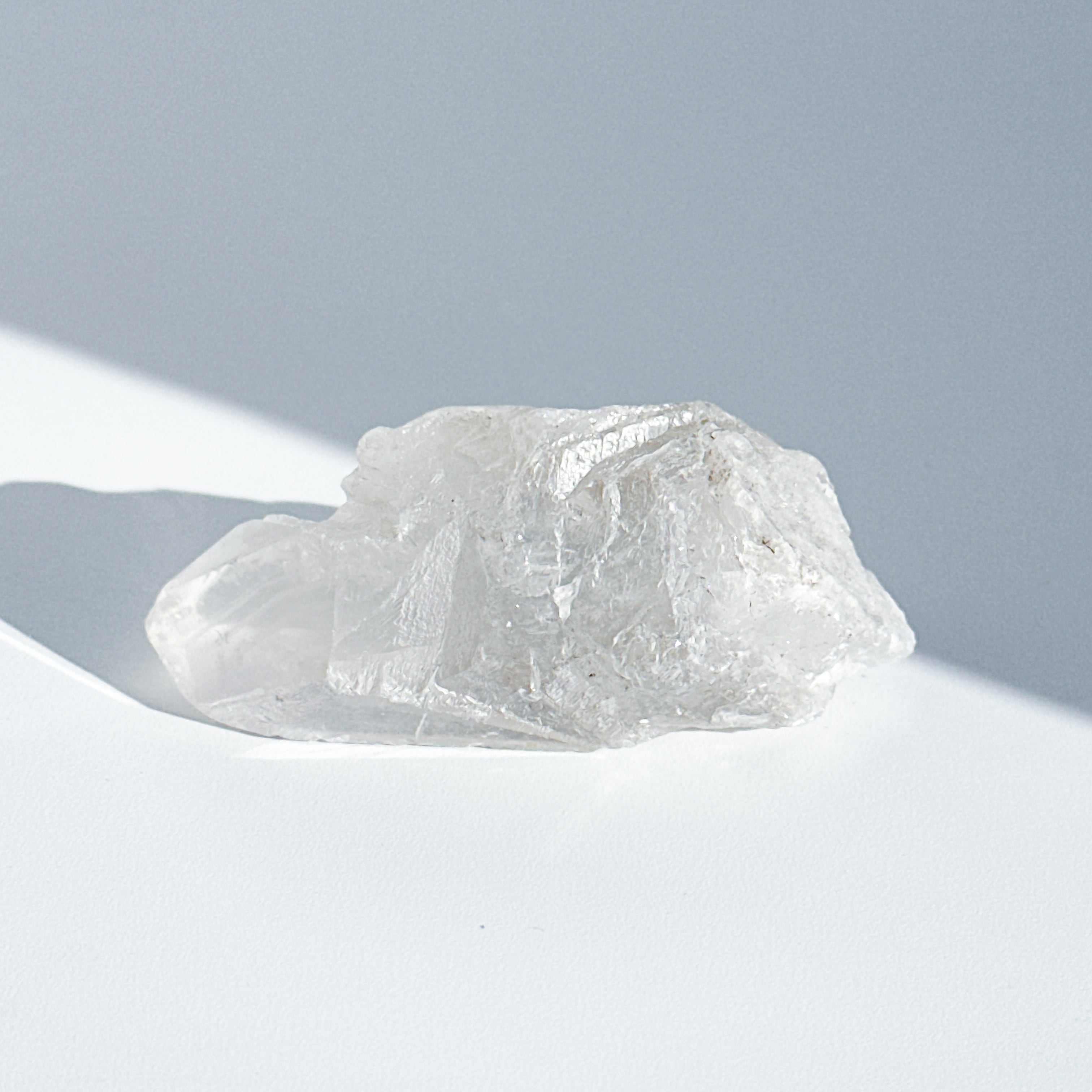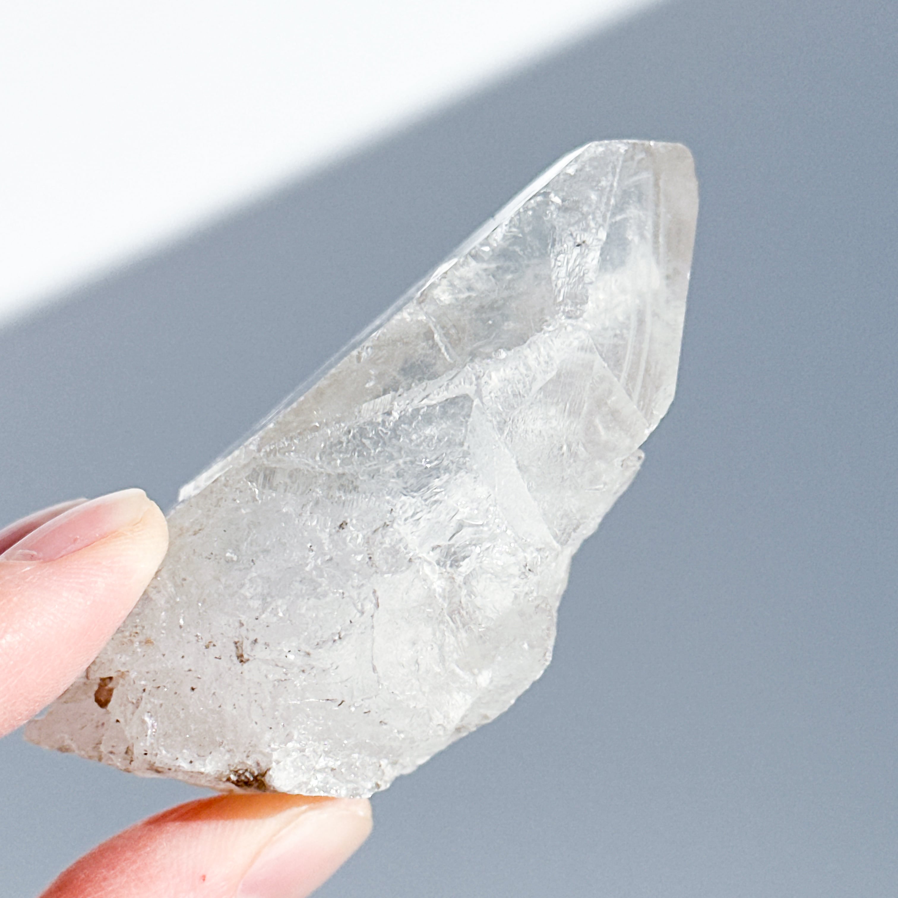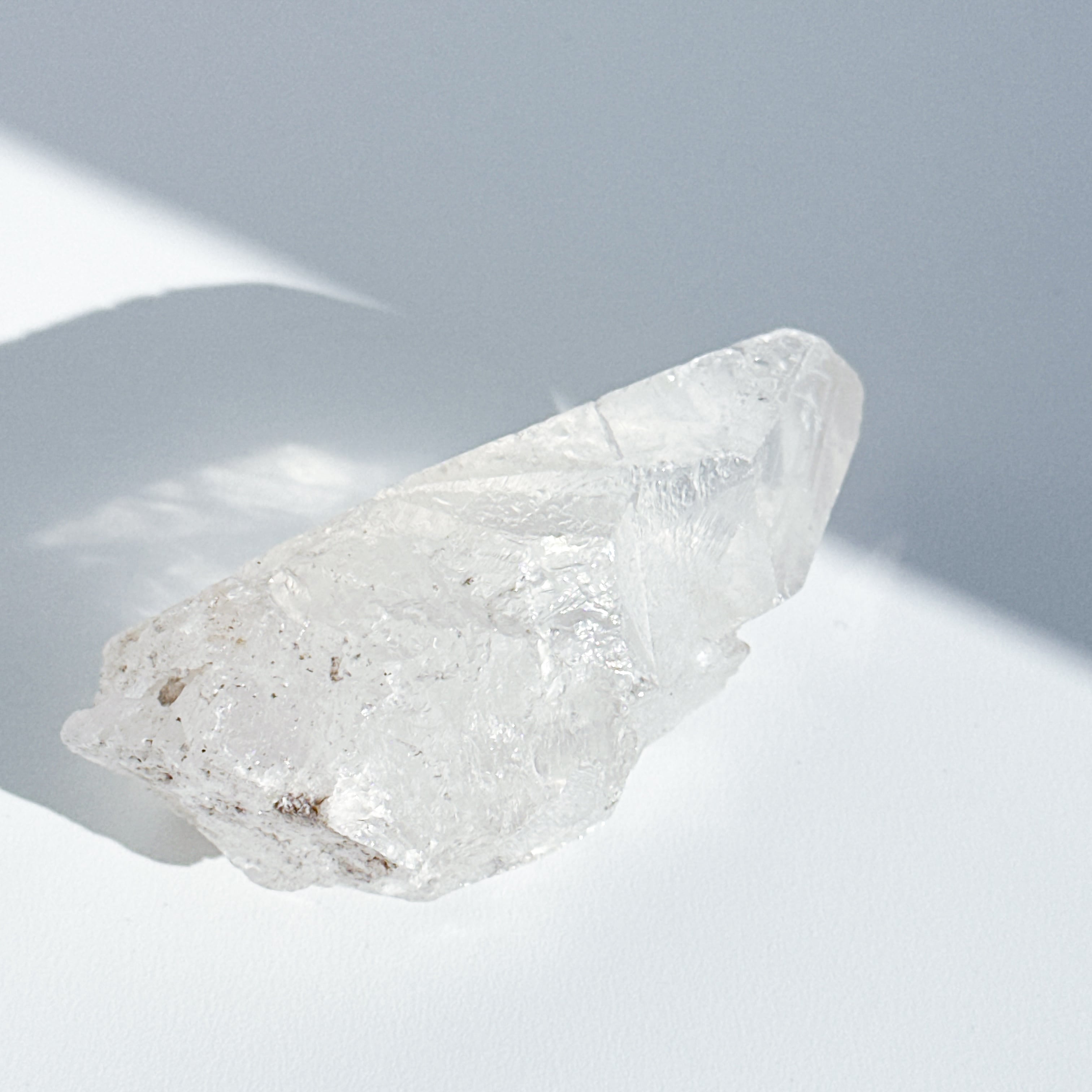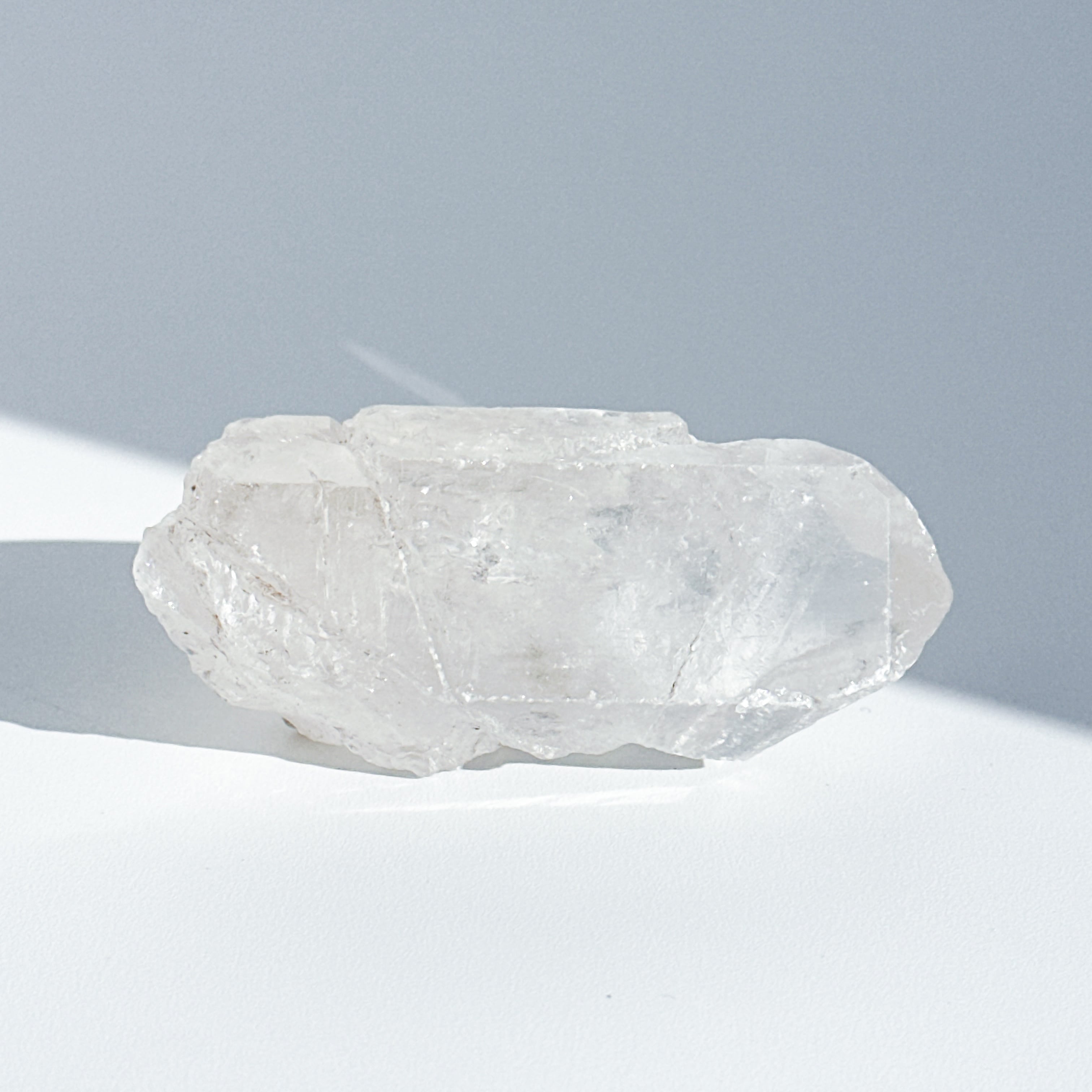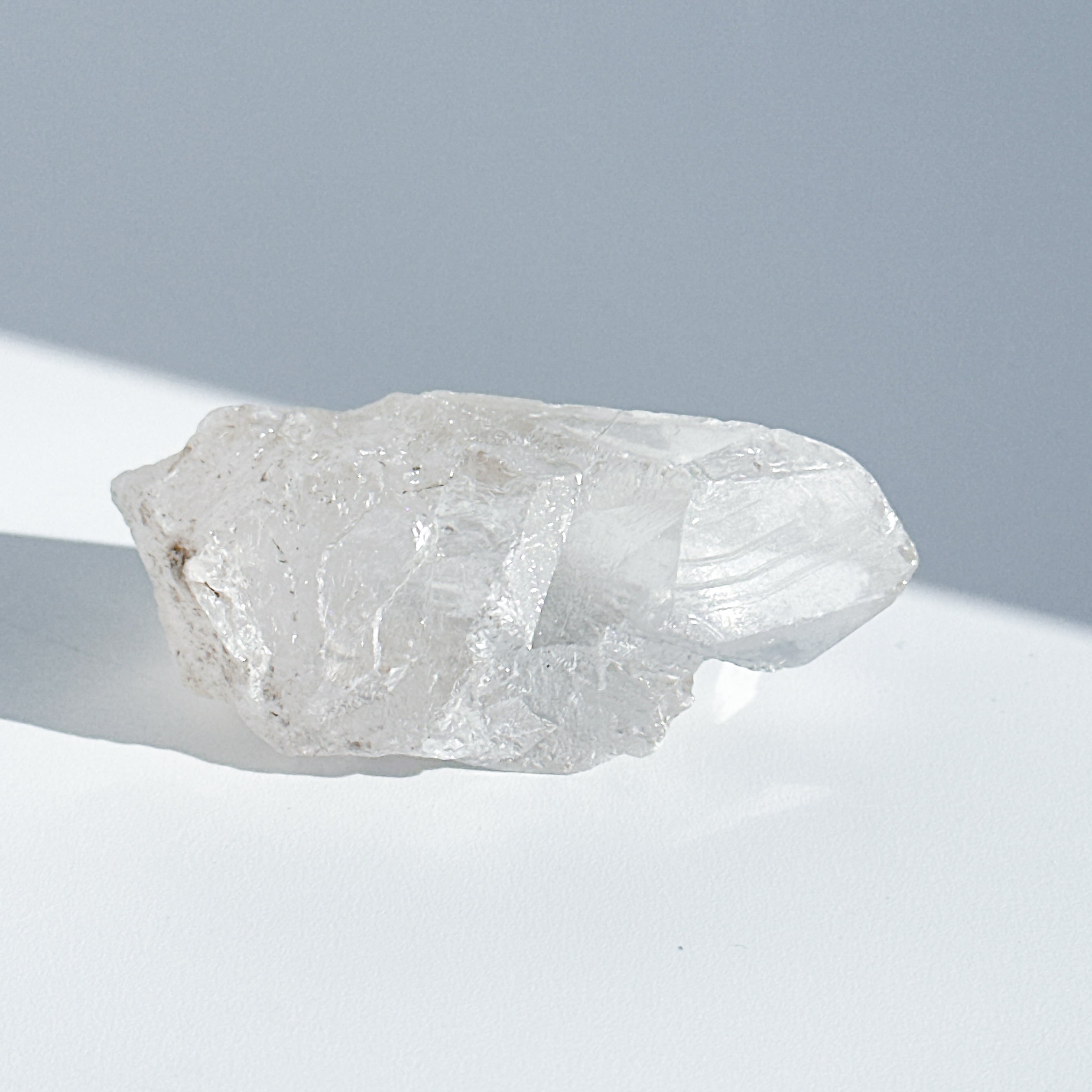 この独特な姿は、クリアクォーツが成長過程で他の鉱物からの干渉を受けながら形成された証。