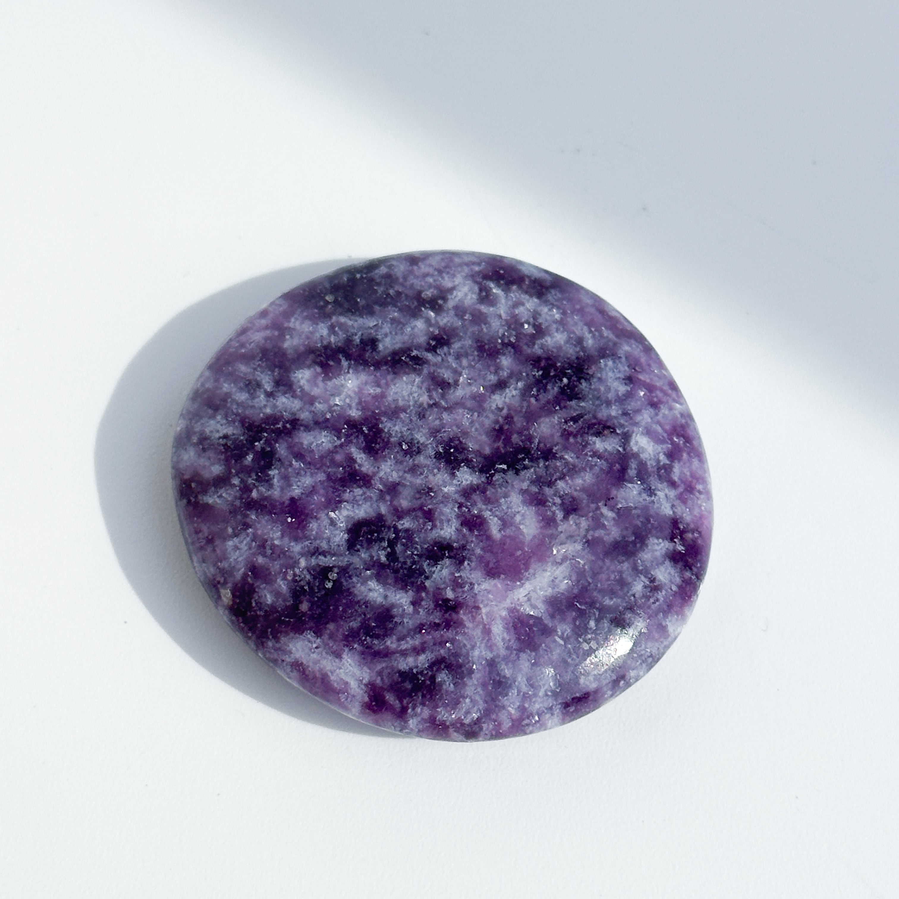 パープル色の鉱石、レピドライトの原石をパーム型に研磨しました。
