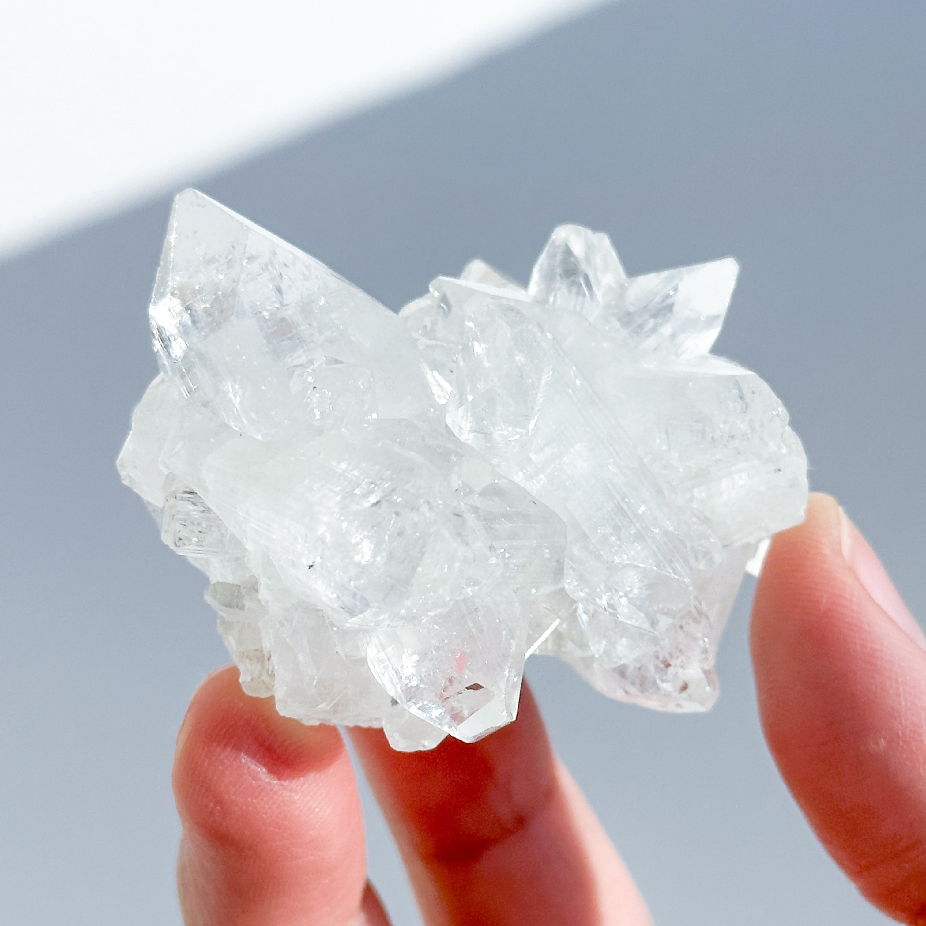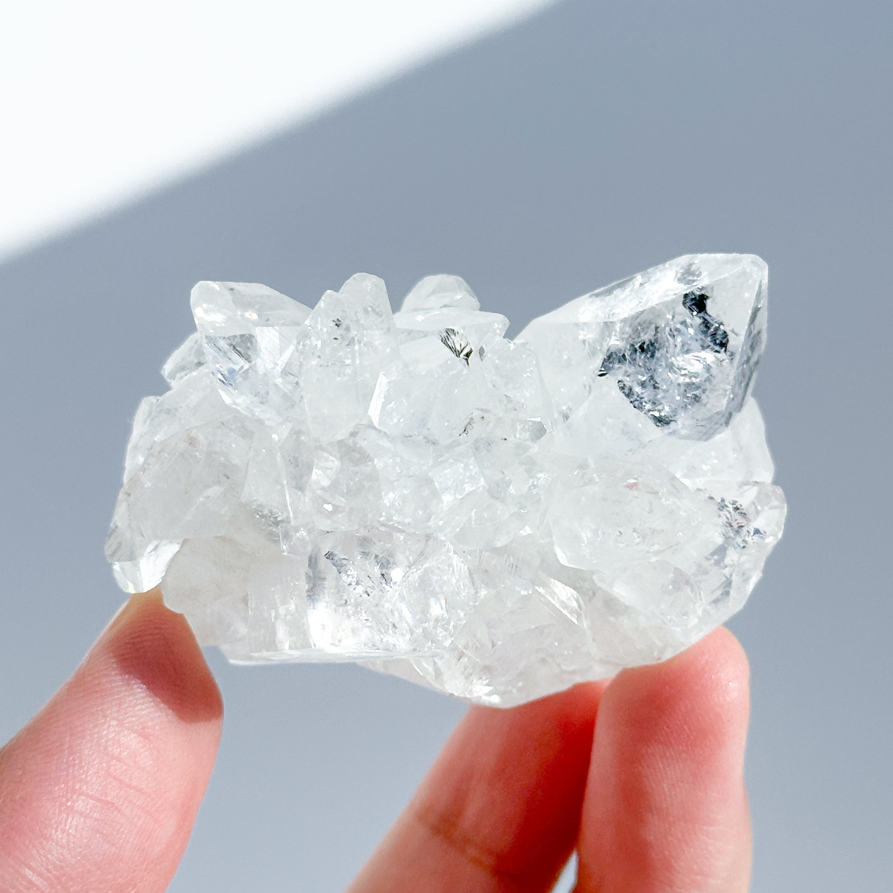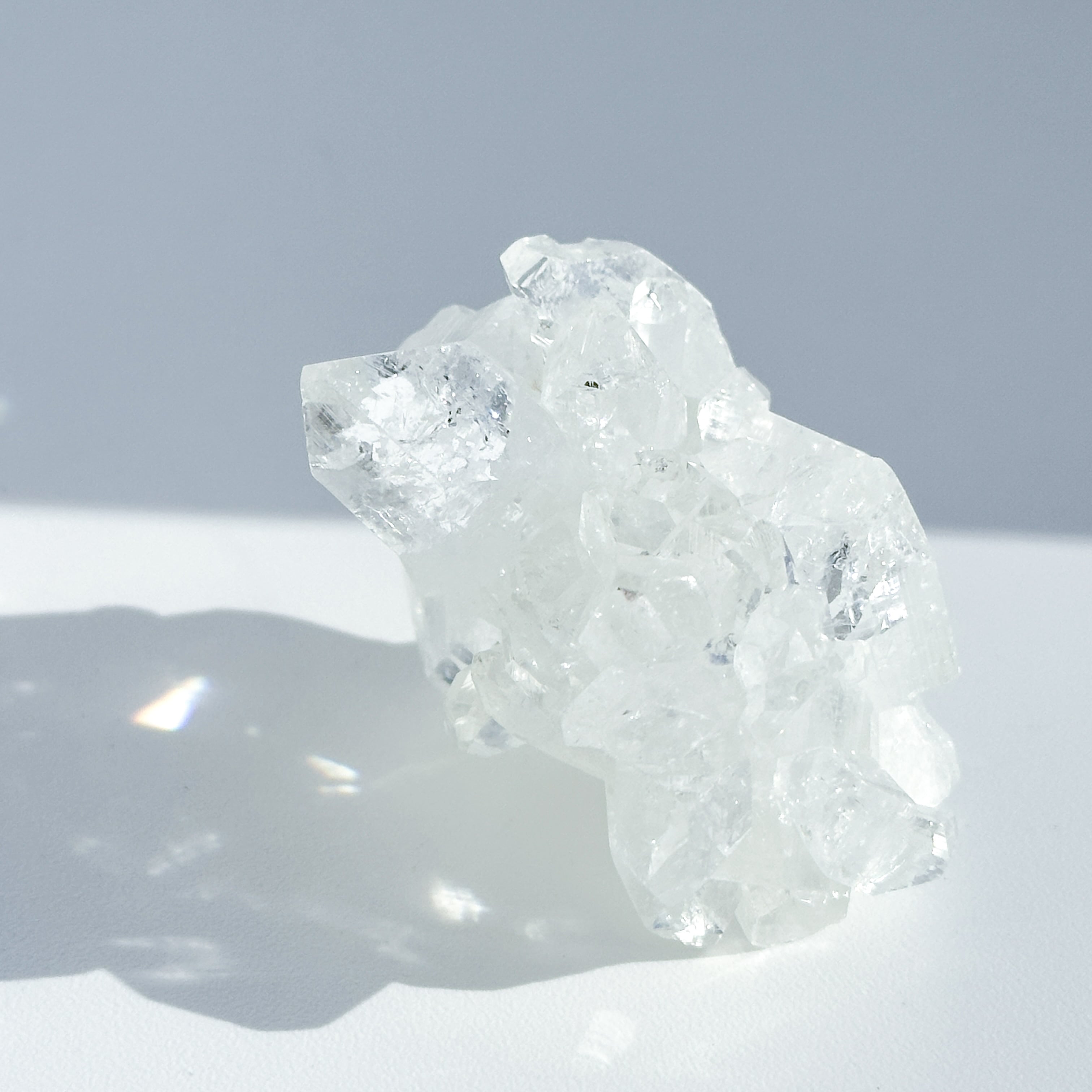 その透明度は向こう側を望めるほどです。水晶との違いは結晶の形で、水晶は六角形であるのに対し、アポフィライトは四角形です(先端も尖っておらず、菱型になっています)
