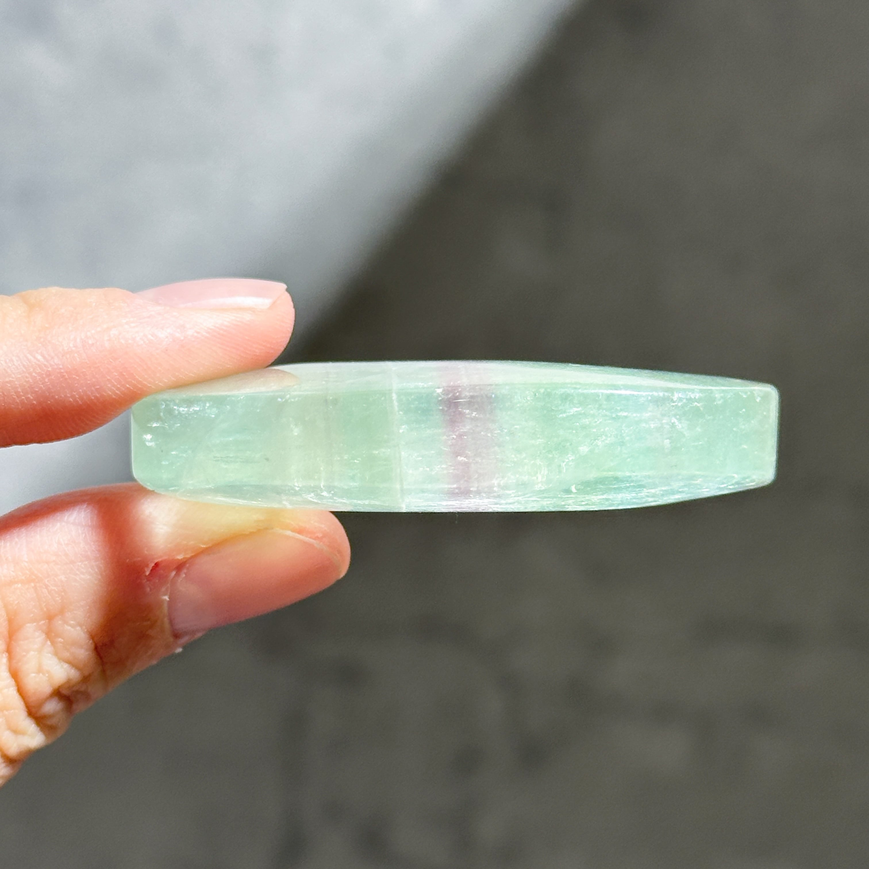レインボーフローライトは複数のカラー(透明・パープル・ブルー・ピンク・グリーン)が共生し、水面のような曲線の模様を生み出しています。