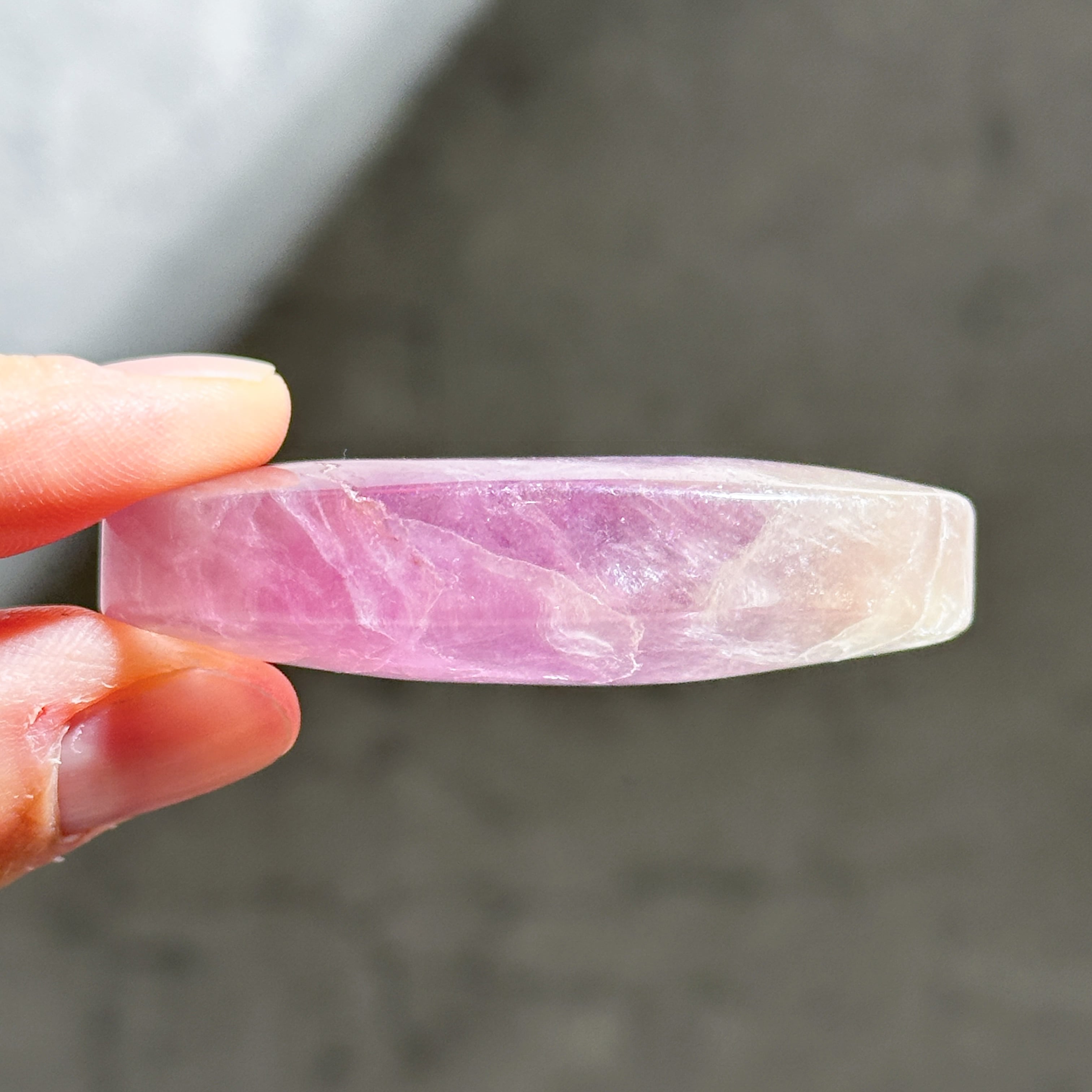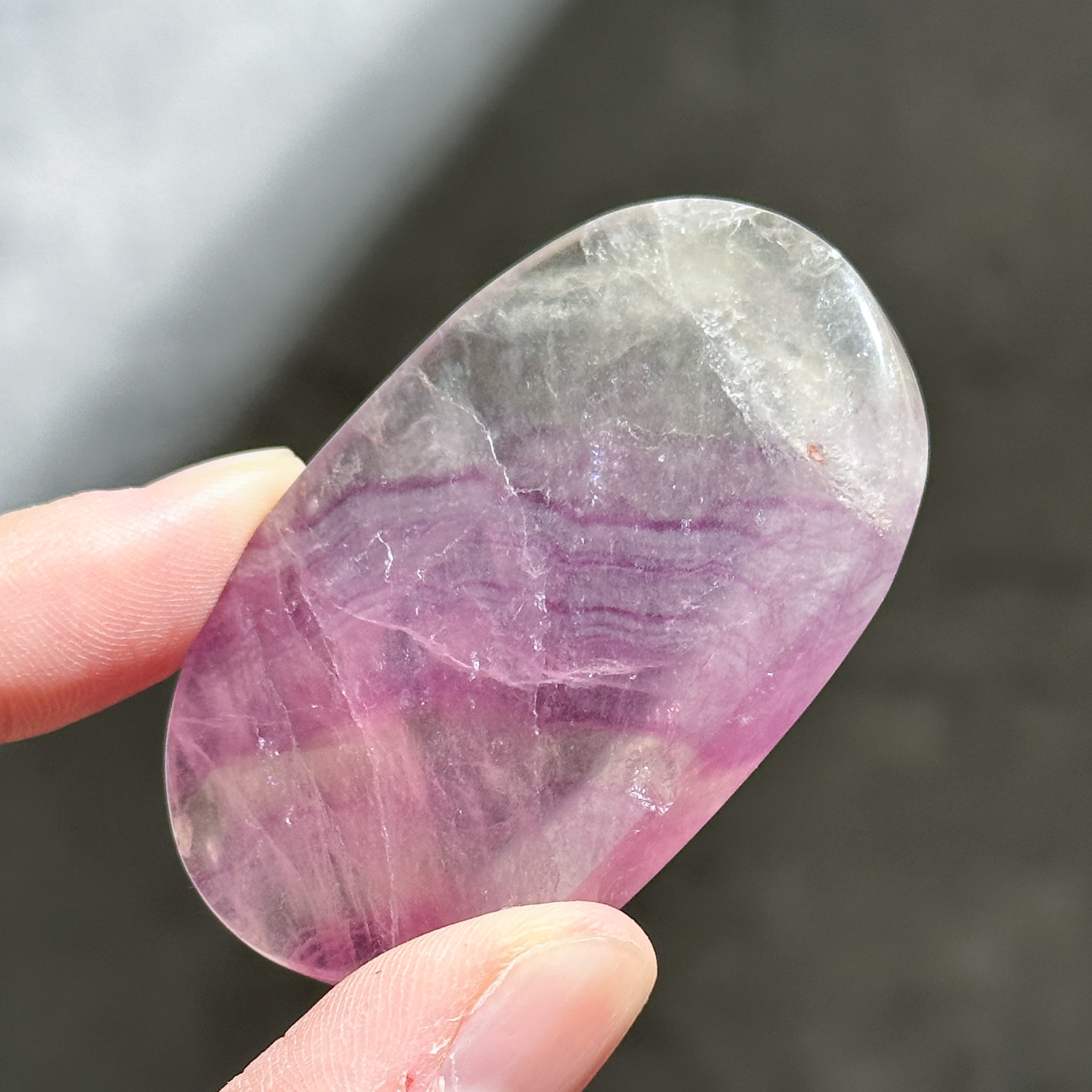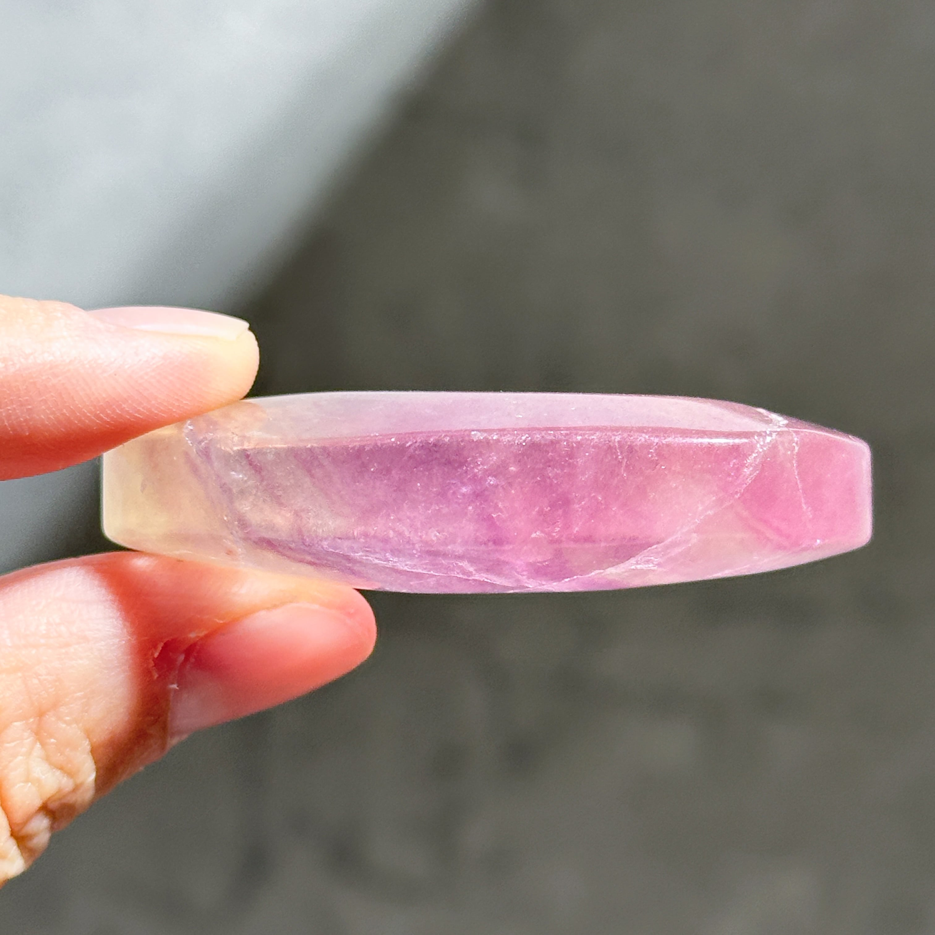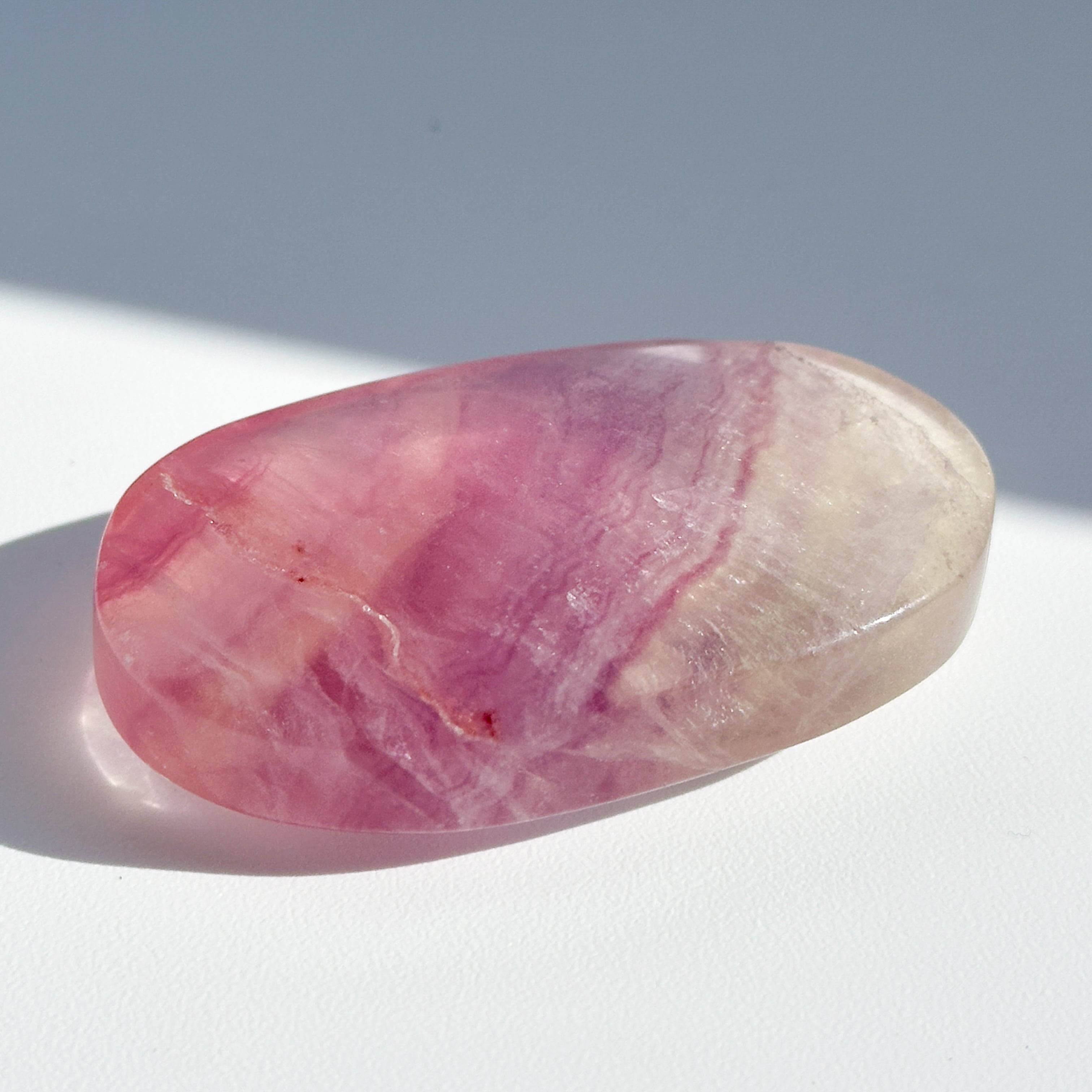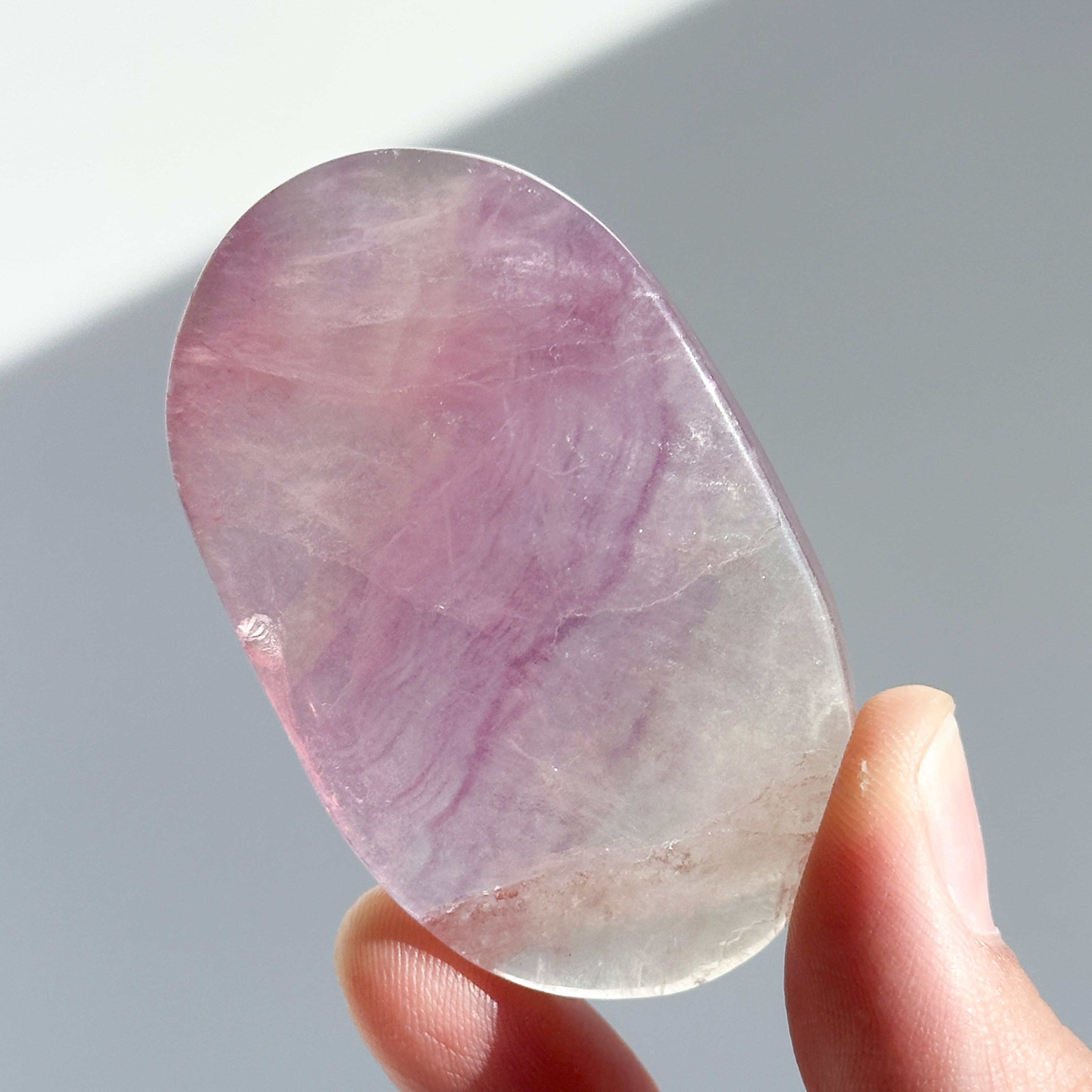 レインボーフローライトは複数のカラー(透明・パープル・ブルー・ピンク・グリーン)が共生し、水面のような曲線の模様を生み出しています。