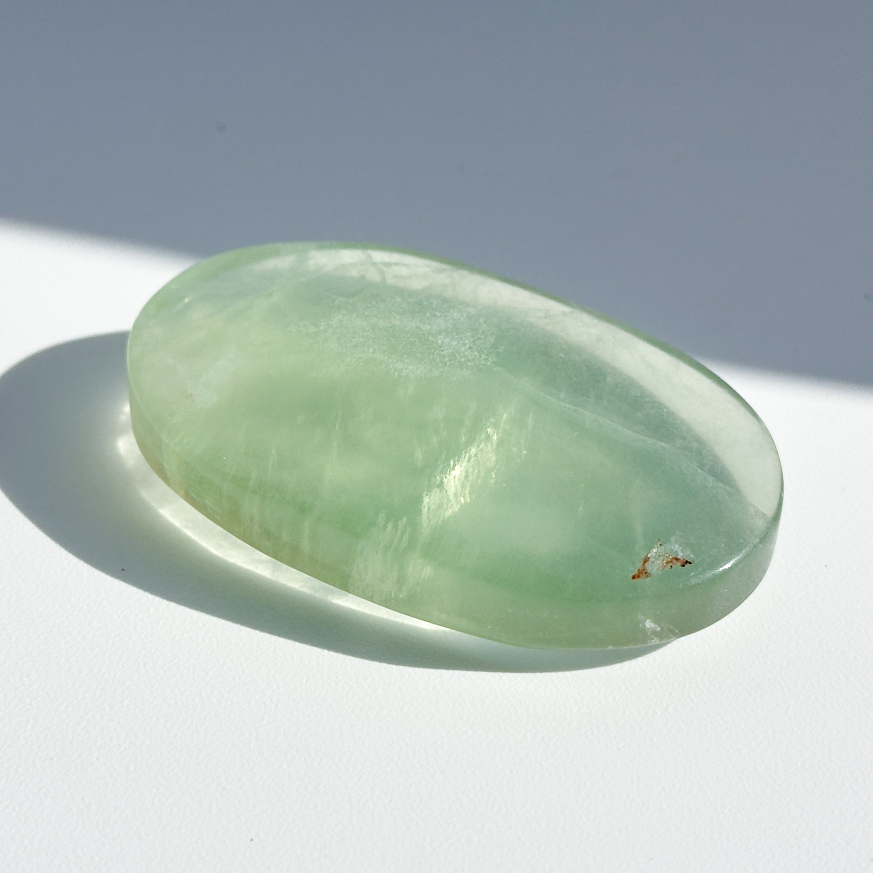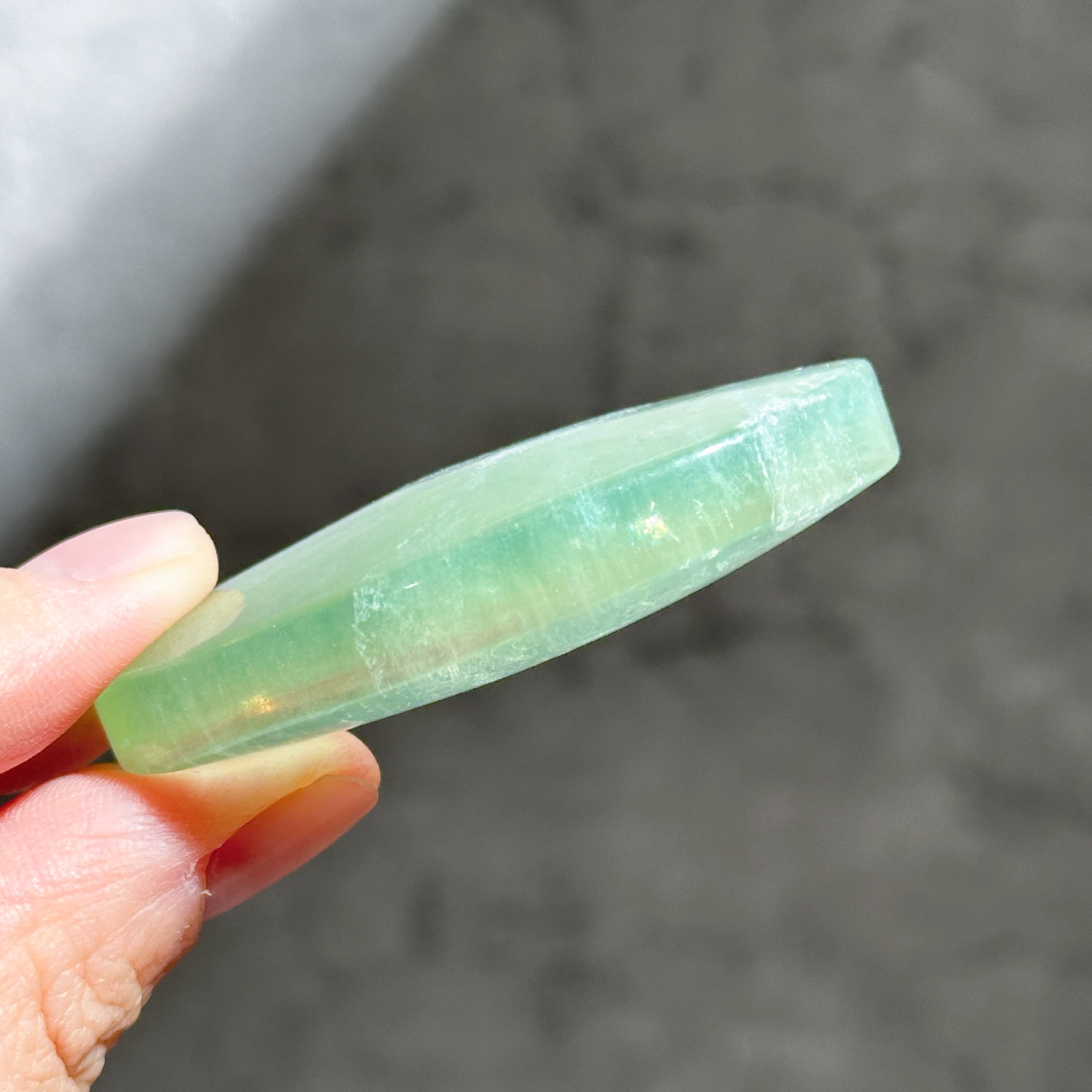 レインボーフローライトは複数のカラー(透明・パープル・ブルー・ピンク・グリーン)が共生し、水面のような曲線の模様を生み出しています。