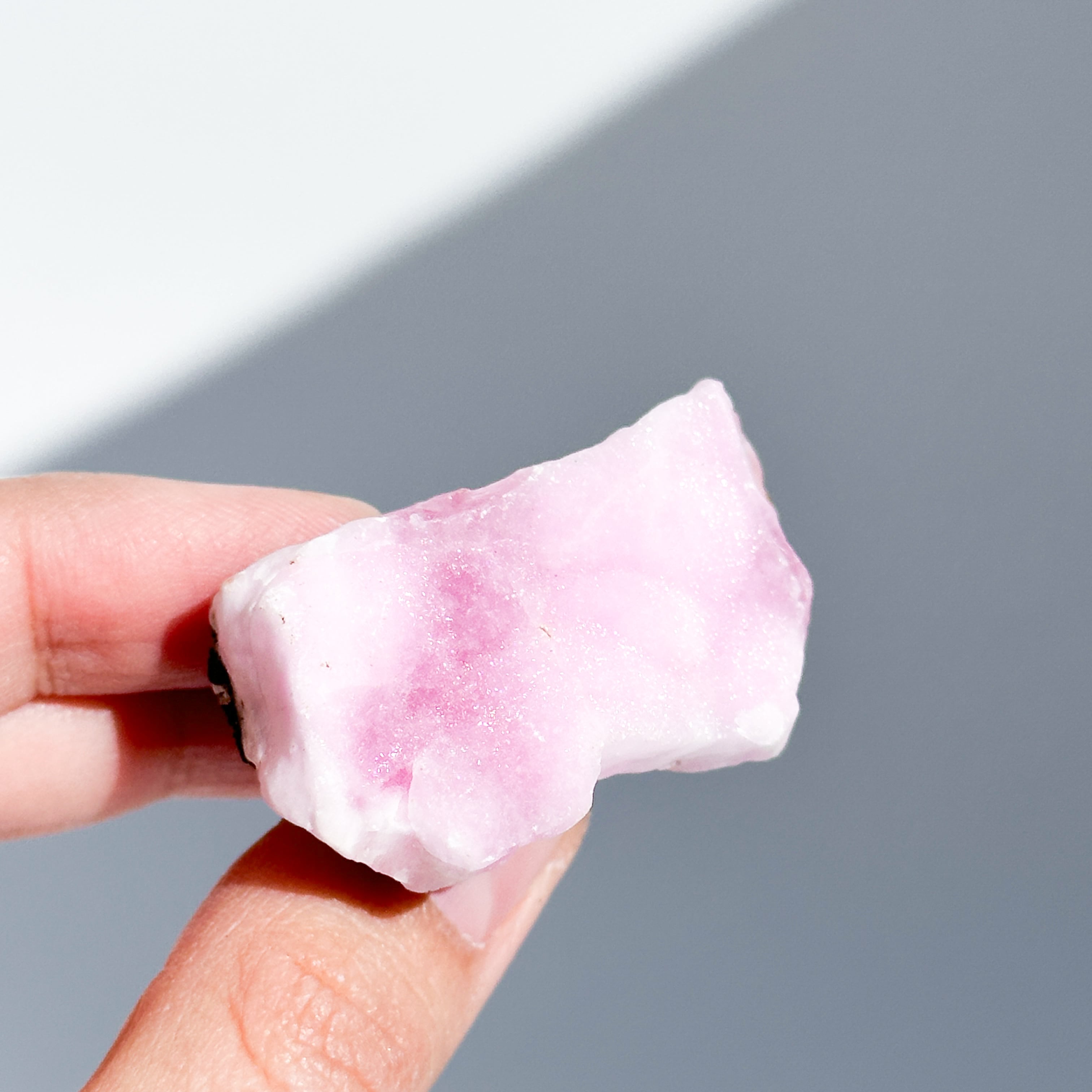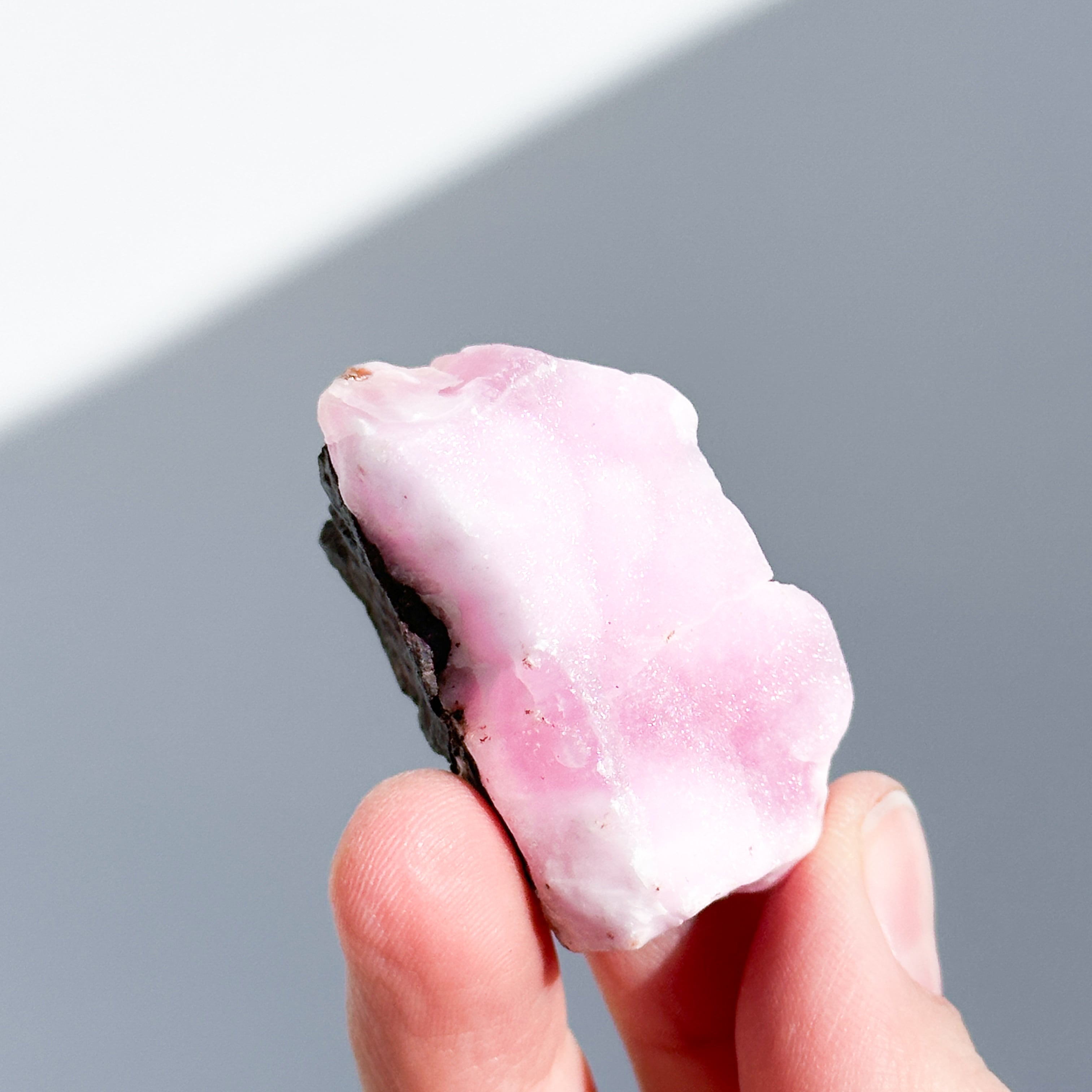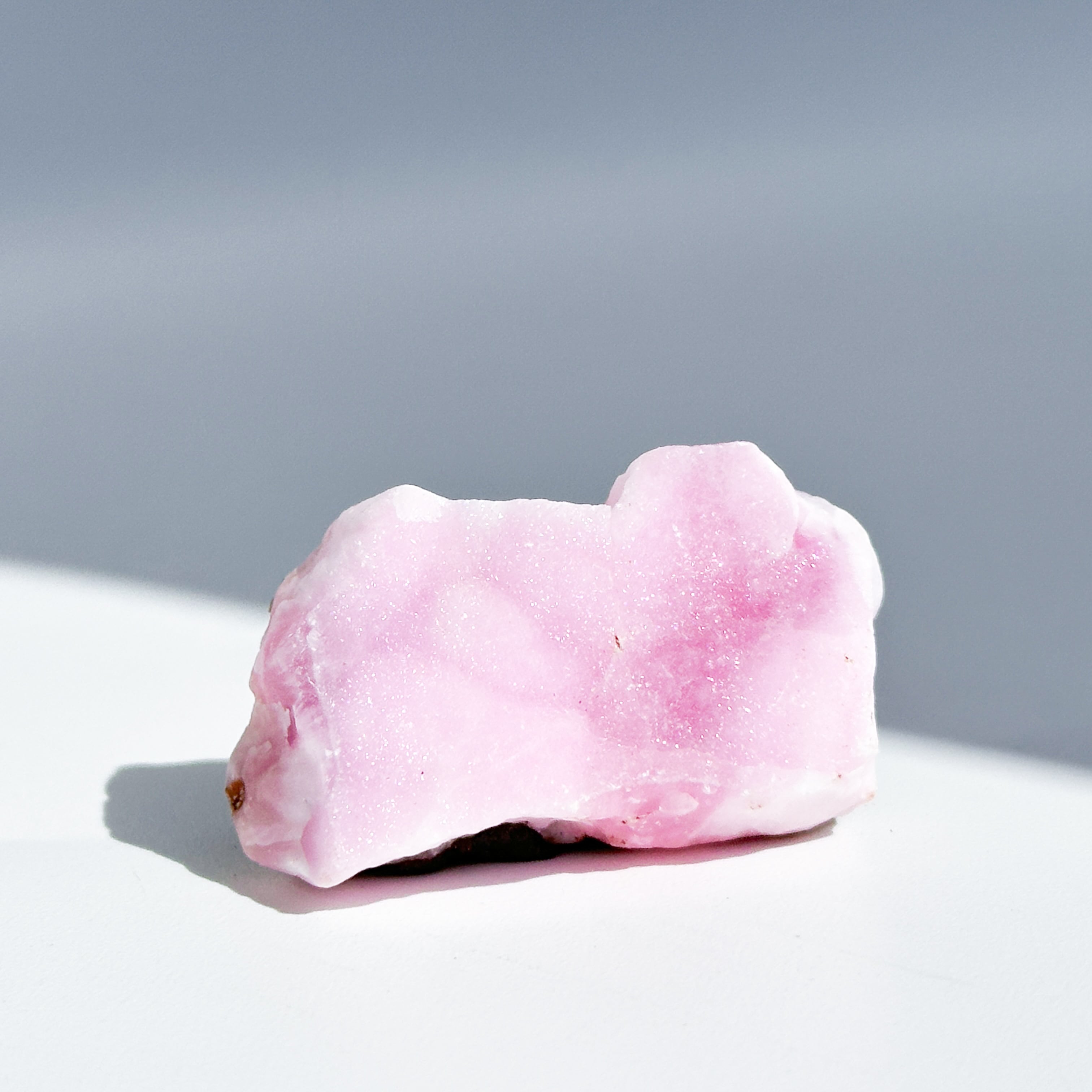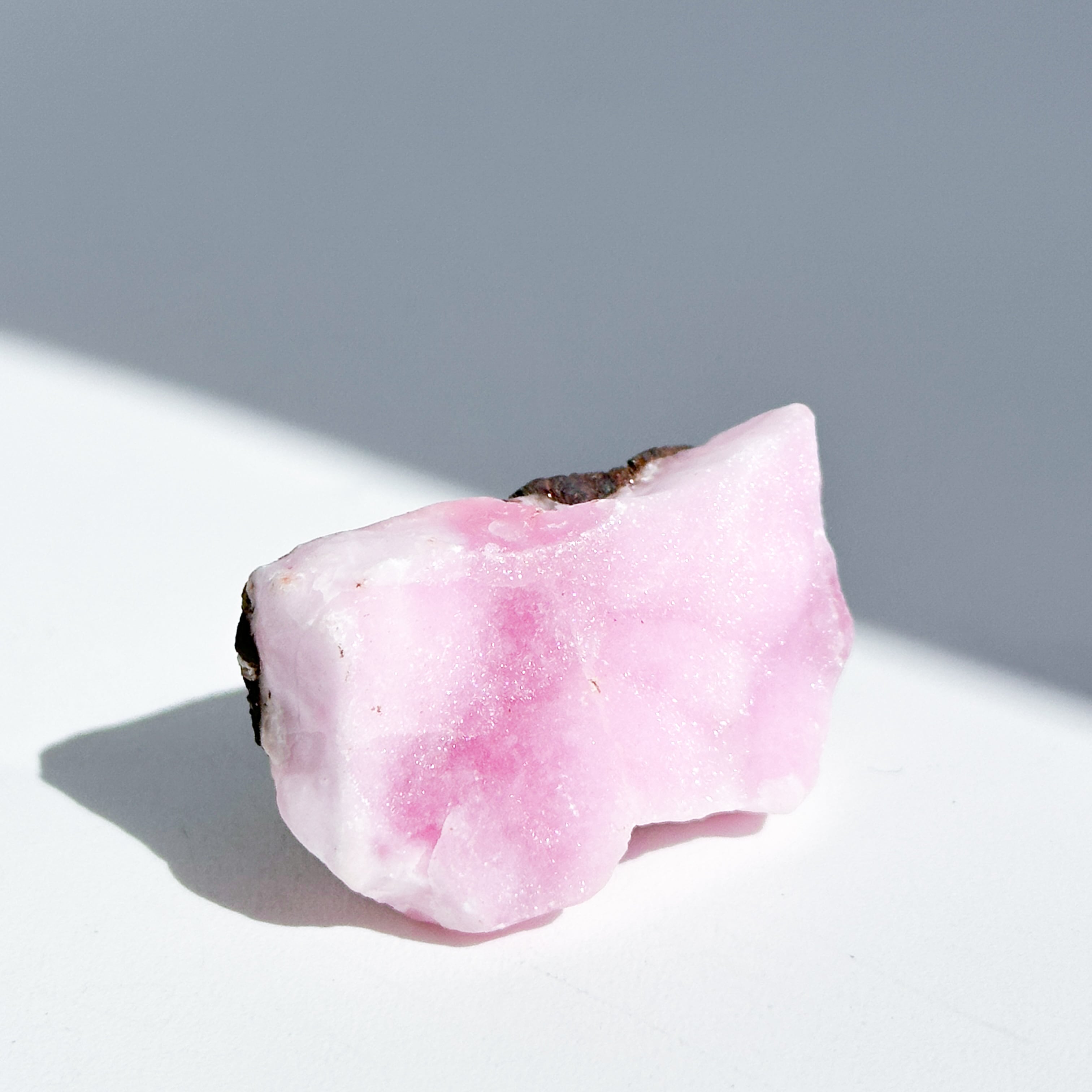 白色の部分も同じアラゴナイトです。アラゴナイト自体は世界中で産出する石ですが、このように、白とピンクが混じったものは、最近パキスタンで採掘されるようになったようで、他に類を見ない非常に珍しいものです✧