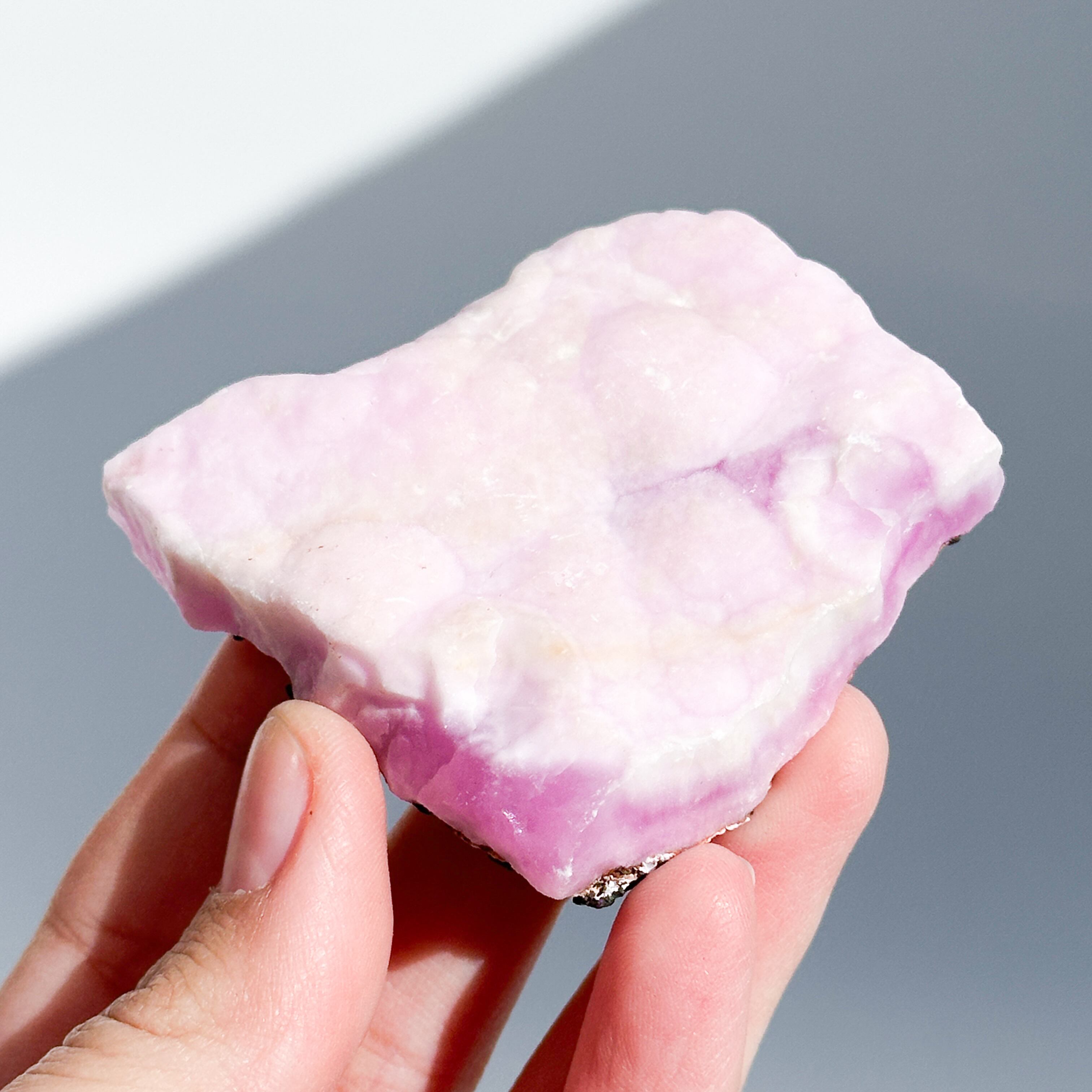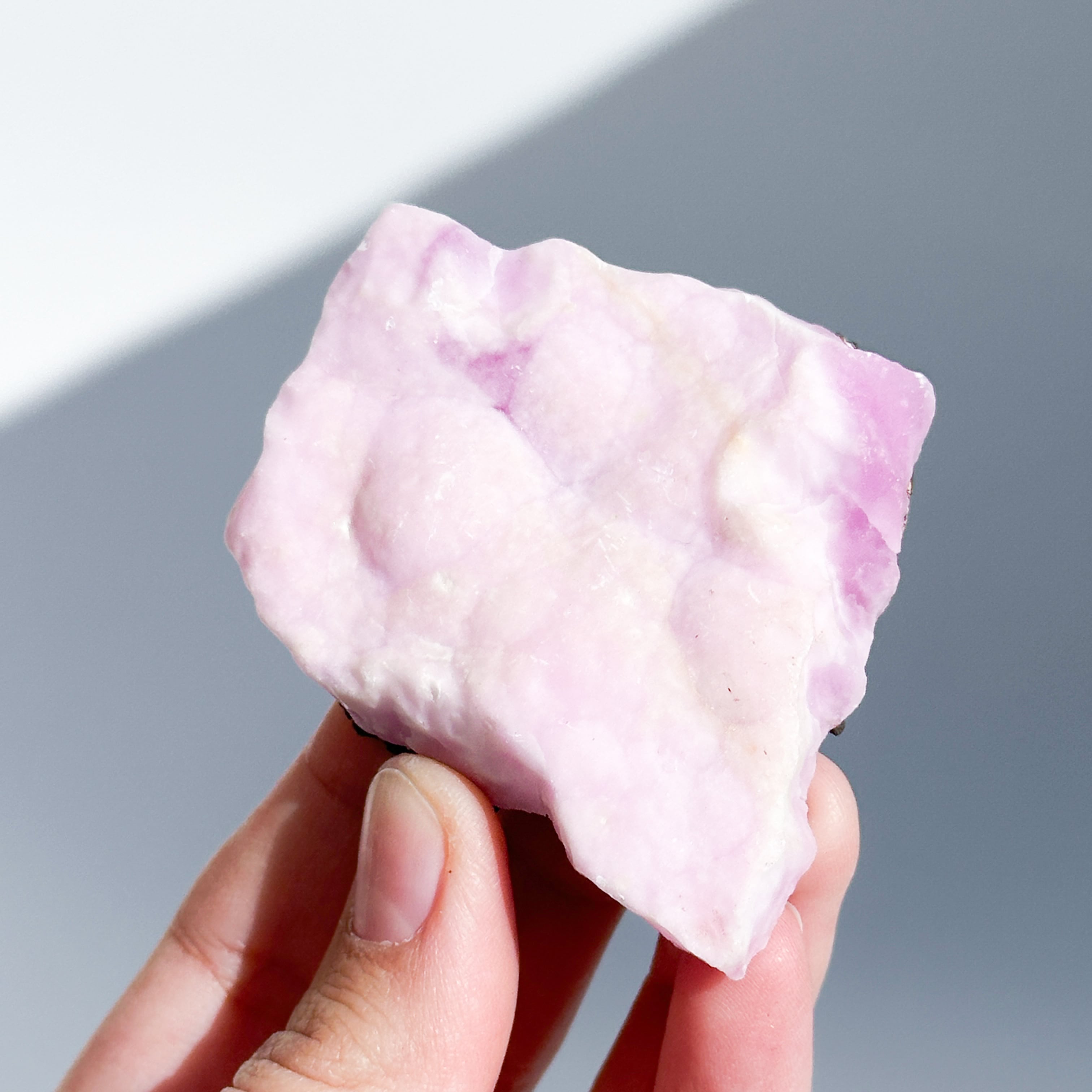 白色の部分も同じアラゴナイトです。アラゴナイト自体は世界中で産出する石ですが、このように、白とピンクが混じったものは、最近パキスタンで採掘されるようになったようで、他に類を見ない非常に珍しいものです✧
