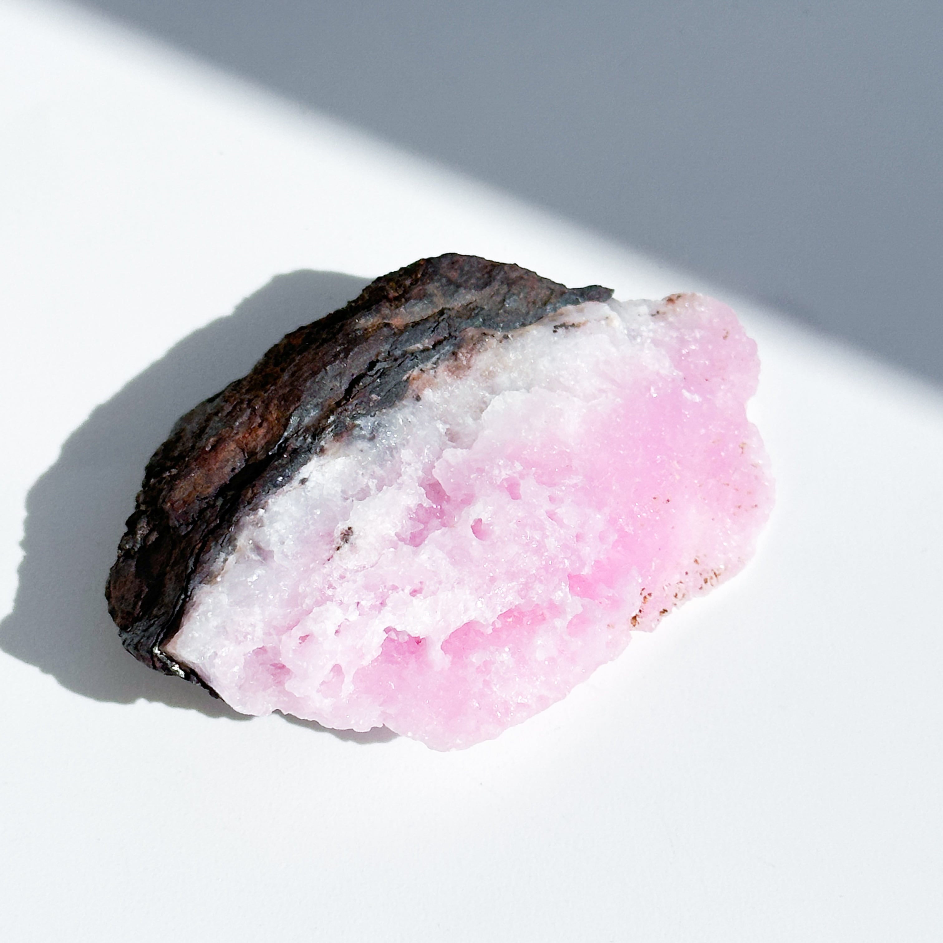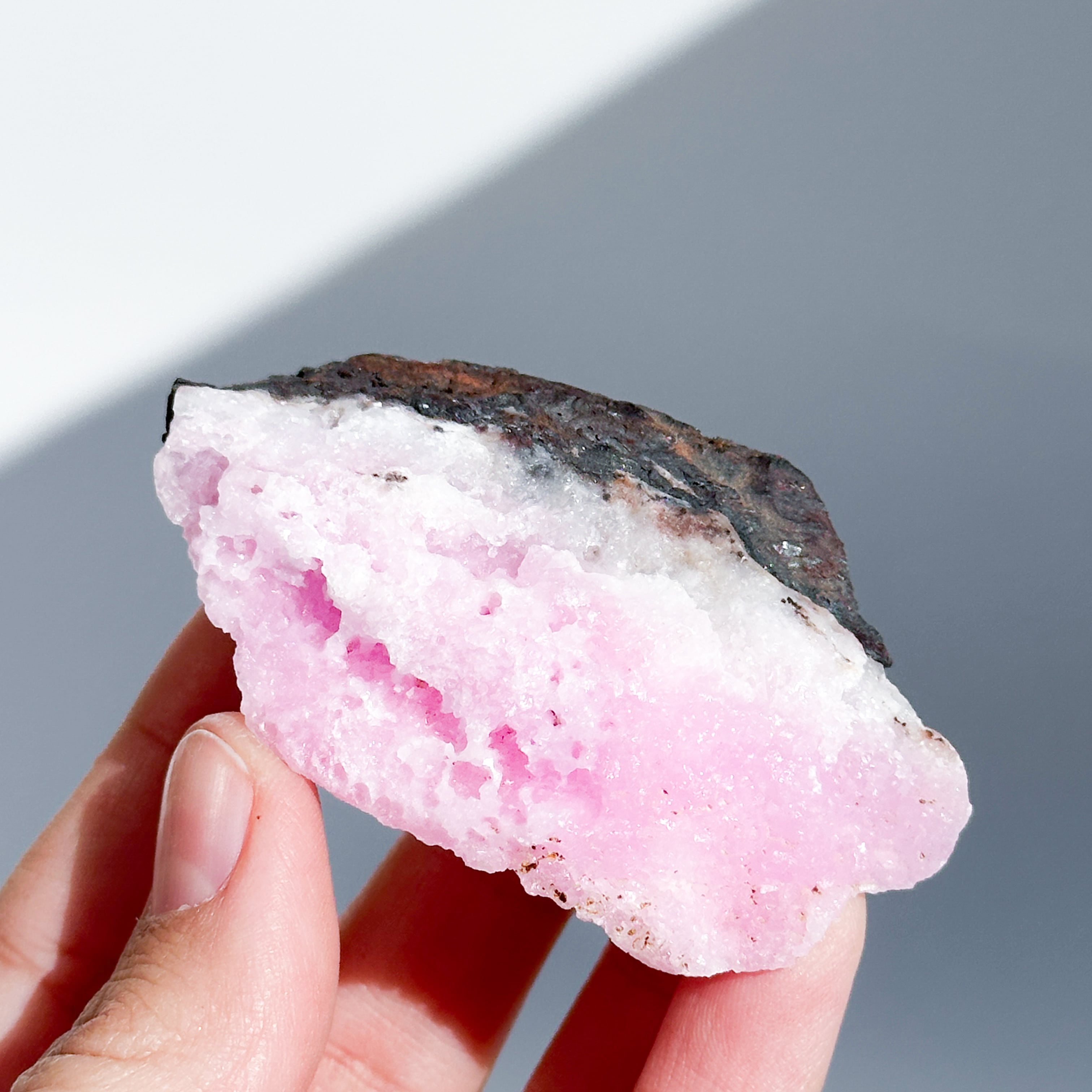 白色の部分も同じアラゴナイトです。アラゴナイト自体は世界中で産出する石ですが、このように、白とピンクが混じったものは、最近パキスタンで採掘されるようになったようで、他に類を見ない非常に珍しいものです✧