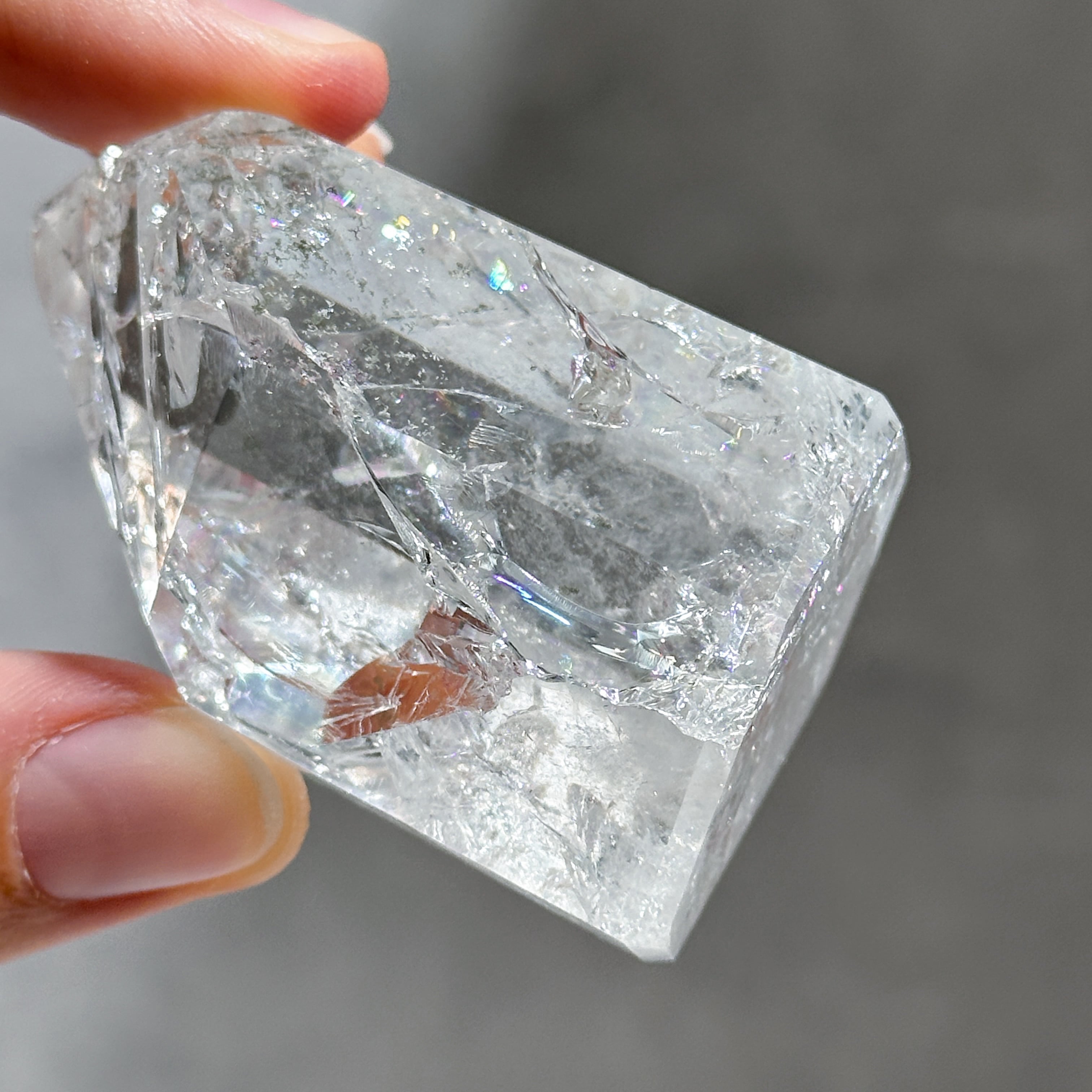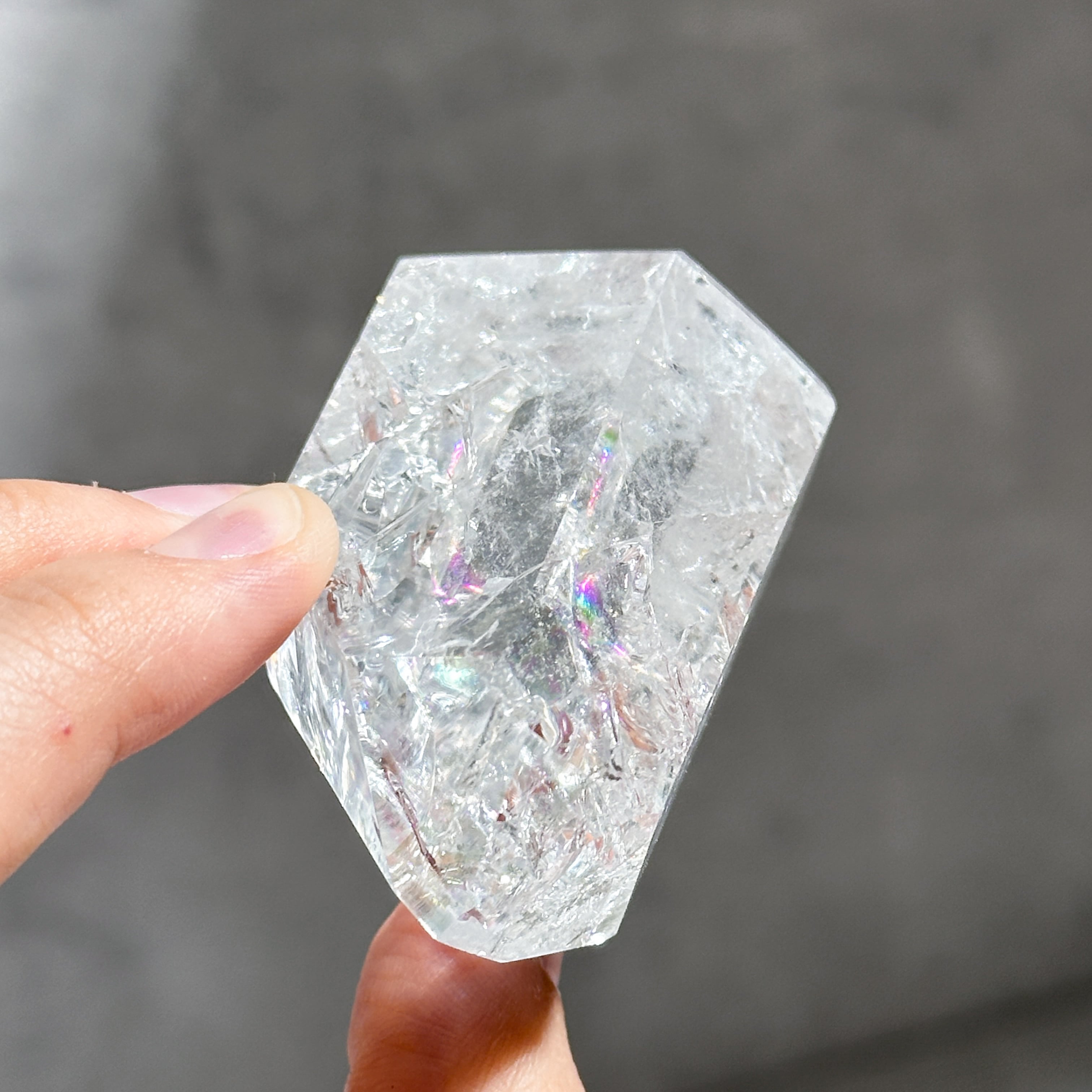 水晶にクラック(ひびや割れ)があると、光が屈折して、プリズムのようにレインボーの七色の輝きが見られます。
