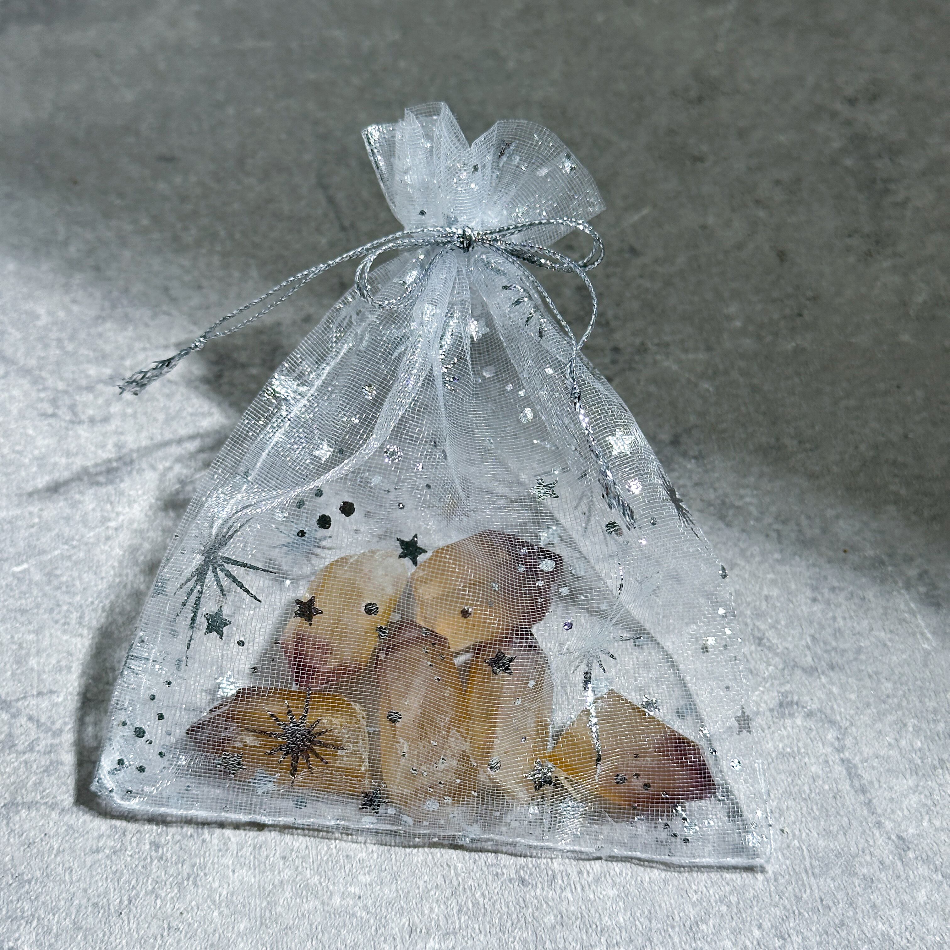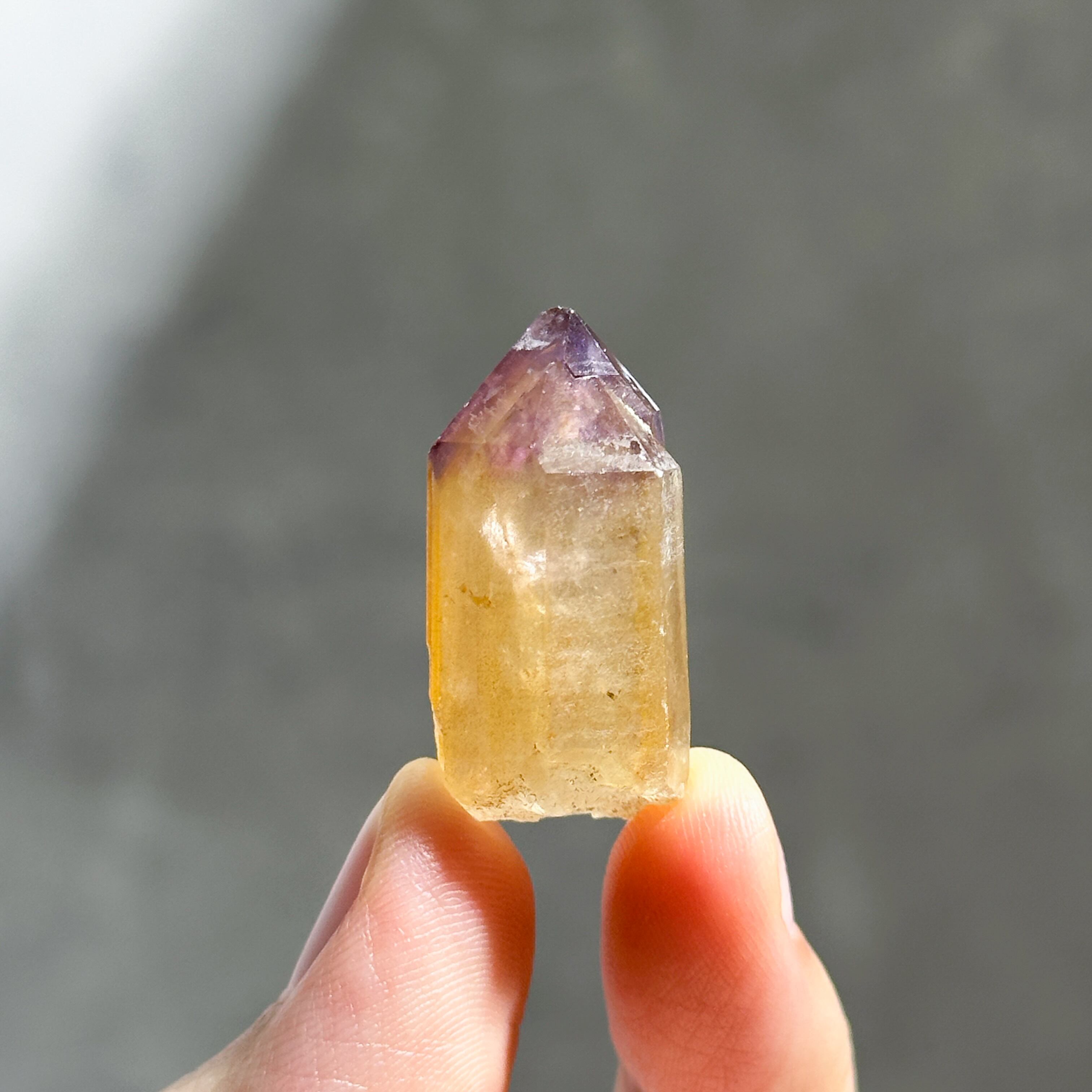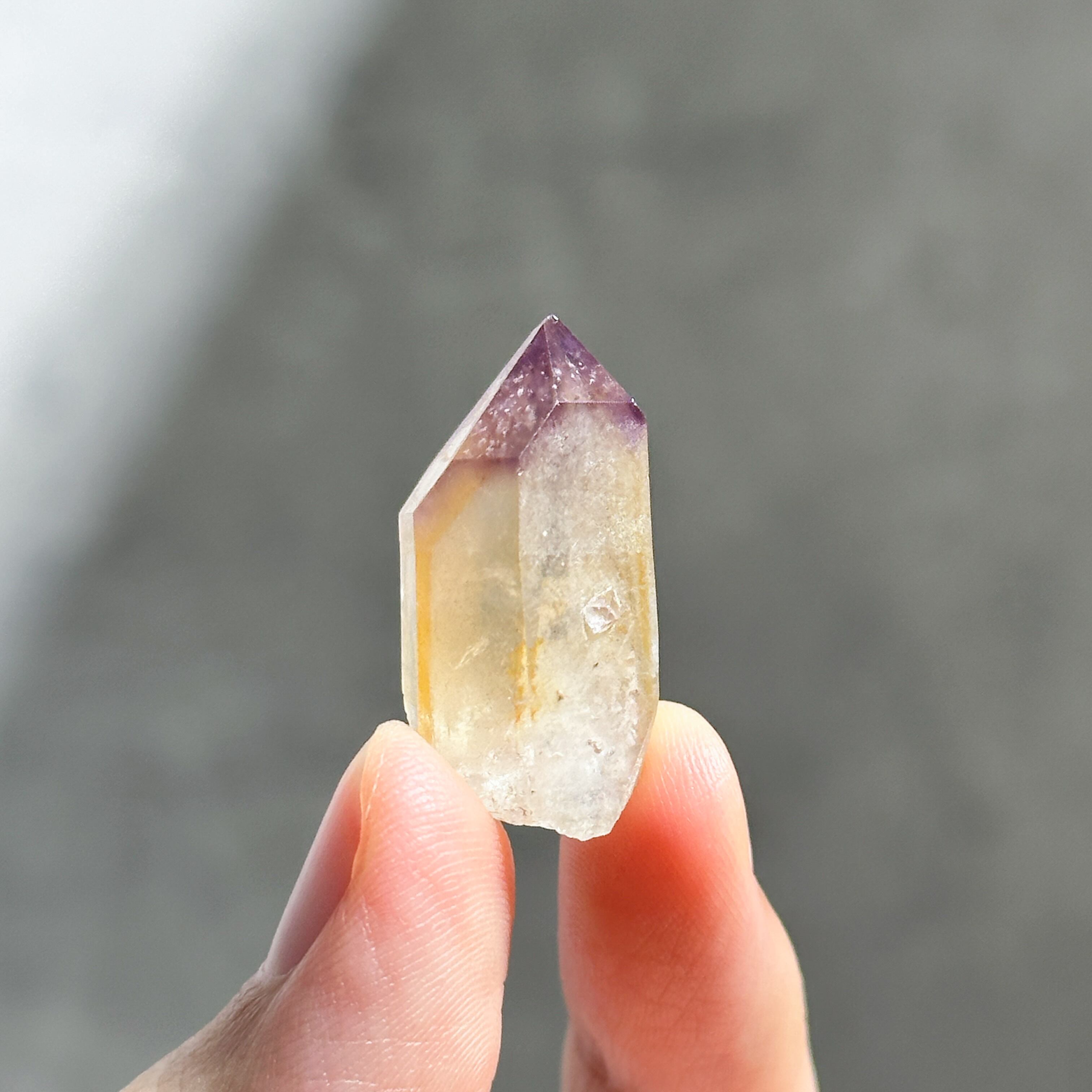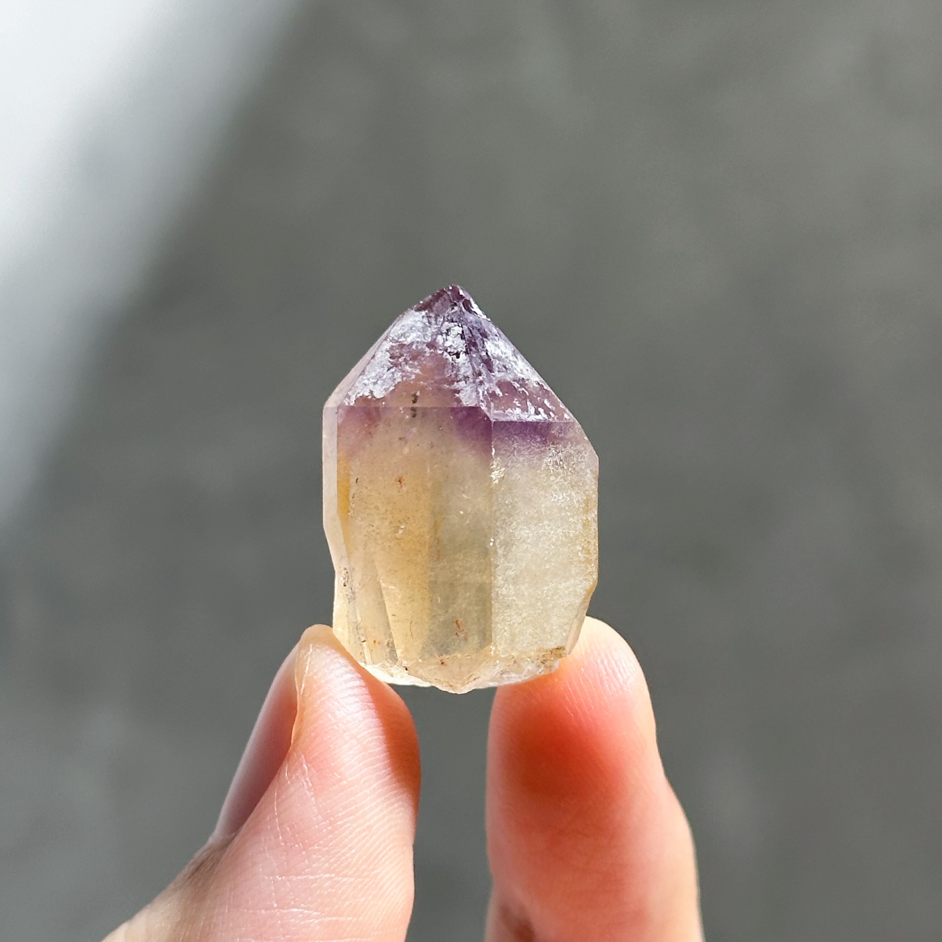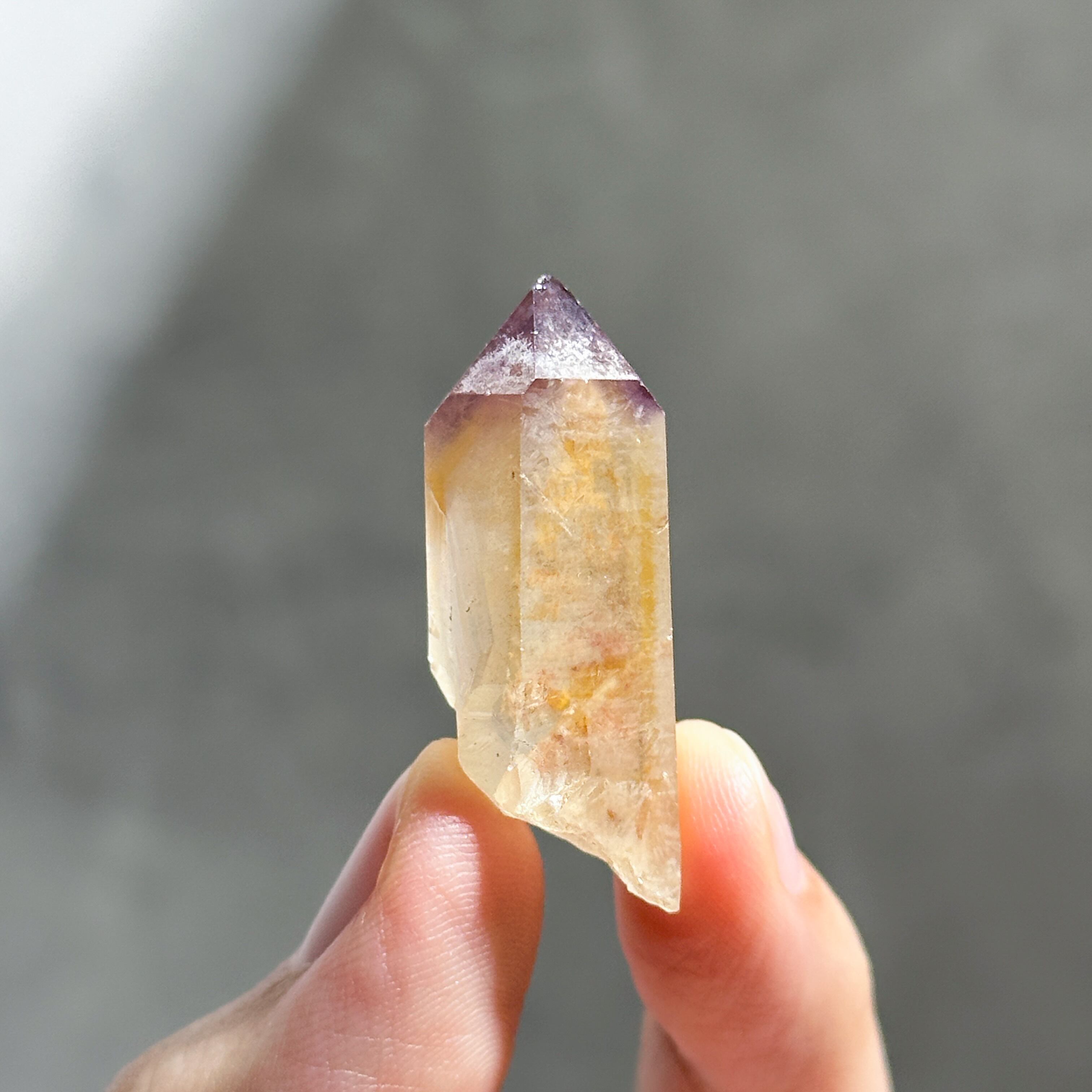 オレンジに色付いた部分は、水晶の表面にヘマタイトなどの鉄分を含んだタンジェリンクォーツと呼ばれるもので、トップにはアメジストが帽子のように色付いています。