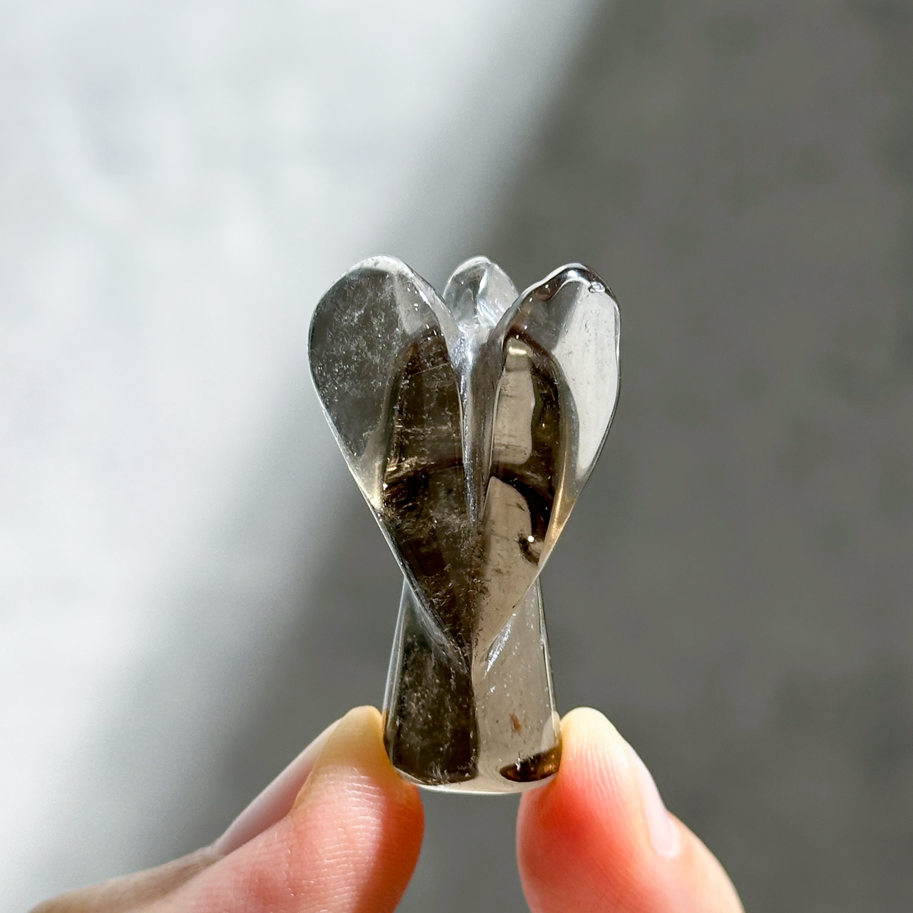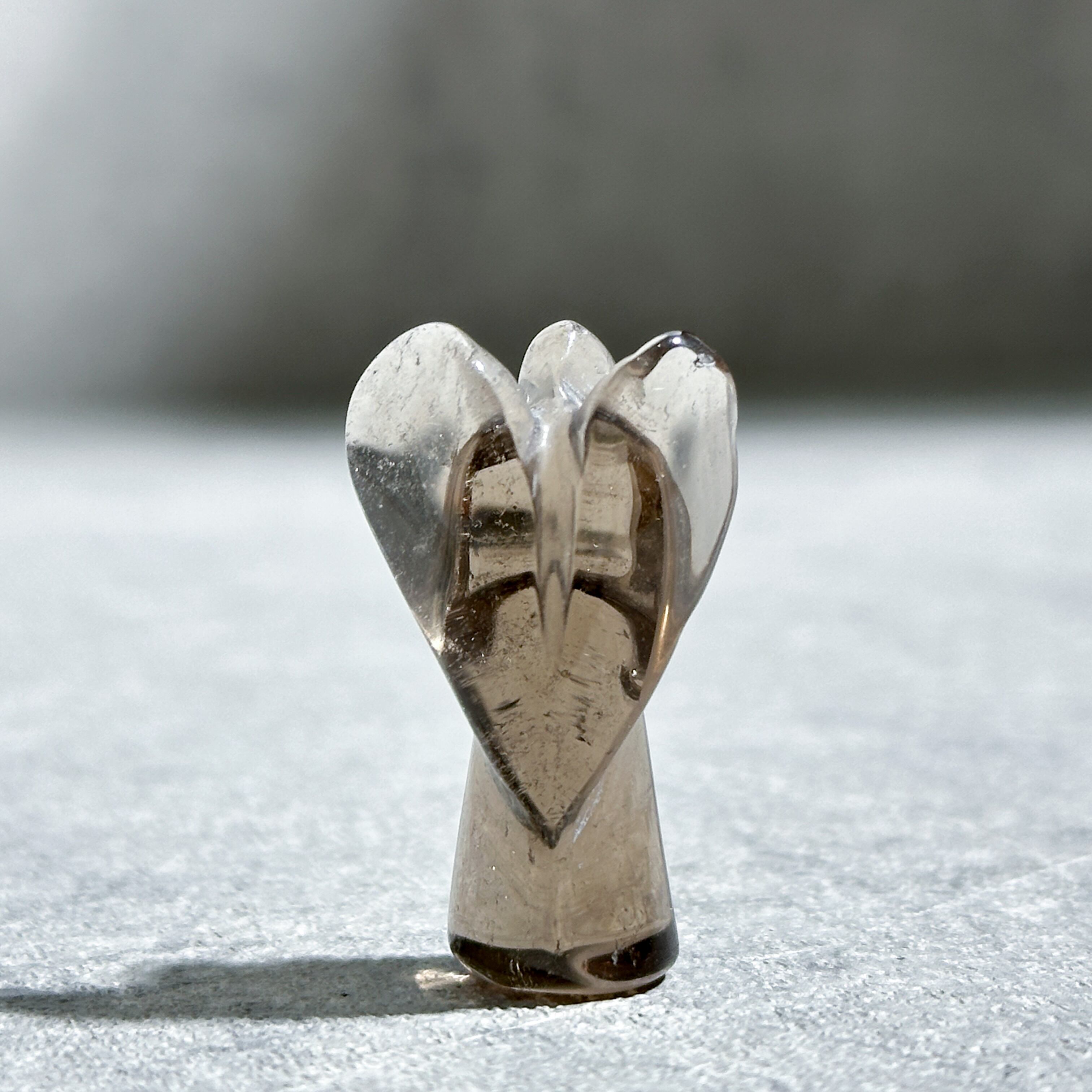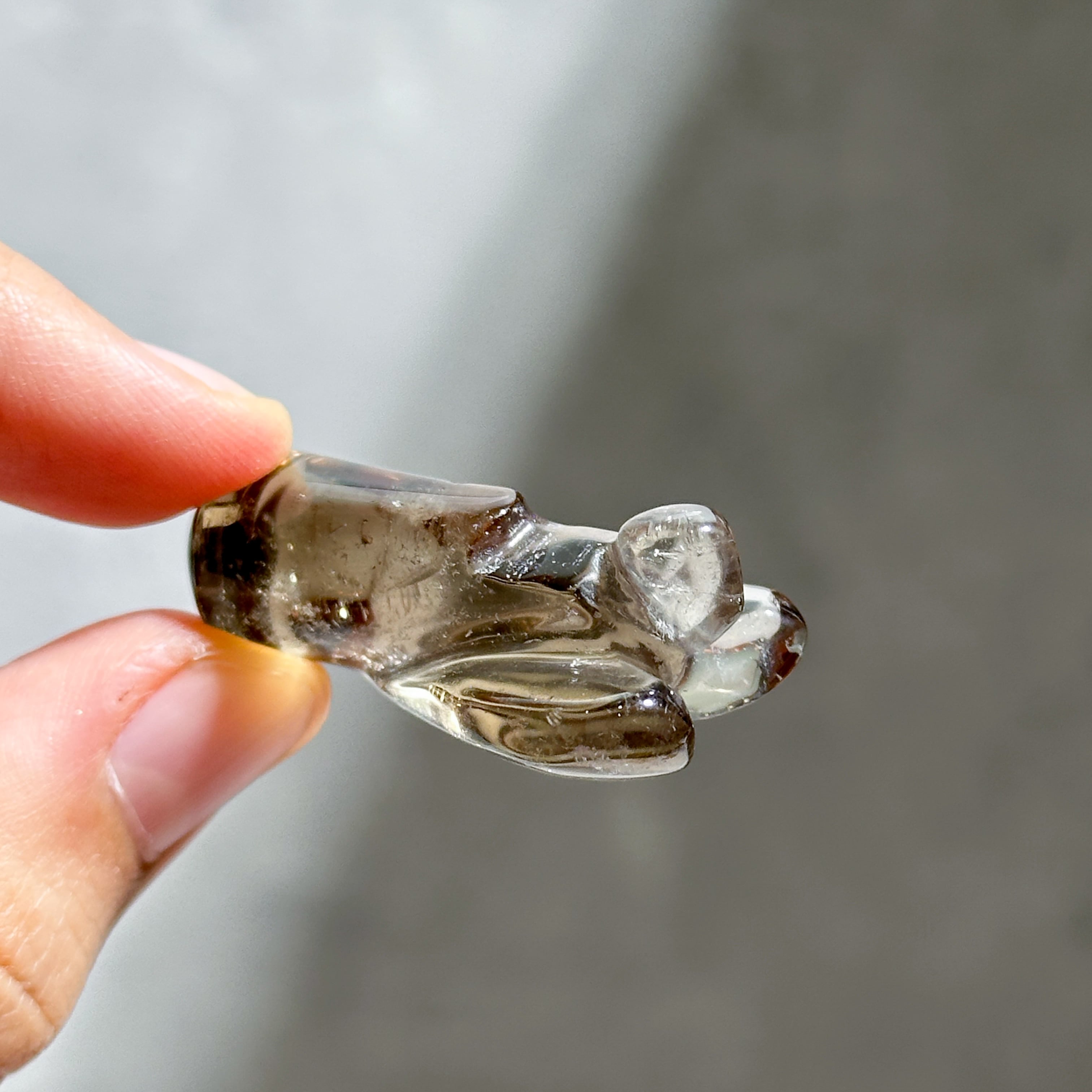 スモーキークォーツを、小さなエンジェルの形に彫刻いたしました。
