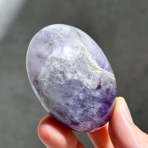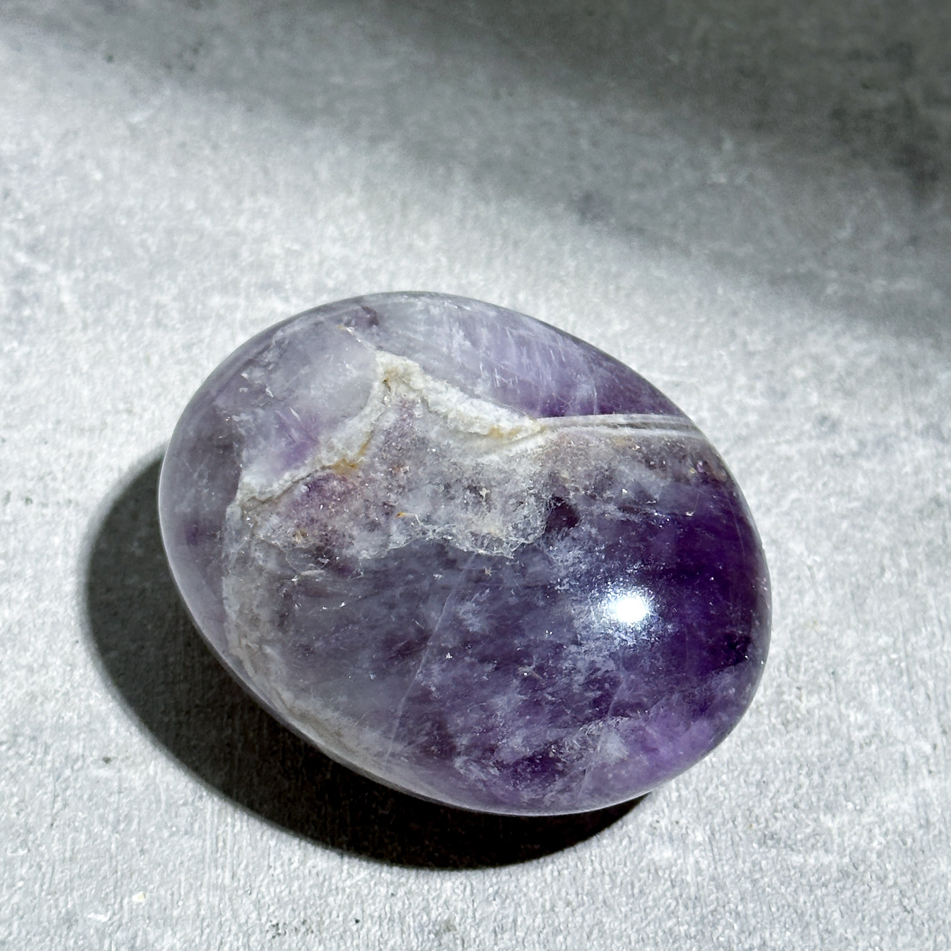 紫と白の層が紋章のような模様を生み出している「ドリームアメジスト」を、手のひらにちょうどコロンと可愛らしいパーム型に加工したものをご紹介いたします。