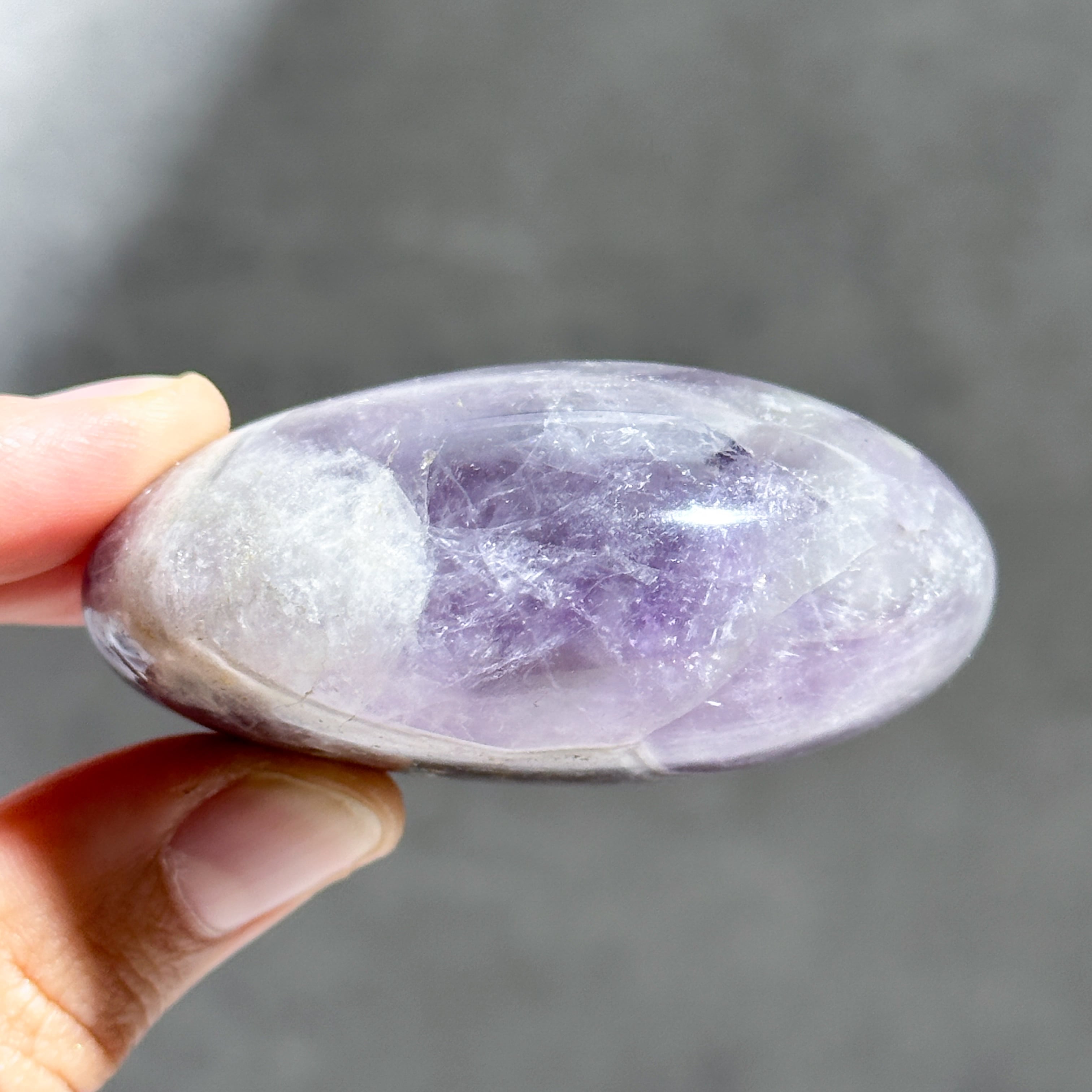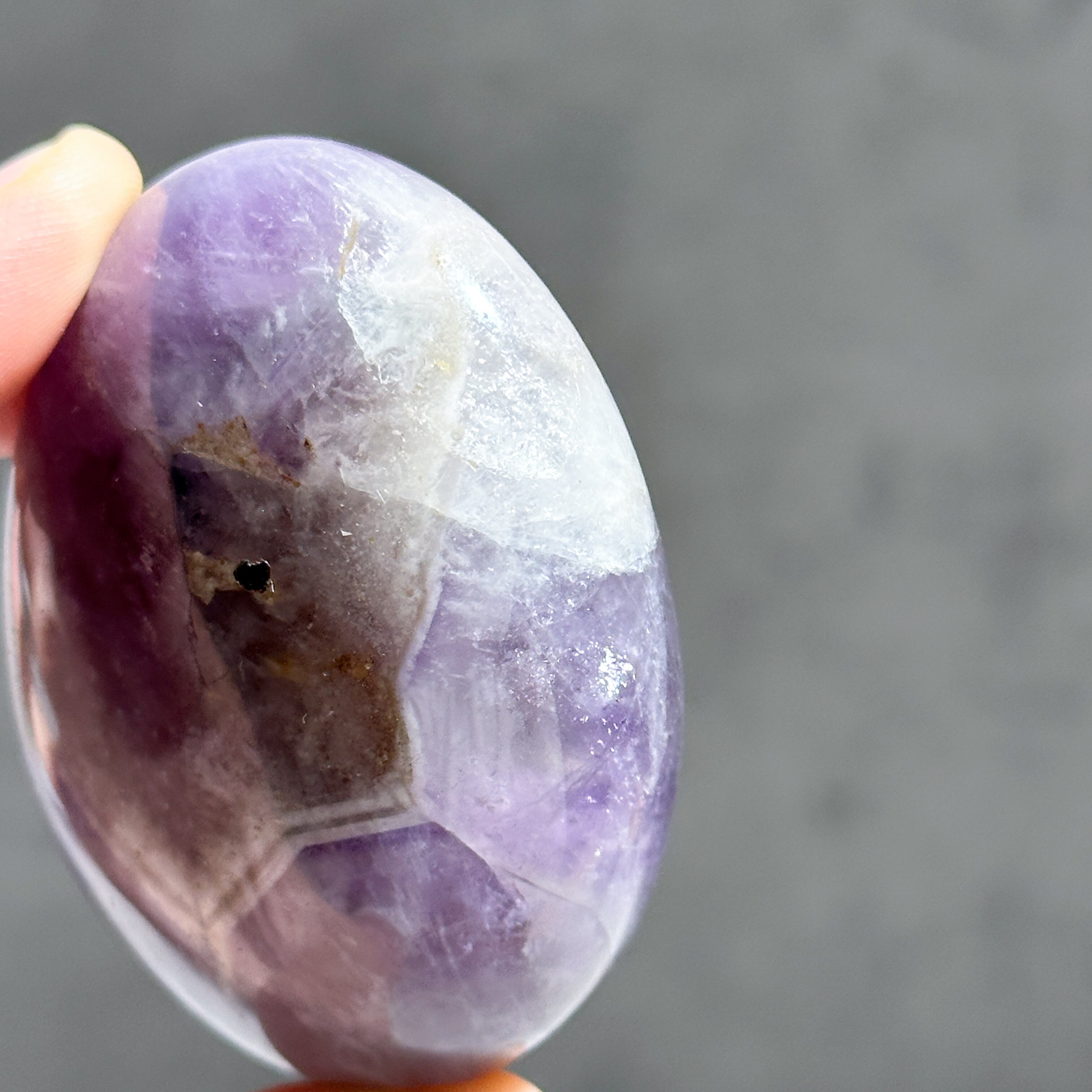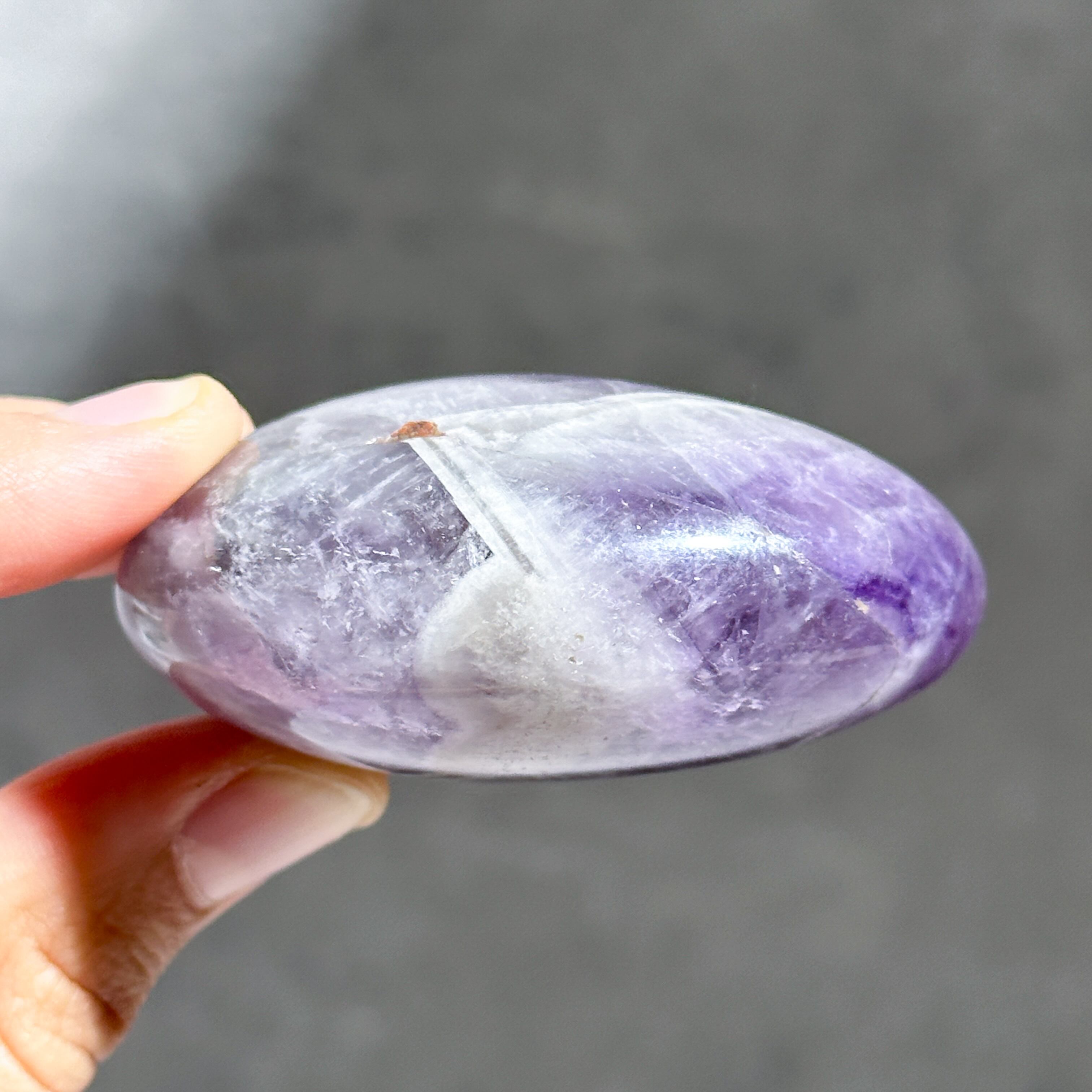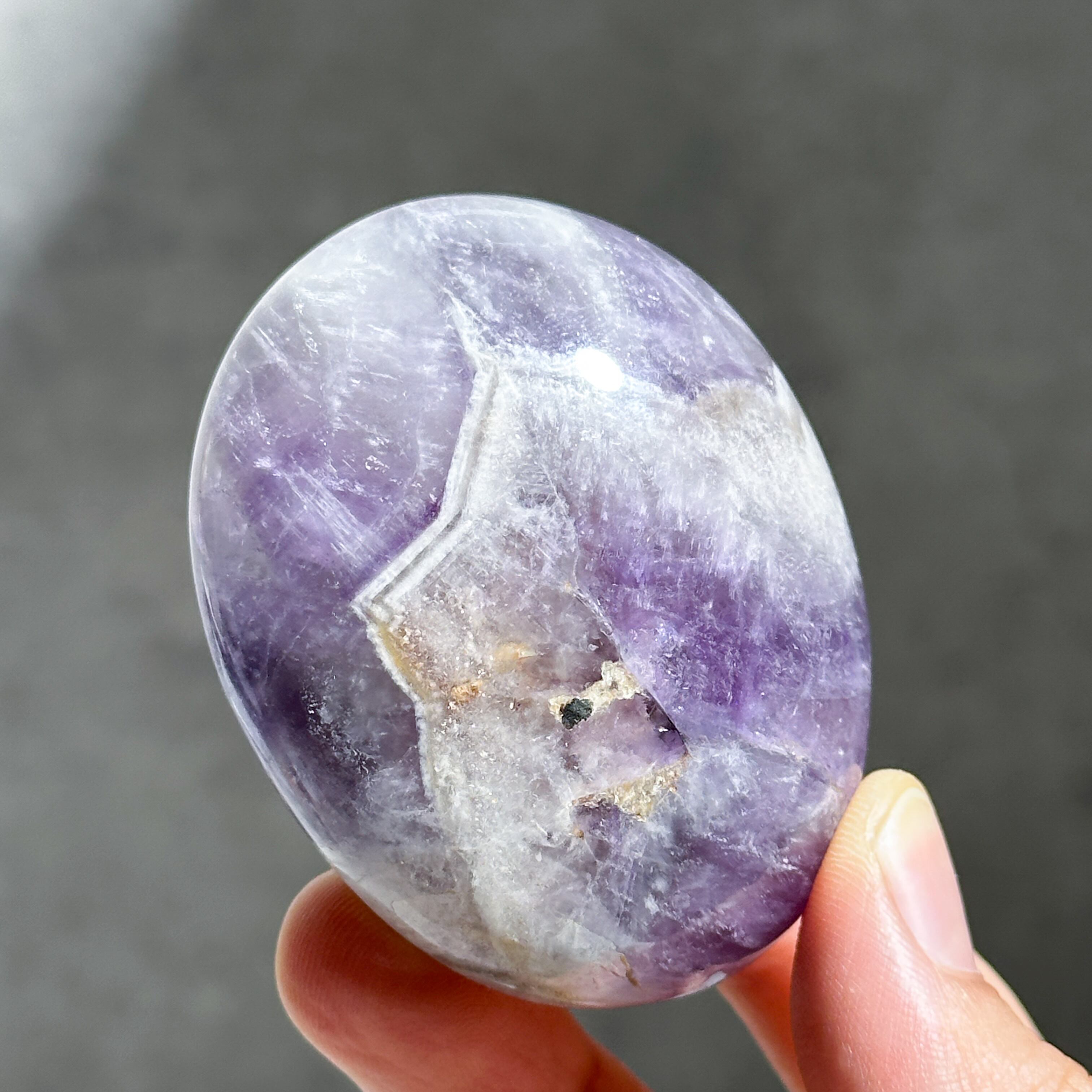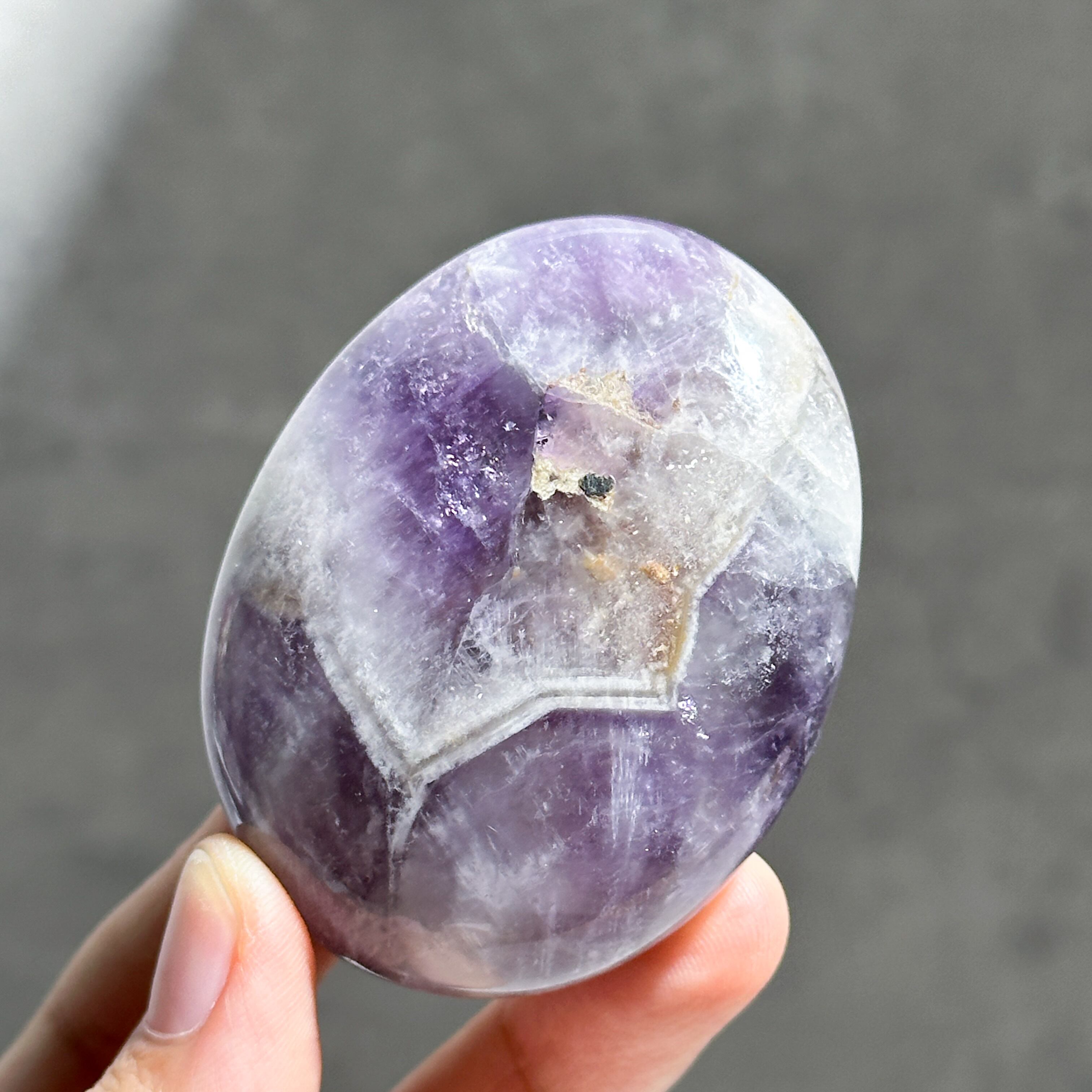 紫と白の層が紋章のような模様を生み出している「ドリームアメジスト」を、手のひらにちょうどコロンと可愛らしいパーム型に加工したものをご紹介いたします。