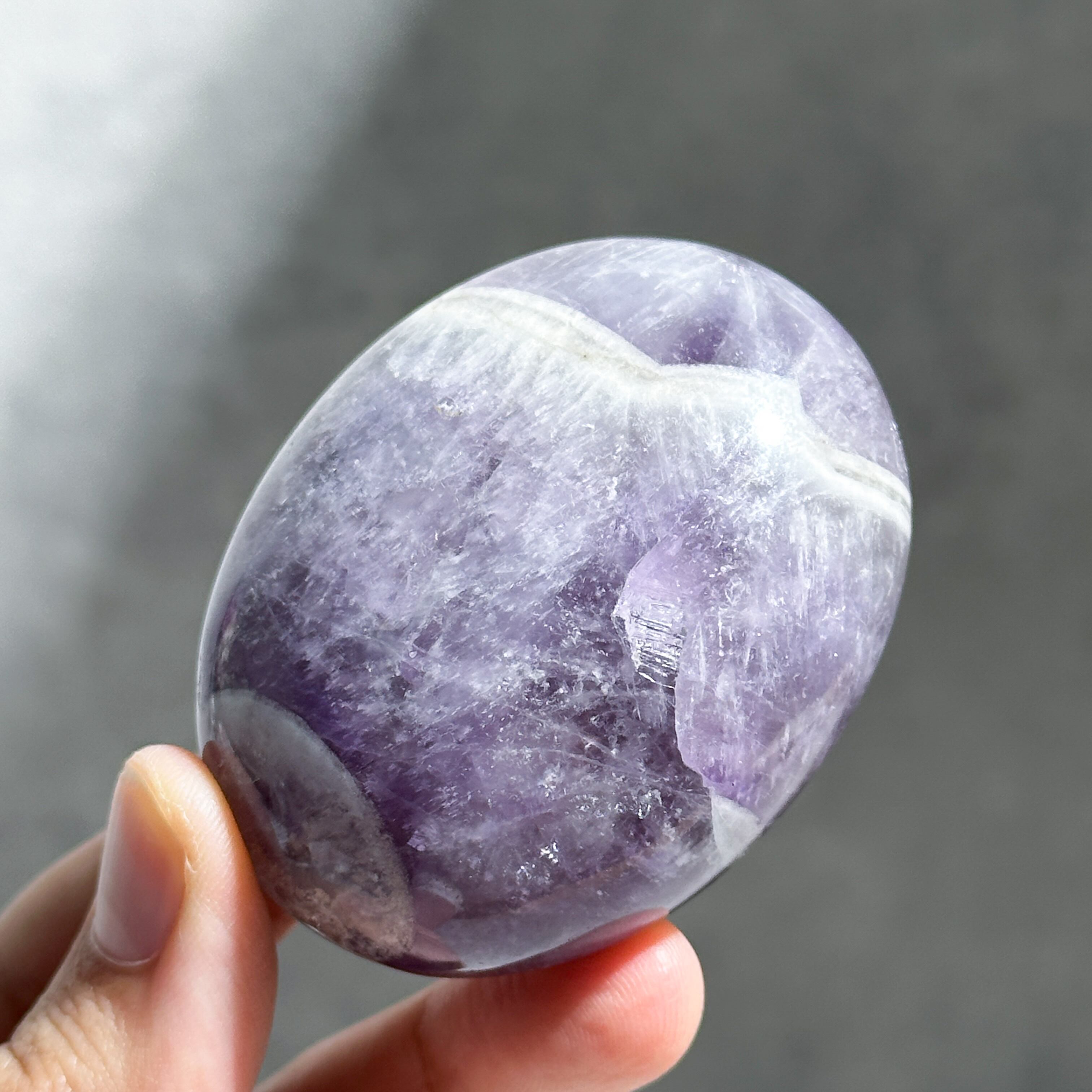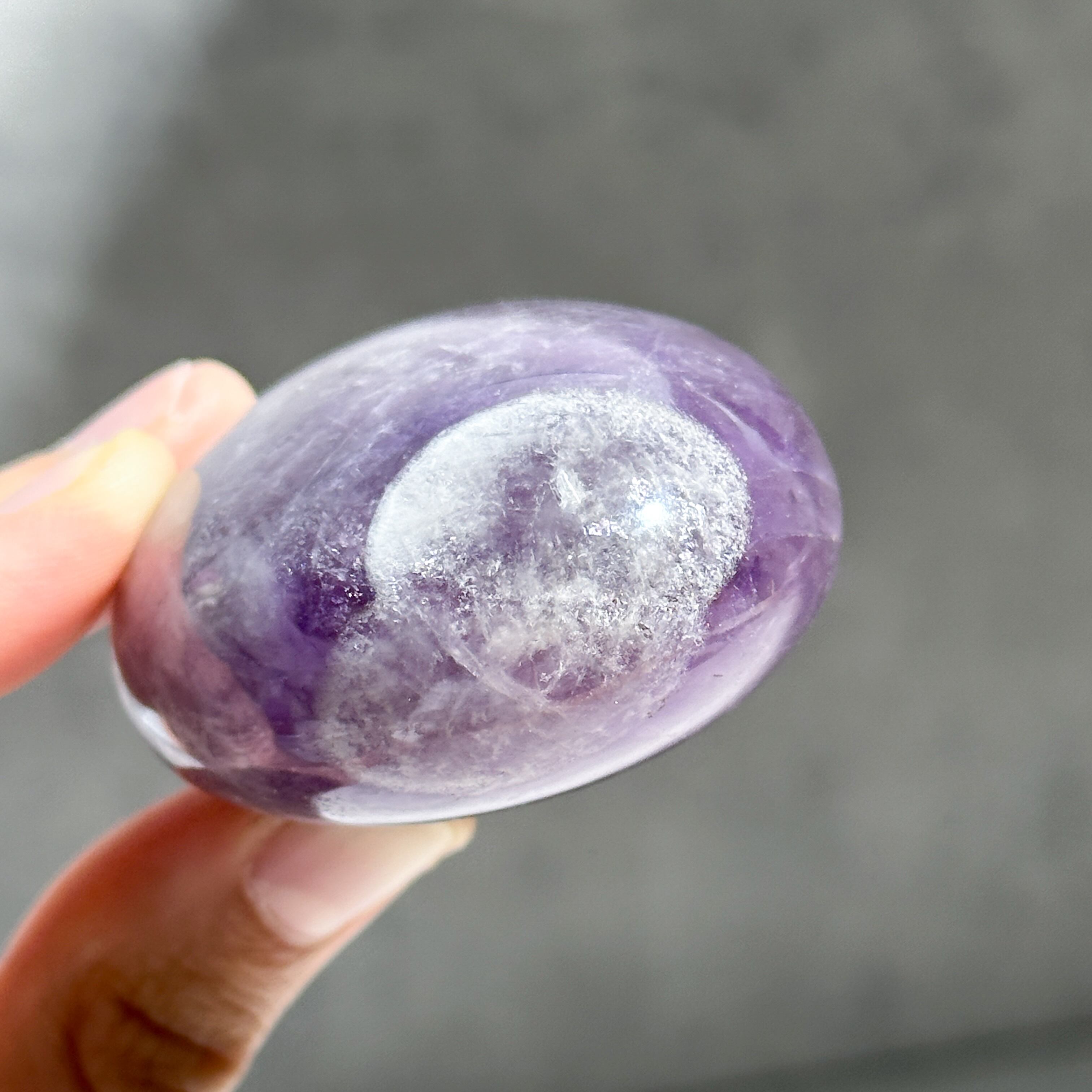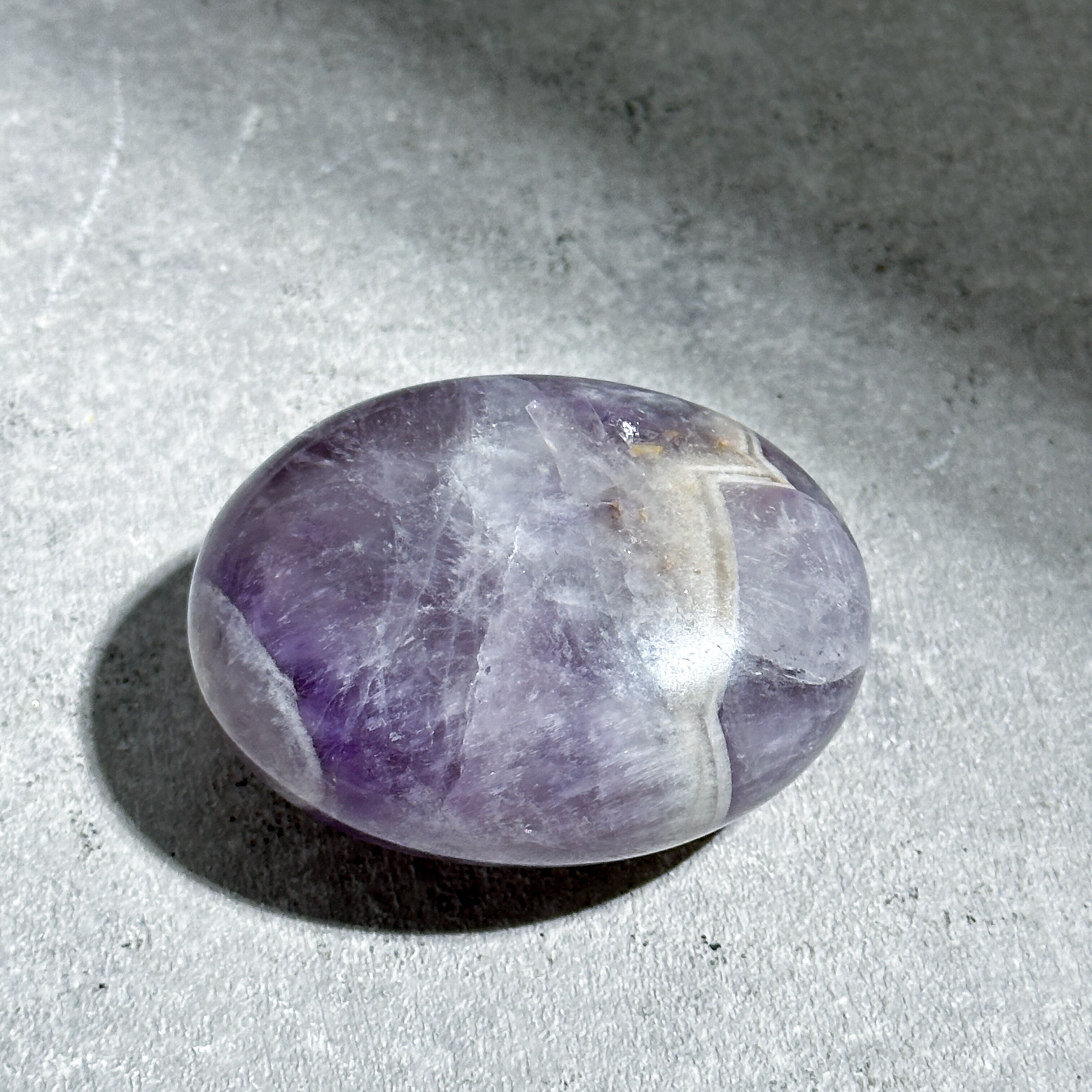 紫と白の層が紋章のような模様を生み出している「ドリームアメジスト」を、手のひらにちょうどコロンと可愛らしいパーム型に加工したものをご紹介いたします。