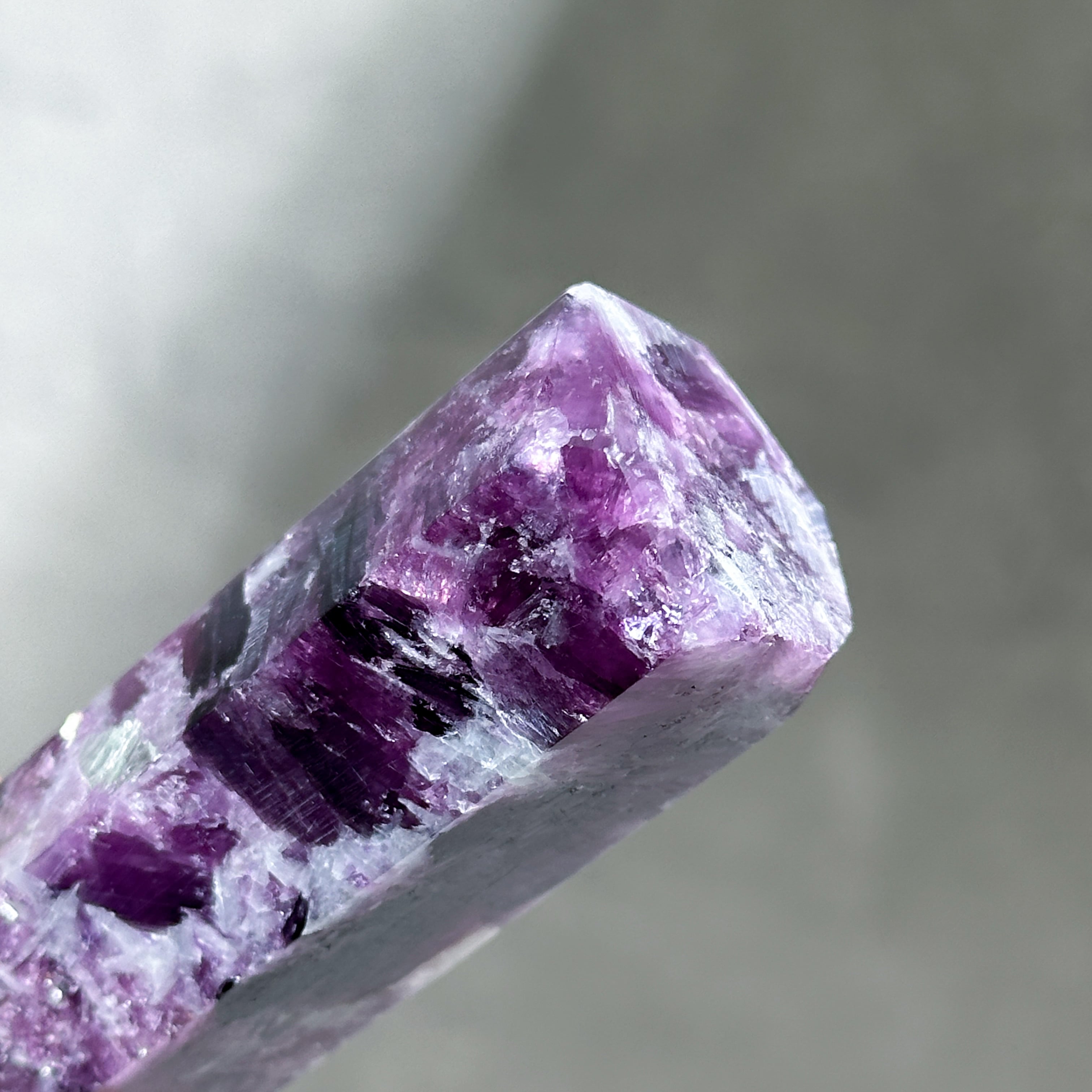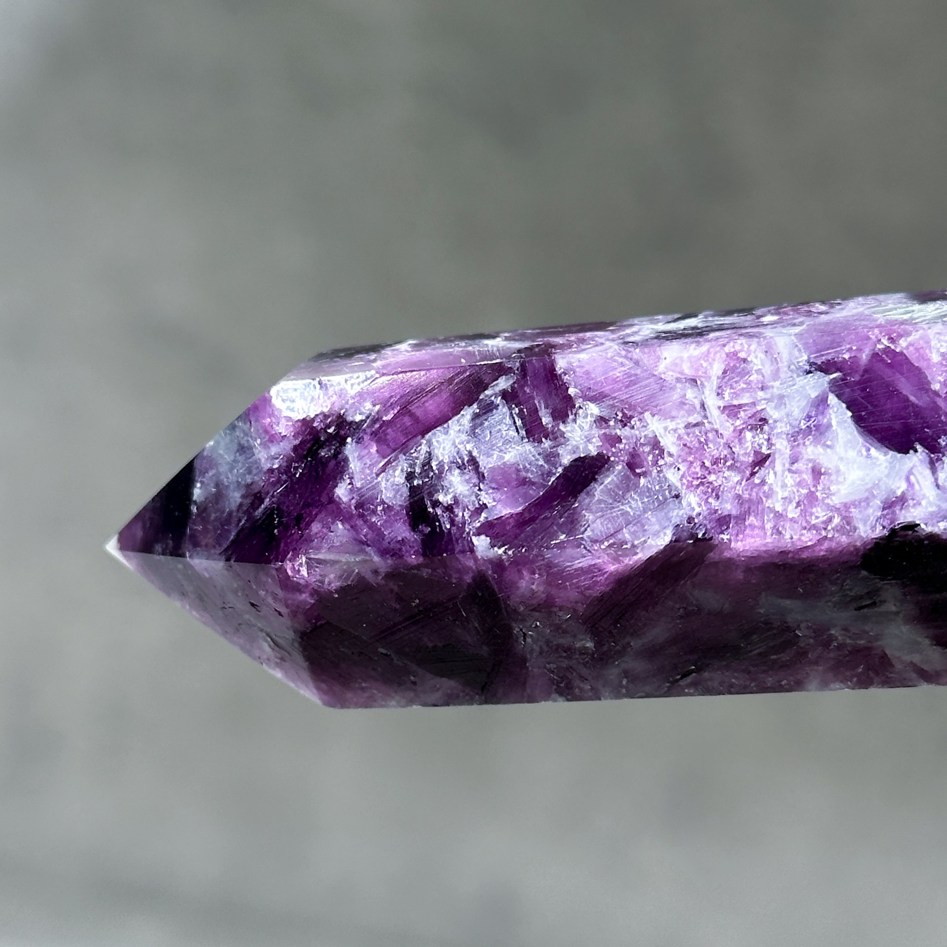 パープル色の鉱石、レピドライトの原石をタワー型に研磨しました。