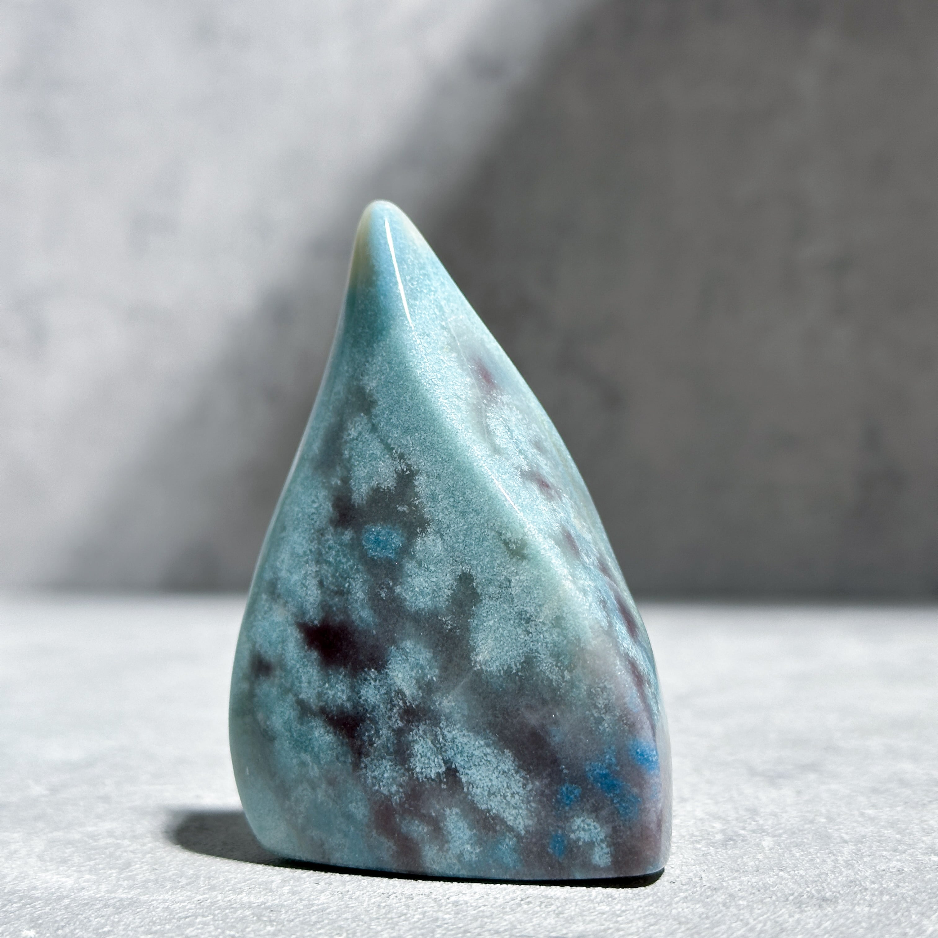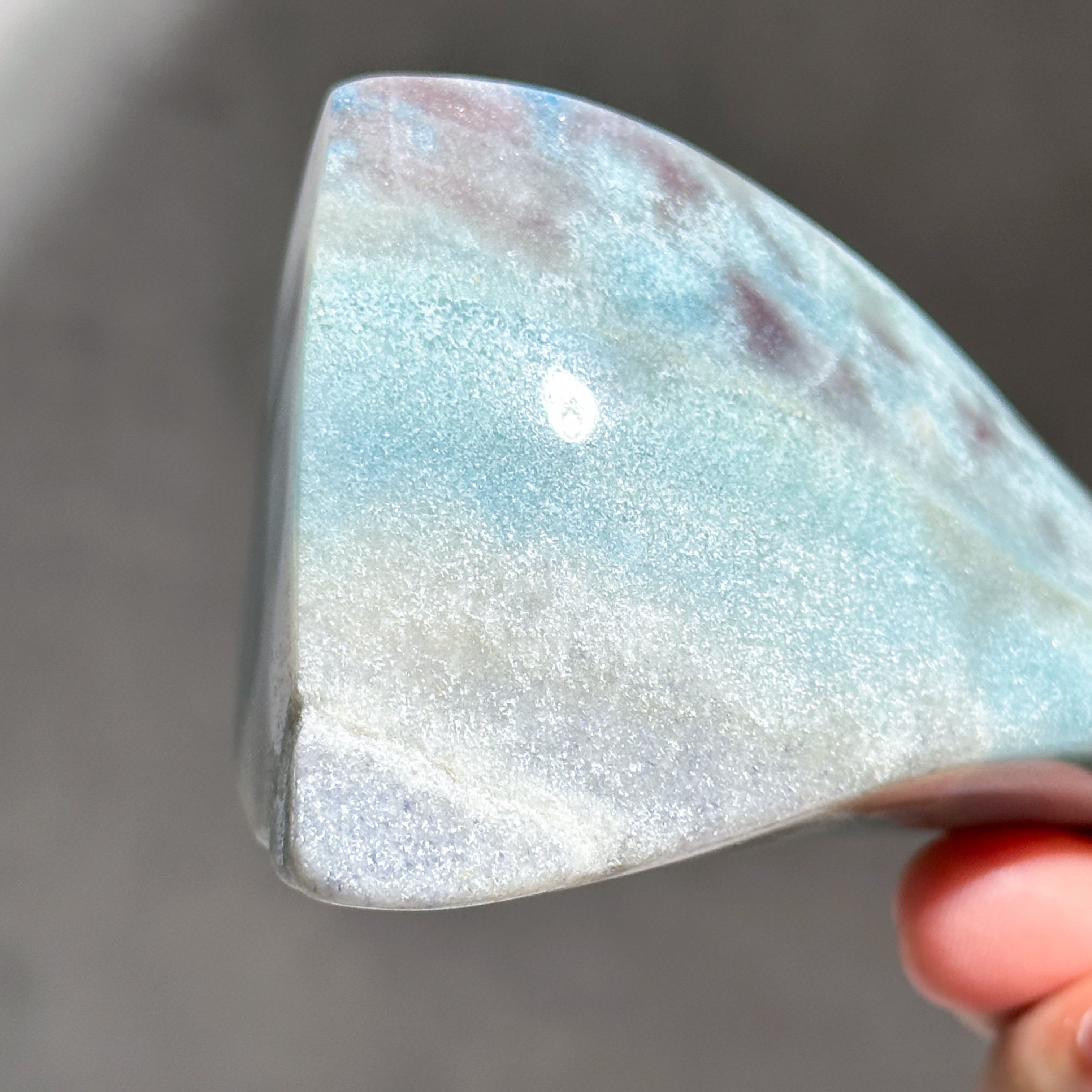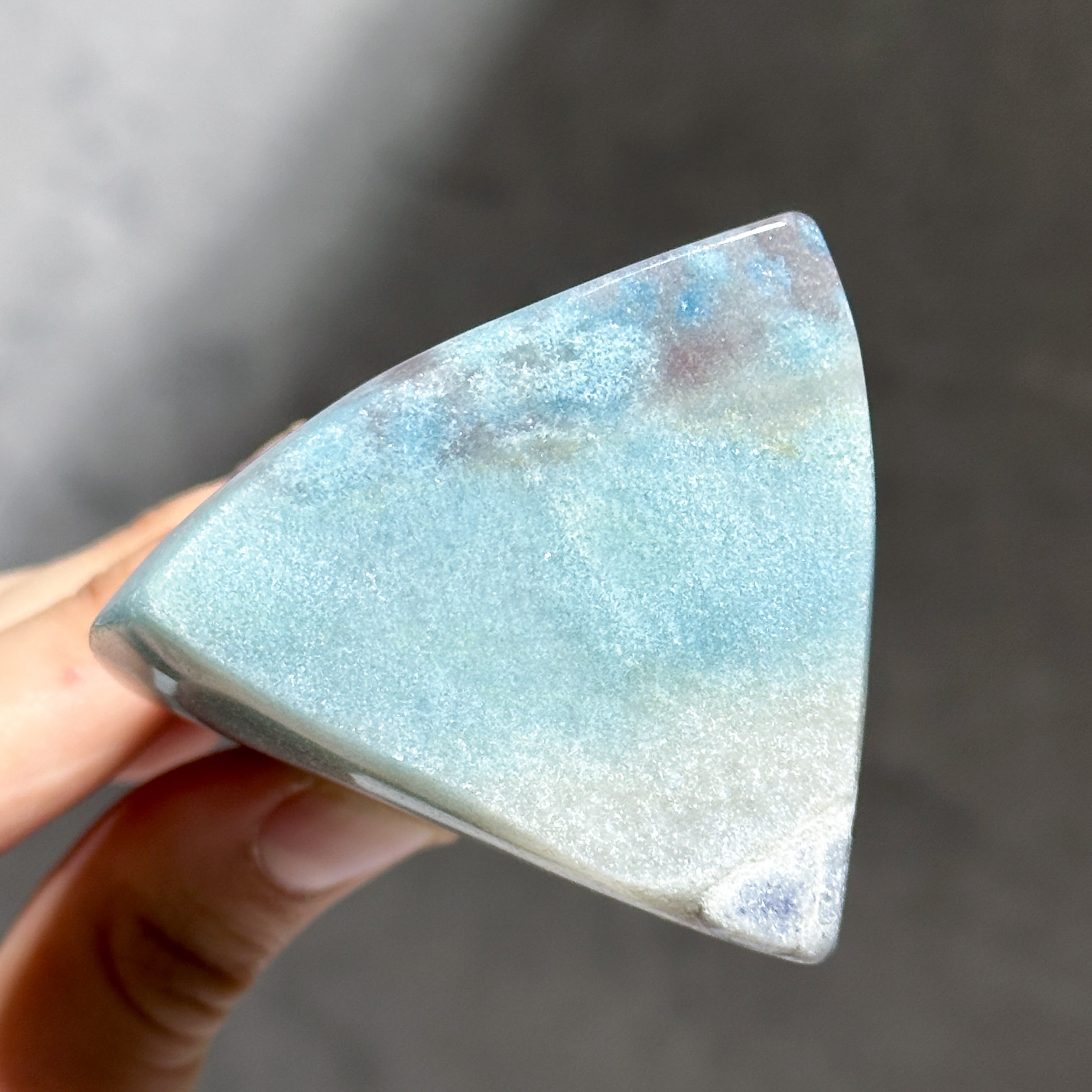 ここでは「トロレアイト」と呼びますが、トロレアイト(青)・クォーツ(白)・ラズライト(濃い青)が混じったもののようで、曲線を描くグラデーションと引き込まれるような色合いを持つ鉱物です。面によって異なる表情を見せる、世界に二つとないお品です。