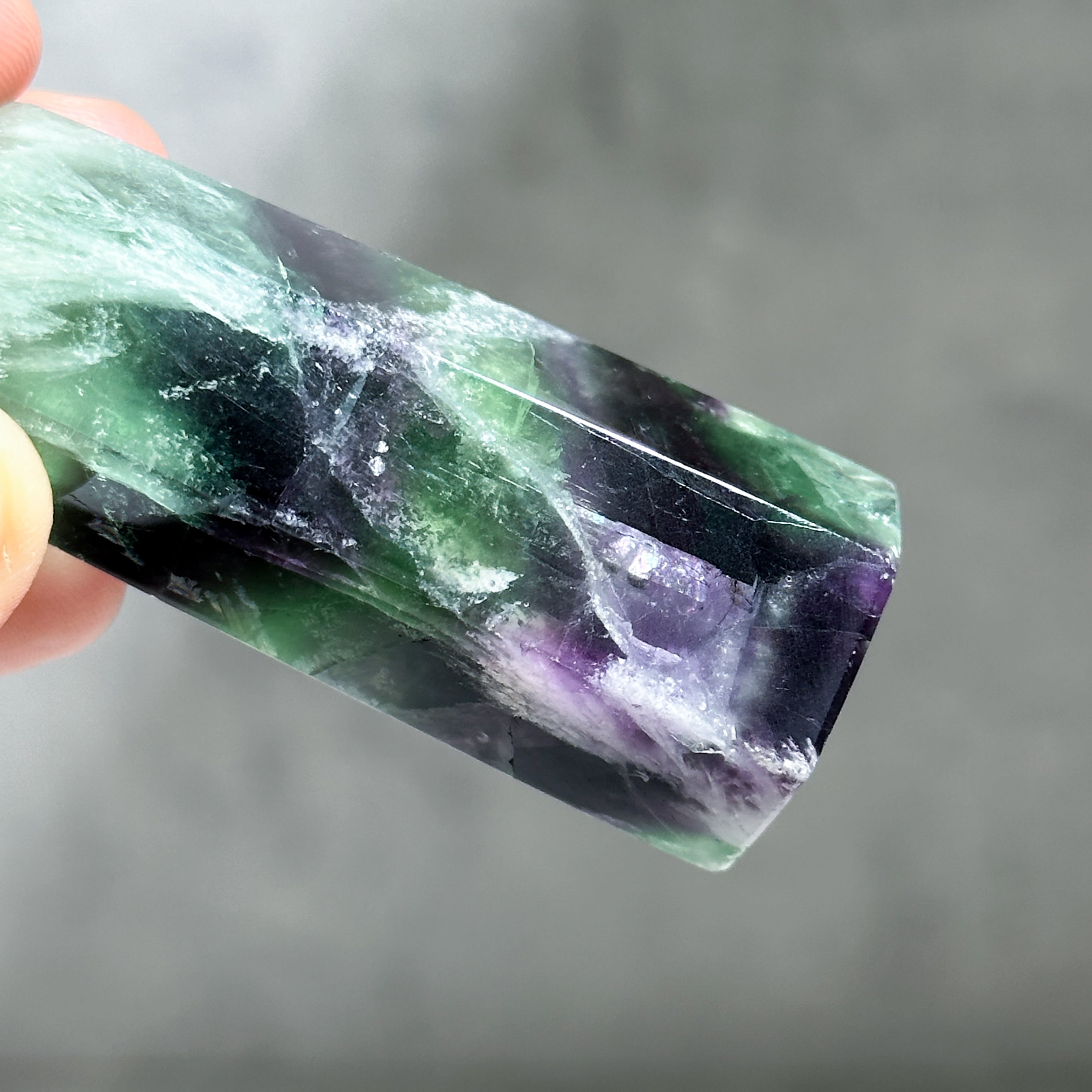 レインボーフローライトは複数のカラー(透明・パープル・ブルー・ピンク・グリーン)が共生し、水面のような曲線の模様を生み出しています。