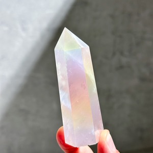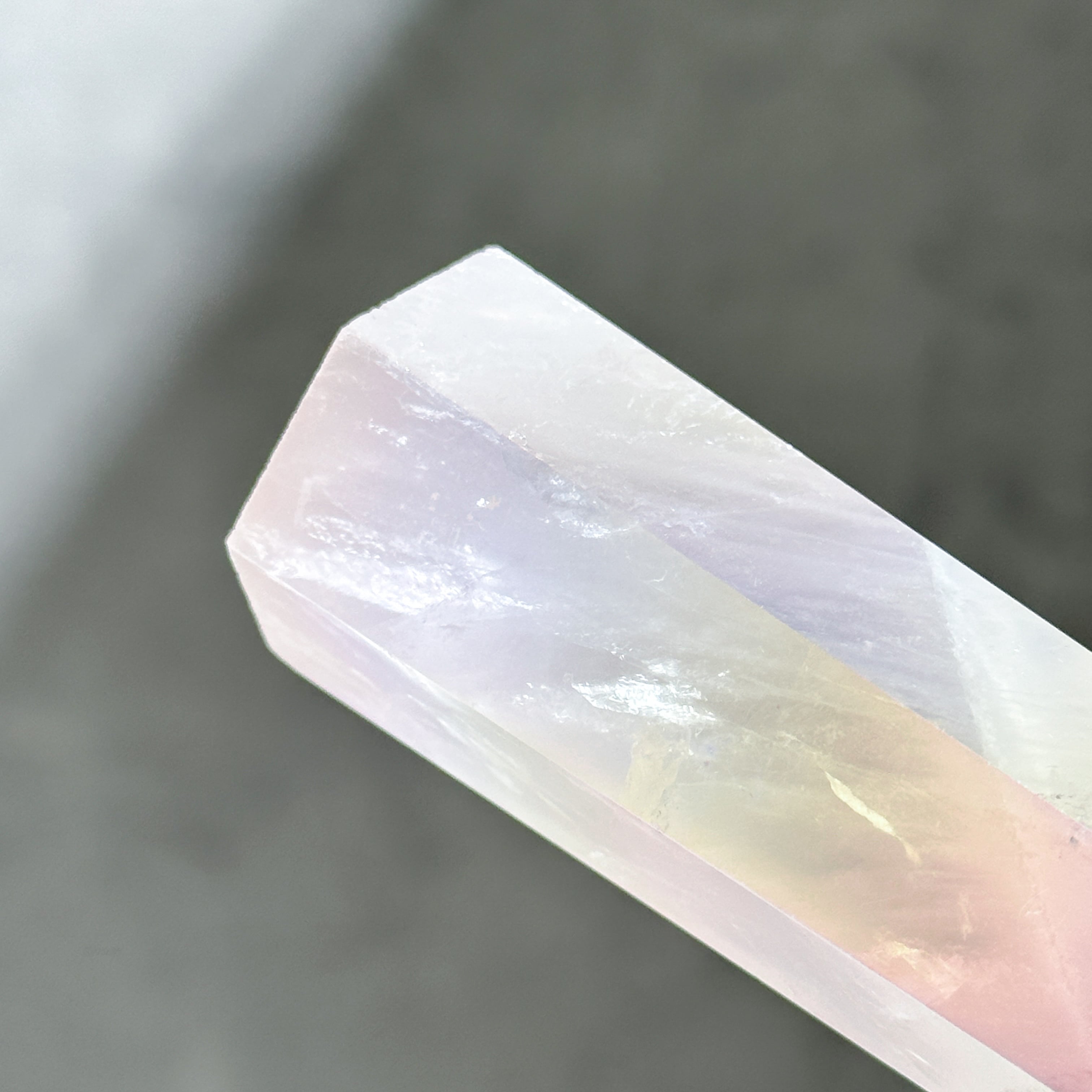 オーラクォーツとは天然の水晶に真空状態で金属を癒着コーティングさせた、新時代のクリスタルです。本品はローズクォーツのタワーに、エンジェルオーラ加工を施したもの◎