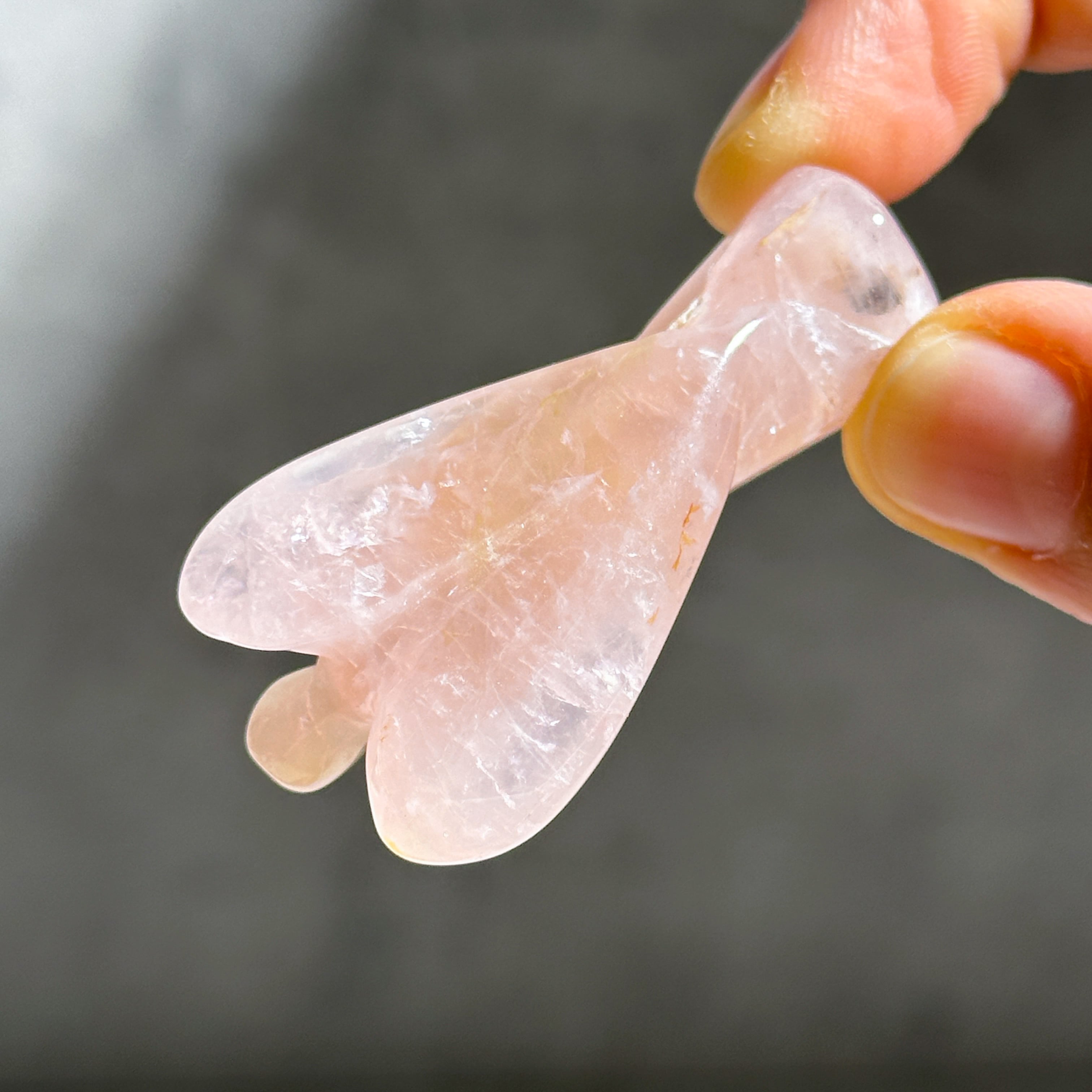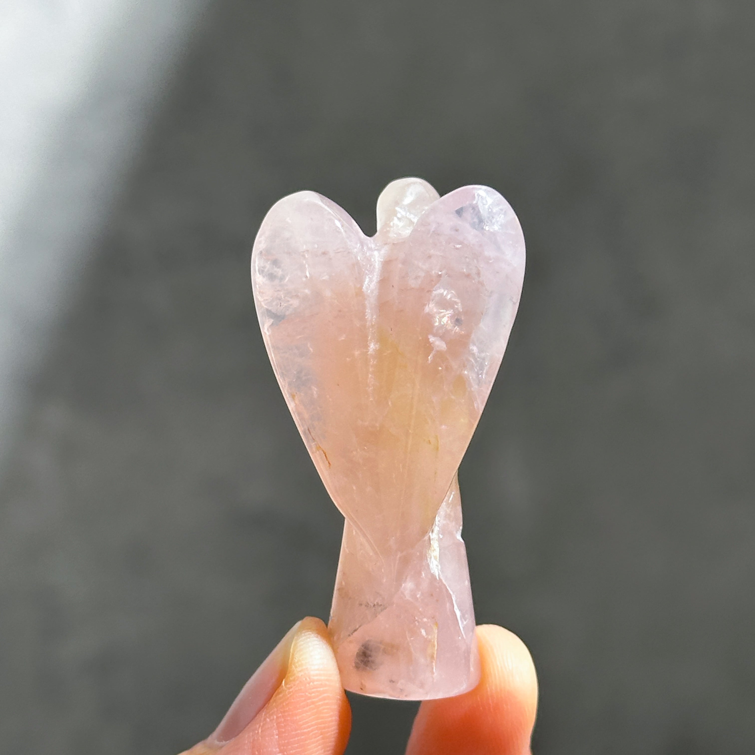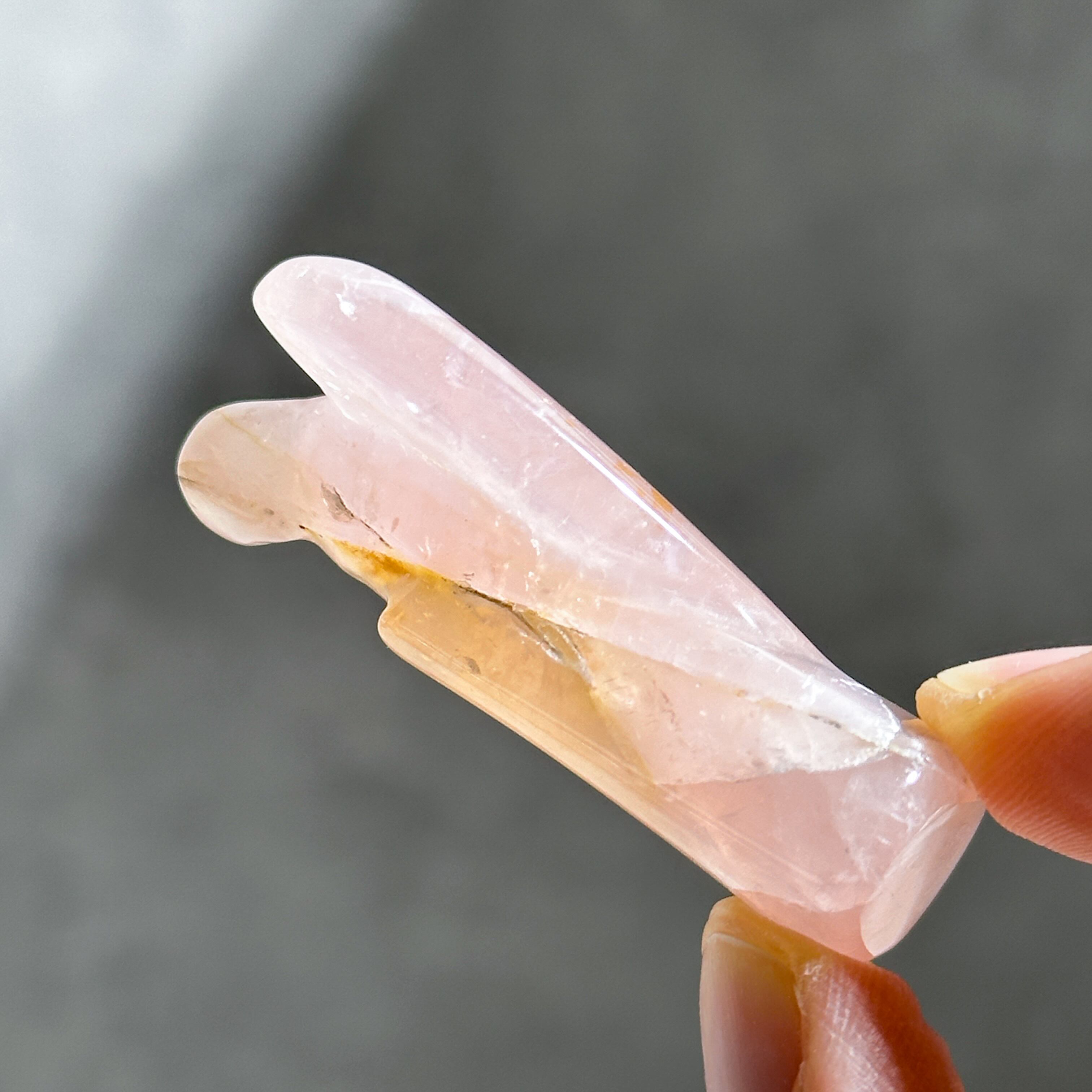 ゴールデンヒーラー×ローズクォーツを、小さなエンジェルの形に彫刻いたしました。