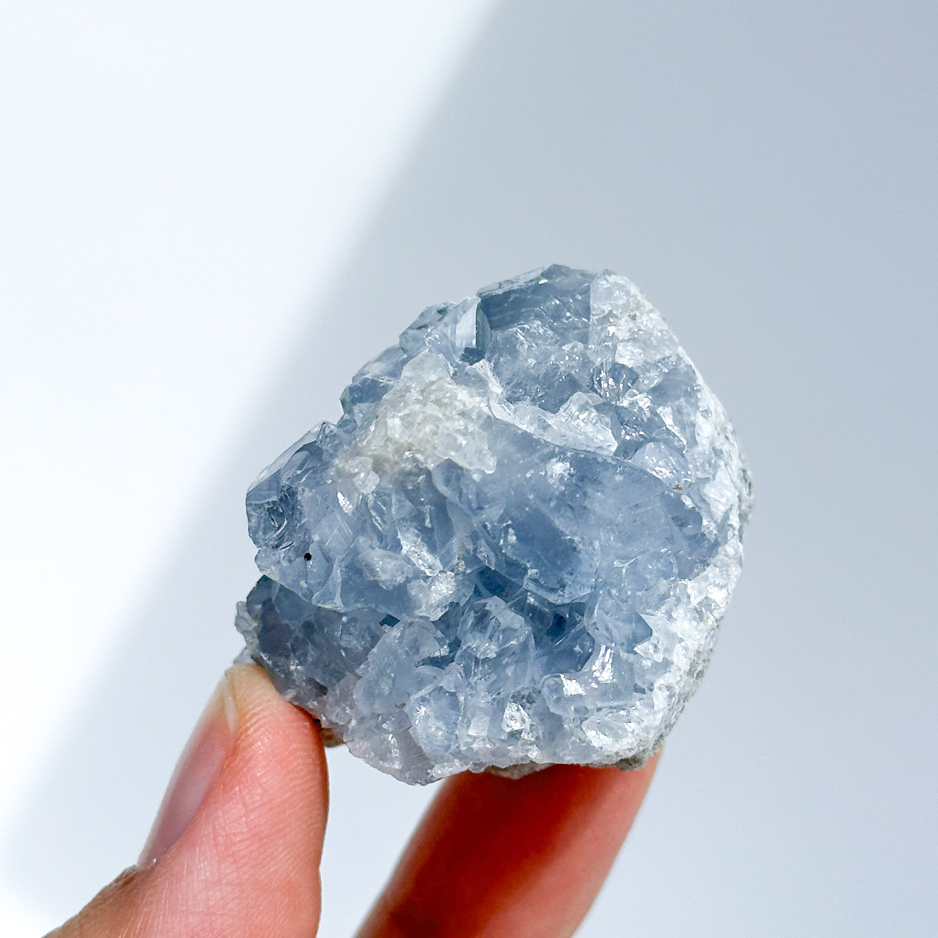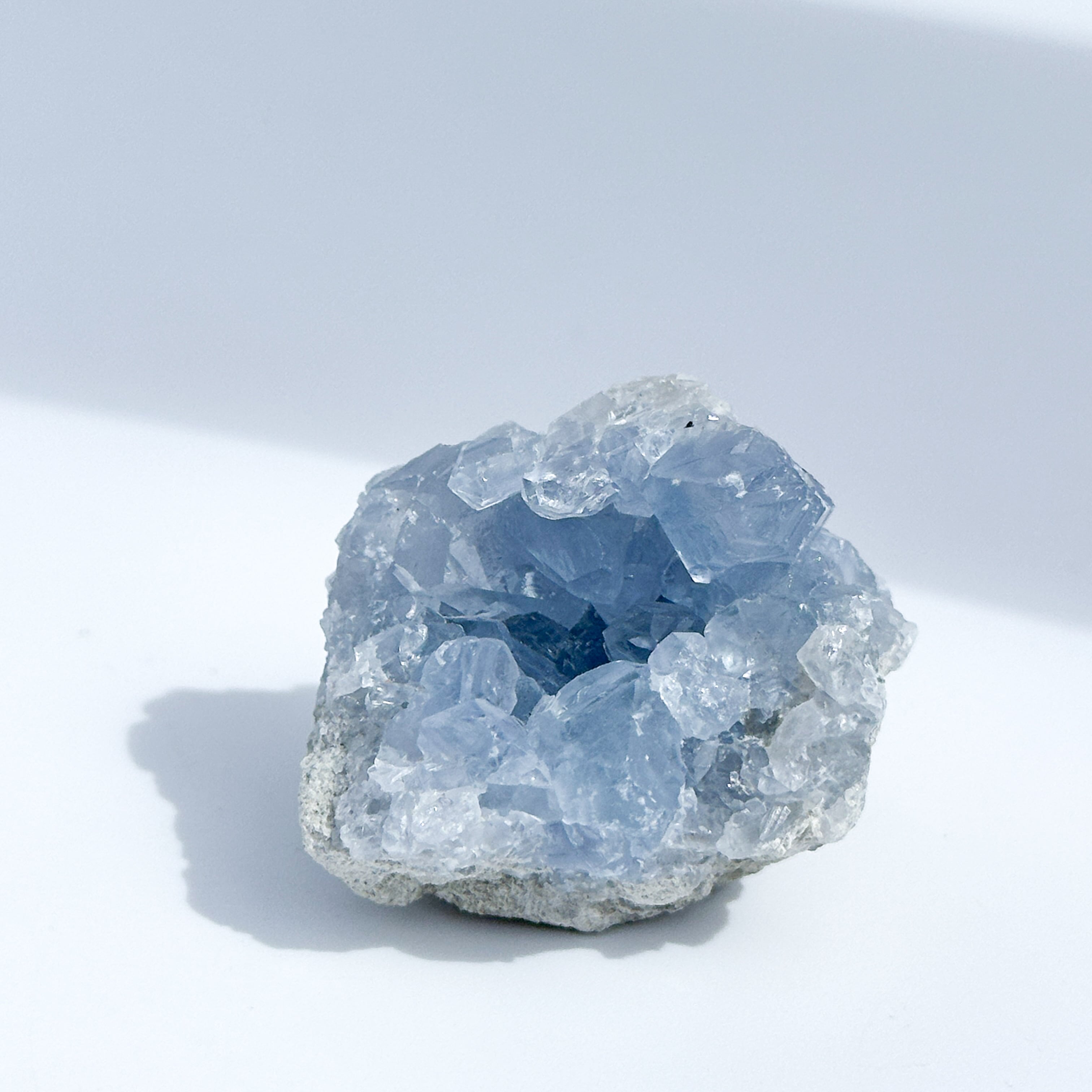 幾多あるブルーの天然石の中でも、晴れた空の穏やかさに最も近い印象があるのがセレスタイト。柔らかい色味、優しい輝きから、エンジェルを連想する人も多いようです。