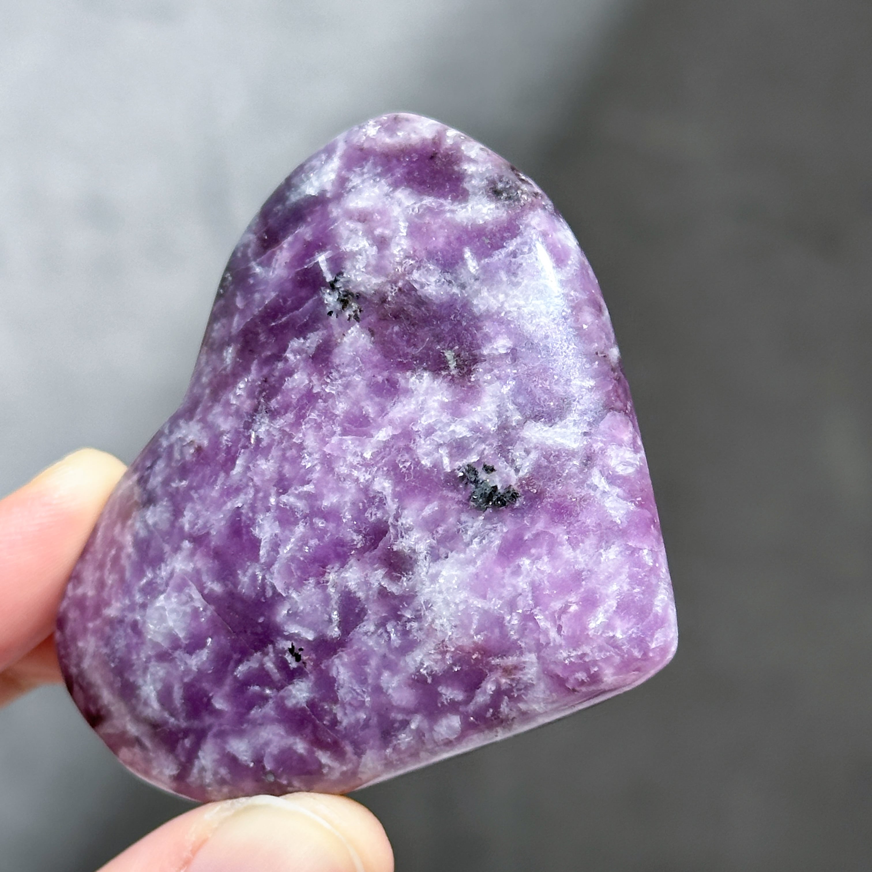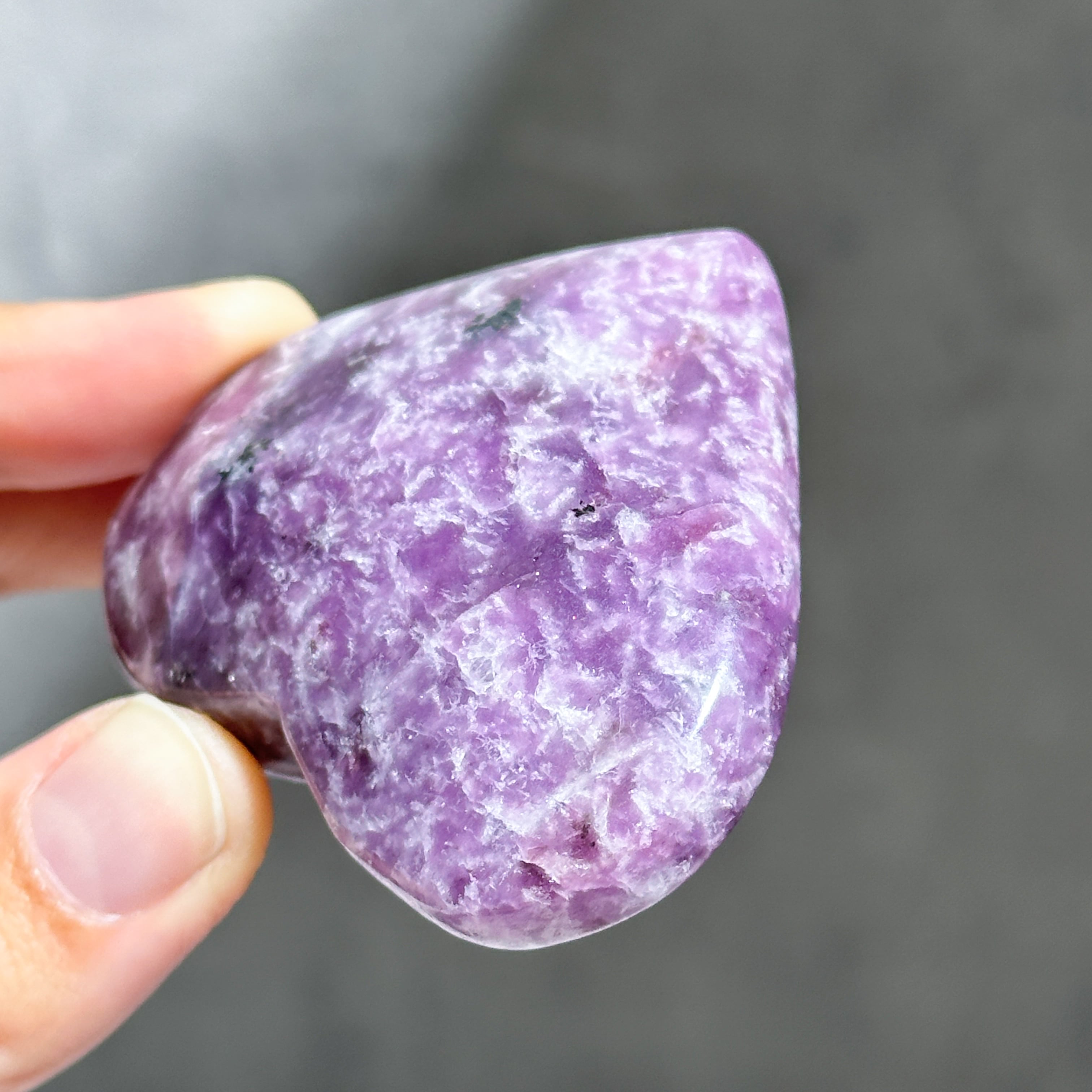 パープル色の鉱石、レピドライトの原石をハート型に研磨しました。
