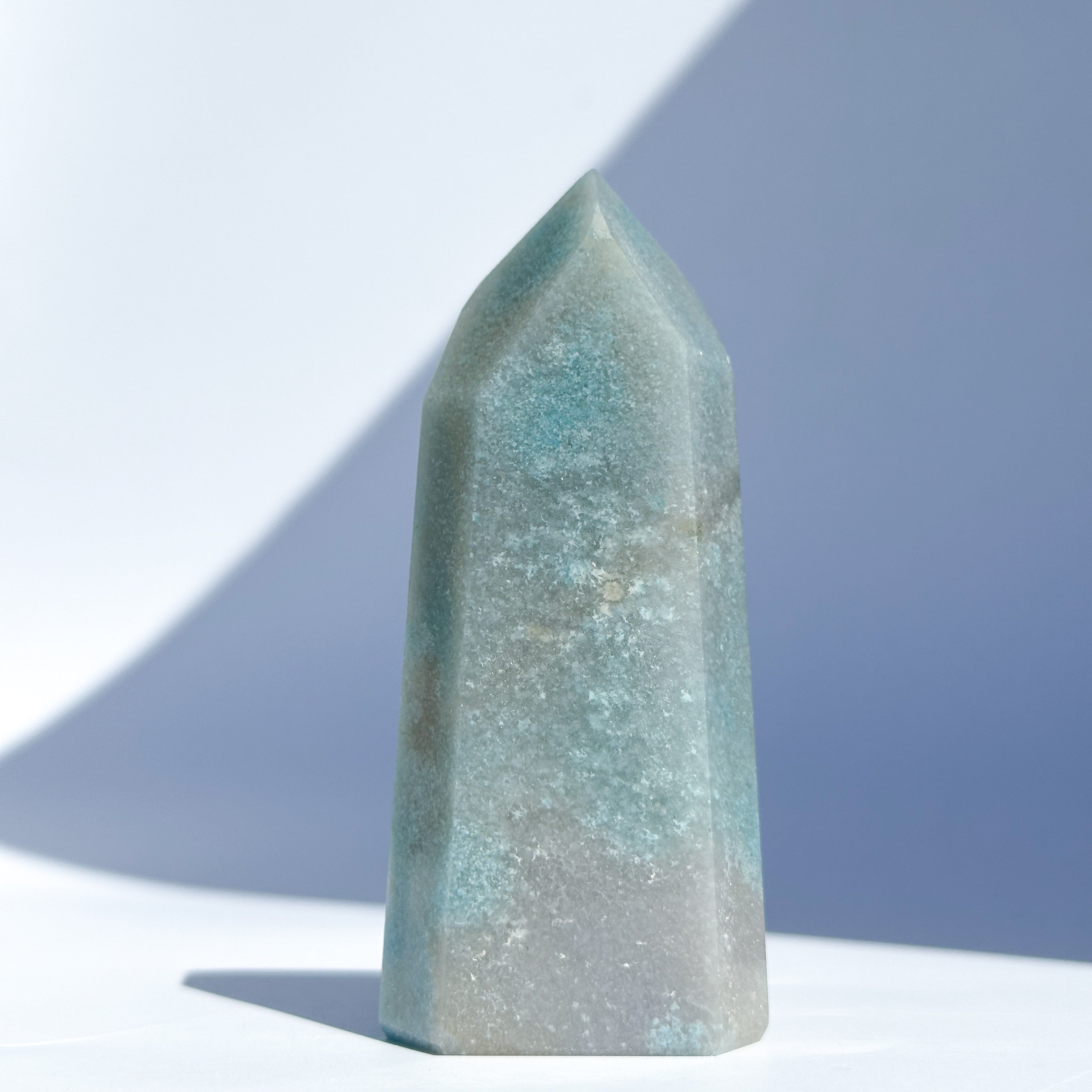 ここでは「トロレアイト」と呼びますが、トロレアイト(青)・クォーツ(白)・ラズライト(濃い青)が混じったもののようで、曲線を描くグラデーションと引き込まれるような色合いを持つ鉱物です。面によって異なる表情を見せる、世界に二つとないお品です。