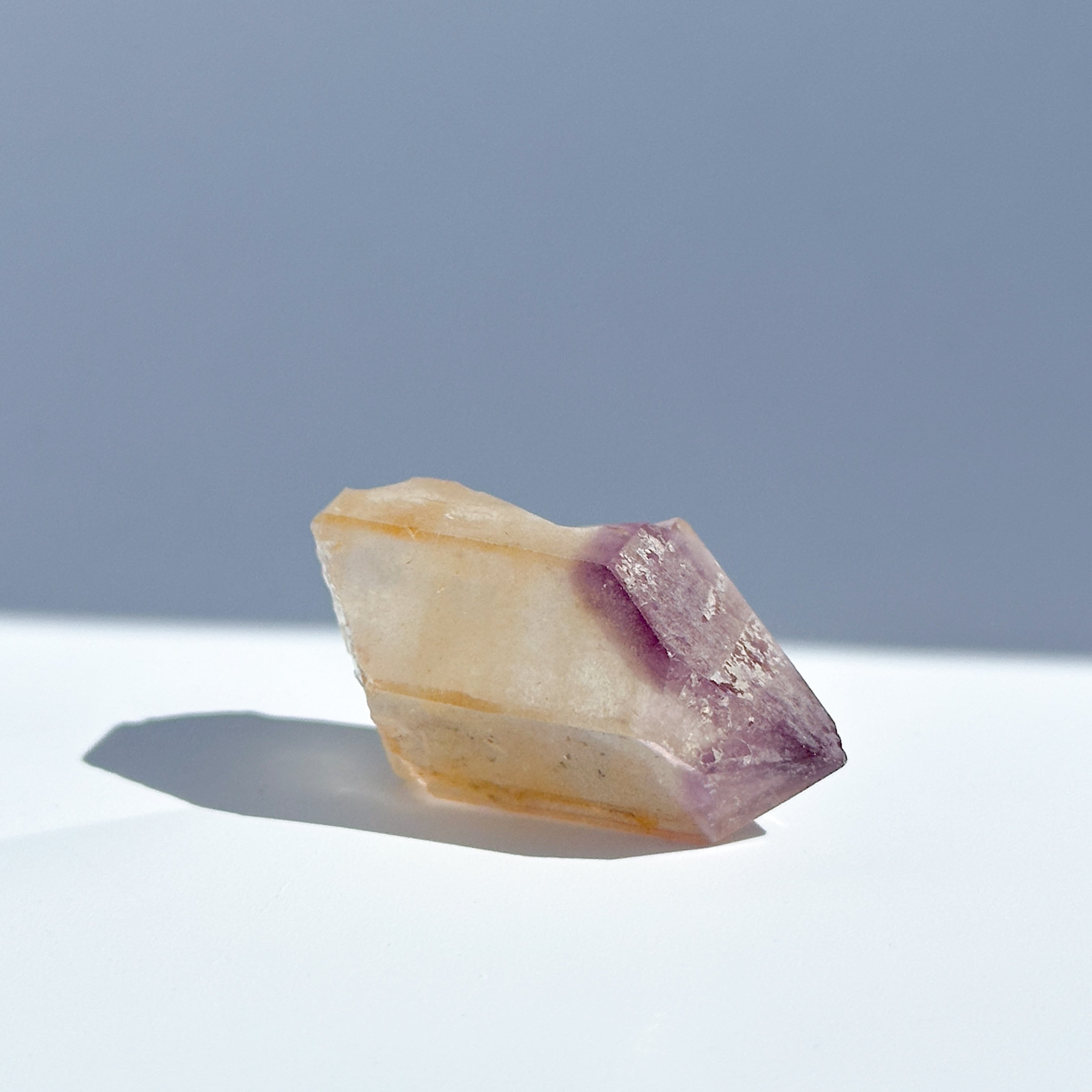 オレンジに色付いた部分は、水晶の表面にヘマタイトなどの鉄分を含んだタンジェリンクォーツと呼ばれるもので、トップにはアメジストが帽子のように色付いています。