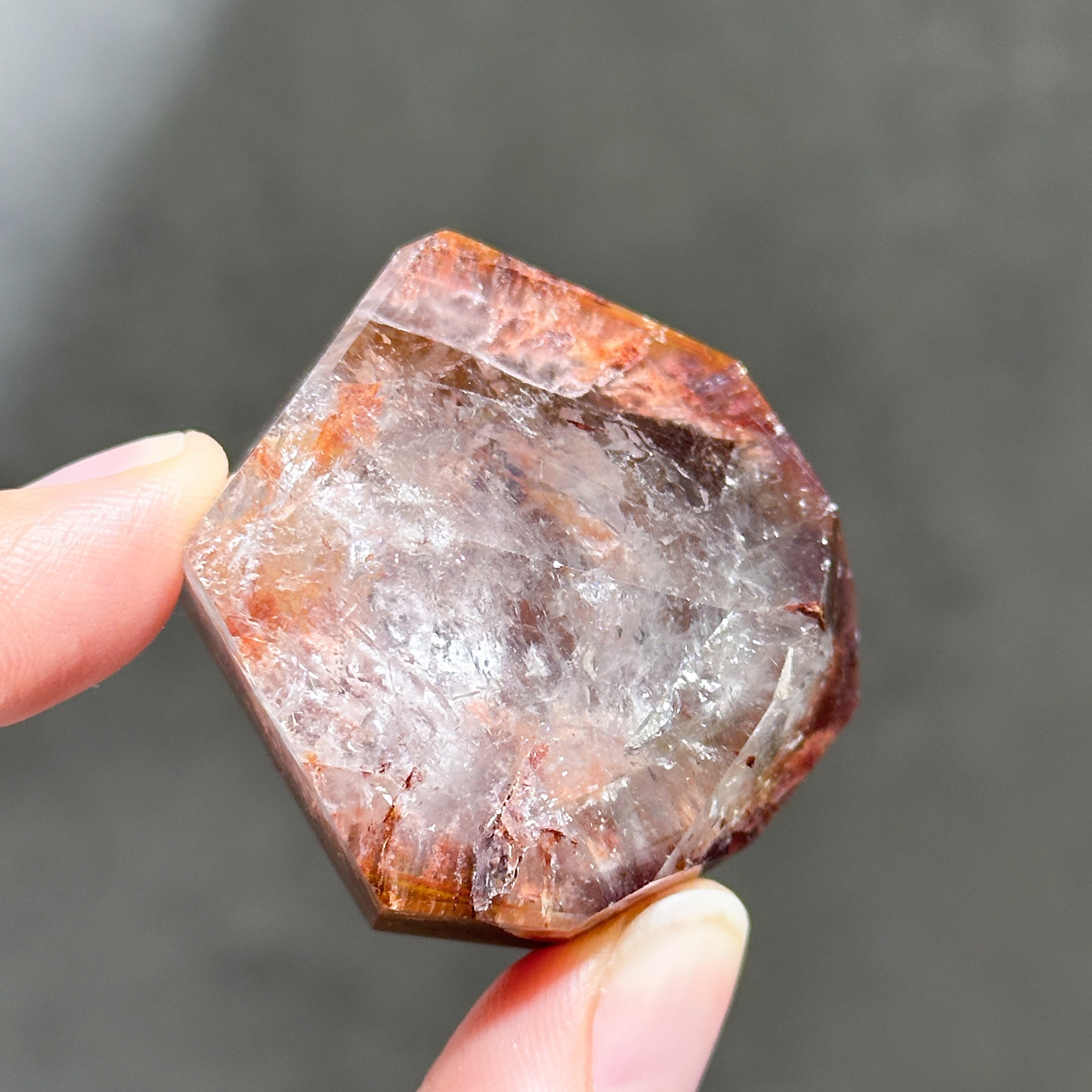オレンジに色付いた部分は、水晶の表面にヘマタイトなどの鉄分を含んだタンジェリンクォーツと呼ばれるもので、トップにはアメジストが帽子のように色付いています。