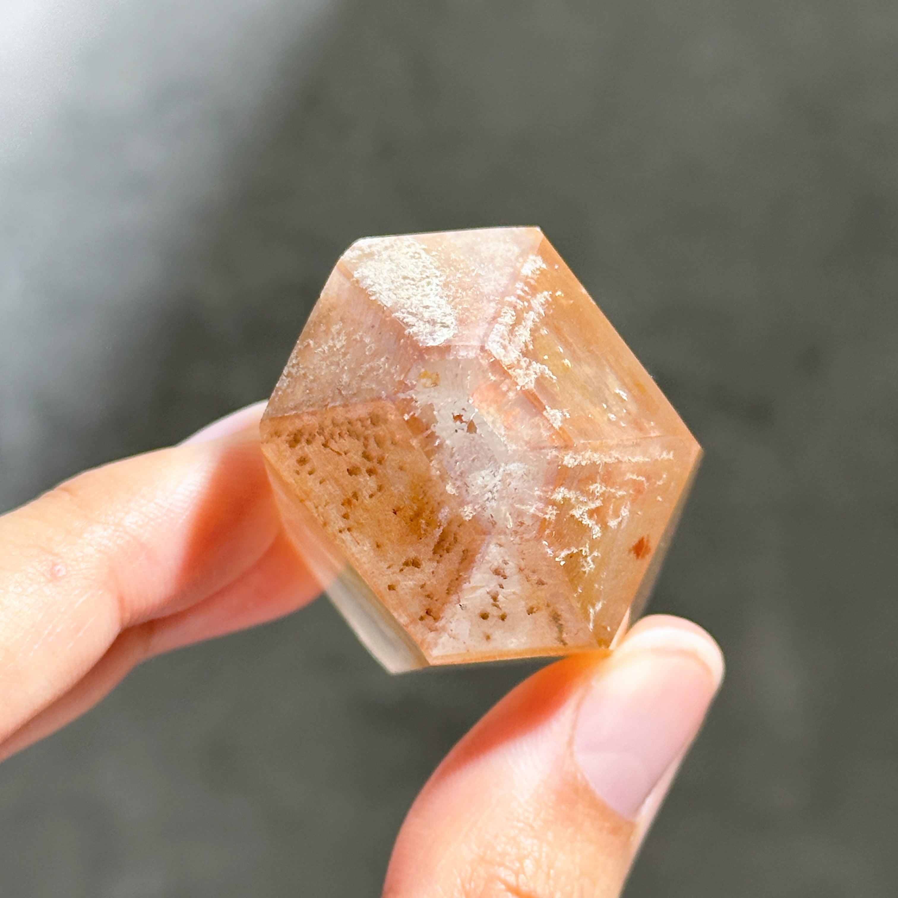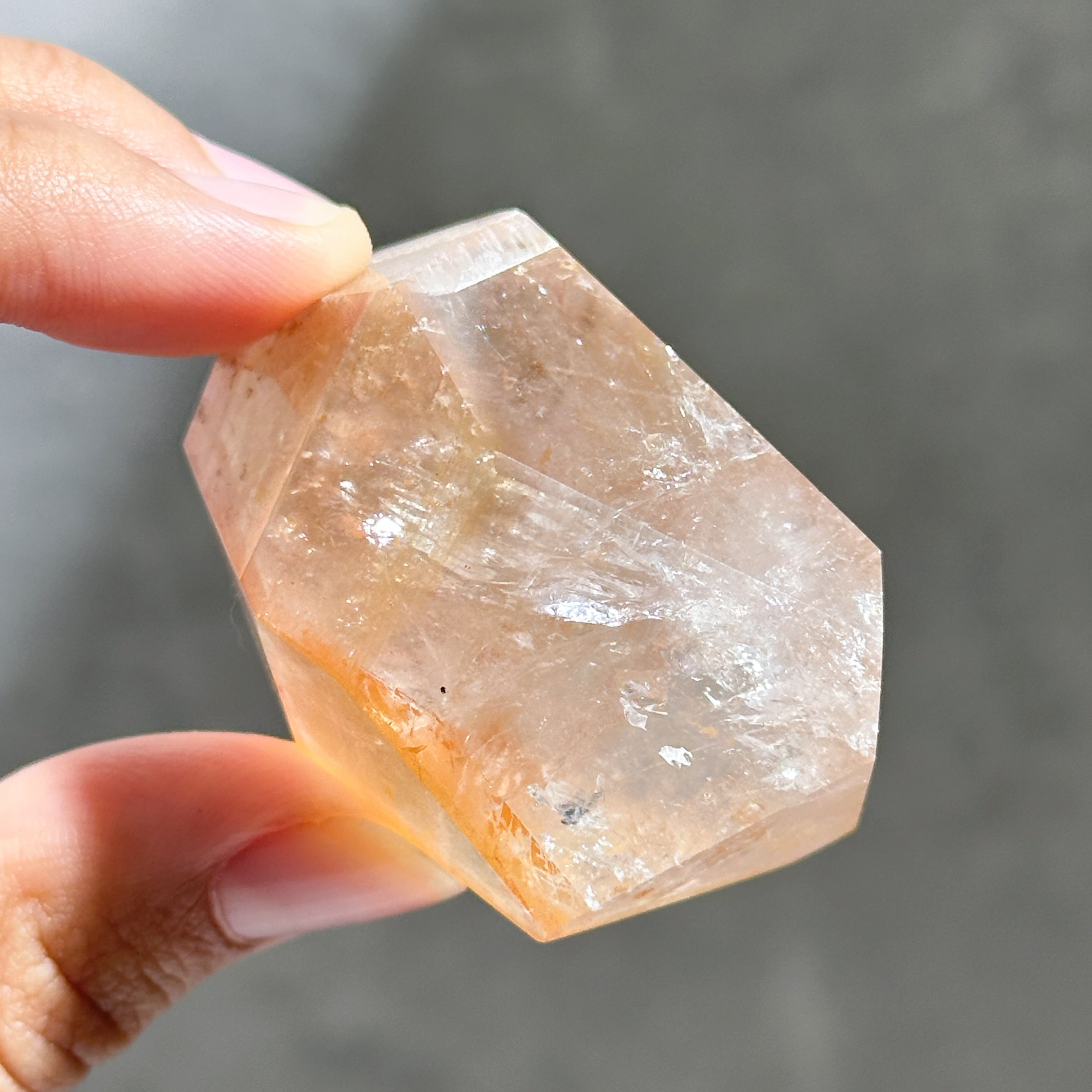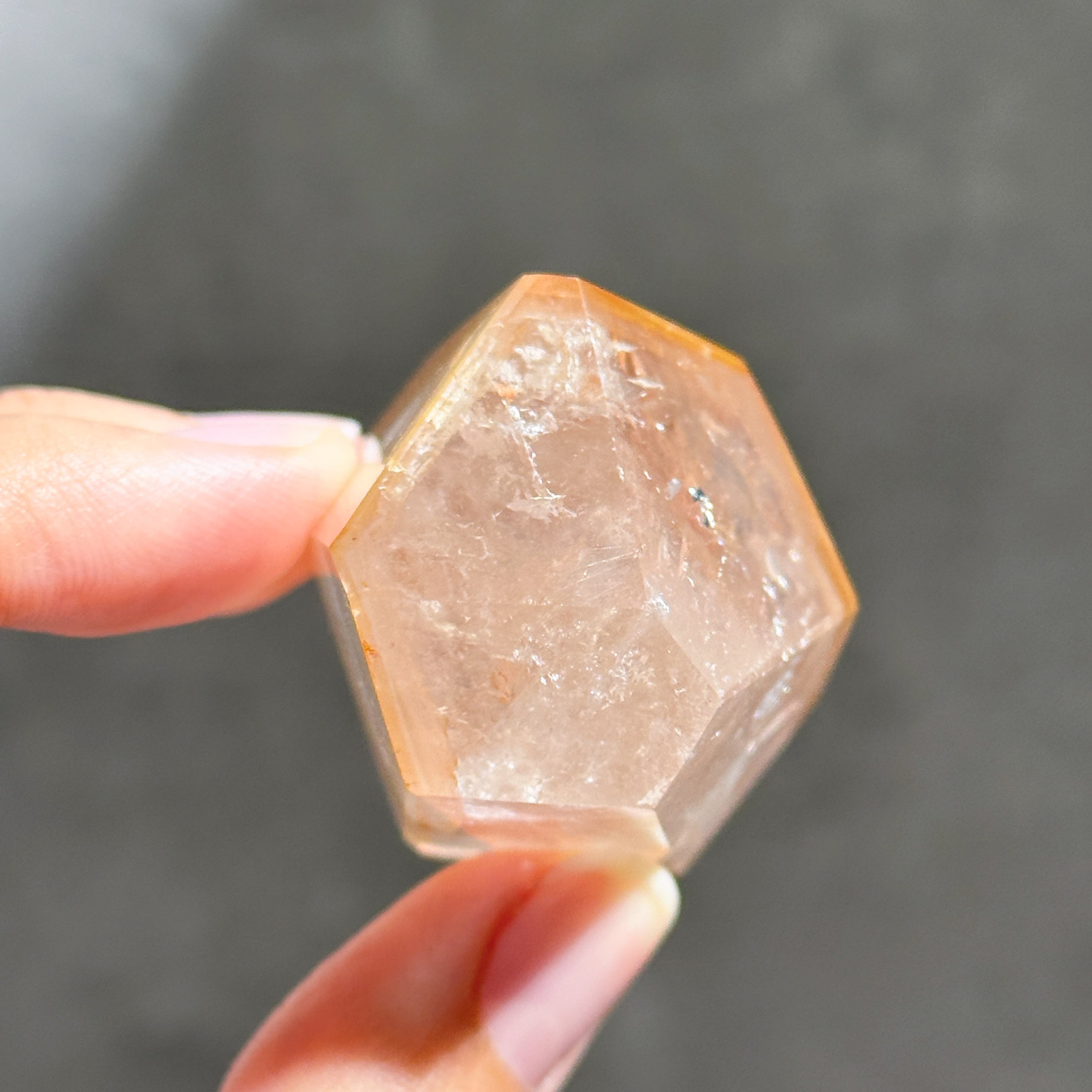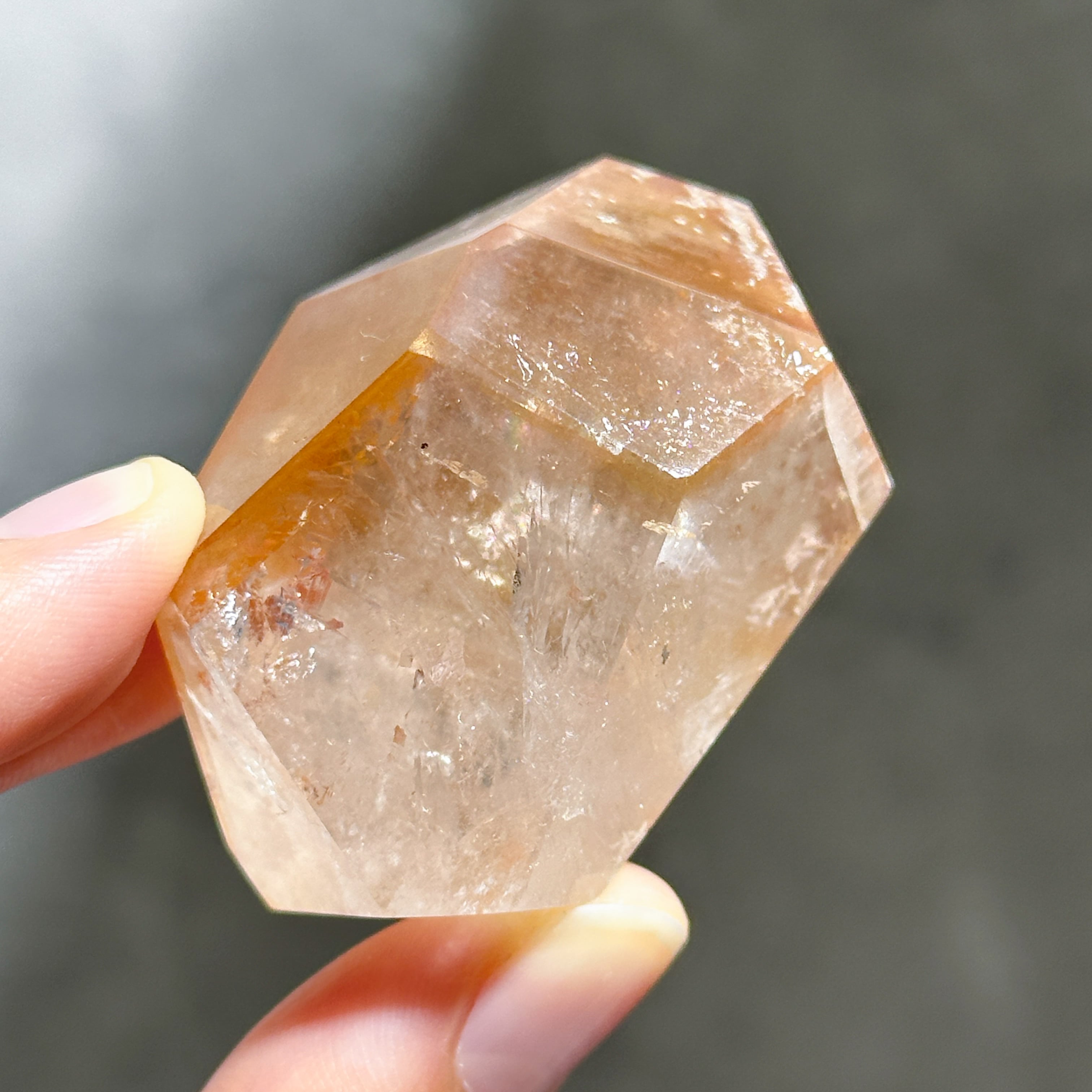 オレンジに色付いた部分は、水晶の表面にヘマタイトなどの鉄分を含んだタンジェリンクォーツと呼ばれるもので、トップにはアメジストが帽子のように色付いています。