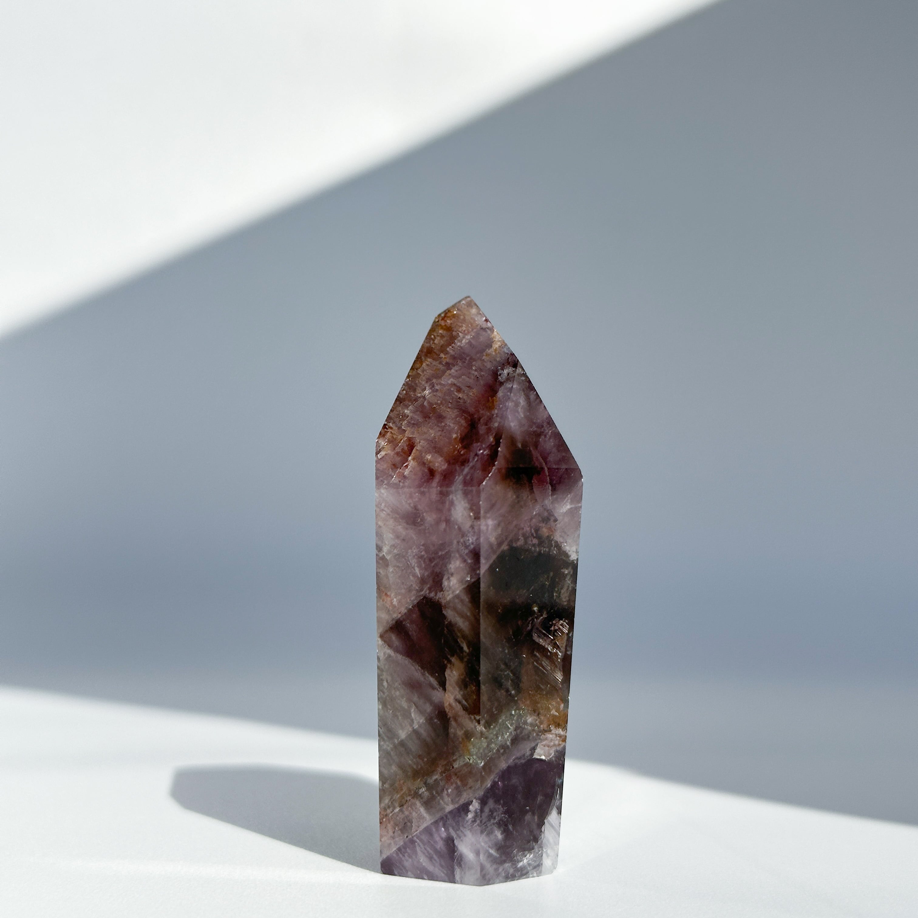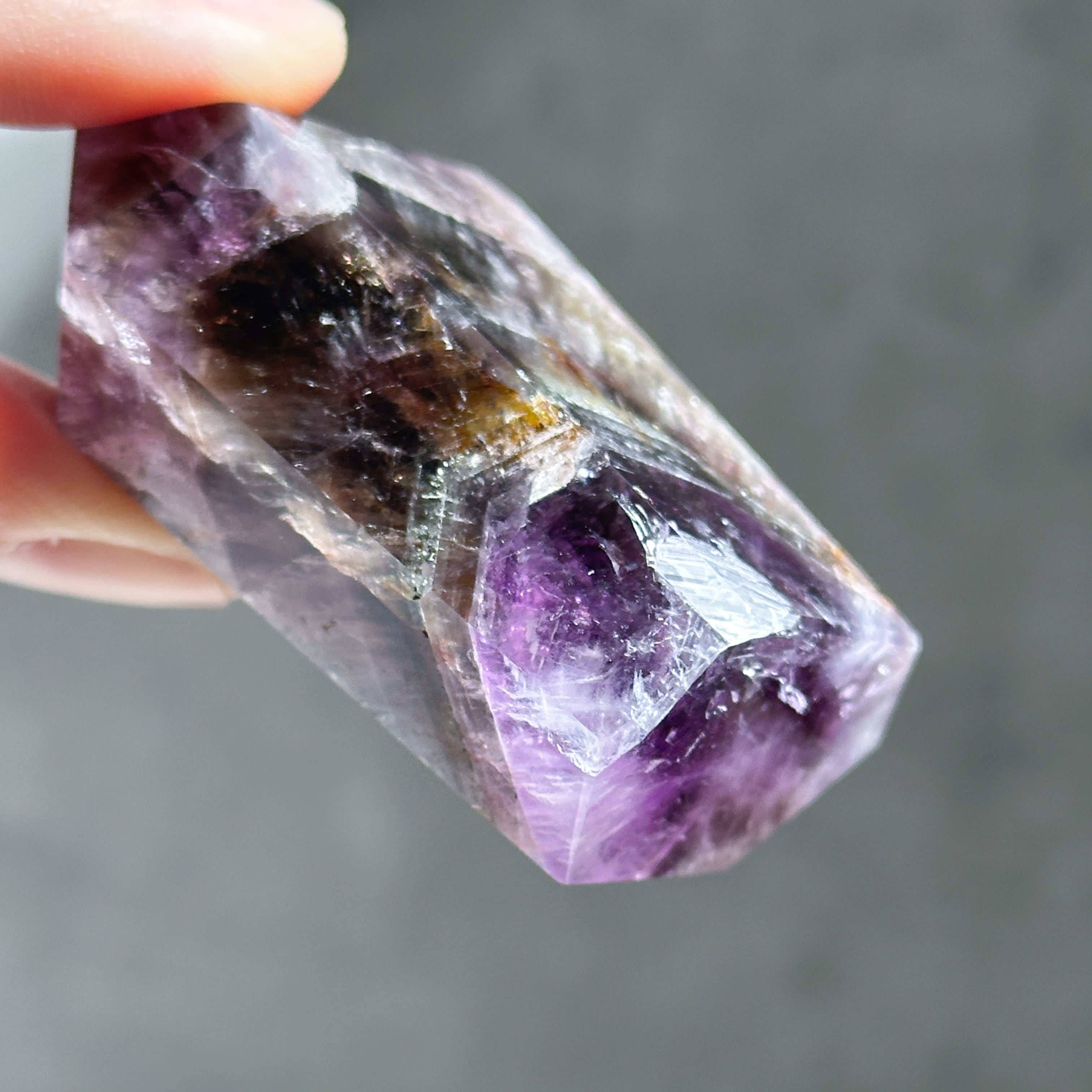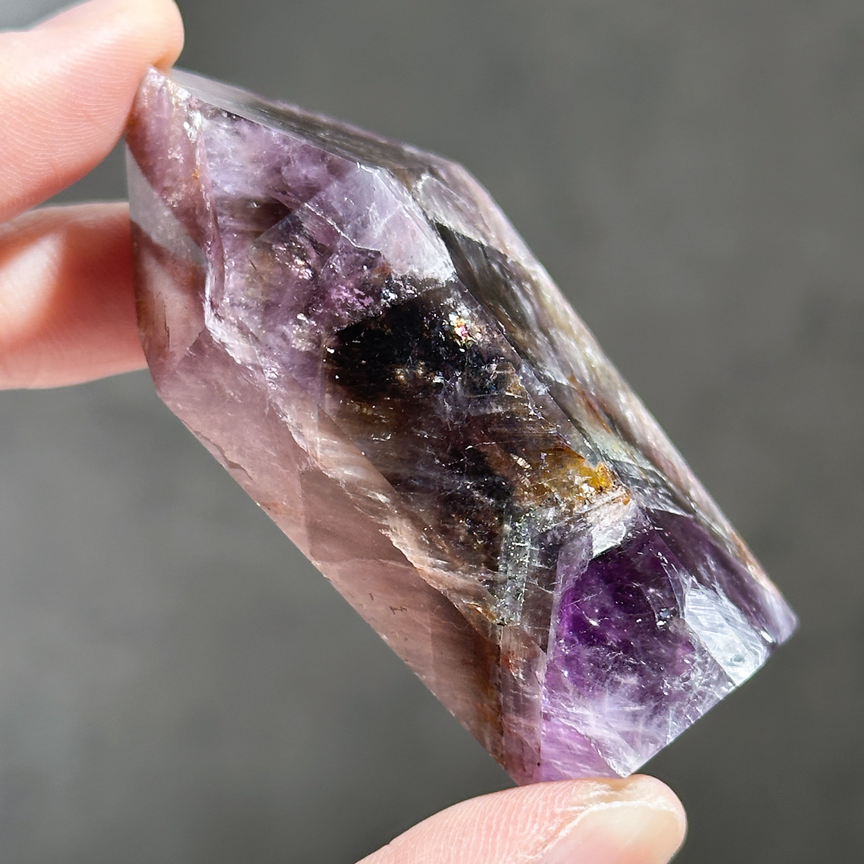 目視ではアメジスト、クリアクォーツ、スモーキークォーツが確認でき、それぞれが一つの石の中で混ざり合ったり、線状に切り替わったりし、非常に個性的な造形を作り上げています。