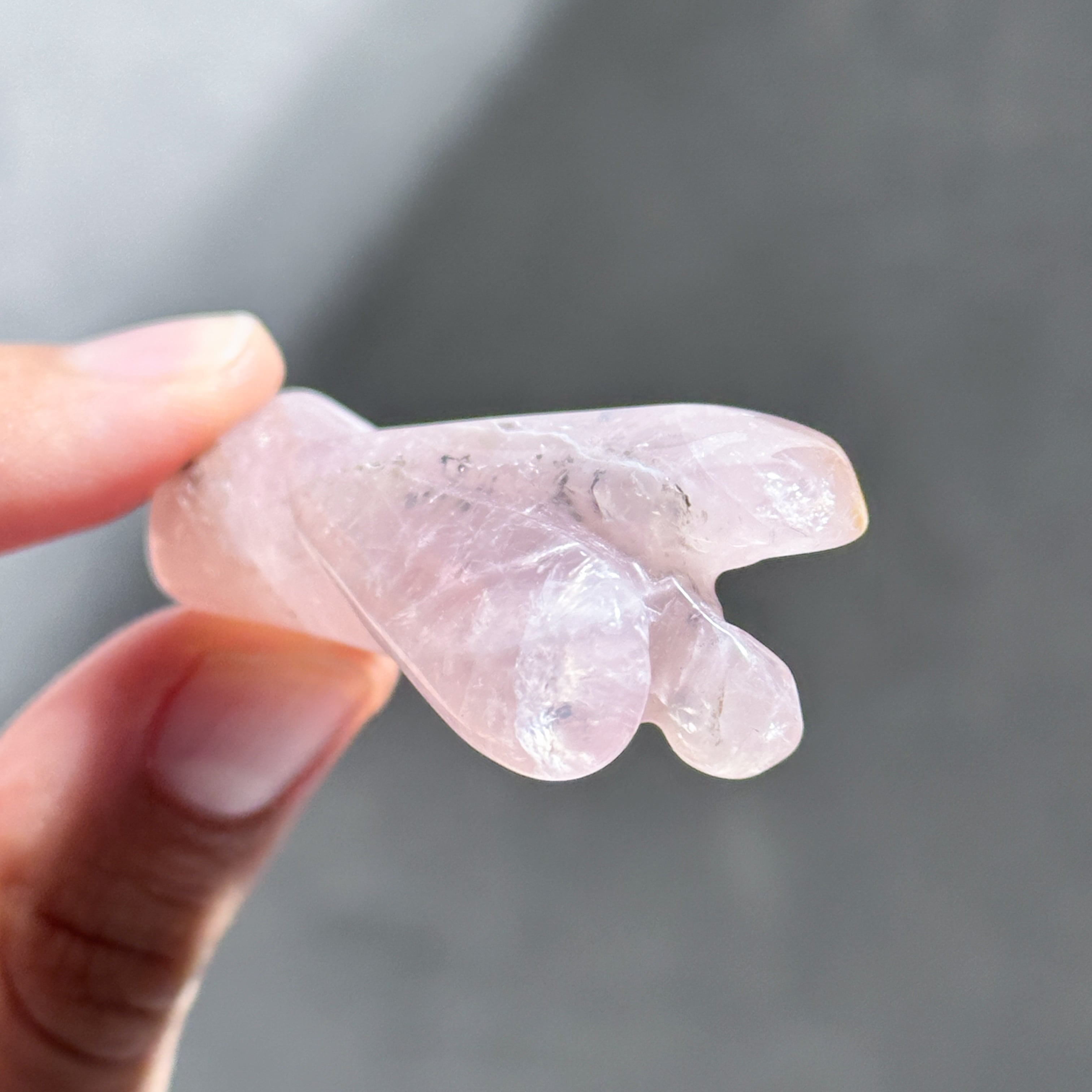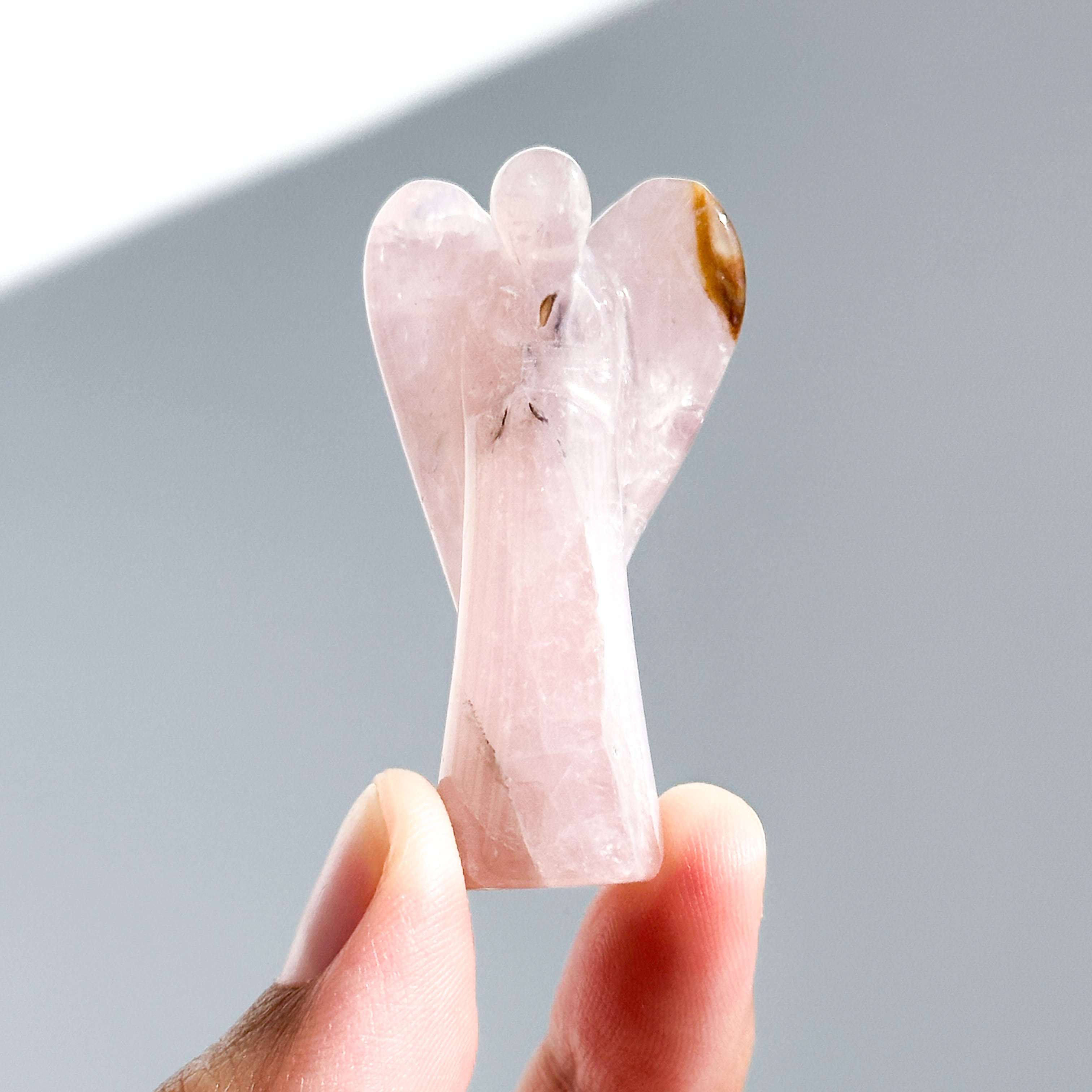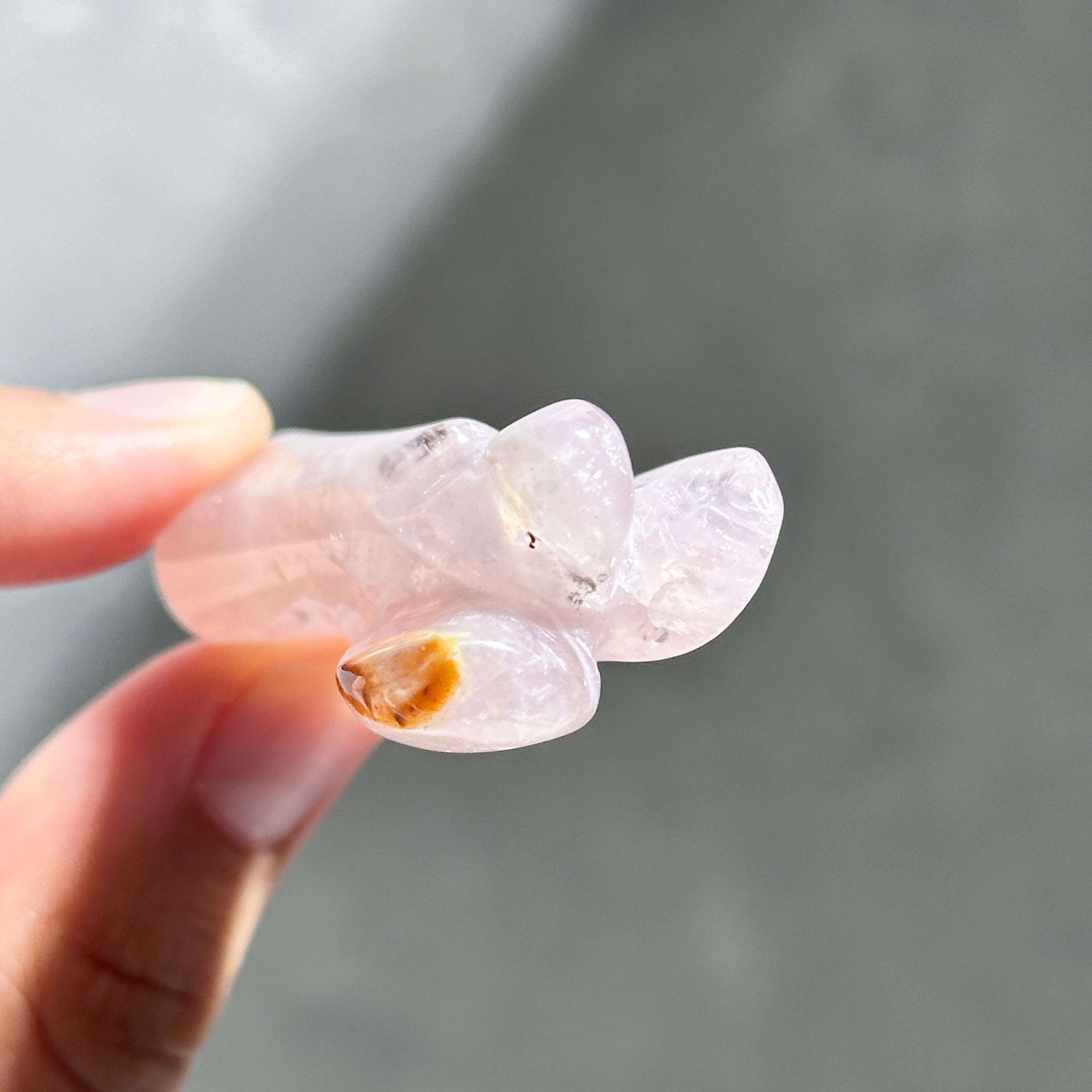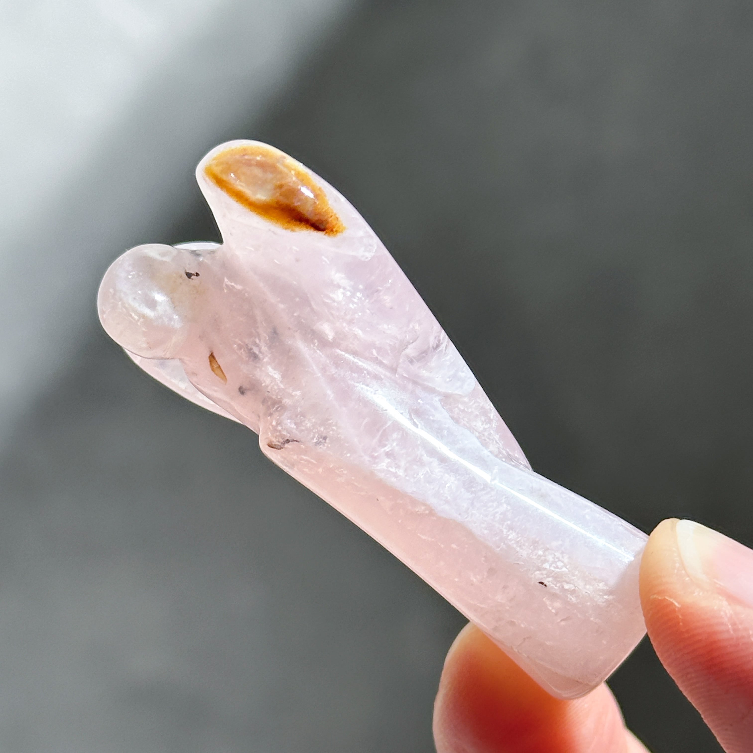 ゴールデンヒーラー×ローズクォーツを、小さなエンジェルの形に彫刻いたしました。