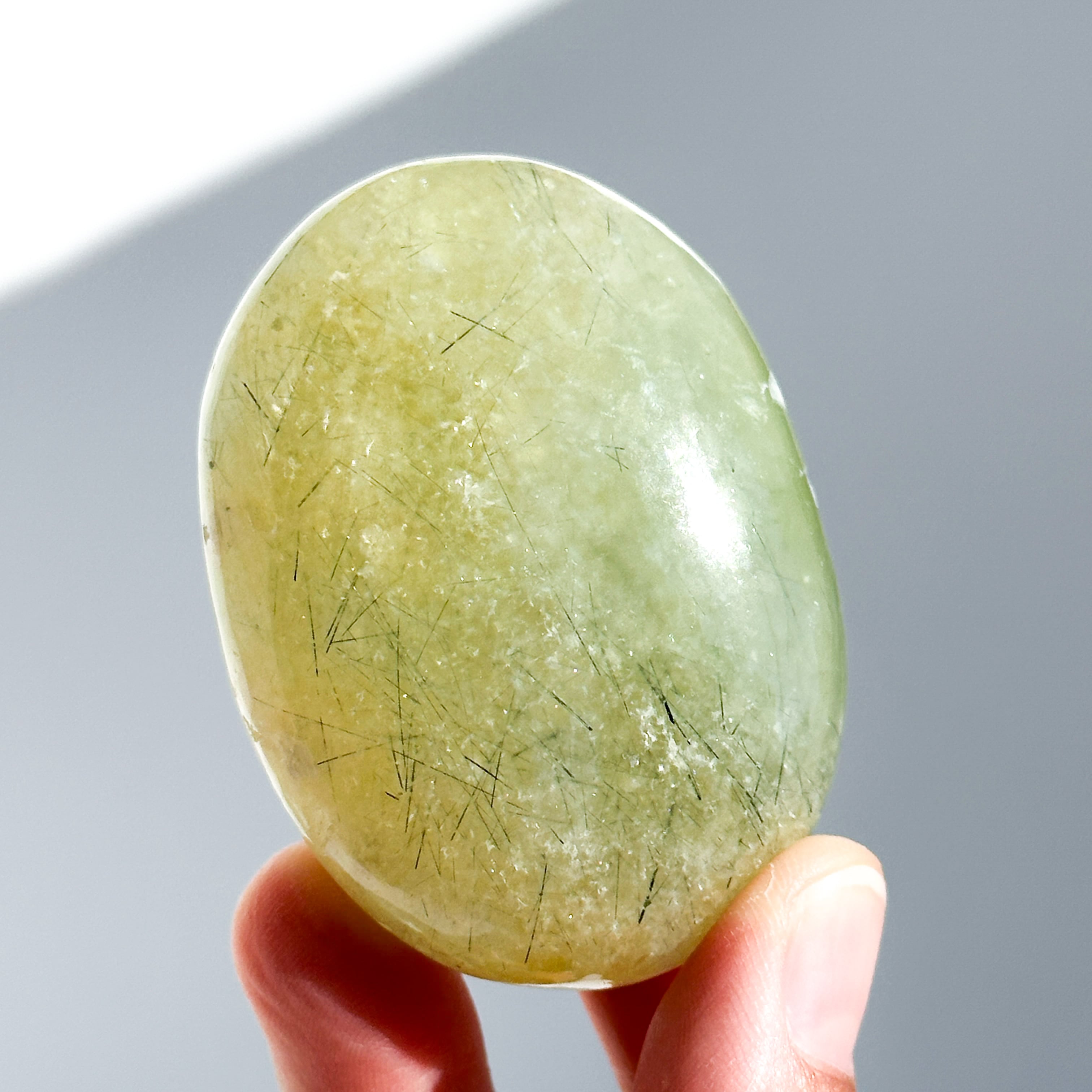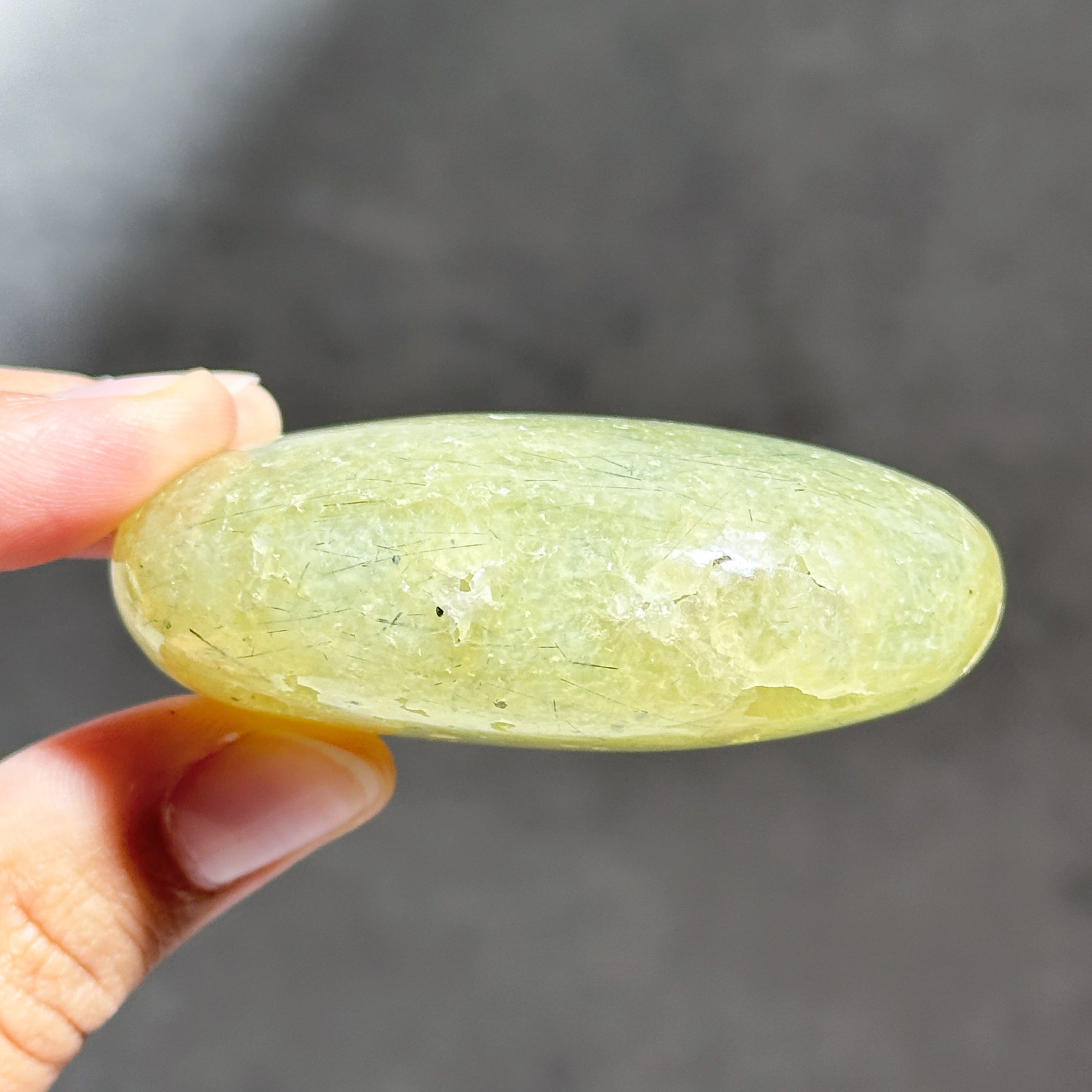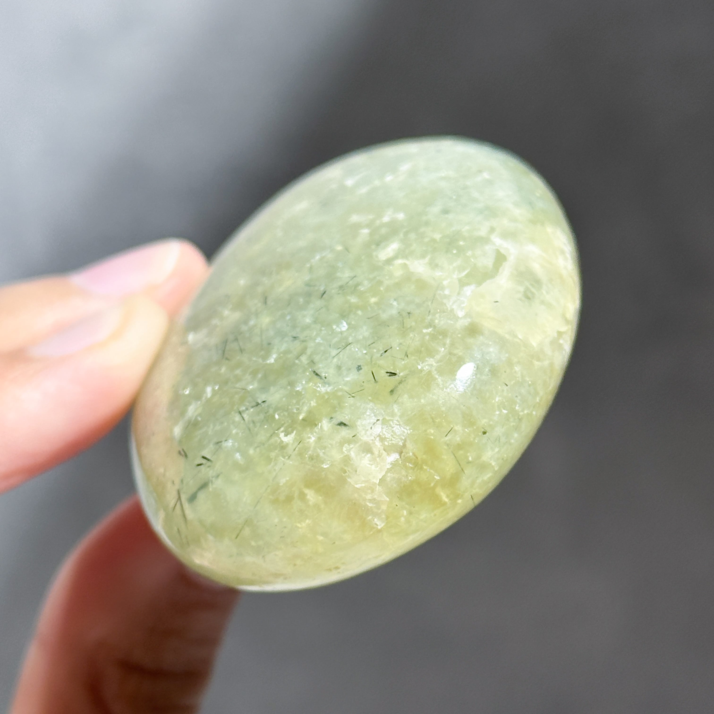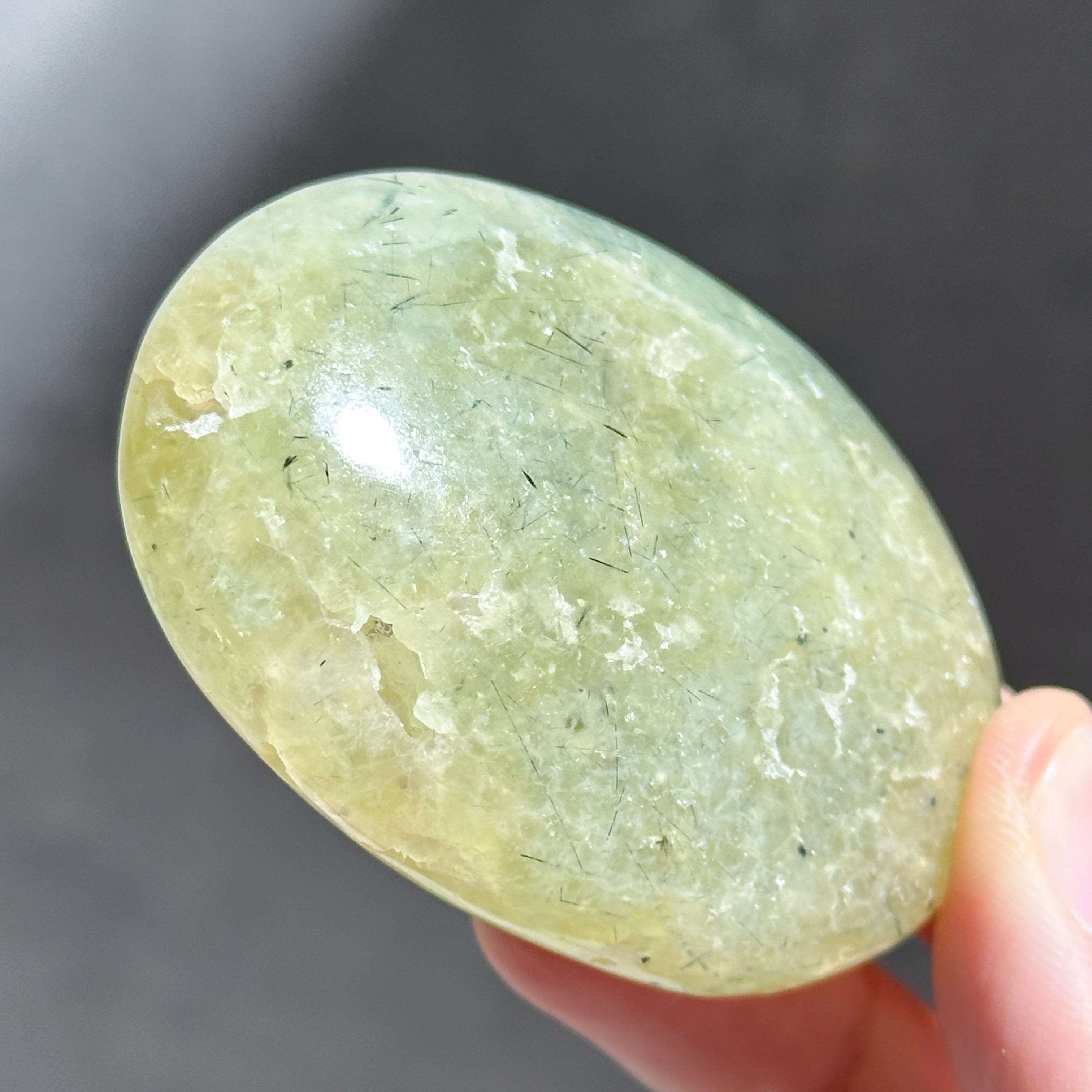握りやすいパーム状に研磨され、プレナイト特有の艶やかな光沢が見られます。