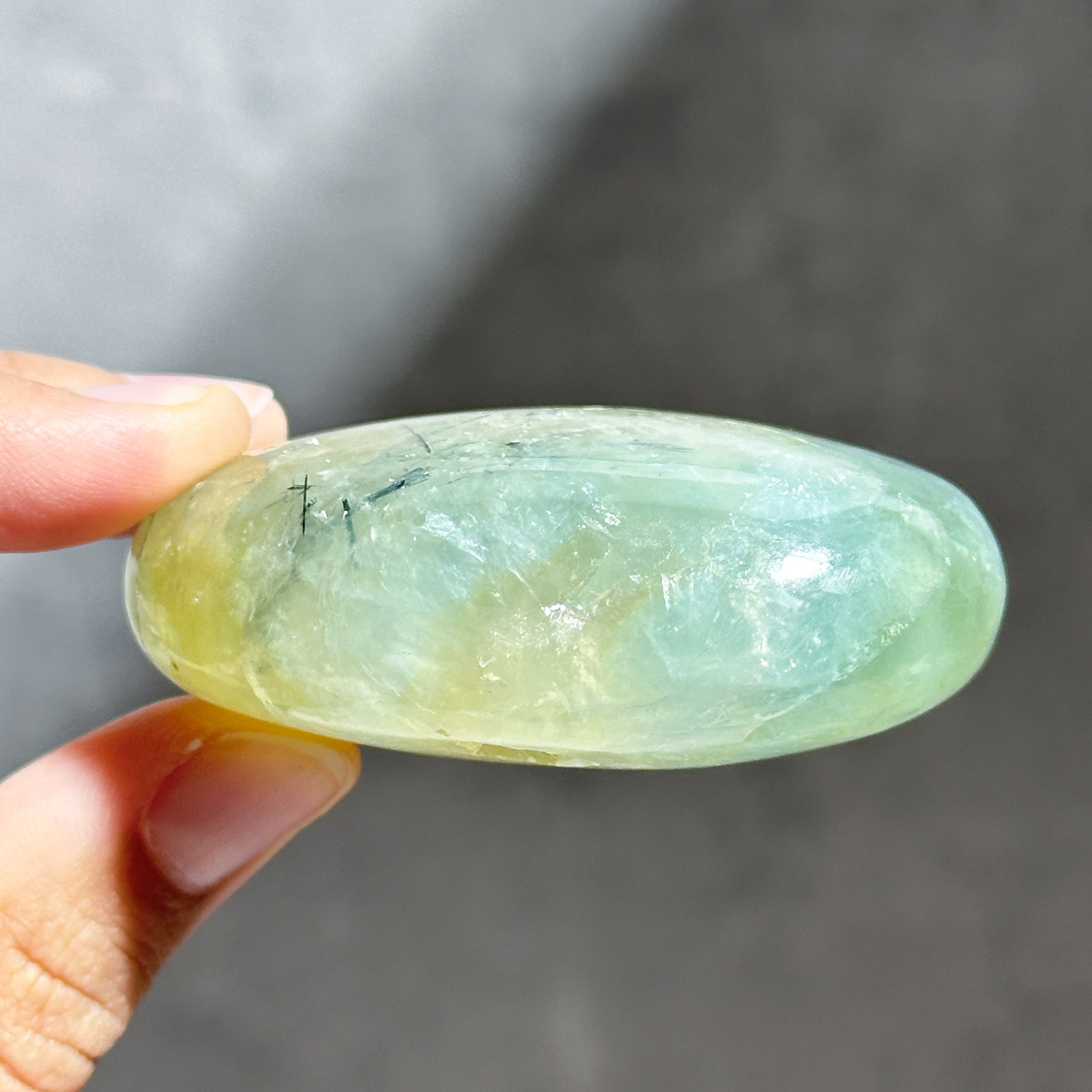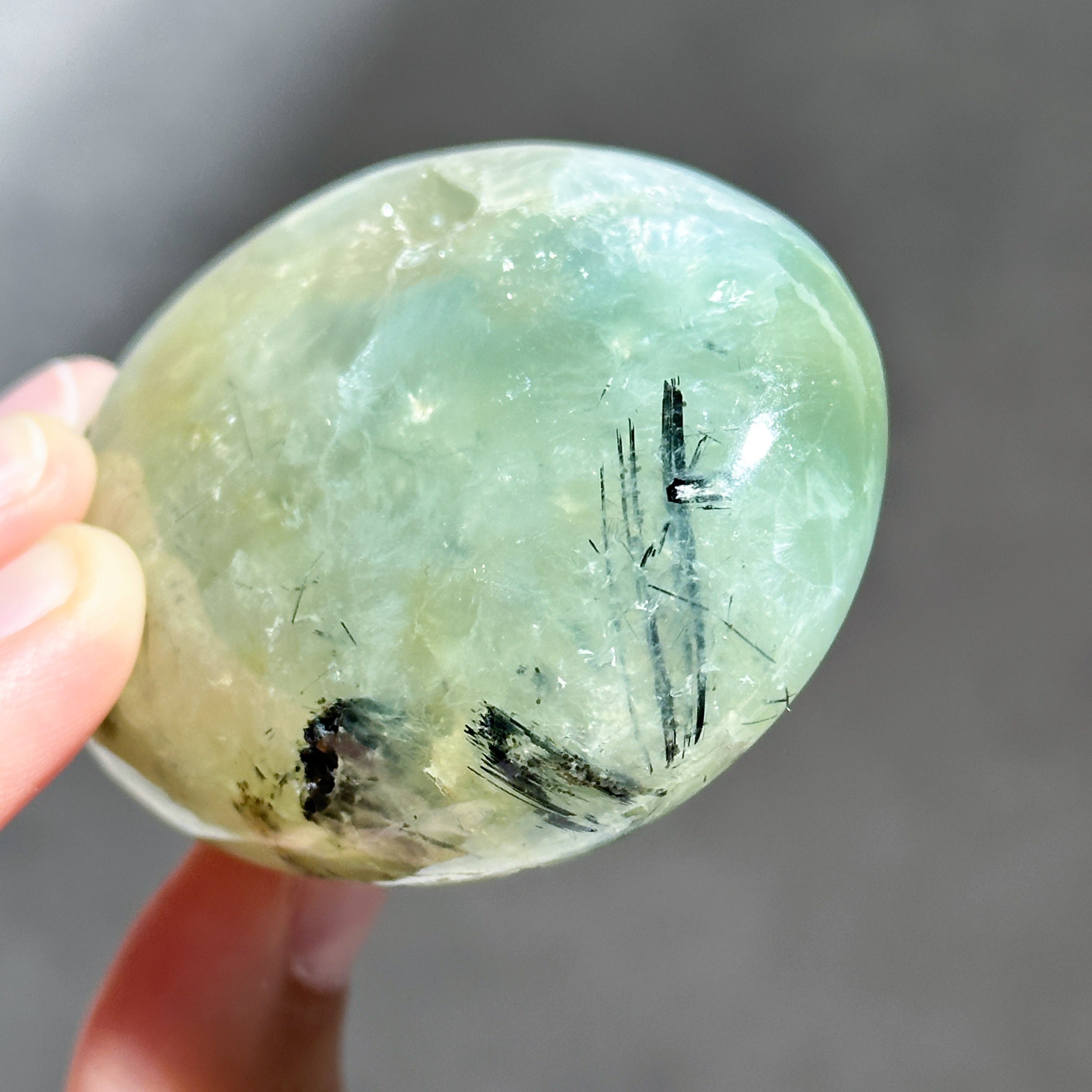 握りやすいパーム状に研磨され、プレナイト特有の艶やかな光沢が見られます。
