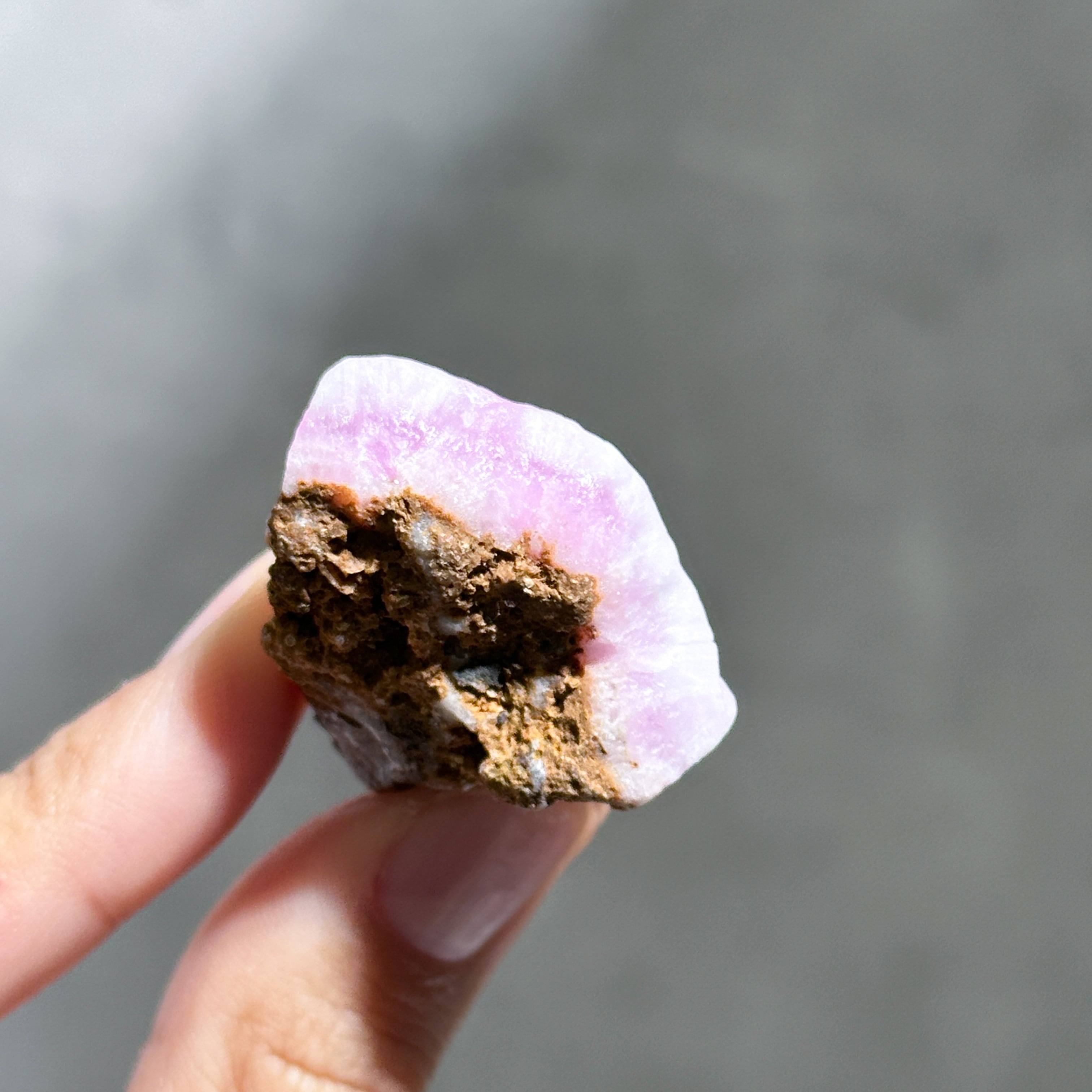 白色の部分も同じアラゴナイトです。アラゴナイト自体は世界中で産出する石ですが、このように、白とピンクが混じったものは、最近パキスタンで採掘されるようになったようで、他に類を見ない非常に珍しいものです✧