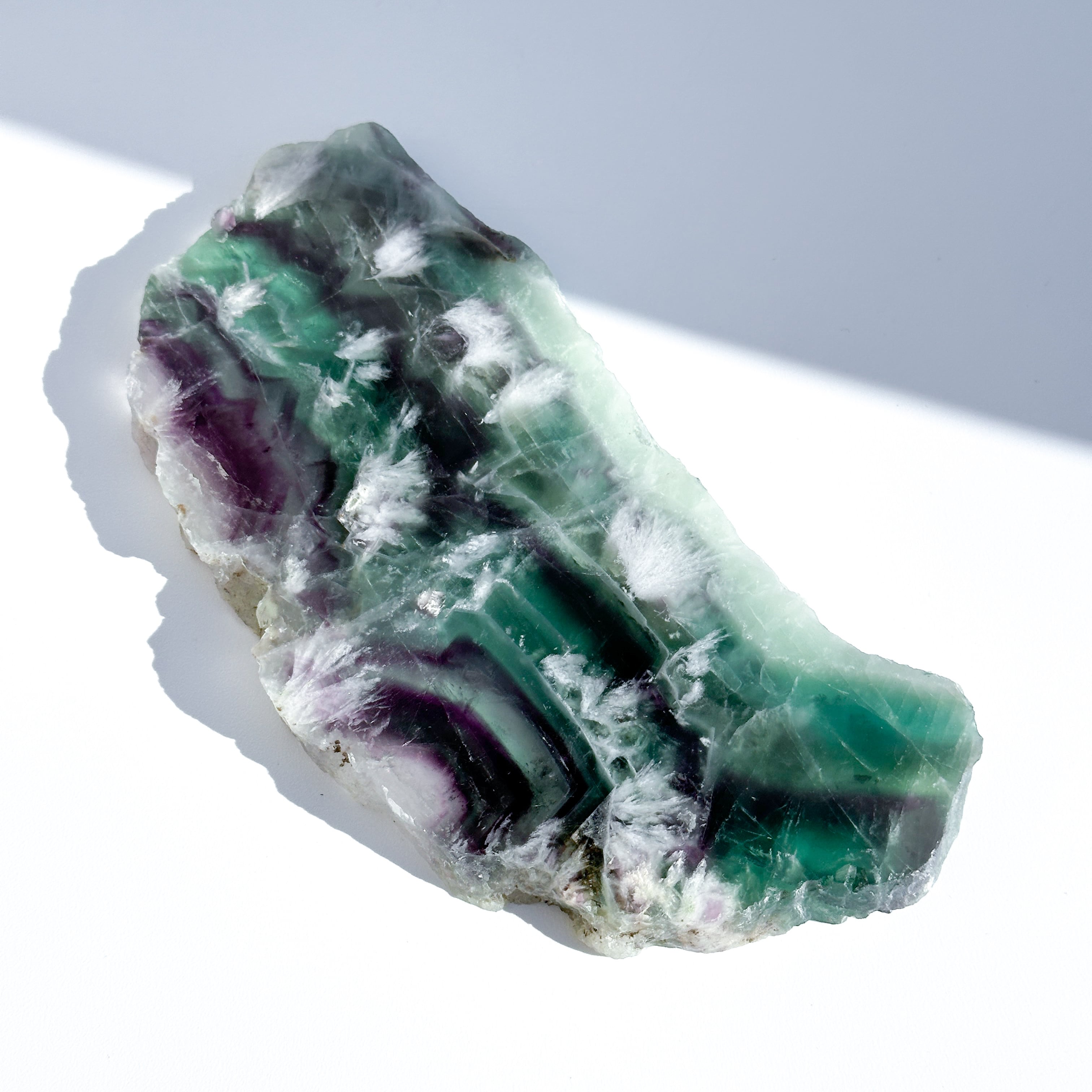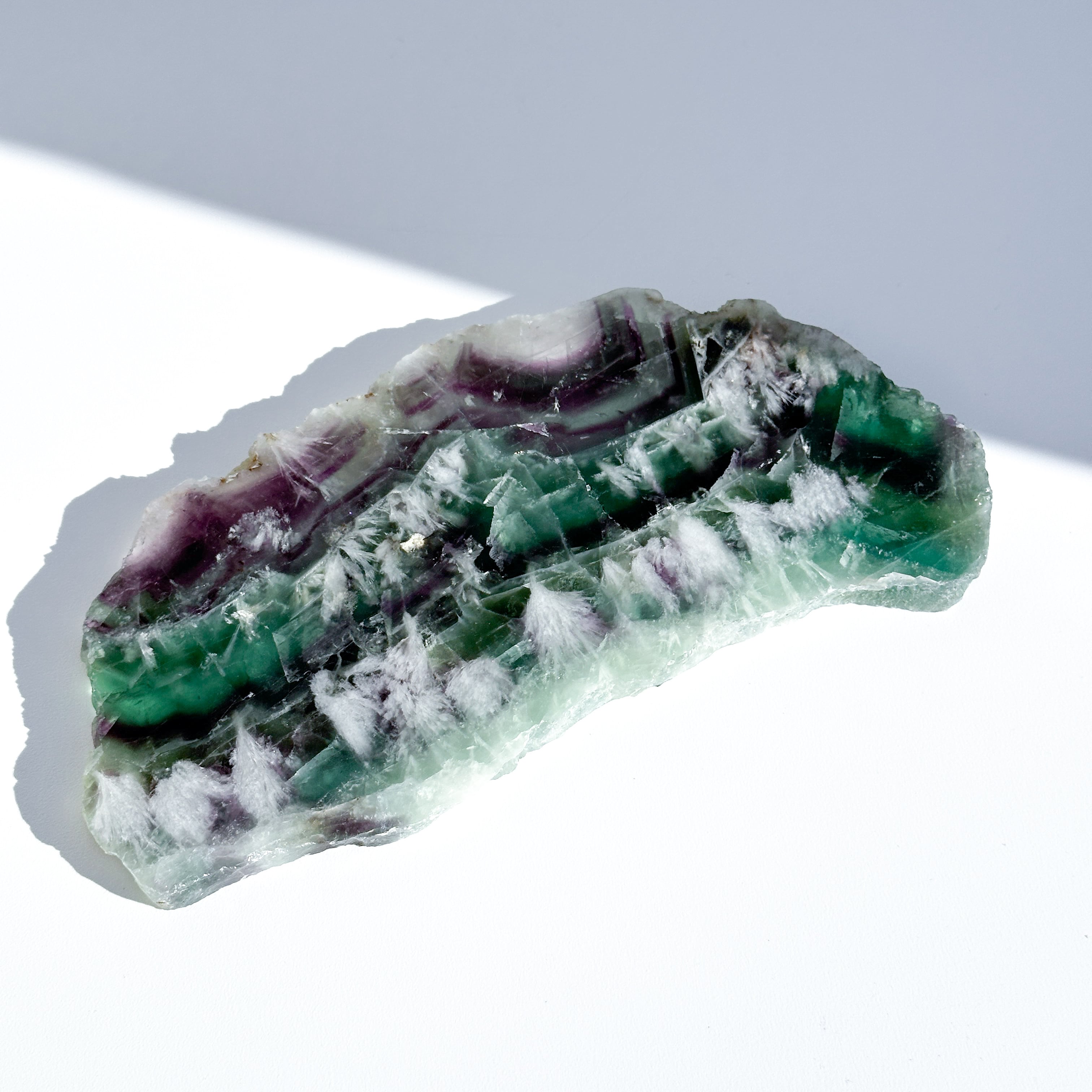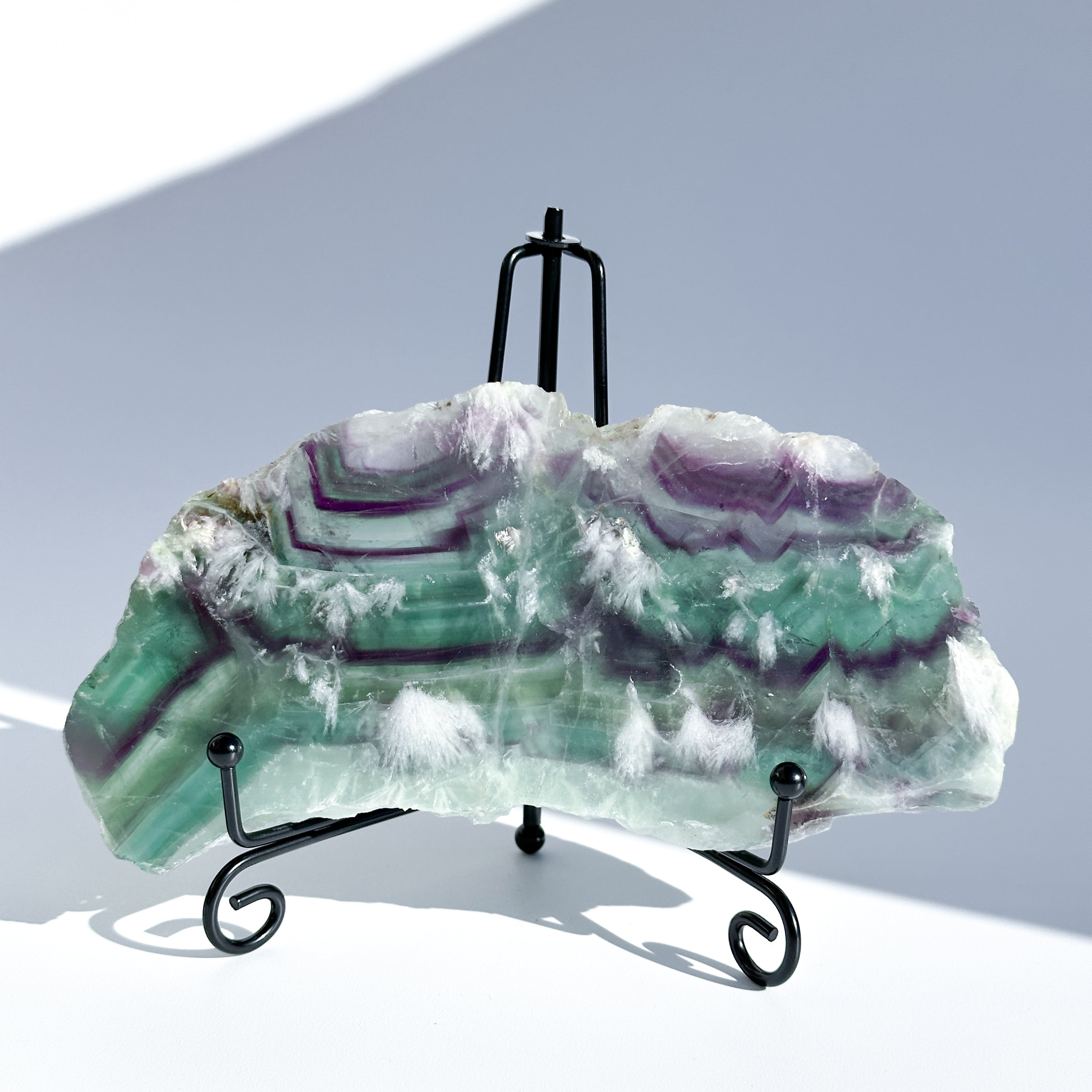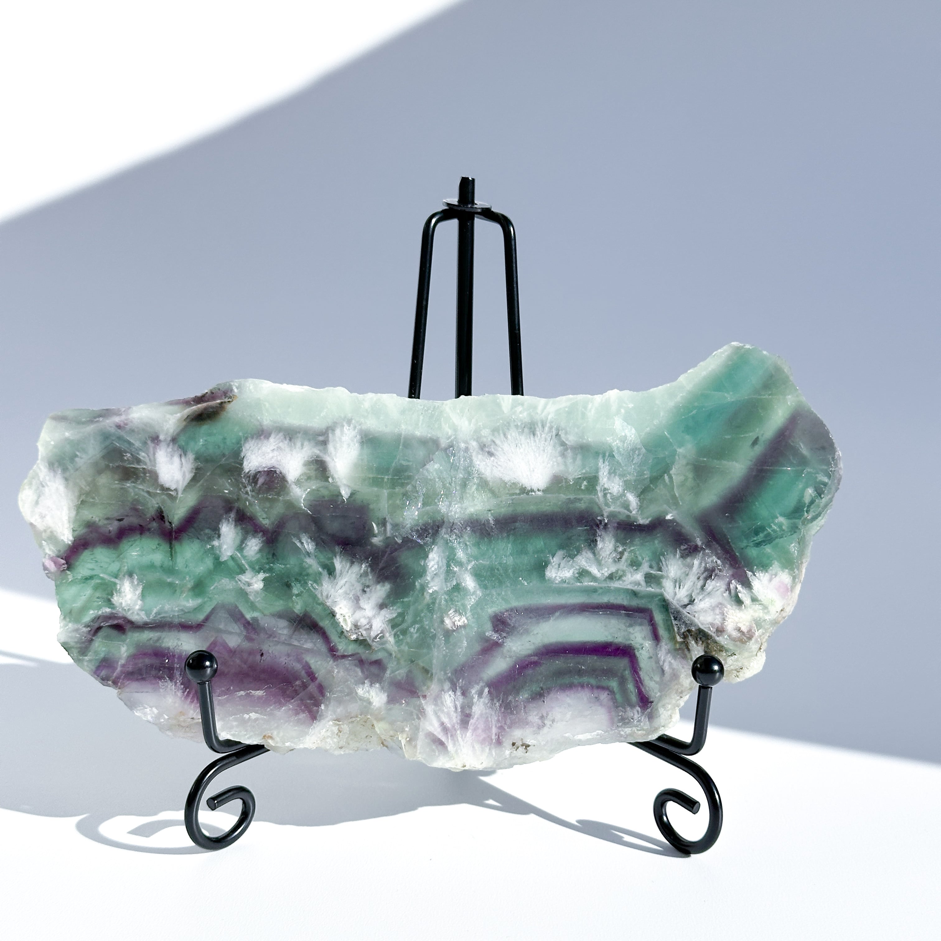 レインボーフローライトは複数のカラー(透明・パープル・ブルー・ピンク・グリーン)が共生し、水面のような曲線の模様を生み出しています。