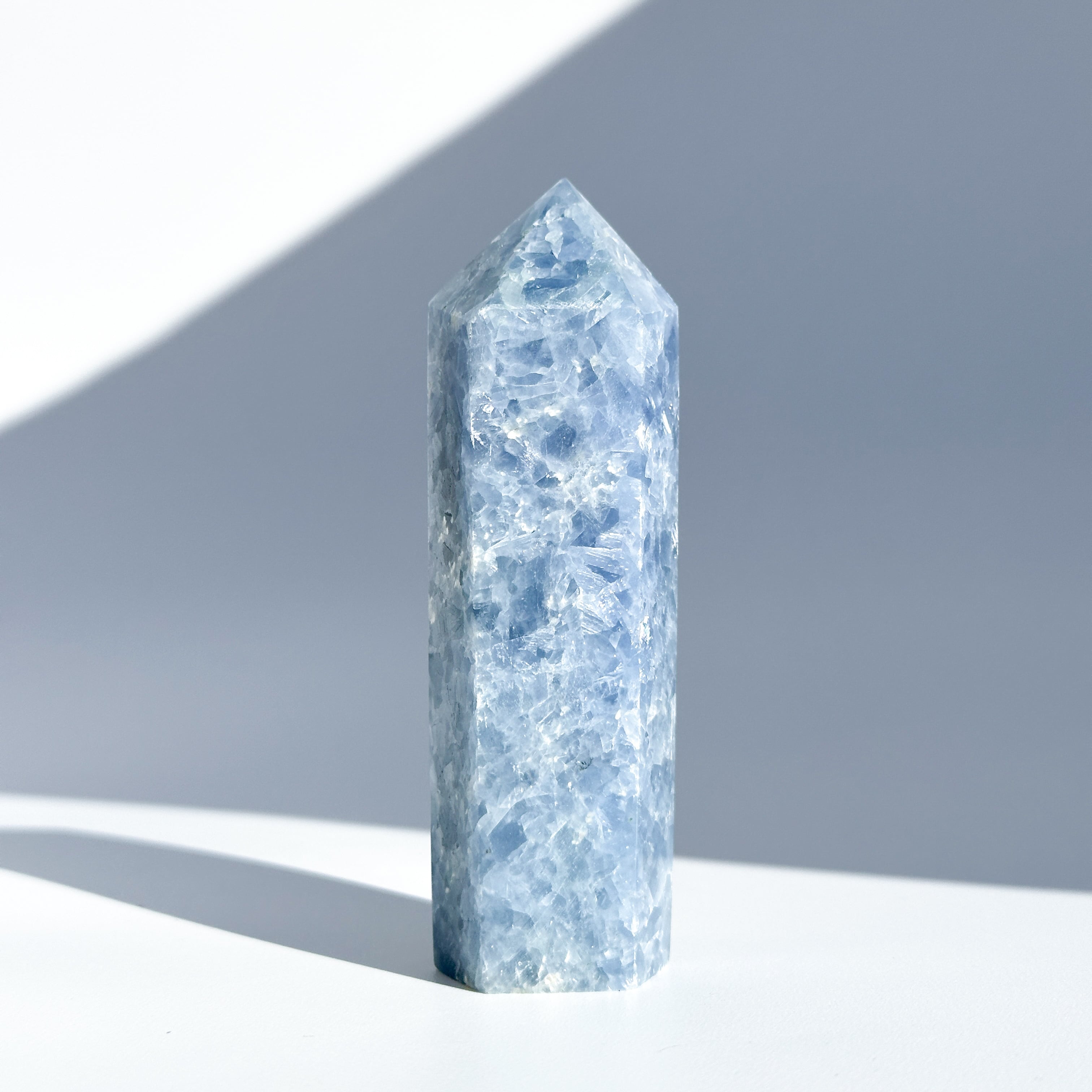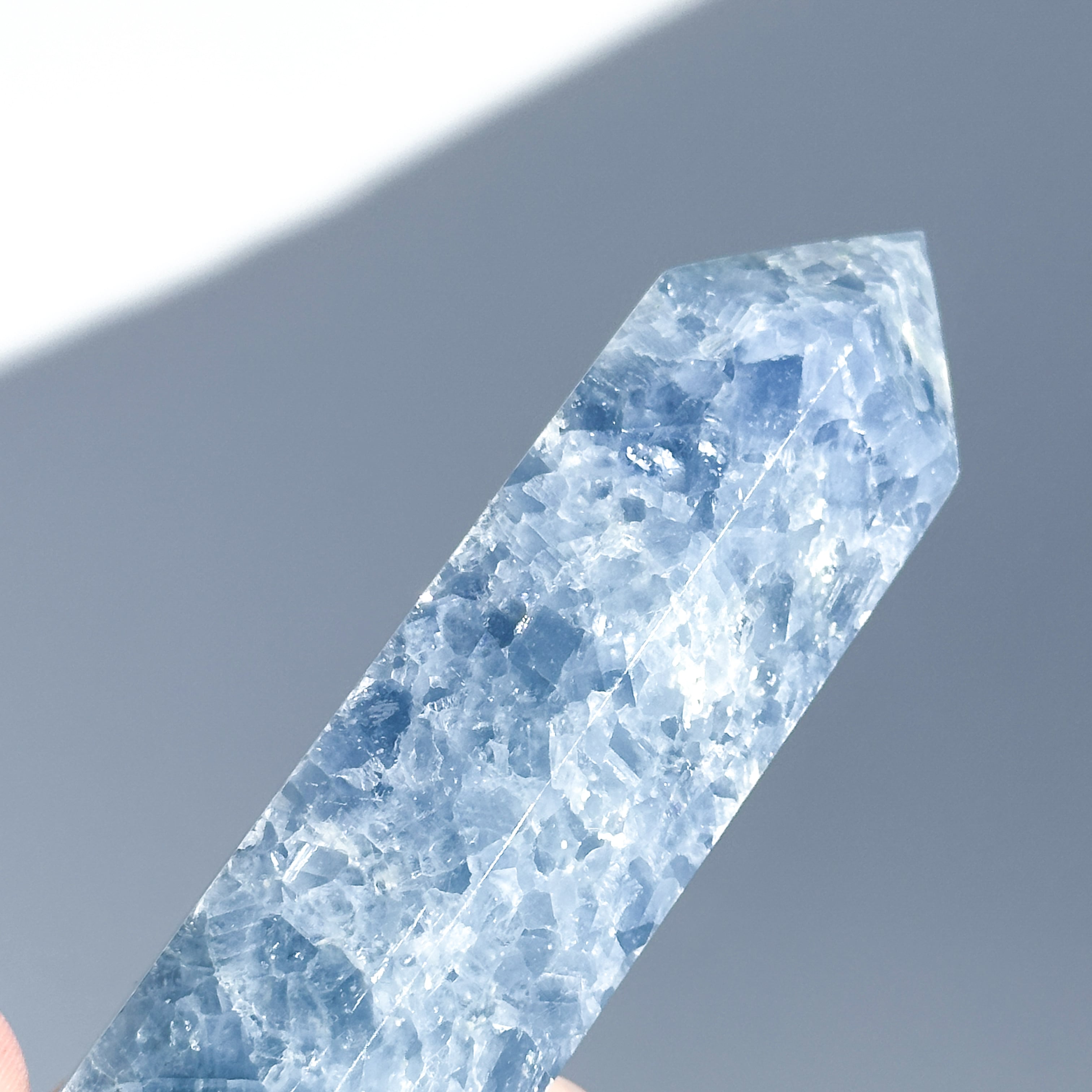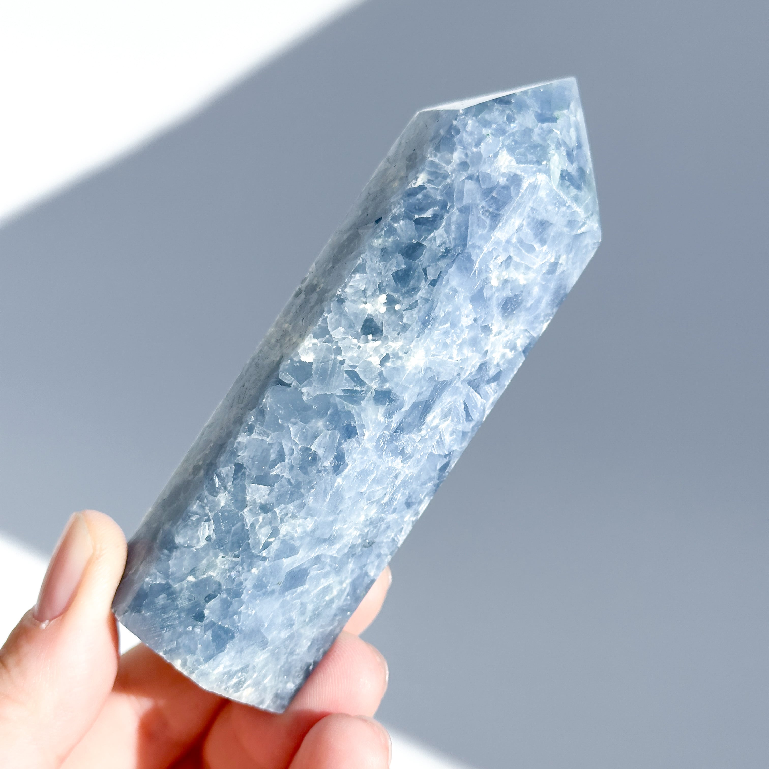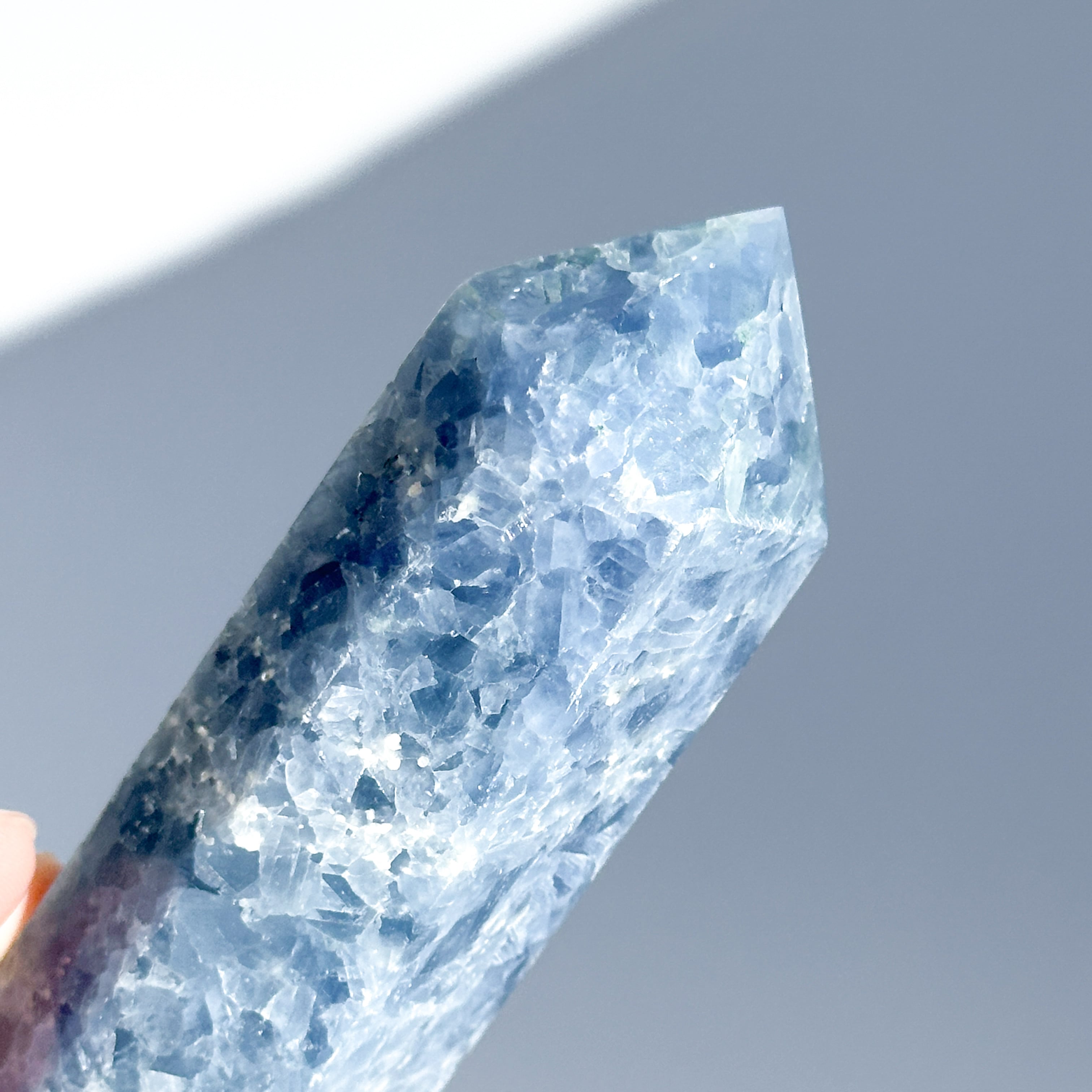 澄み渡るライトブルーの天然石、セレスタイトをタワー型に研磨しました。