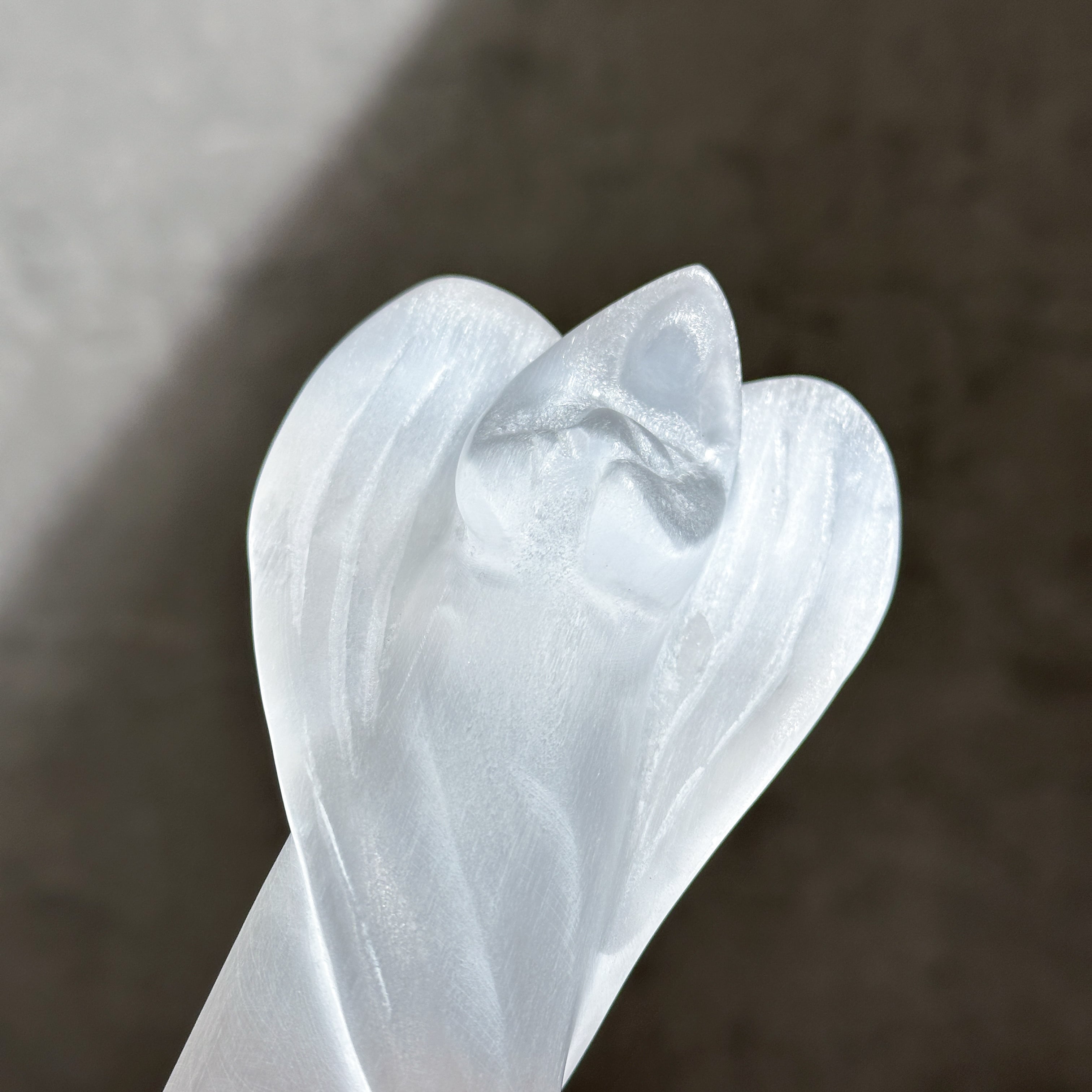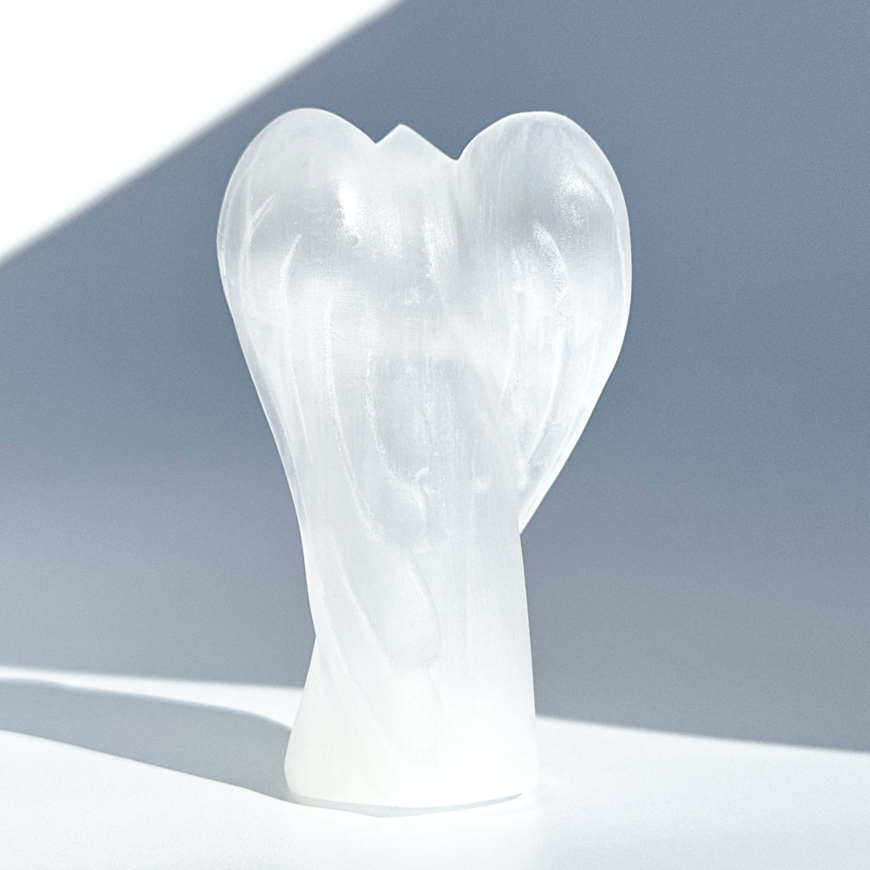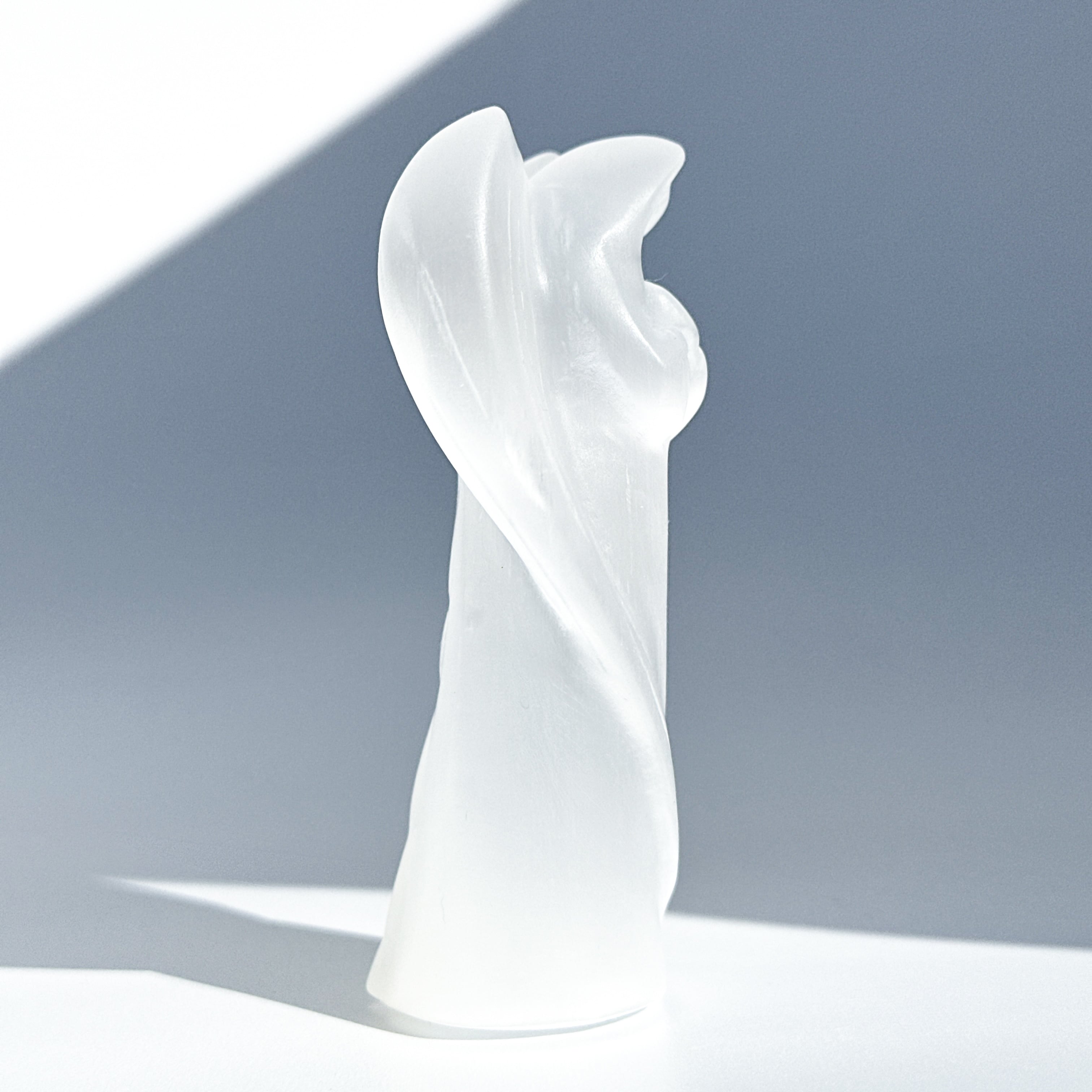 乳白色でほんのり透明感のあるセレナイトを、天使の形に彫刻いたしました。