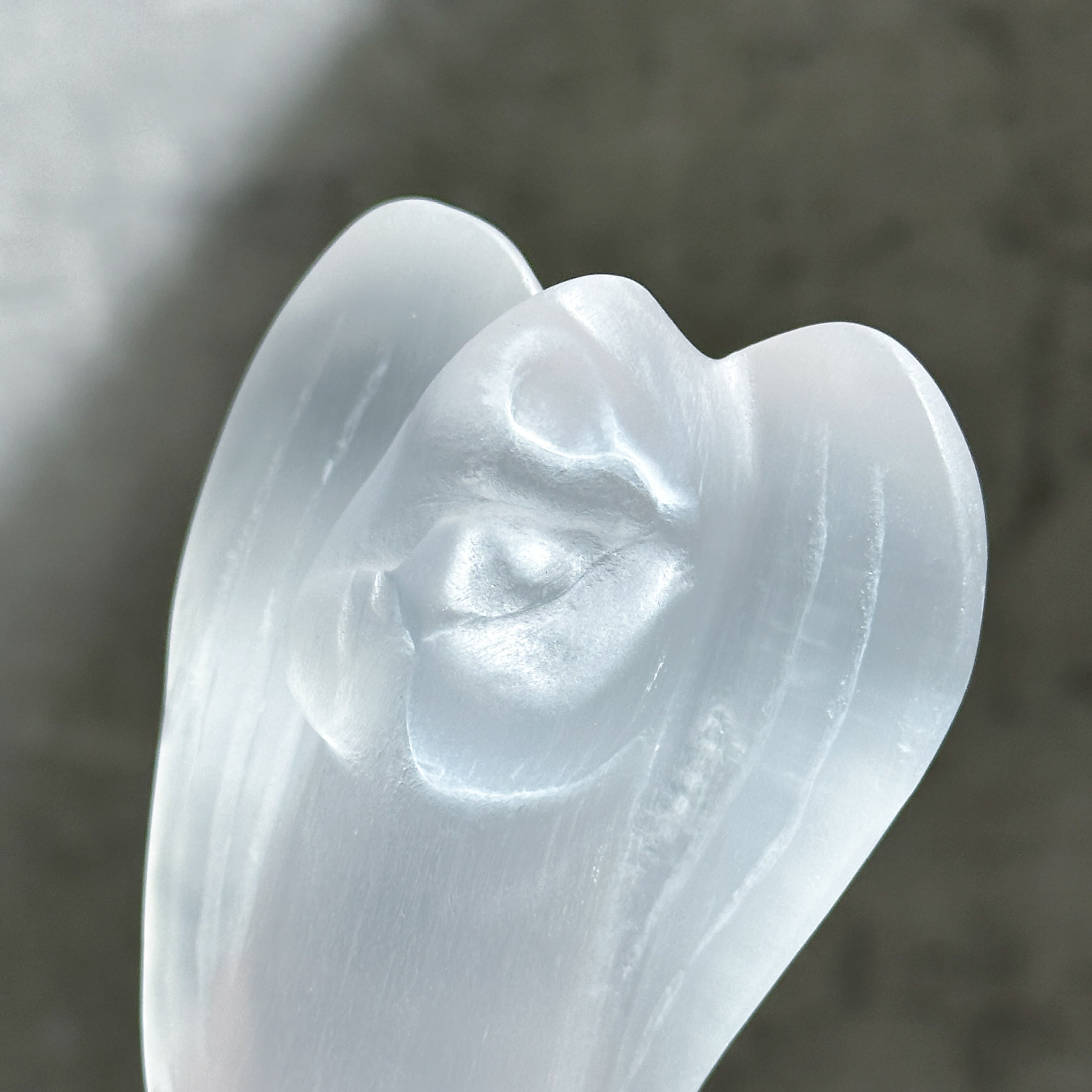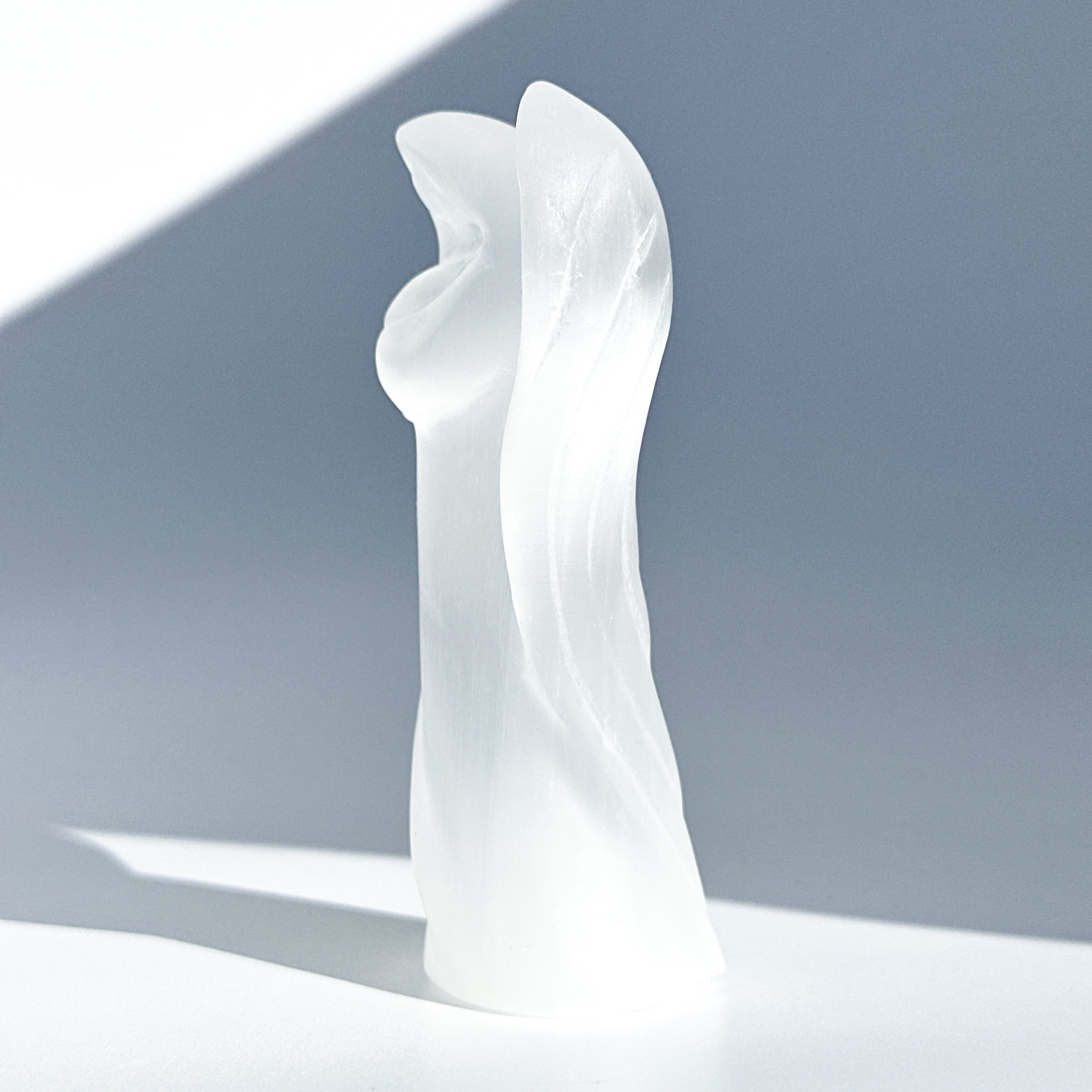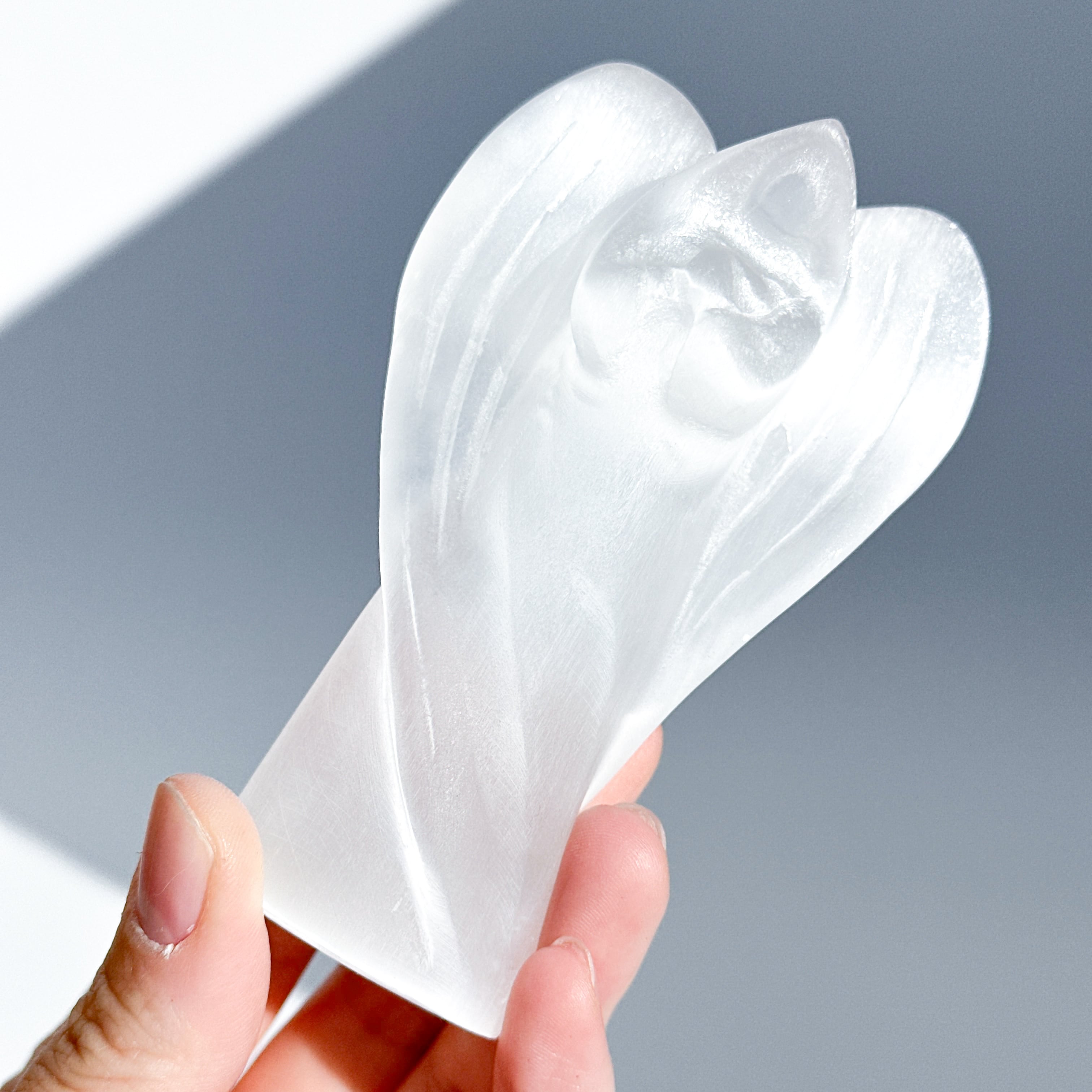 乳白色でほんのり透明感のあるセレナイトを、天使の形に彫刻いたしました。
