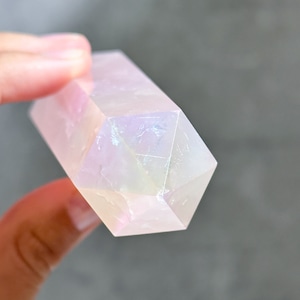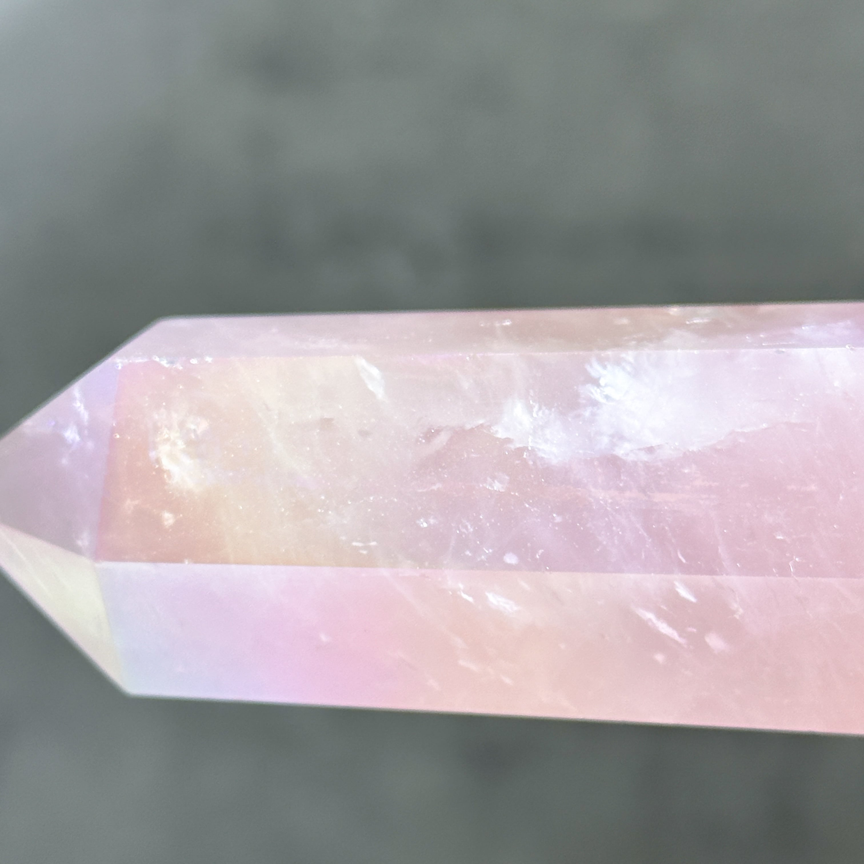 オーラクォーツとは天然の水晶に真空状態で金属を癒着コーティングさせた、新時代のクリスタルです。本品はローズクォーツのタワーに、エンジェルオーラ加工を施したもの◎