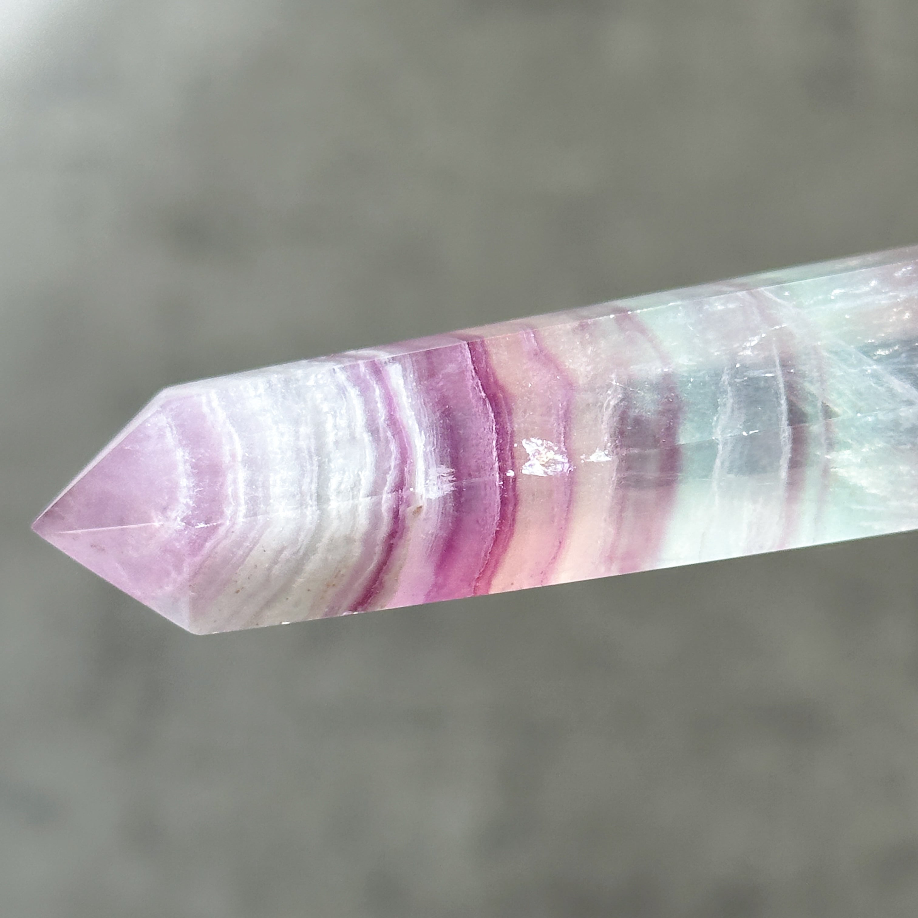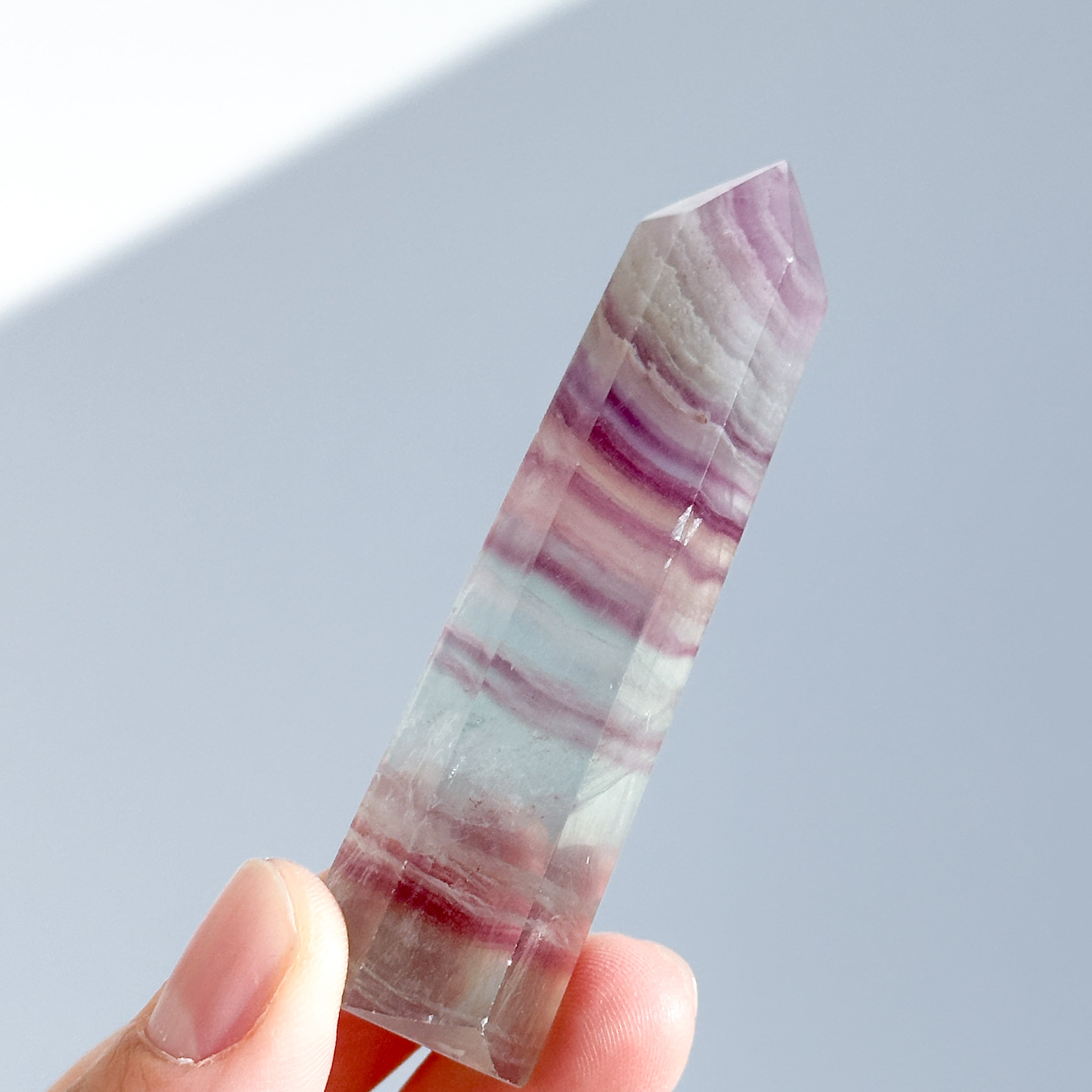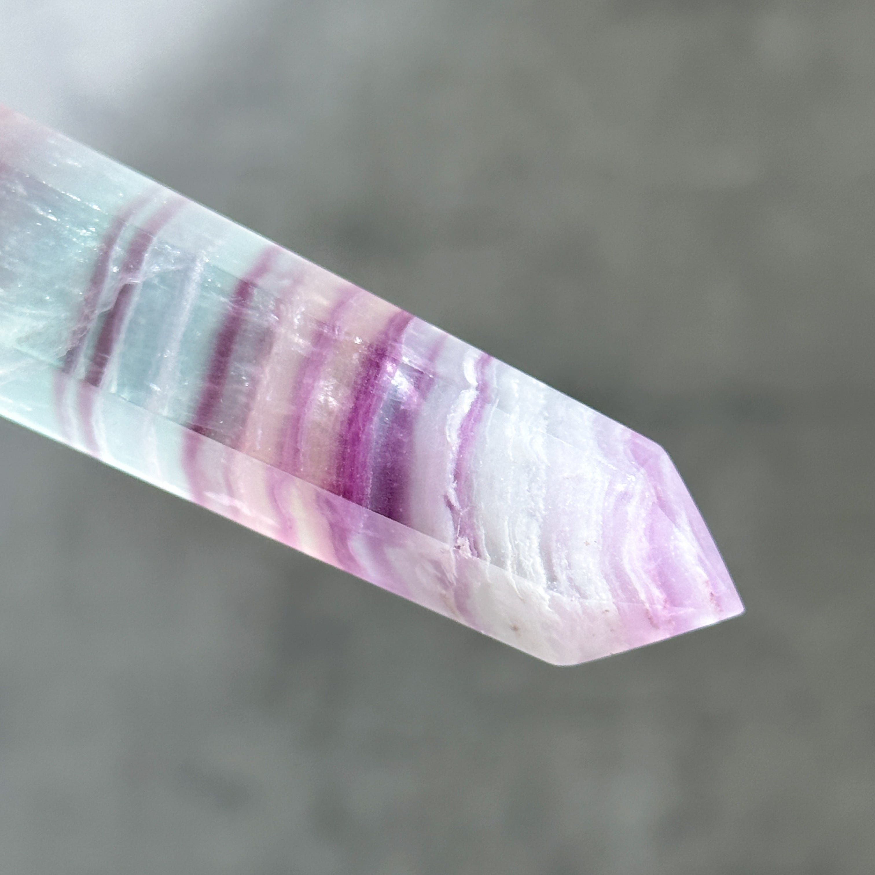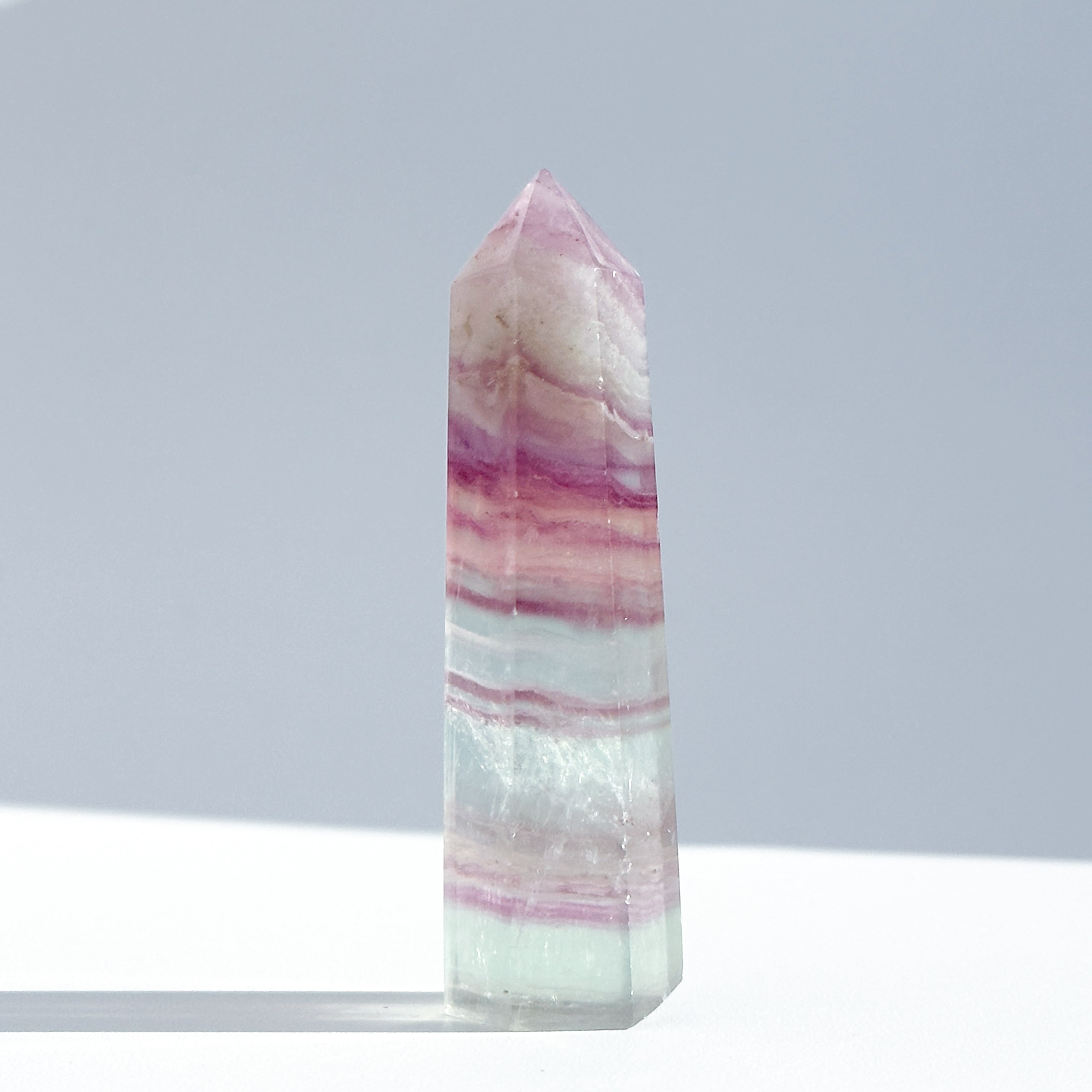 レインボーフローライトは複数のカラー(透明・パープル・ブルー・ピンク・グリーン)が共生し、水面のような曲線の模様を生み出しています。