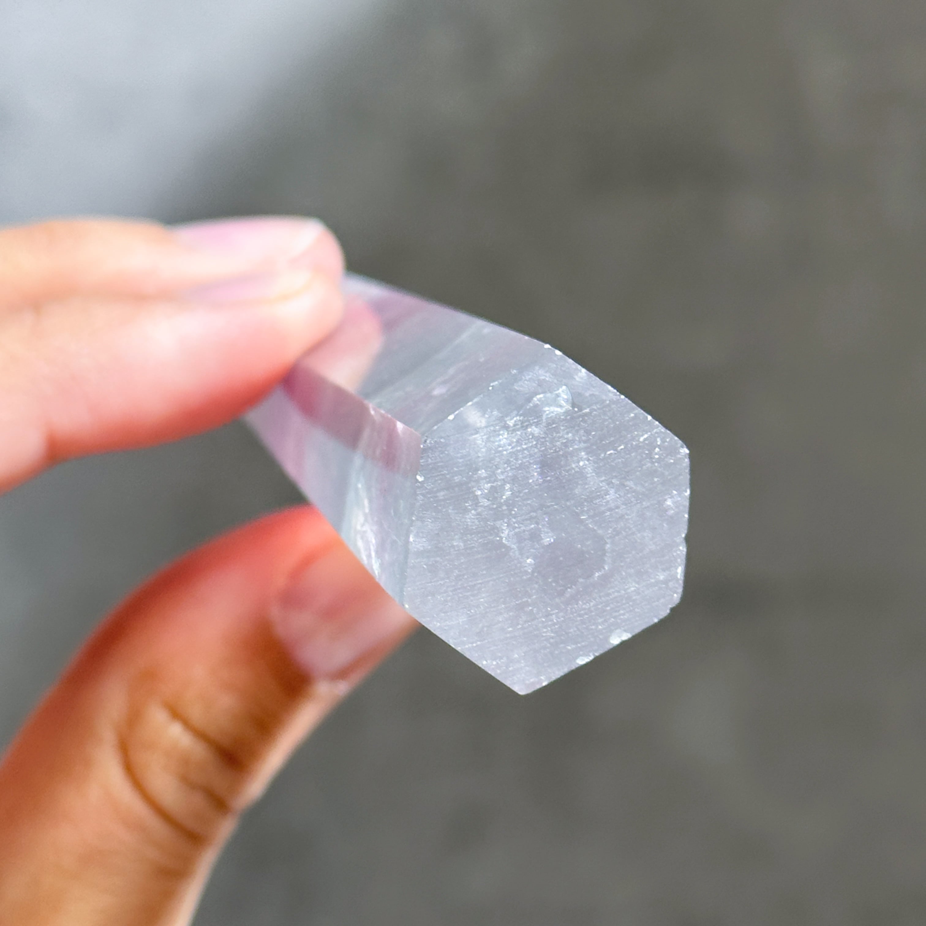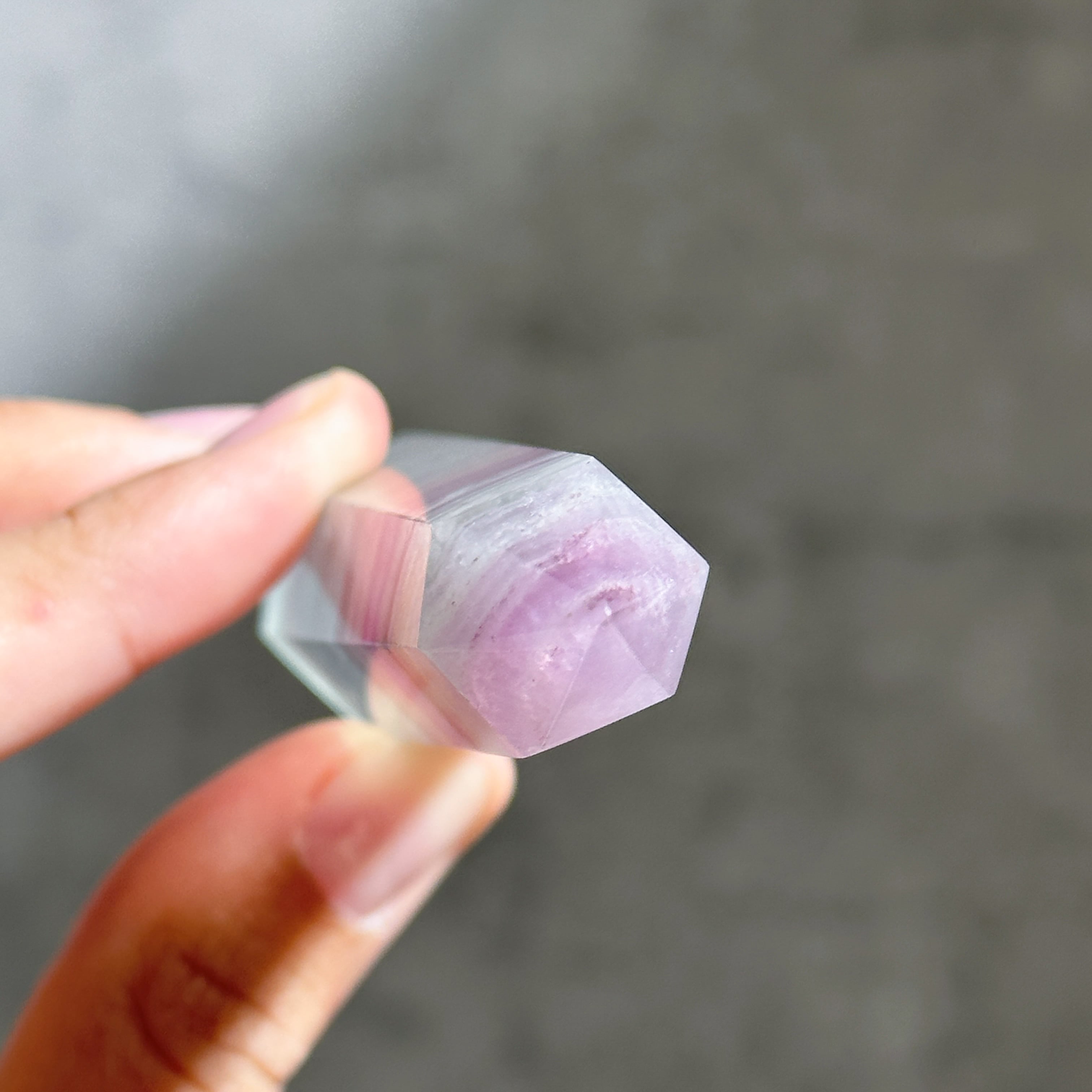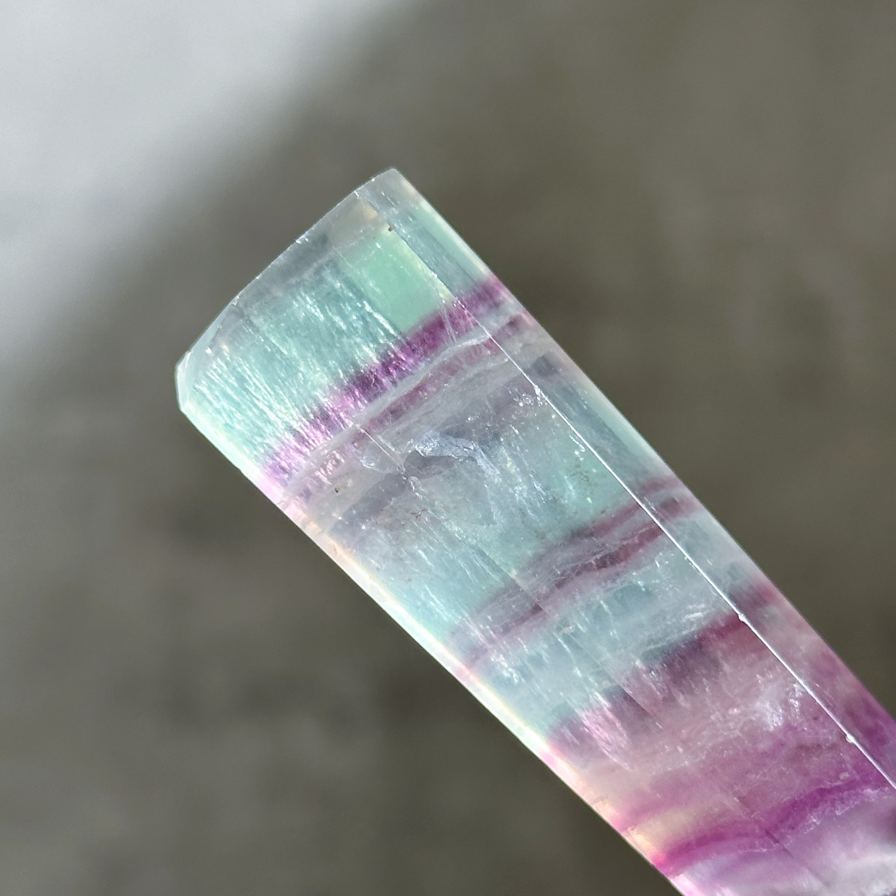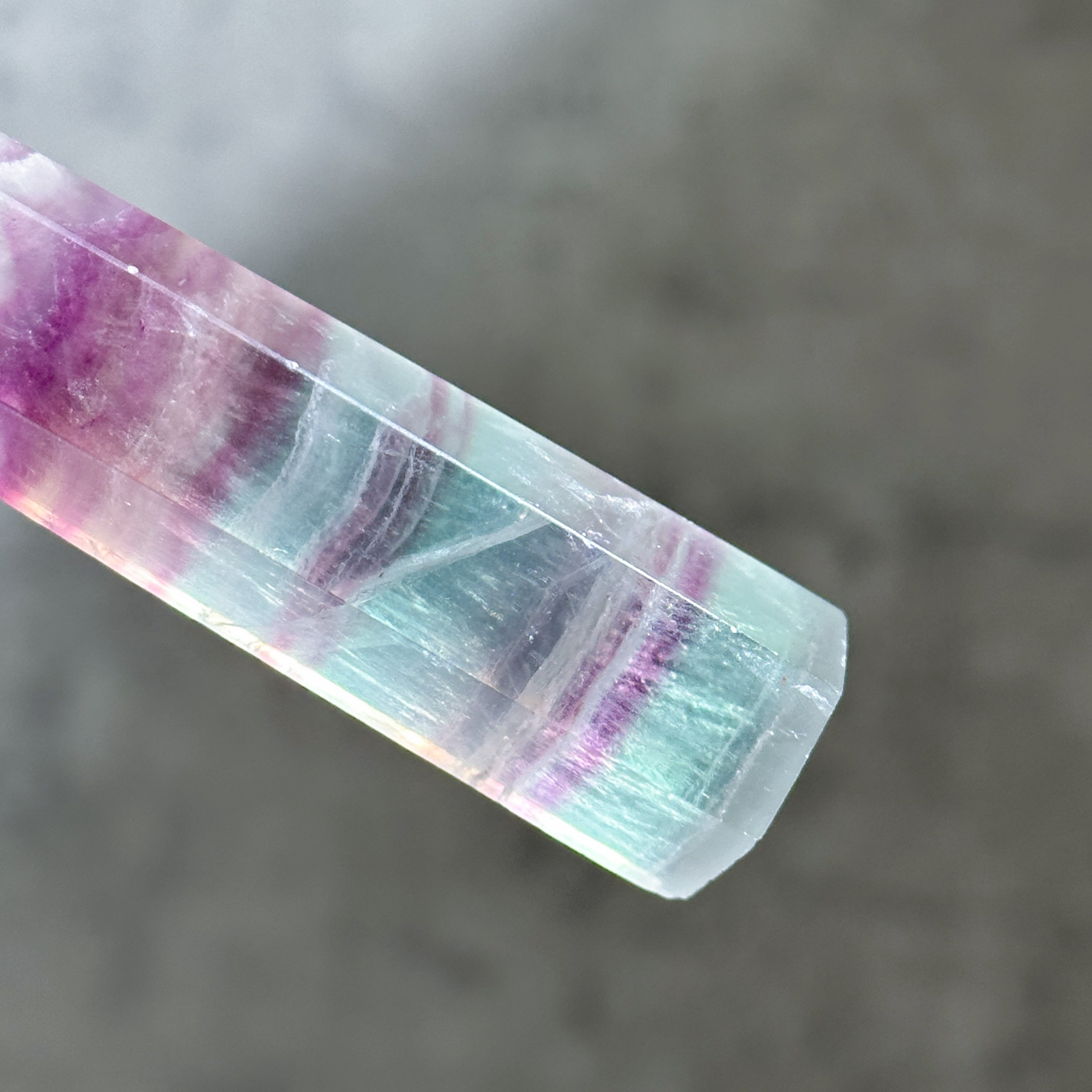 レインボーフローライトは複数のカラー(透明・パープル・ブルー・ピンク・グリーン)が共生し、水面のような曲線の模様を生み出しています。