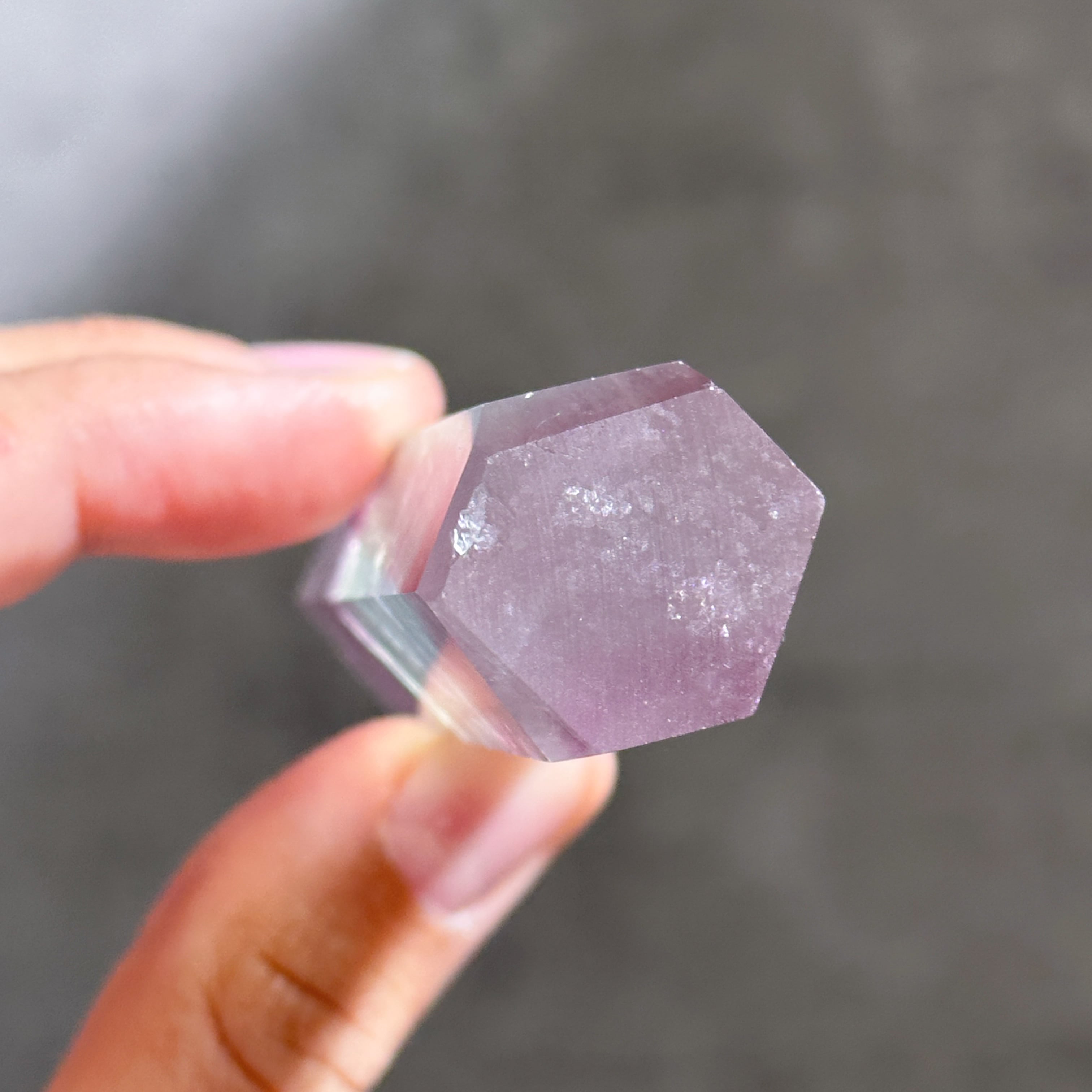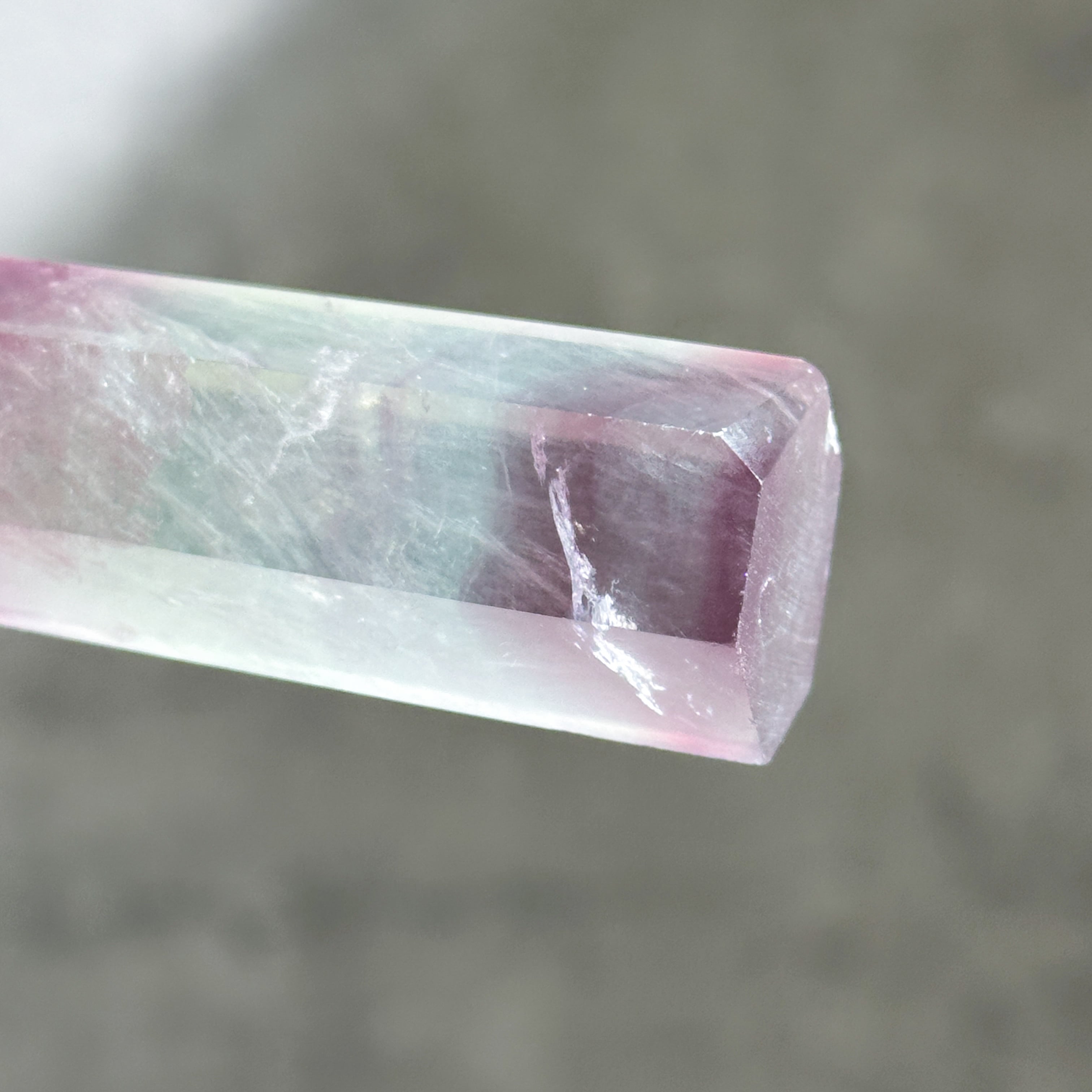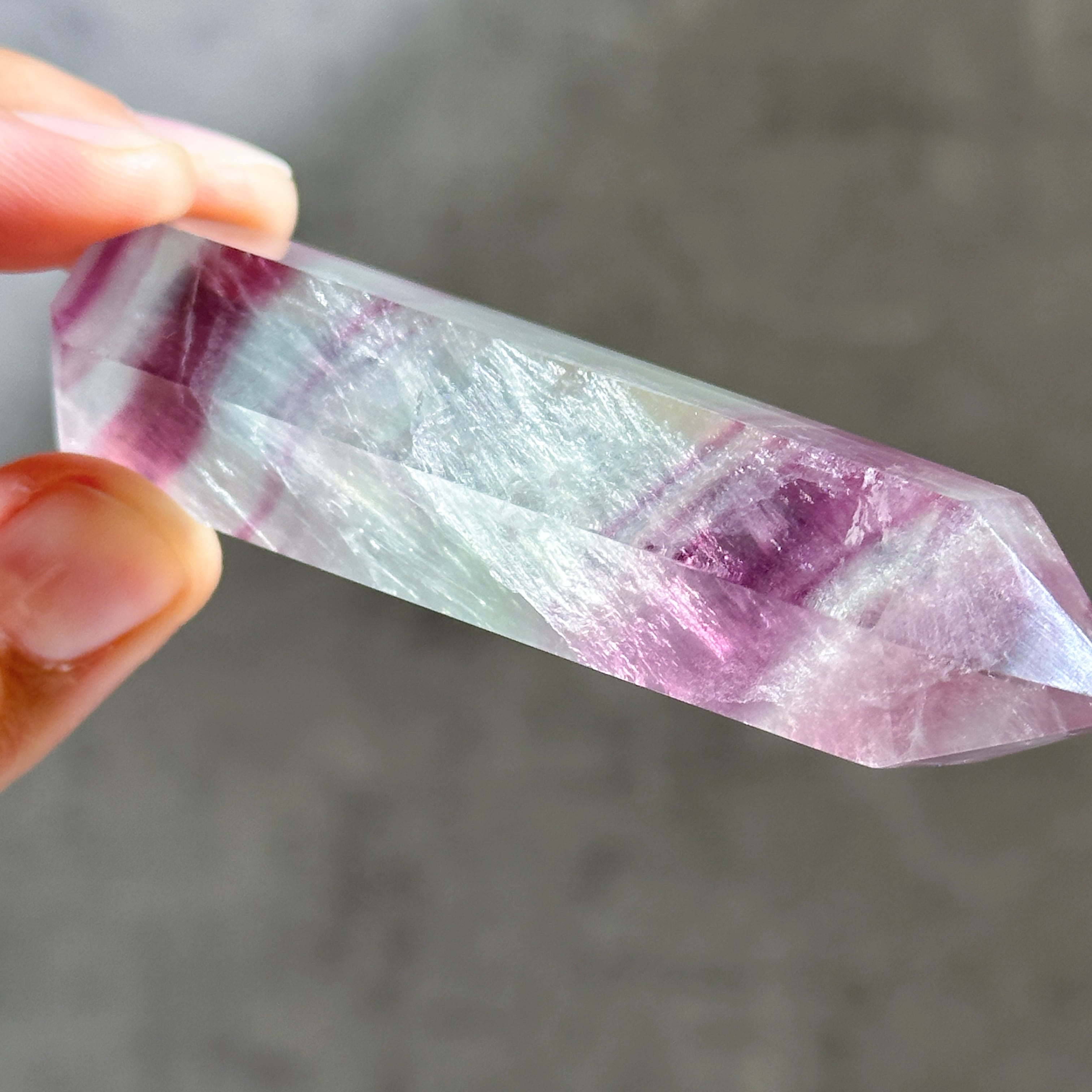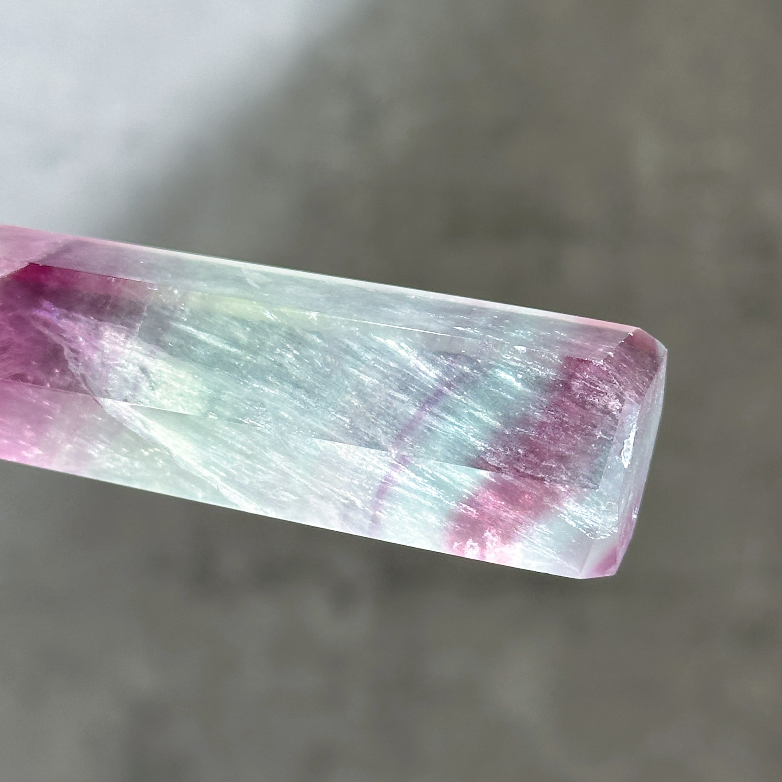 レインボーフローライトは複数のカラー(透明・パープル・ブルー・ピンク・グリーン)が共生し、水面のような曲線の模様を生み出しています。