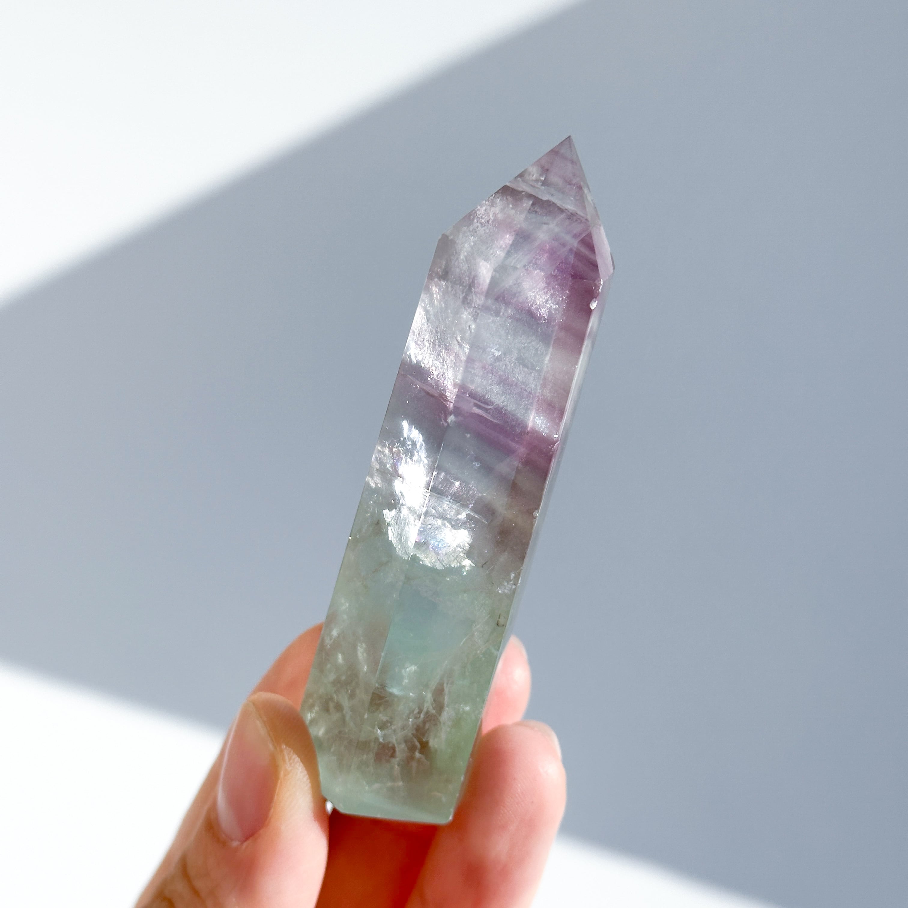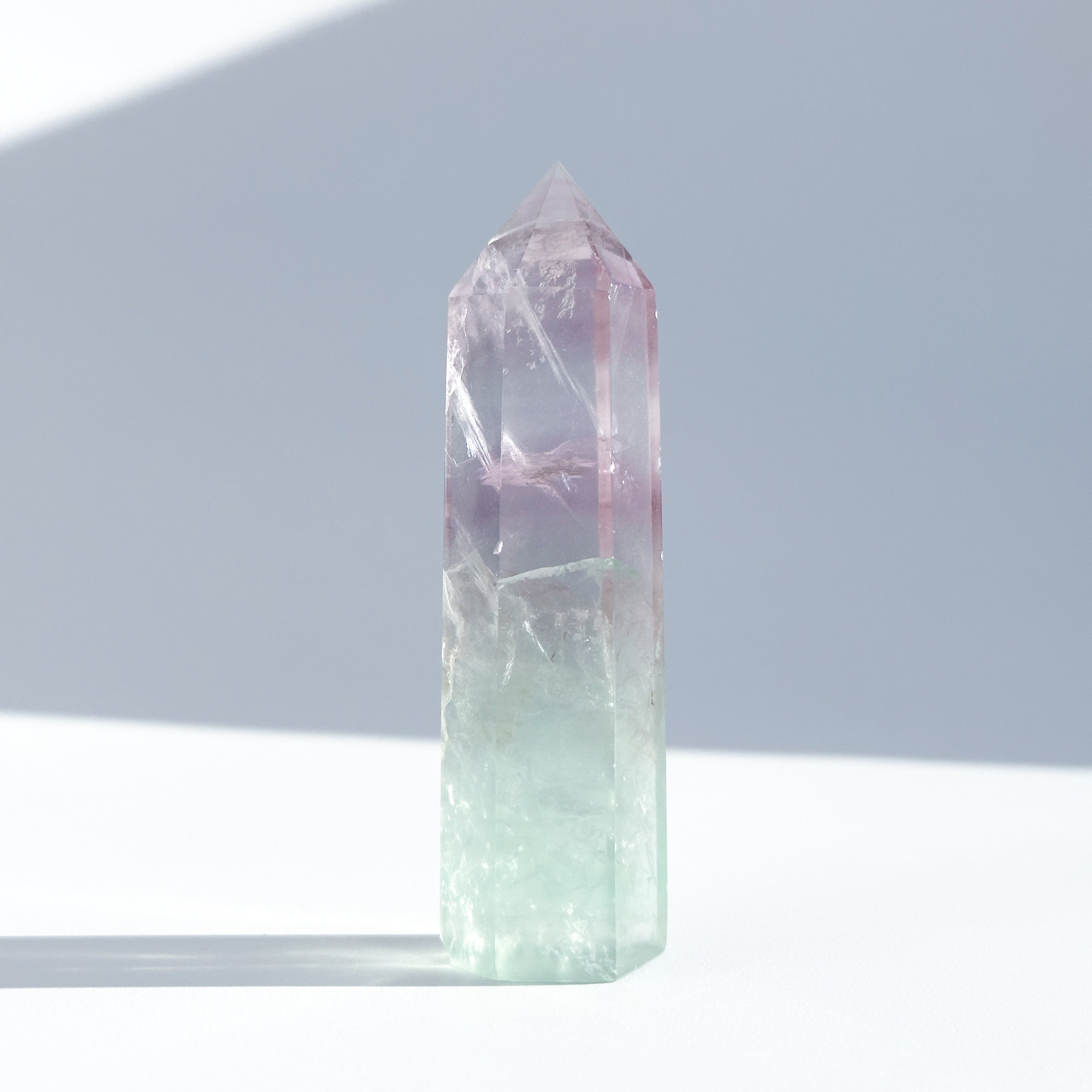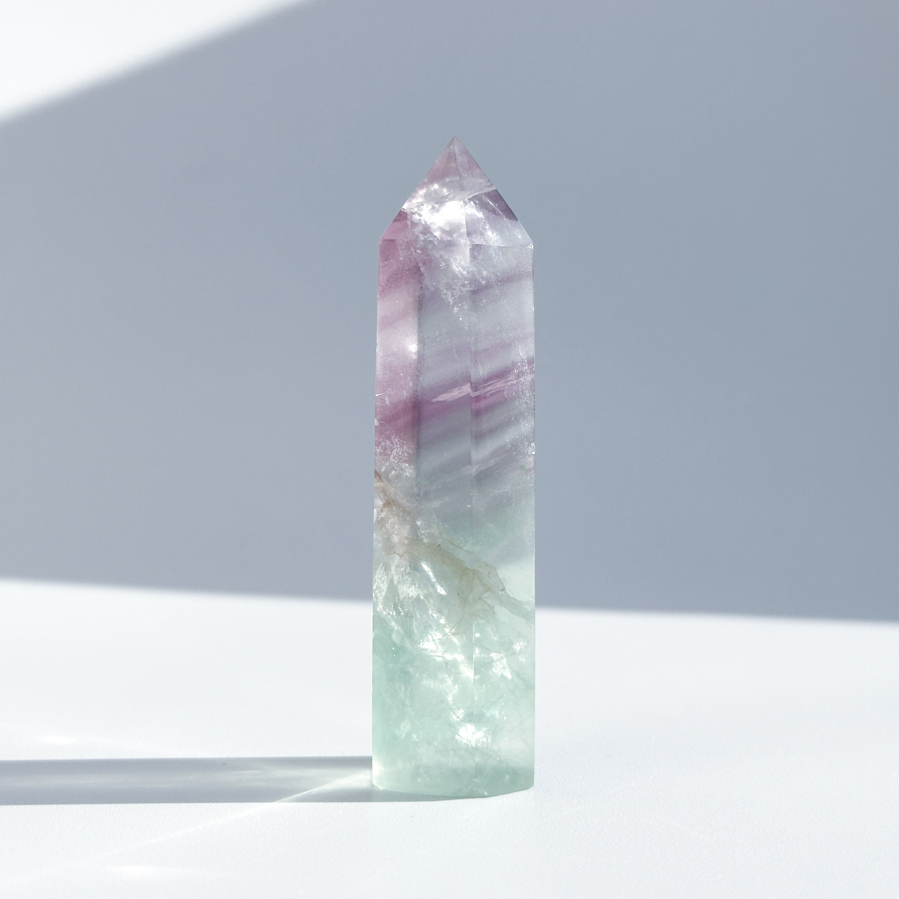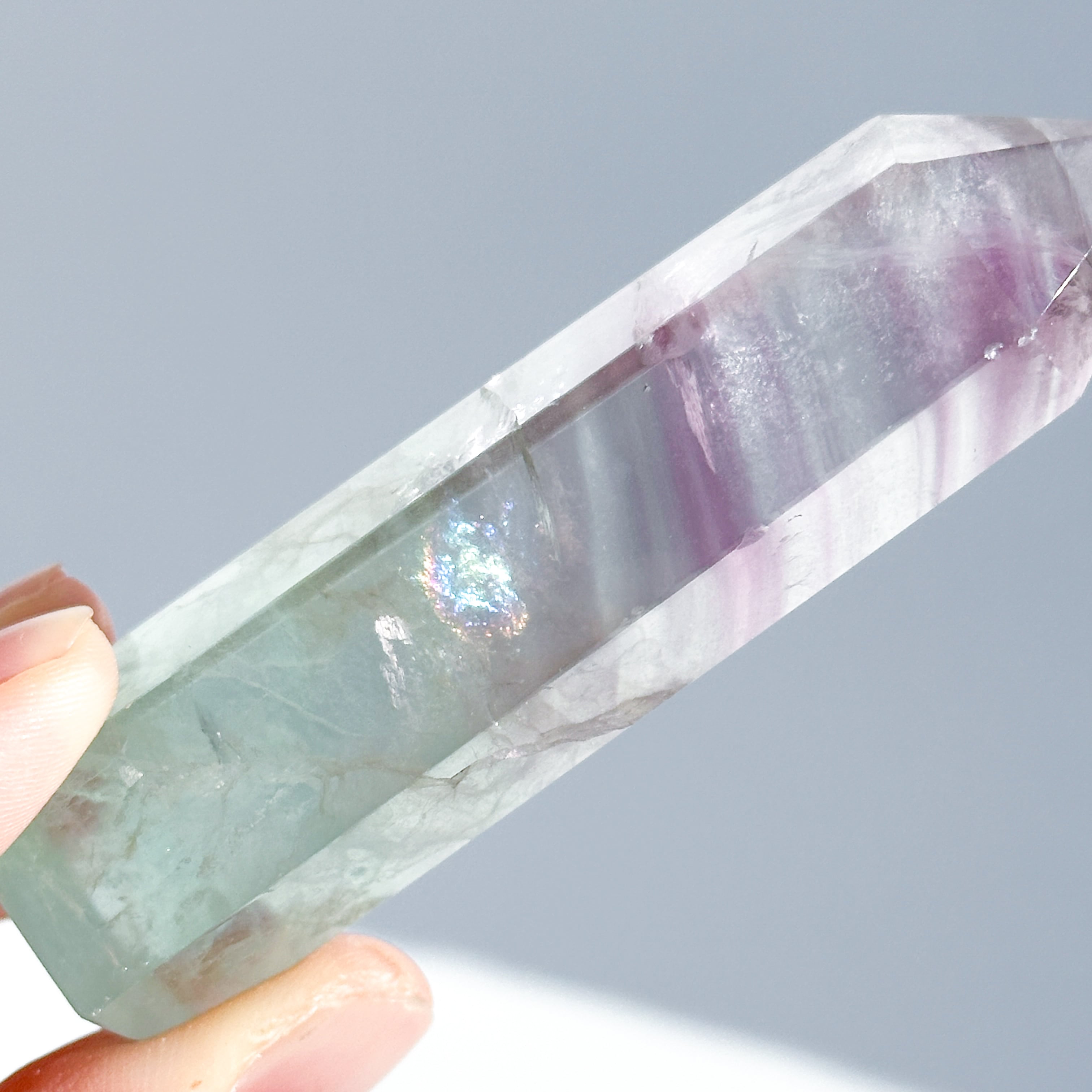 レインボーフローライトは複数のカラー(透明・パープル・ブルー・ピンク・グリーン)が共生し、水面のような曲線の模様を生み出しています。