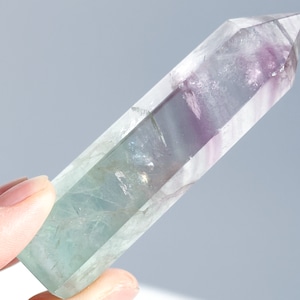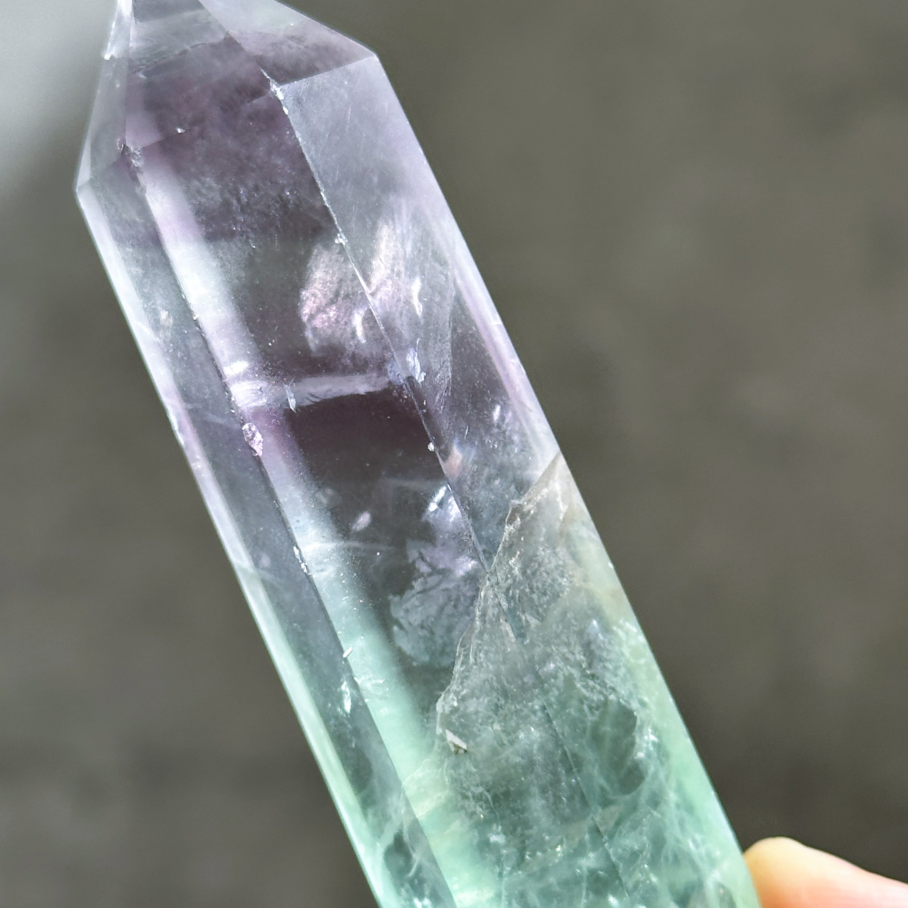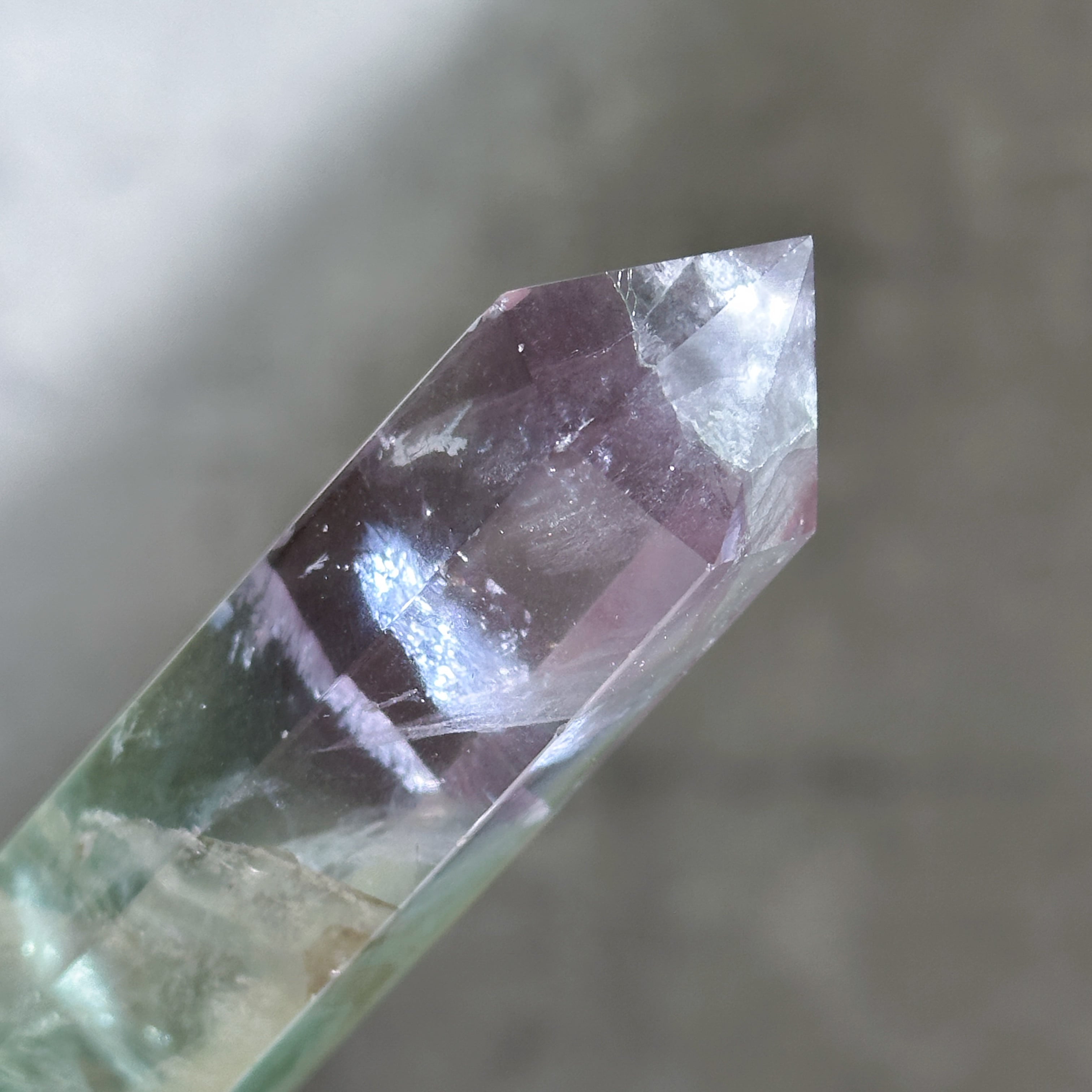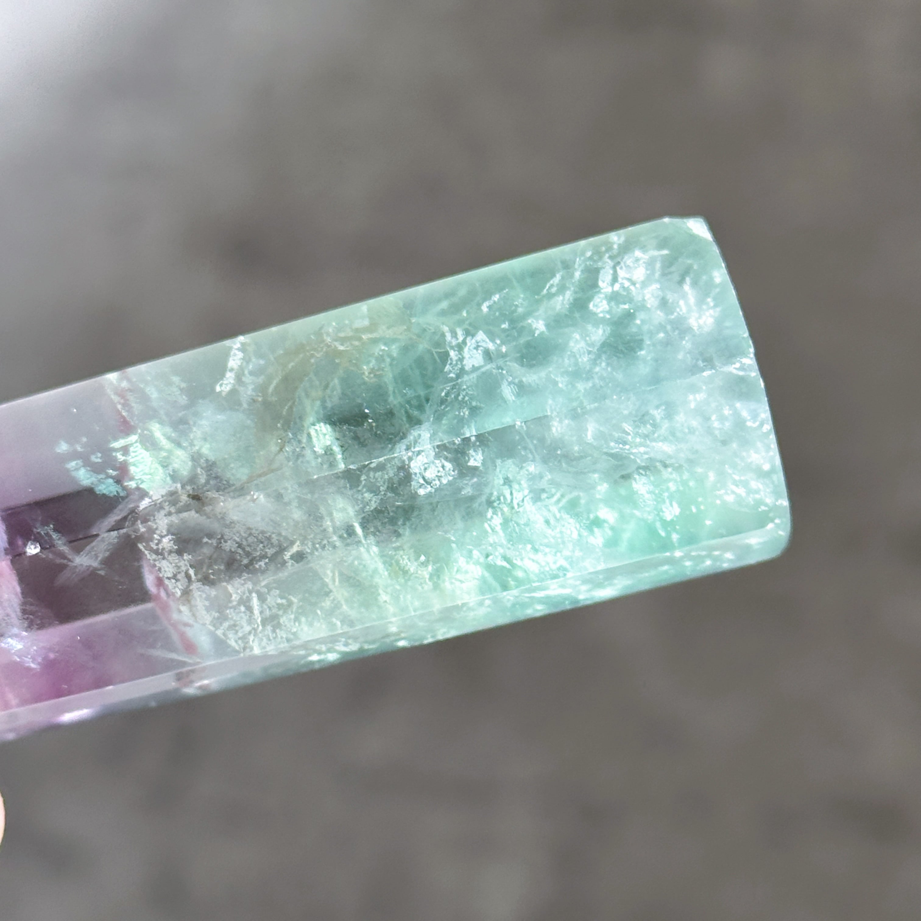 レインボーフローライトは複数のカラー(透明・パープル・ブルー・ピンク・グリーン)が共生し、水面のような曲線の模様を生み出しています。